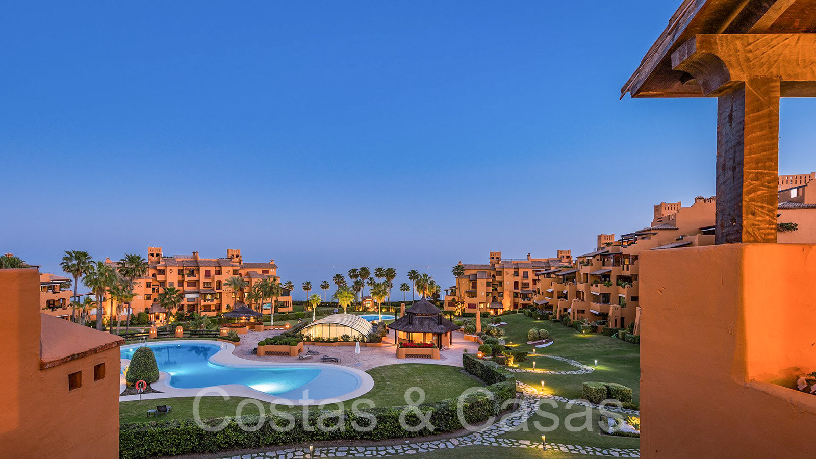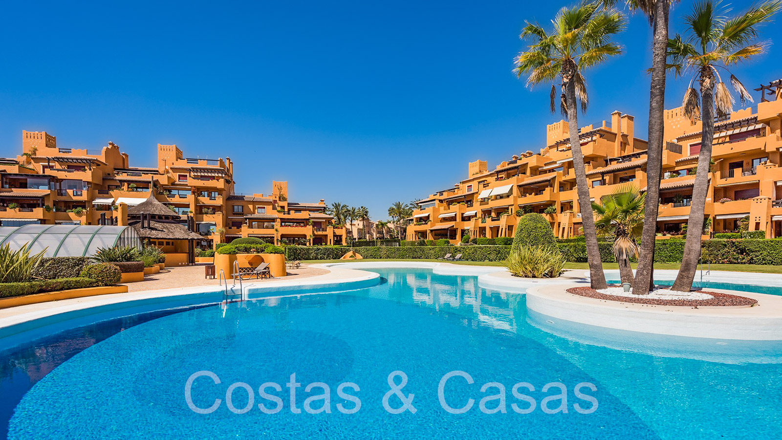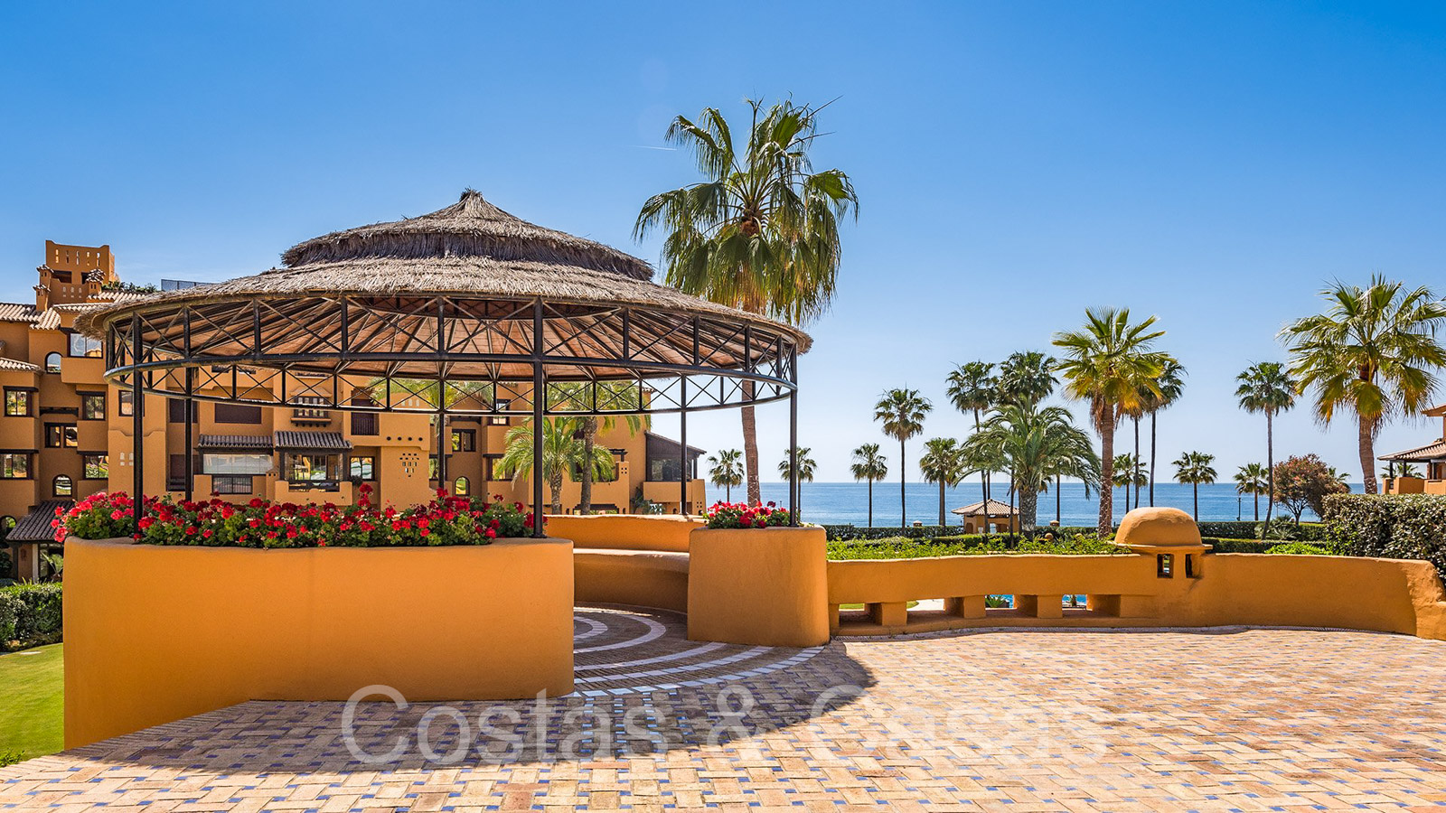 Ubicado en una exclusiva urbanización de playa en la Nueva Milla de Oro, a poca distancia a pie y en bicicleta del centro de Estepona. Disfruta de acceso directo a la playa con todos los servicios, tiendas, escuelas, restaurantes de primera clase y el complejo Laguna Villa a poca distancia. Hay numerosos campos de golf en la Nueva Milla de Oro. San Pedro y Puerto Banús están a aproximadamente 15 minutos en coche. El complejo cuenta con jardines muy bien cuidados e instalaciones, que incluyen su propio restaurante, piscina cubierta climatizada, 2 piscinas al aire libre, gimnasio, baño turco, sauna, jacuzzi y seguridad las 24 horas.