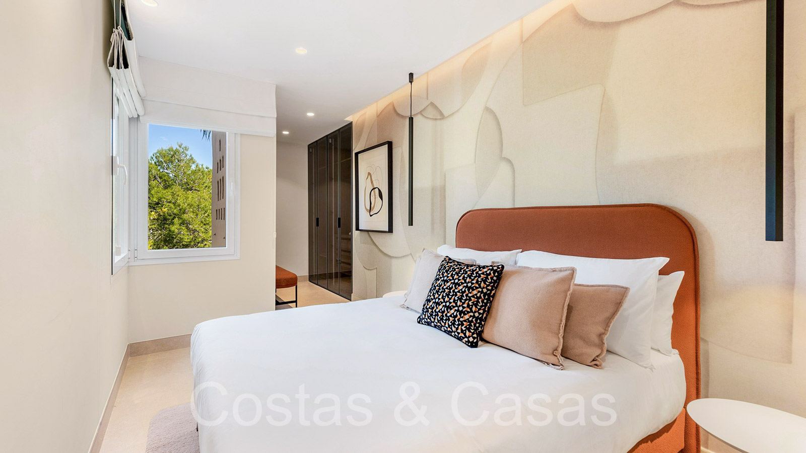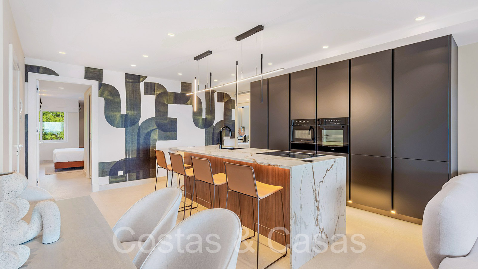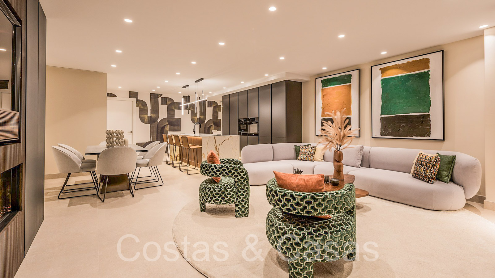 Sofisticado apartamento reformado. Utilizando materiales y acabados de alto nivel. Orientado al sur. Hermosas vistas a los jardines tropicales, piscinas y al mar Mediterráneo. Sala de estar diáfana con sala de TV y comedor integrado. Cocina/comedor abierta con isla de cocina y electrodomésticos Miele de alta calidad. Las altas ventanas correderas con perfiles empotrados proporcionan habitaciones luminosas y una transición perfecta hacia el exterior. Una amplia terraza cubierta ofrece espacio para un comedor al aire libre y cuenta con un lounge. Se puede acceder a la terraza desde el salón y desde la suite principal. Un total de 4 dormitorios y 3 baños. El dormitorio principal tiene baño en suite y su propia chimenea. Suelos de gres de calidad. Trastero y plaza de aparcamiento subterráneo incluidos.