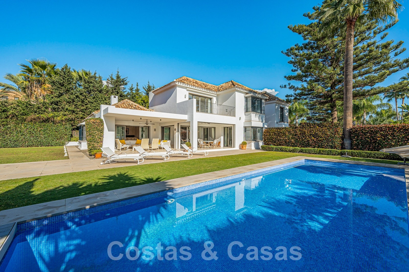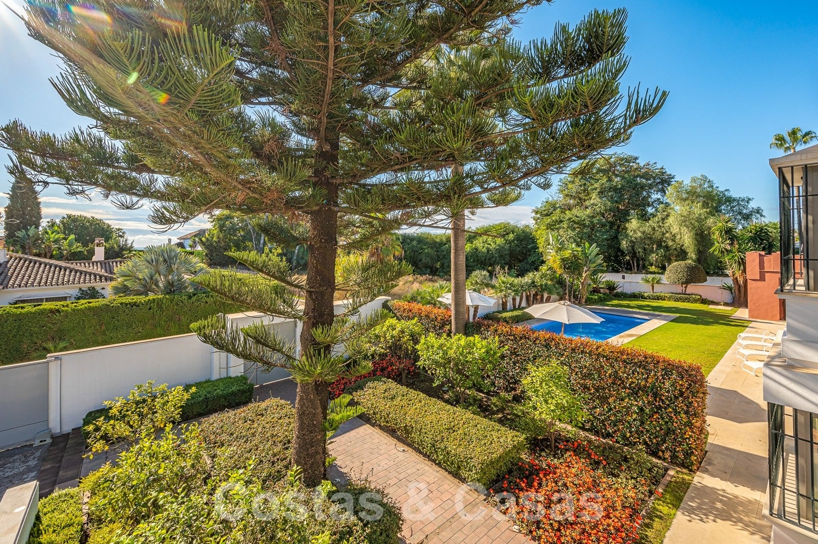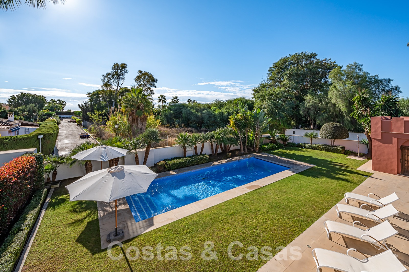 Una parcela llana y totalmente vallada. Un cuidado jardín con mucha vegetación y una piscina privada. Gracias a la vegetación circundante, la villa goza de paz y privacidad y se puede disfrutar plenamente del estilo de vida mediterráneo durante todo el año. Terrazas cubiertas y descubiertas con instalaciones chill-out. Orientación sur con mucha privacidad.