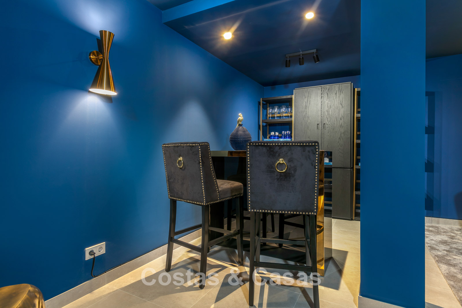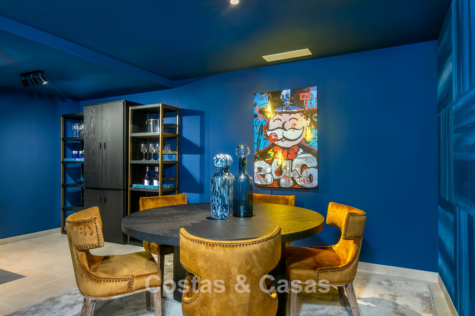 Villa de diseño elegante con un estilo contemporáneo y distintivo. Materiales y acabados de alta calidad. Al entrar, se accede a un espacio abierto donde el vestíbulo se integra perfectamente con la zona de estar. Los techos altos aportan amplitud, destacada por la abundante luz natural que entra a través de las grandes puertas correderas. Cocina alemana a medida, totalmente equipada con electrodomésticos Neff y mesa de comedor integrada. 4 dormitorios, cada uno con su baño en suite. Aseo de invitados para mayor comodidad. Planta inferior multifuncional con acogedora sala de TV y bar. Suelos de gres de alta calidad y suelos de madera natural. Trastero/lavandería. Aparcamiento privado para 2 coches.