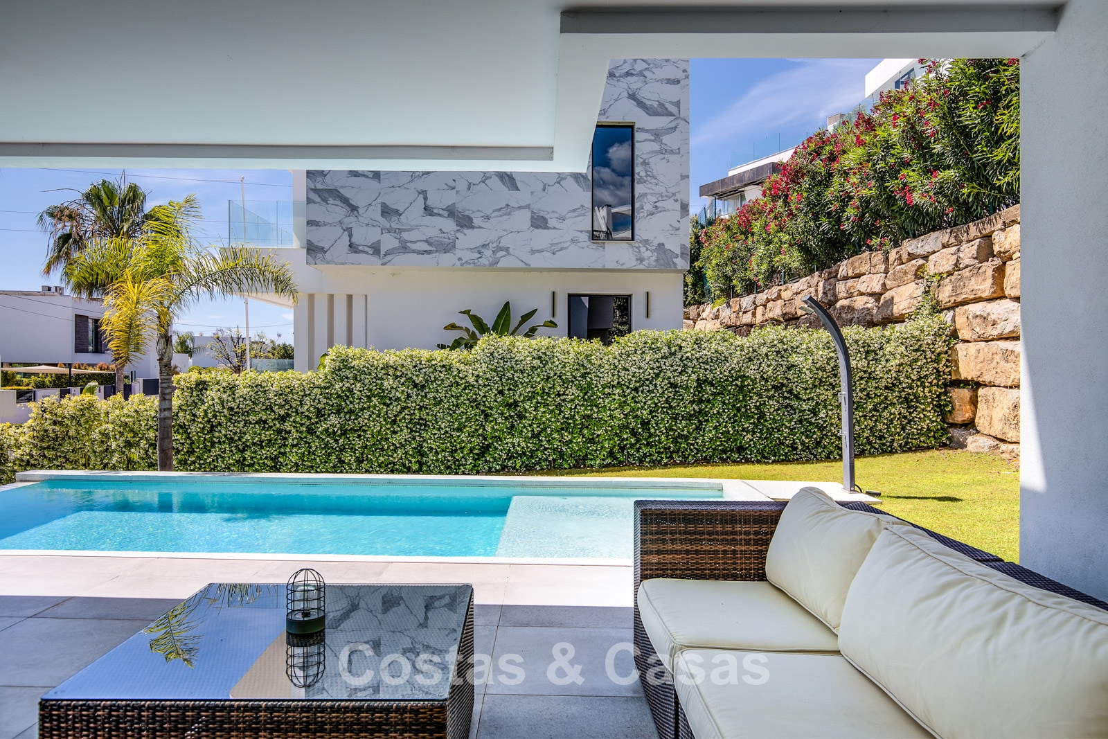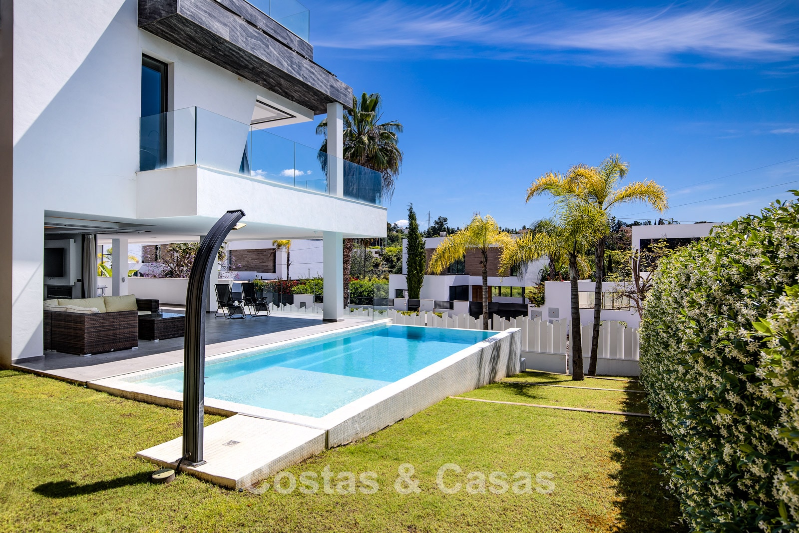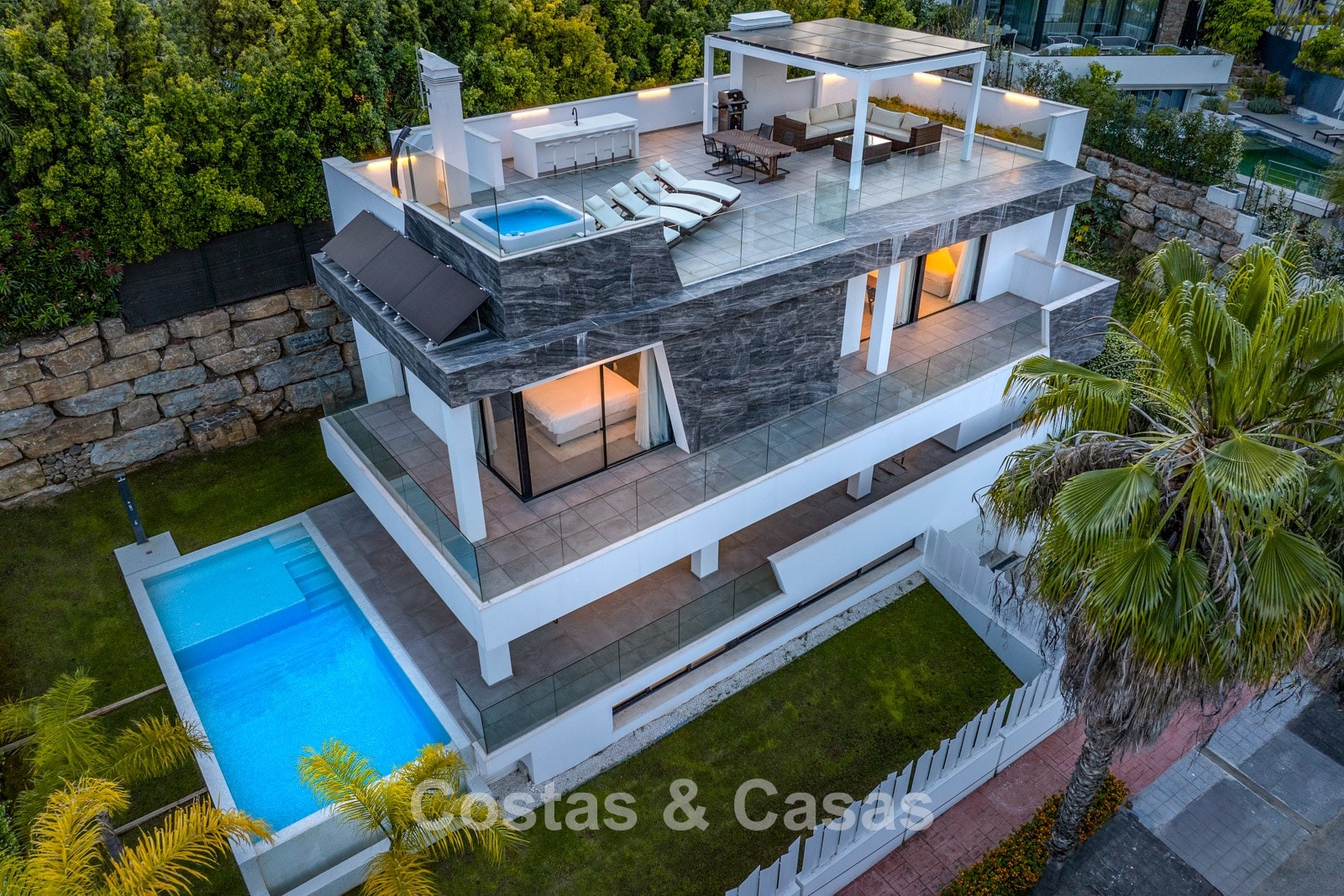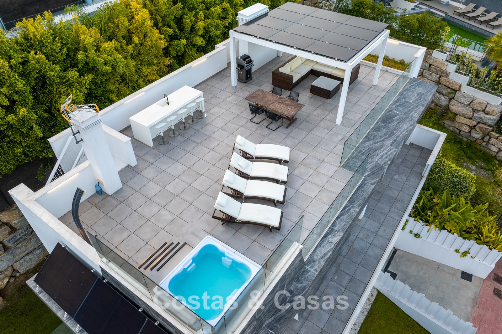 Parcela cerrada en una posición elevada. Precioso exterior ajardinado con piscina infinita integrada con sistema de agua salada. Amplias terrazas ofrecen la oportunidad de disfrutar del agradable clima mediterráneo. La espaciosa azotea es un auténtico paraíso, con jacuzzi, ducha exterior, zona de estar, tumbonas y una cocina exterior totalmente equipada con bar y barbacoa. Vistas panorámicas al valle del golf y al mar Mediterráneo.
