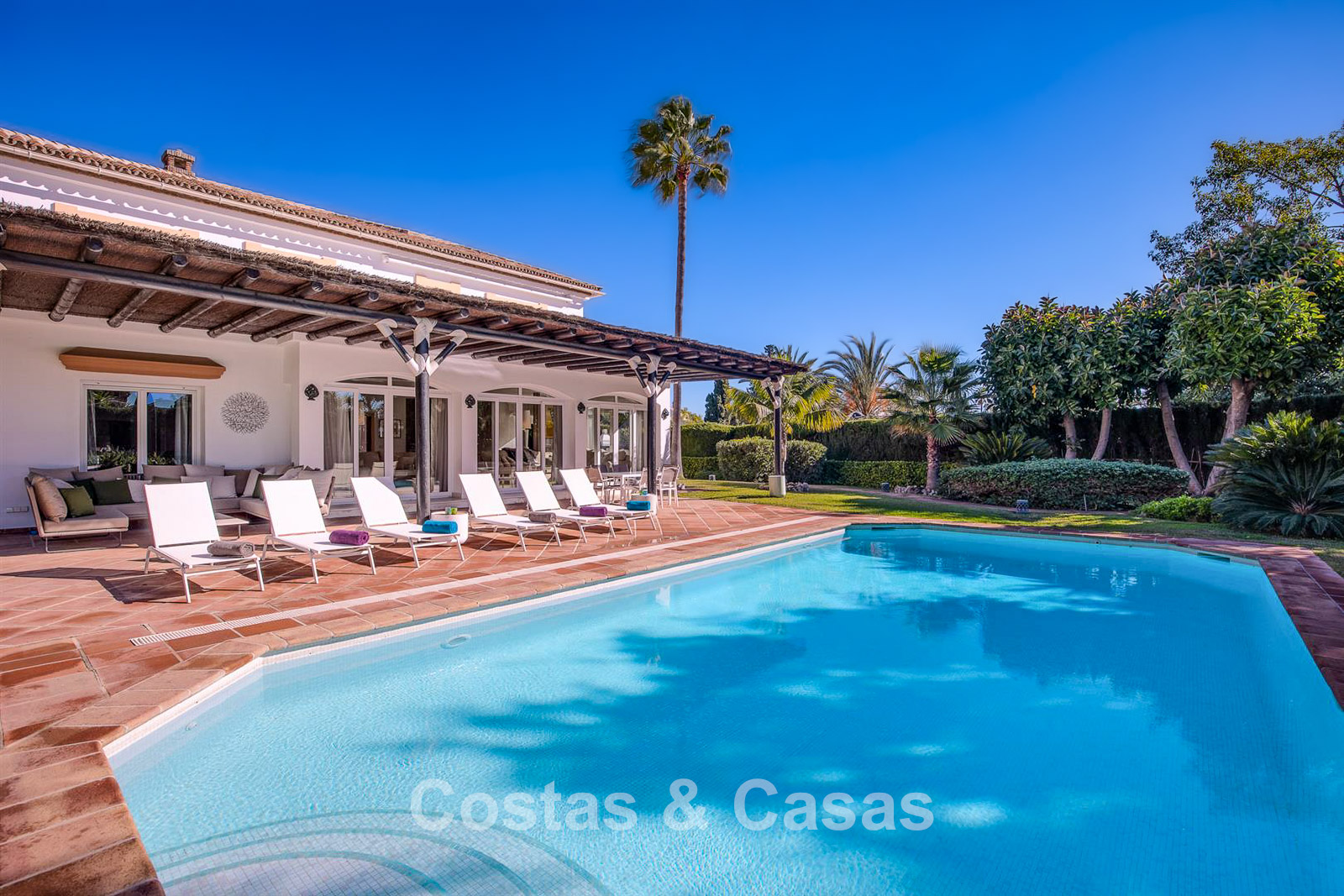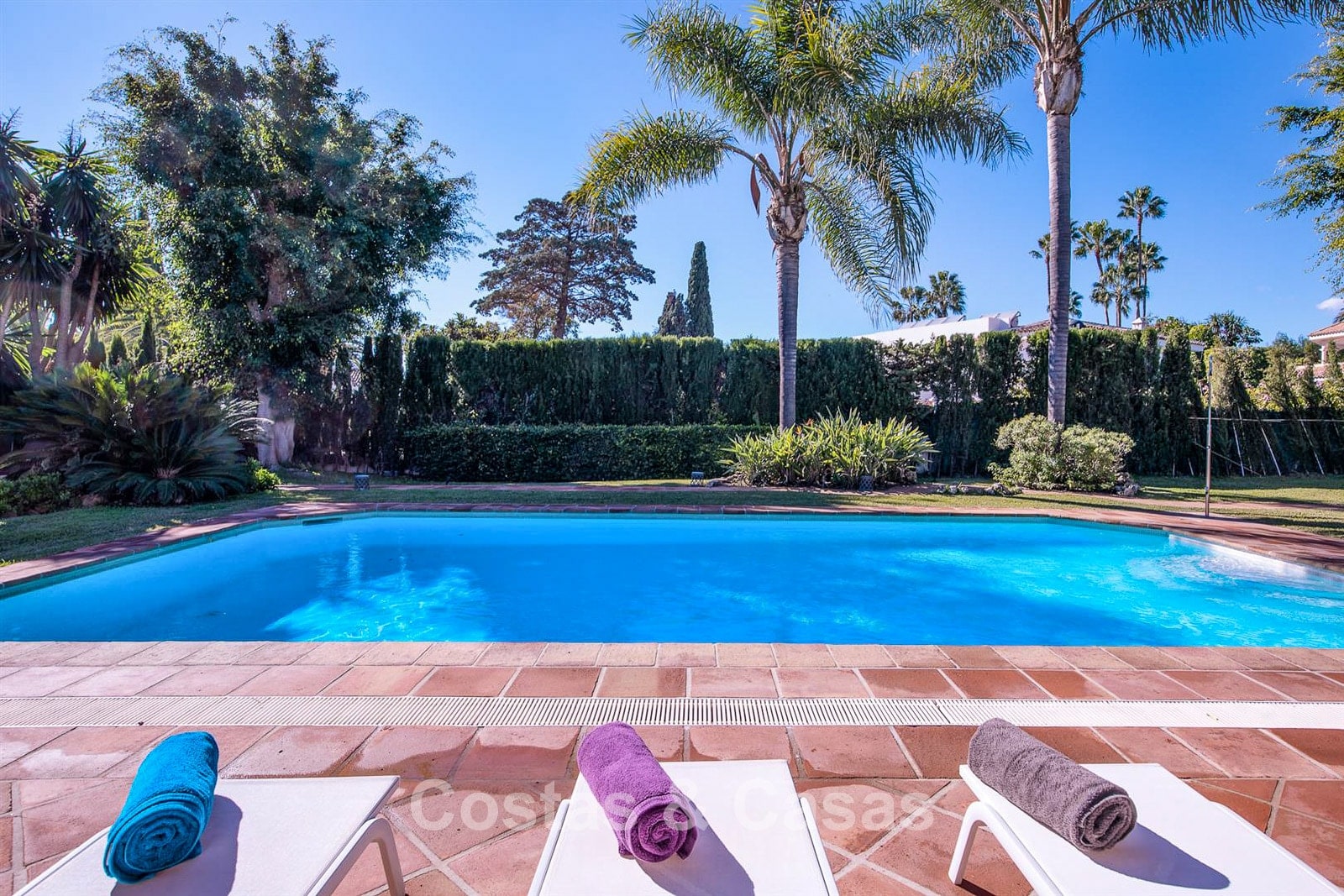 Amplia parcela, completamente cercada por frondosos arbustos. Precioso jardín maduro con abundante vegetación tropical. Piscina con terraza solárium adyacente con cómodas tumbonas. Orientación suroeste. Tranquilas vistas al jardín y a la piscina.