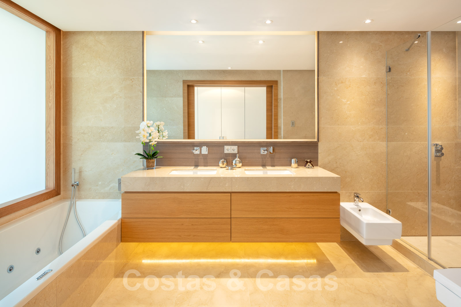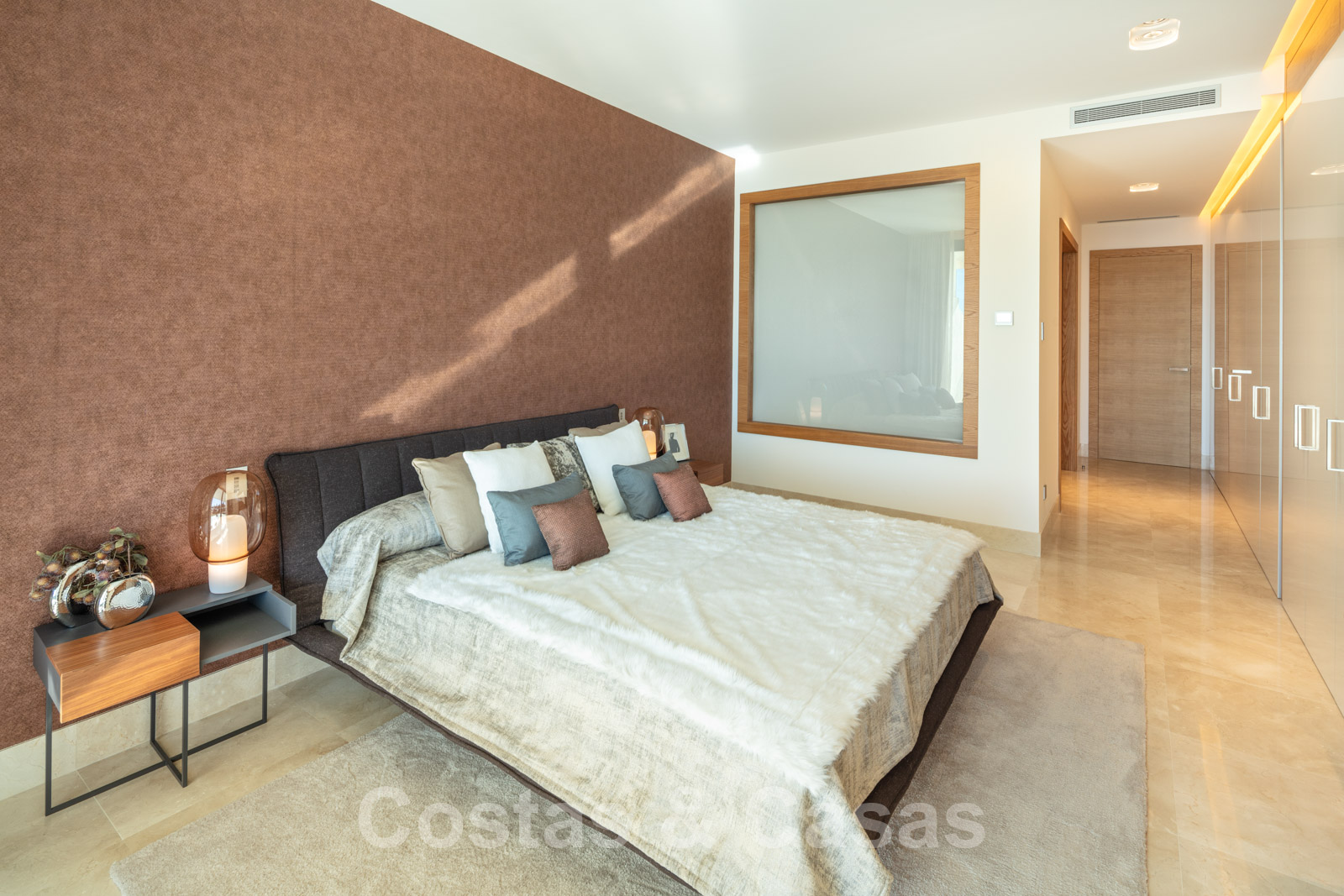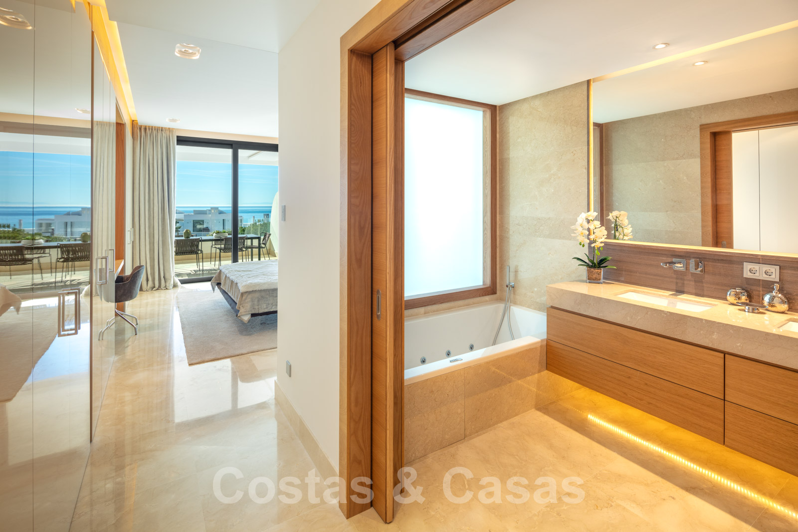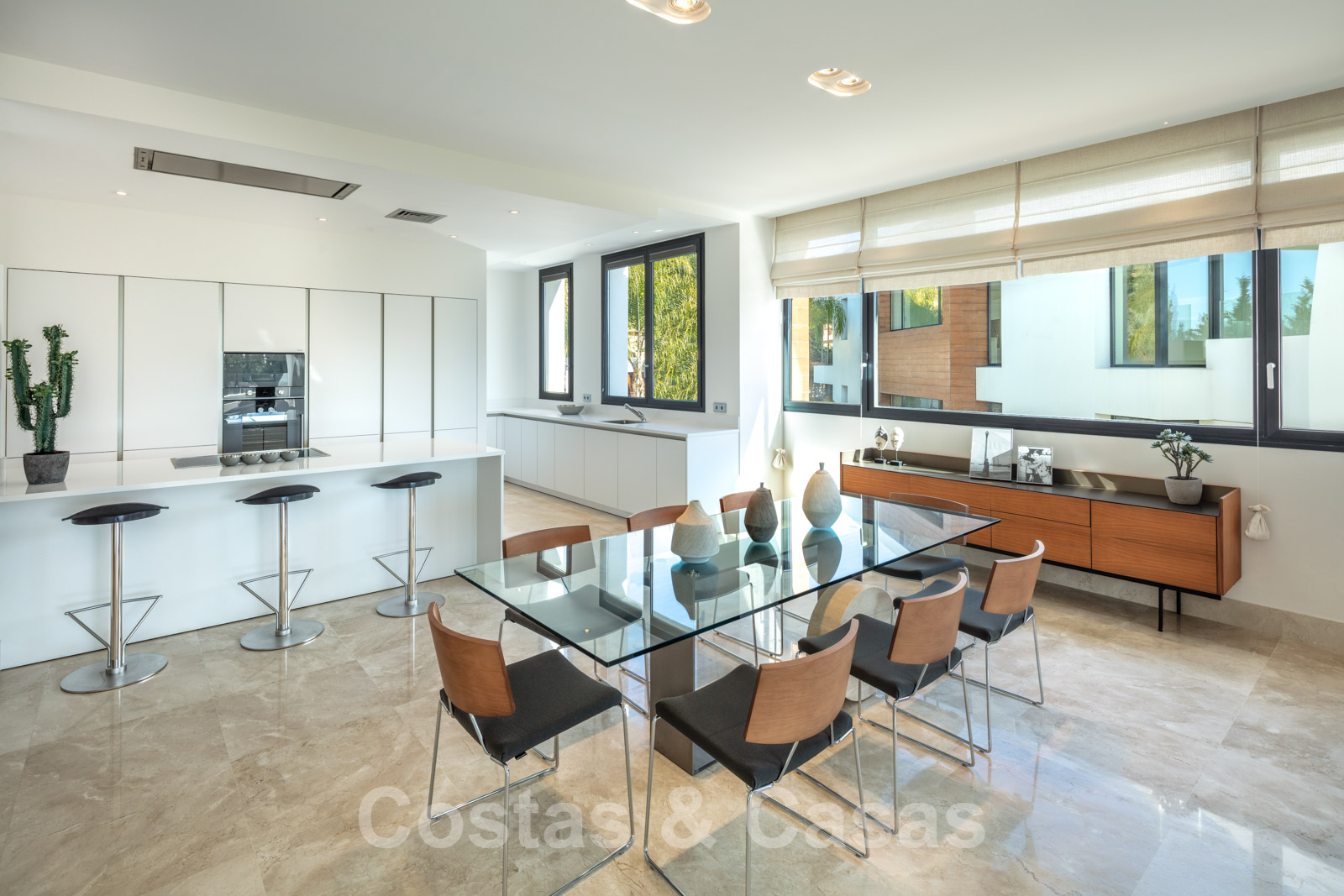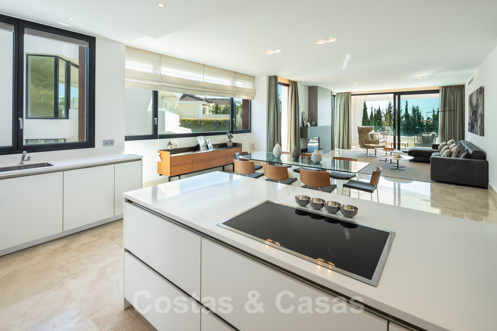 Suelos de marmol Grandes puertas correderas con perfiles de ventana empotrados Techos altos Puertas de suelo a techo y muchos armarios empotrados de suelo a techo Domótica para controlar las luces Cortinas operadas eléctricamente Aire acondicionado para frio y calor. Barandillas de vidrio Plazas de garaje subterráneas y trastero.