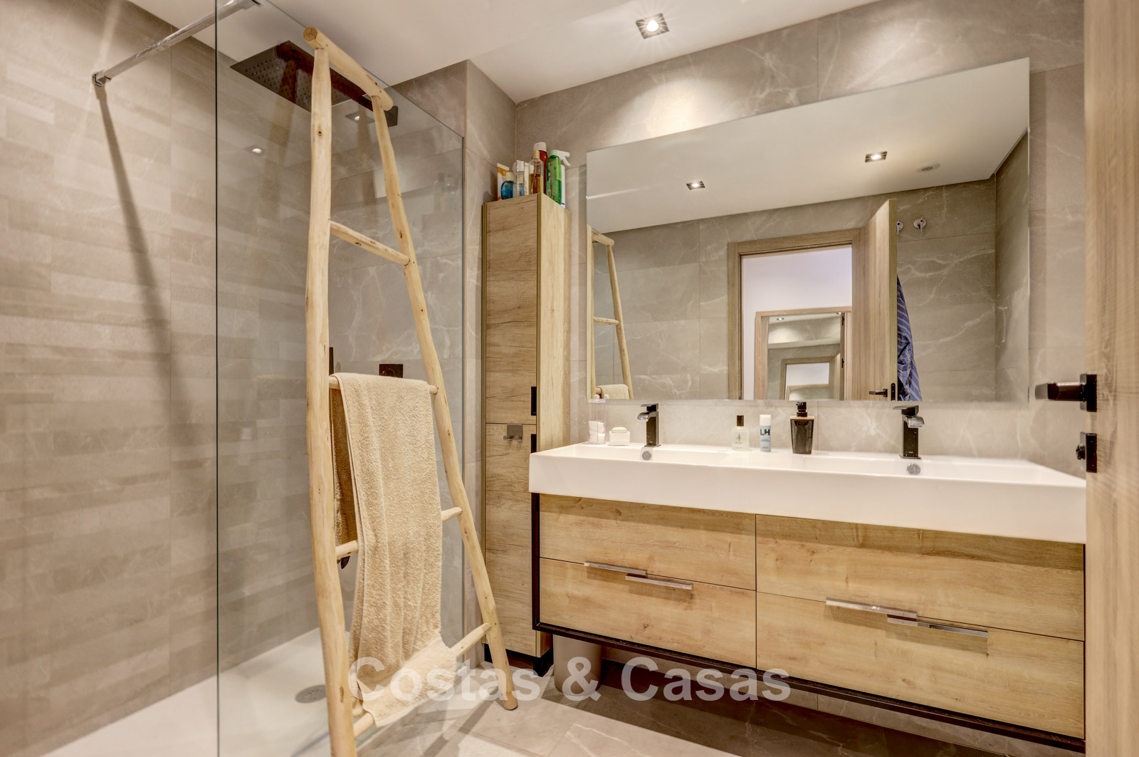 El dormitorio principal es un refugio privado con un lujoso baño en suite que incluye ducha a ras de suelo y doble lavabo.