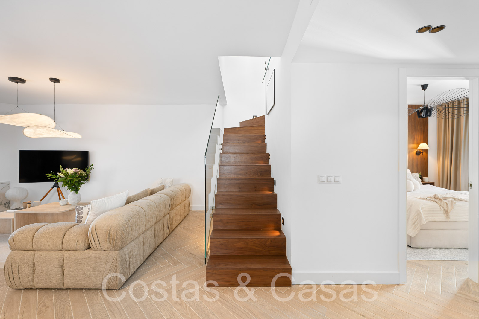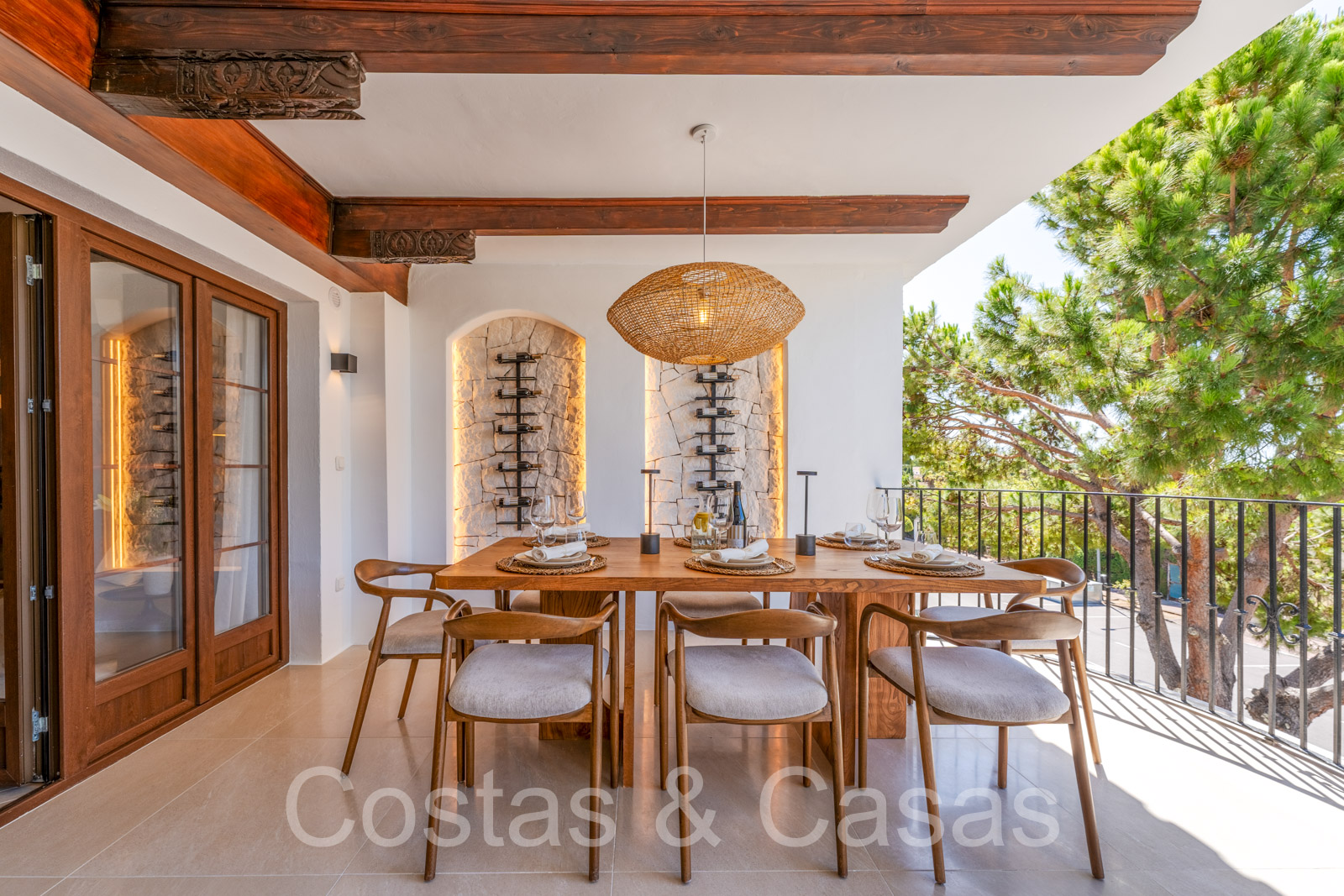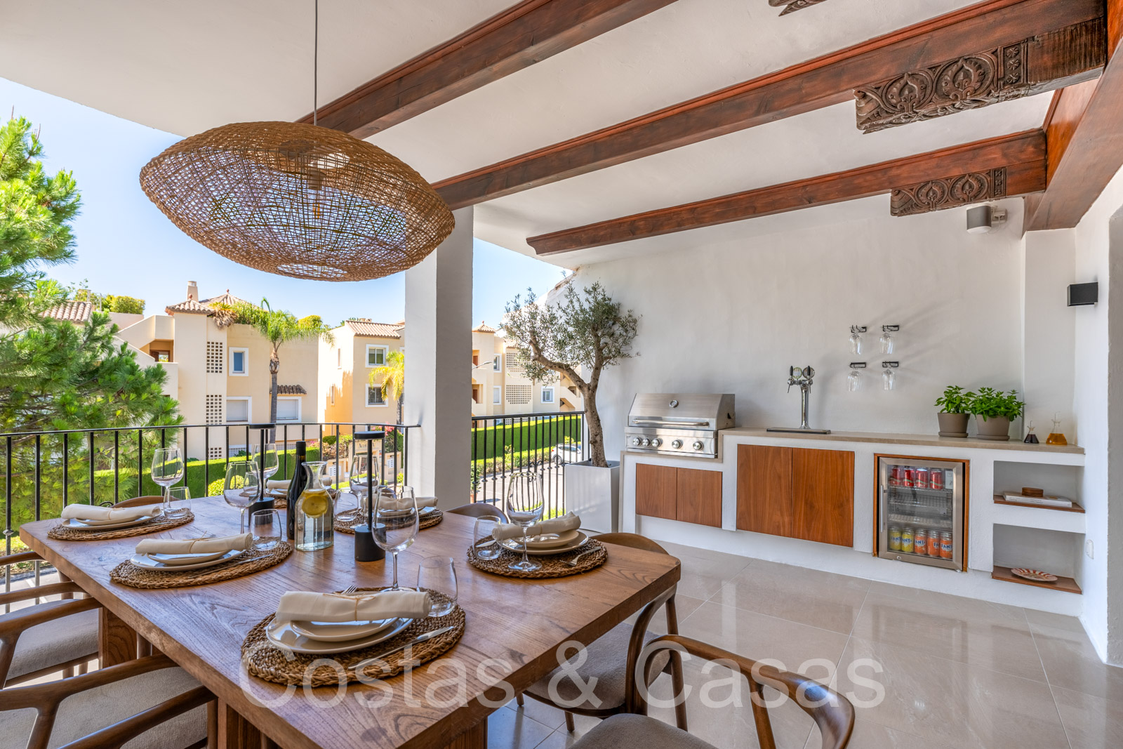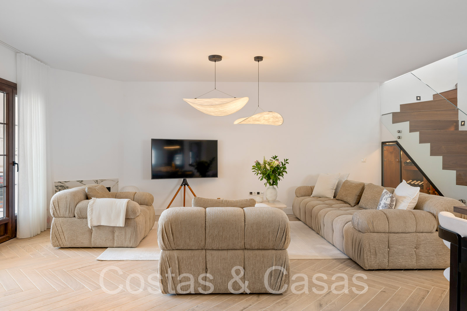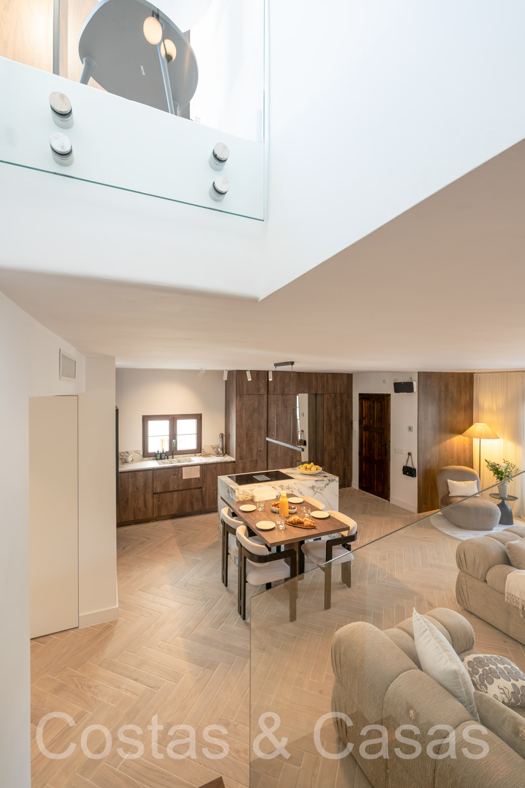 Apartamento dúplex totalmente reformado de 2 plantas. Cuidadosamente renovado con atención a un acabado superior. Orientación sur. Vistas al pintoresco entorno, al paisaje de montaña y vistas parciales al mar. Un hermoso solárium ofrece una piscina privada, una ducha al aire libre, espacio para relajarse y una sauna. Decoración elegante y contemporánea. Concepto de planta abierta. Amplio salón con acogedora sala de TV. Cocina abierta, totalmente equipada con isla de cocina y mesa integrada. Una amplia terraza cubierta equipada con una cocina exterior con barbacoa/parrilla y un comedor al aire libre. 3 dormitorios, 2 baños y aseo independiente. La suite principal tiene un amplio vestidor. Bodega de vinos incorporada. Los suelos de piedra natural tienen un patrón en espiga. Plaza de aparcamiento cubierta.