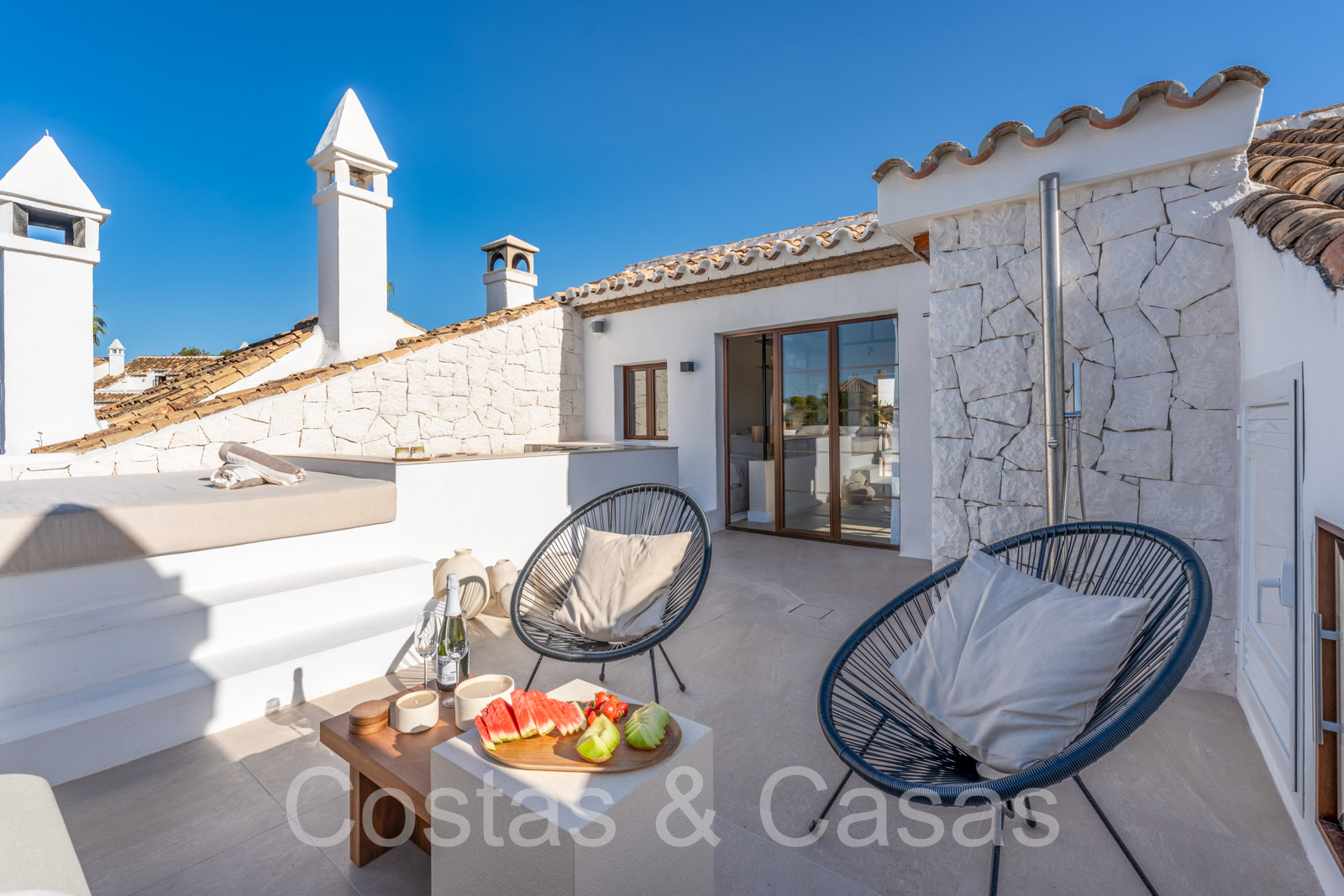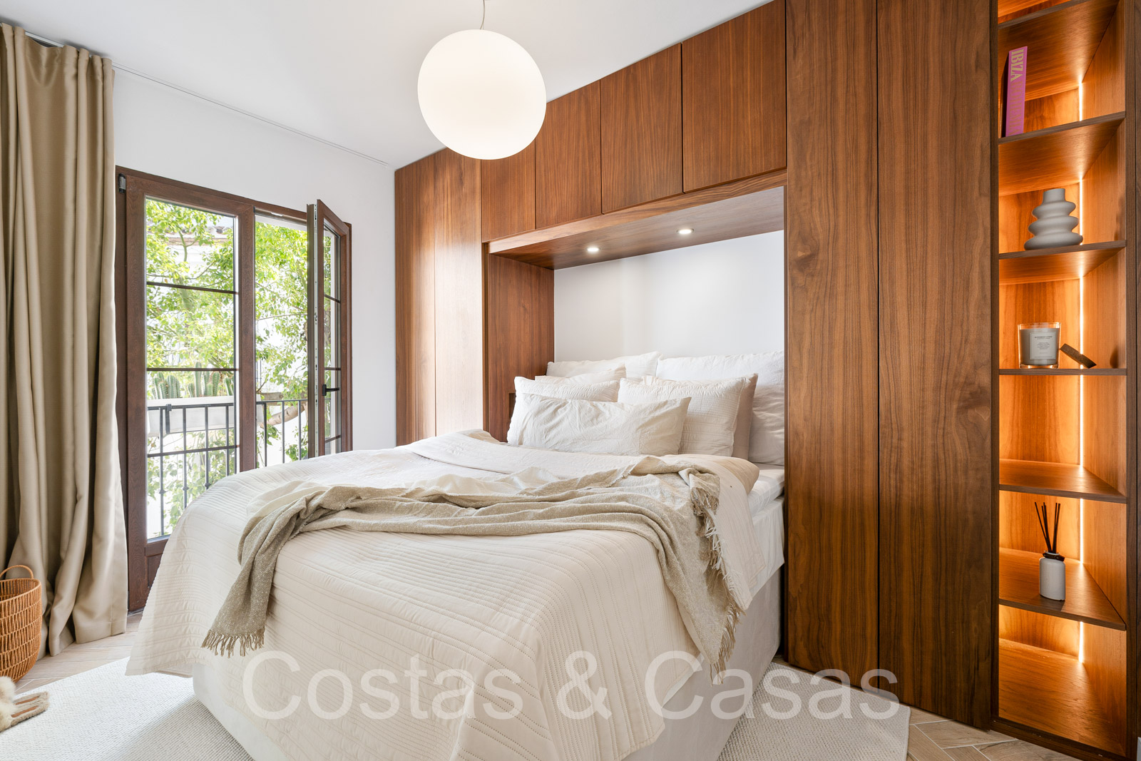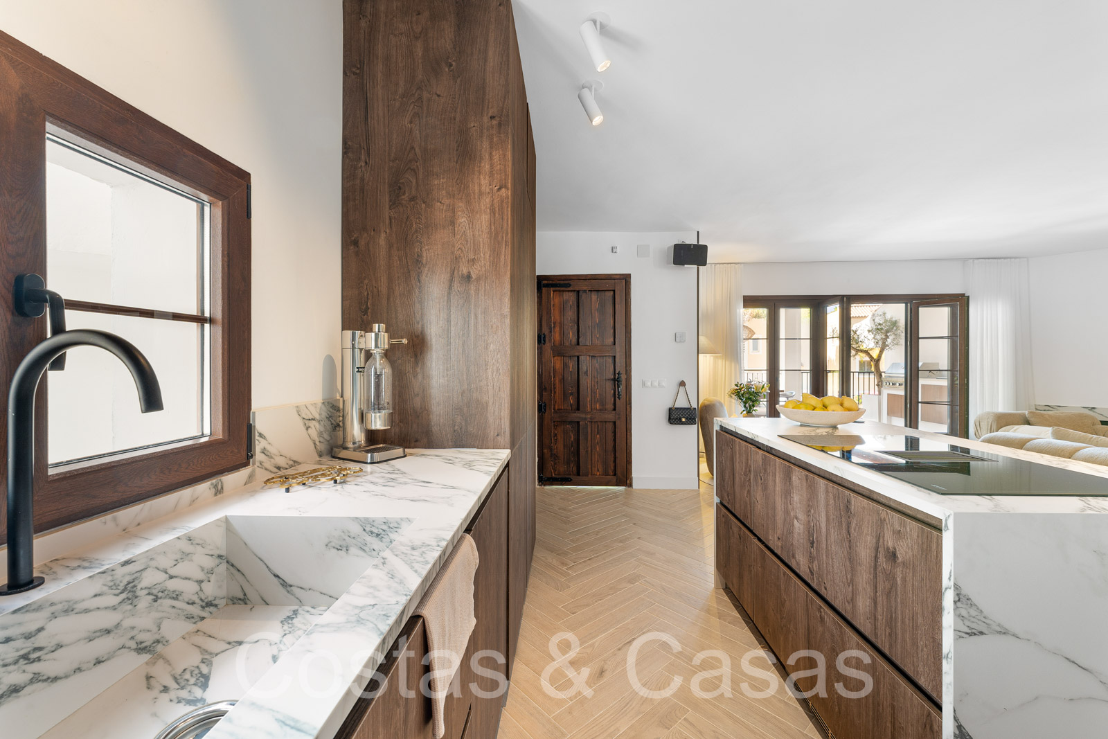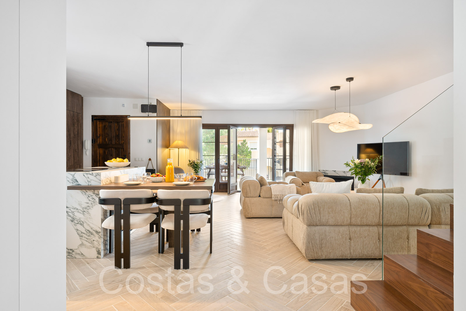 Apartamento dúplex totalmente reformado de 2 plantas. Cuidadosamente renovado con atención a un acabado superior. Orientación sur. Vistas al pintoresco entorno, al paisaje de montaña y vistas parciales al mar. Un hermoso solárium ofrece una piscina privada, una ducha al aire libre, espacio para relajarse y una sauna. Decoración elegante y contemporánea. Concepto de planta abierta. Amplio salón con acogedora sala de TV. Cocina abierta, totalmente equipada con isla de cocina y mesa integrada. Una amplia terraza cubierta equipada con una cocina exterior con barbacoa/parrilla y un comedor al aire libre. 3 dormitorios, 2 baños y aseo independiente. La suite principal tiene un amplio vestidor. Bodega de vinos incorporada. Los suelos de piedra natural tienen un patrón en espiga. Plaza de aparcamiento cubierta.
