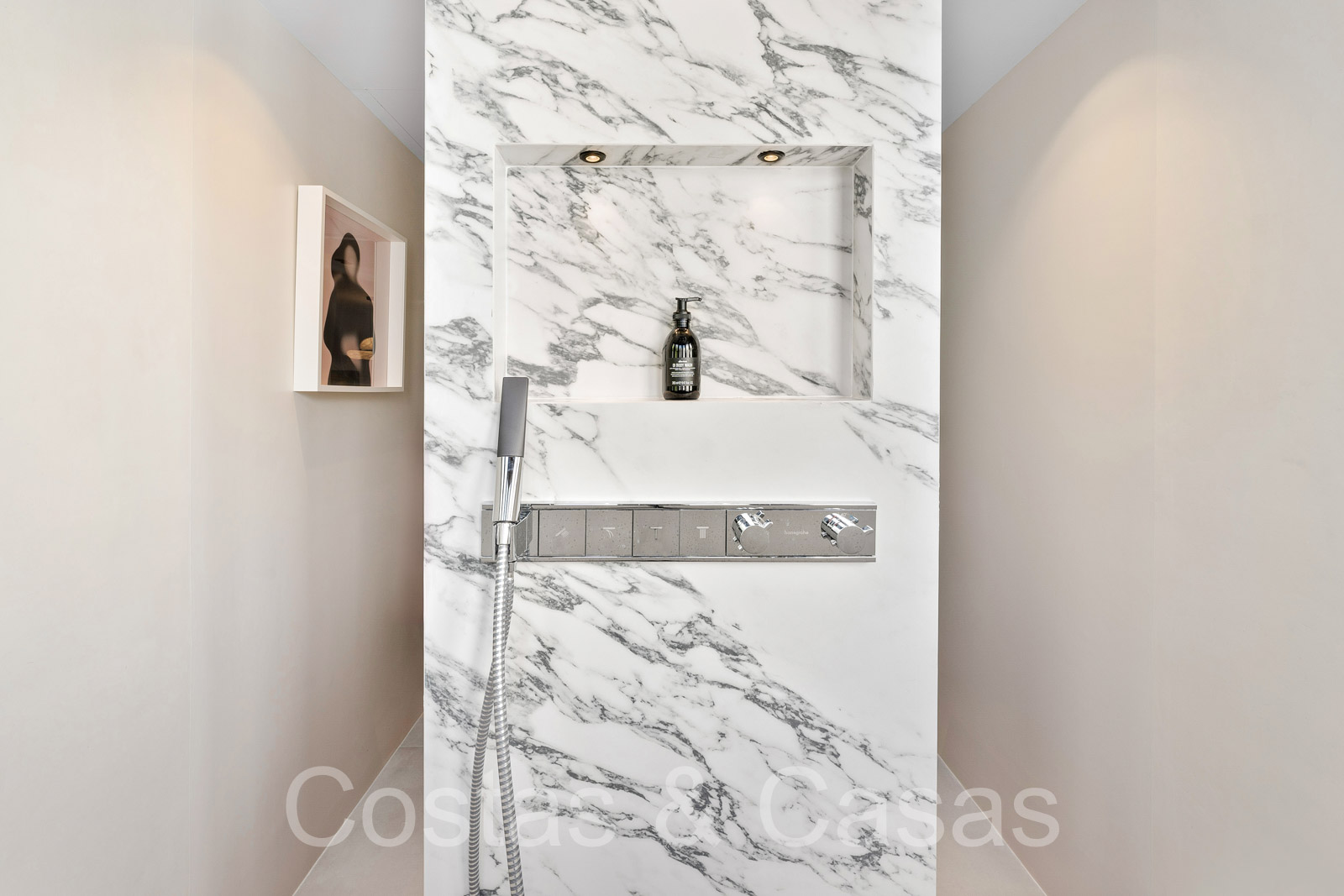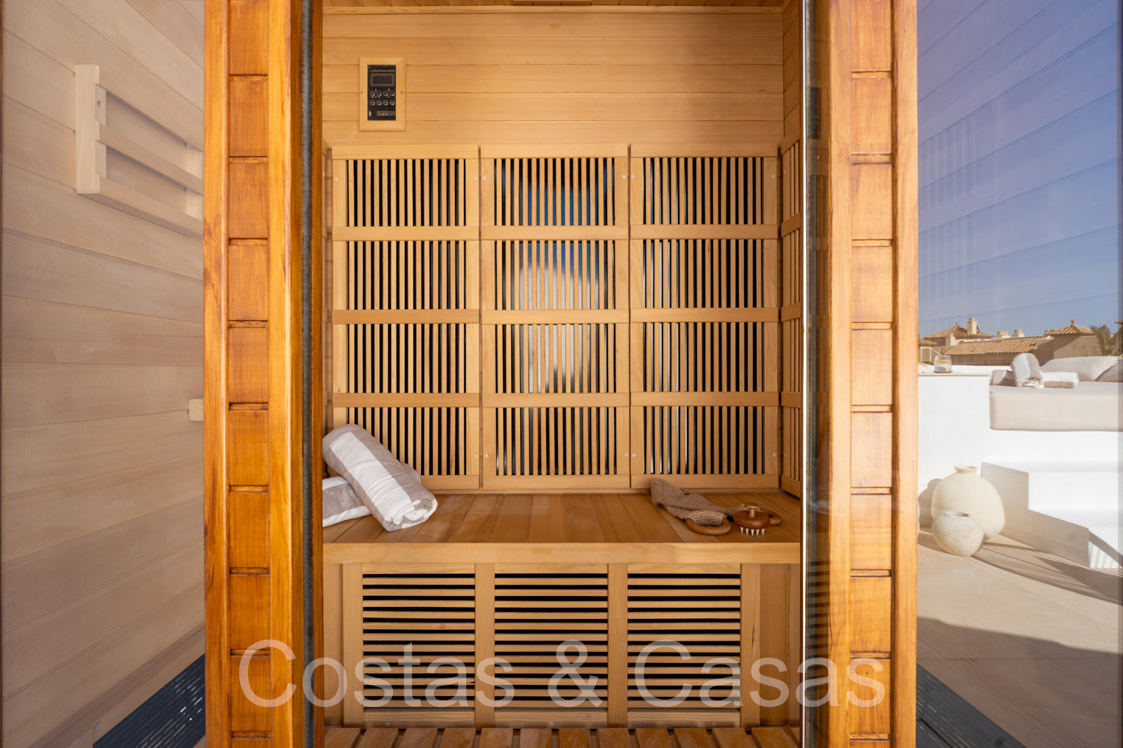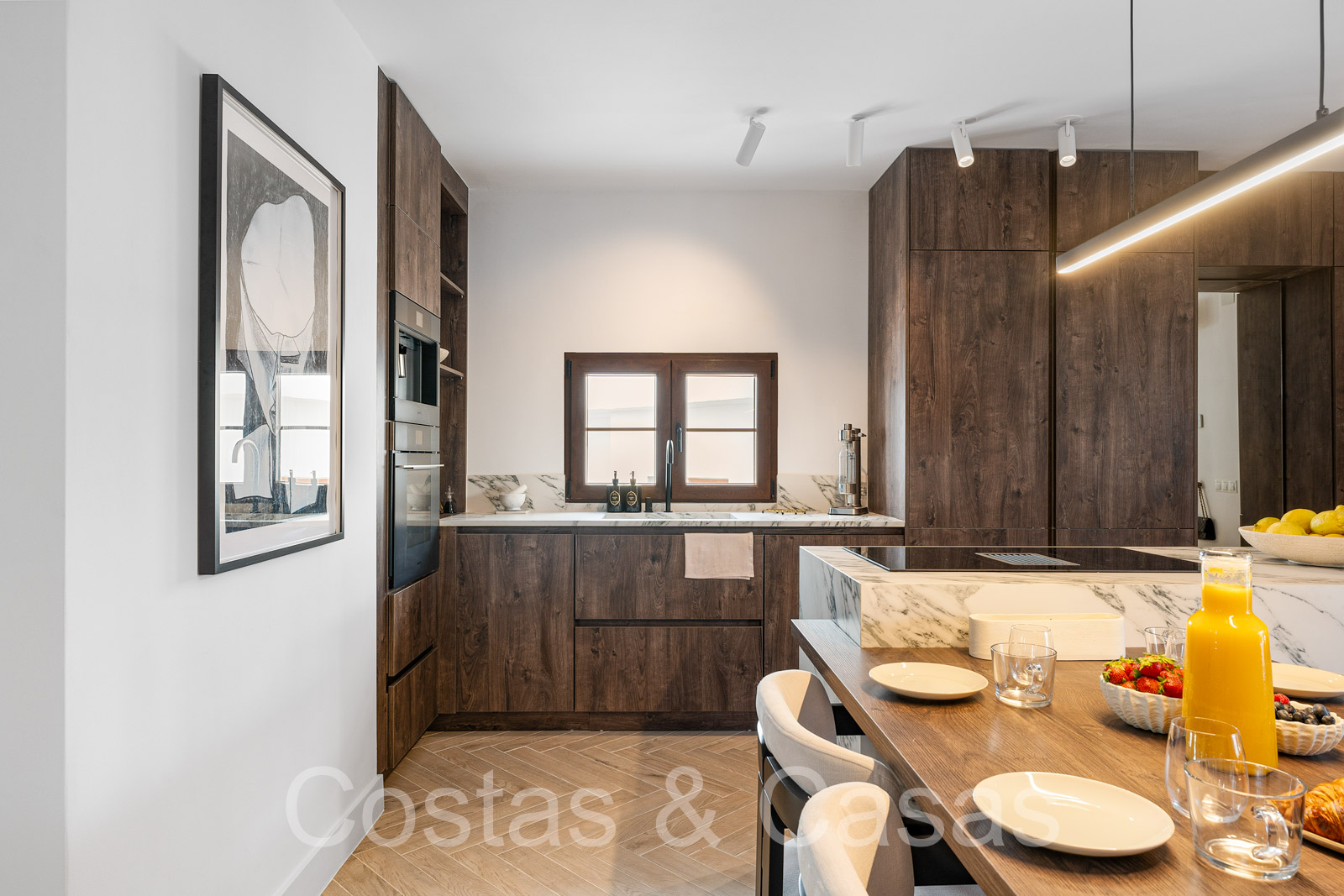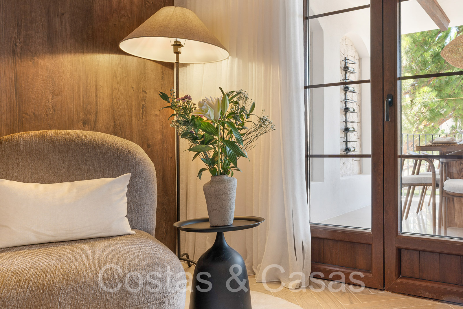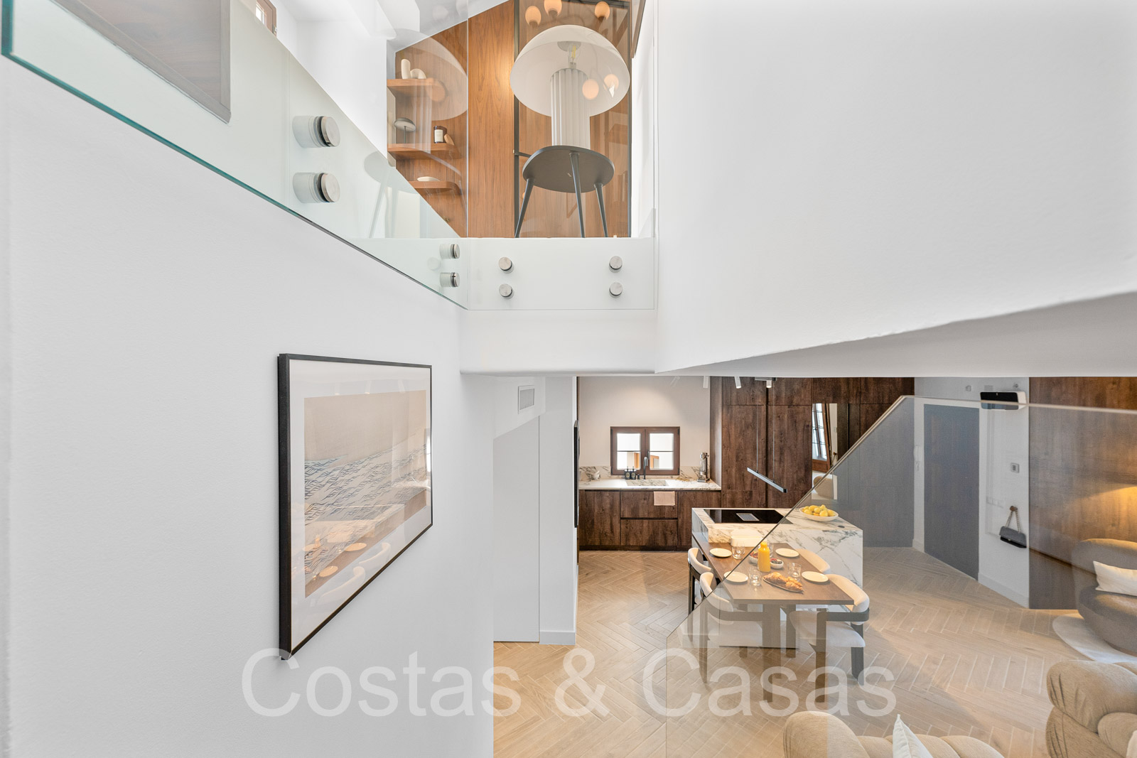 Apartamento dúplex totalmente reformado de 2 plantas. Cuidadosamente renovado con atención a un acabado superior. Orientación sur. Vistas al pintoresco entorno, al paisaje de montaña y vistas parciales al mar. Un hermoso solárium ofrece una piscina privada, una ducha al aire libre, espacio para relajarse y una sauna. Decoración elegante y contemporánea. Concepto de planta abierta. Amplio salón con acogedora sala de TV. Cocina abierta, totalmente equipada con isla de cocina y mesa integrada. Una amplia terraza cubierta equipada con una cocina exterior con barbacoa/parrilla y un comedor al aire libre. 3 dormitorios, 2 baños y aseo independiente. La suite principal tiene un amplio vestidor. Bodega de vinos incorporada. Los suelos de piedra natural tienen un patrón en espiga. Plaza de aparcamiento cubierta.
