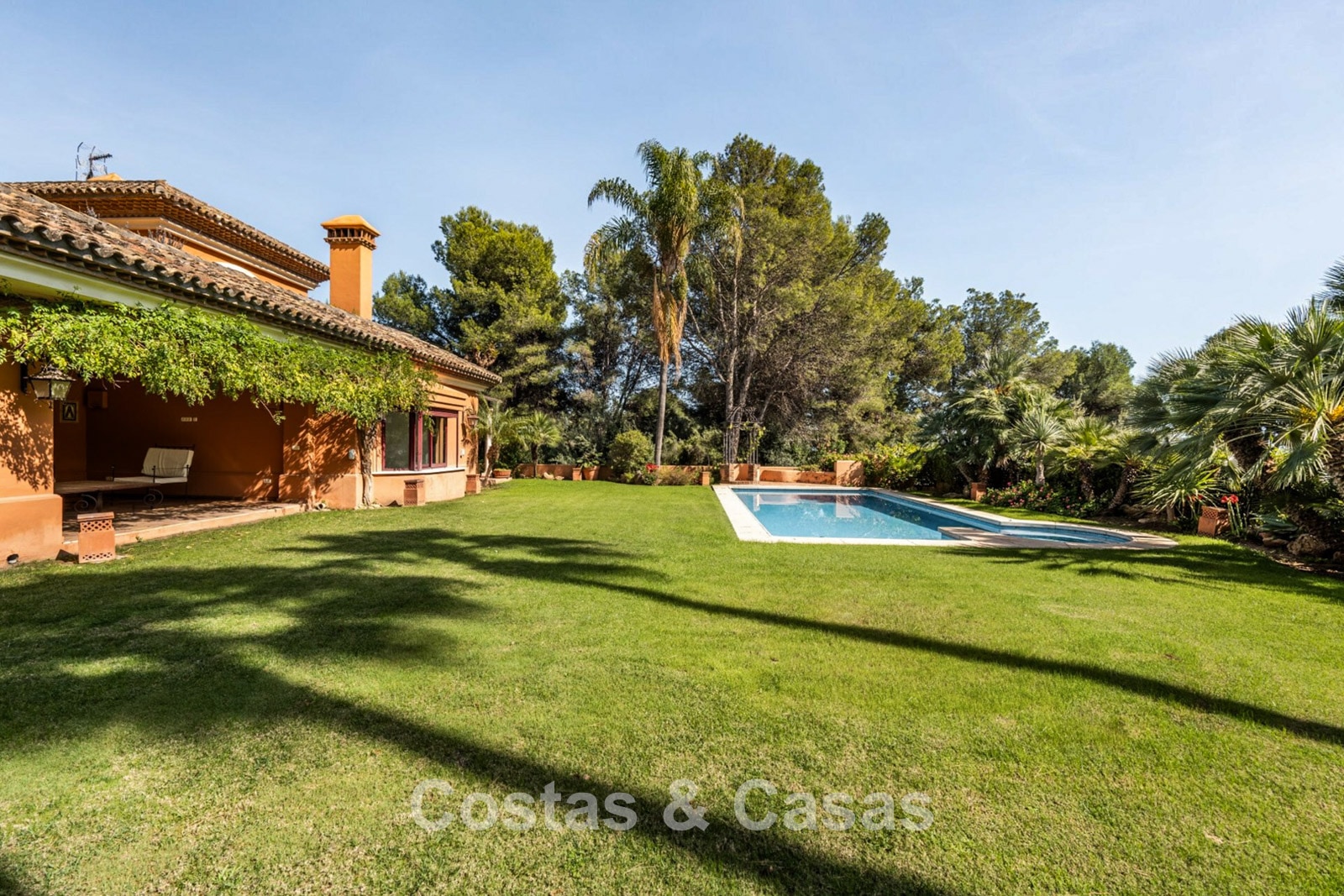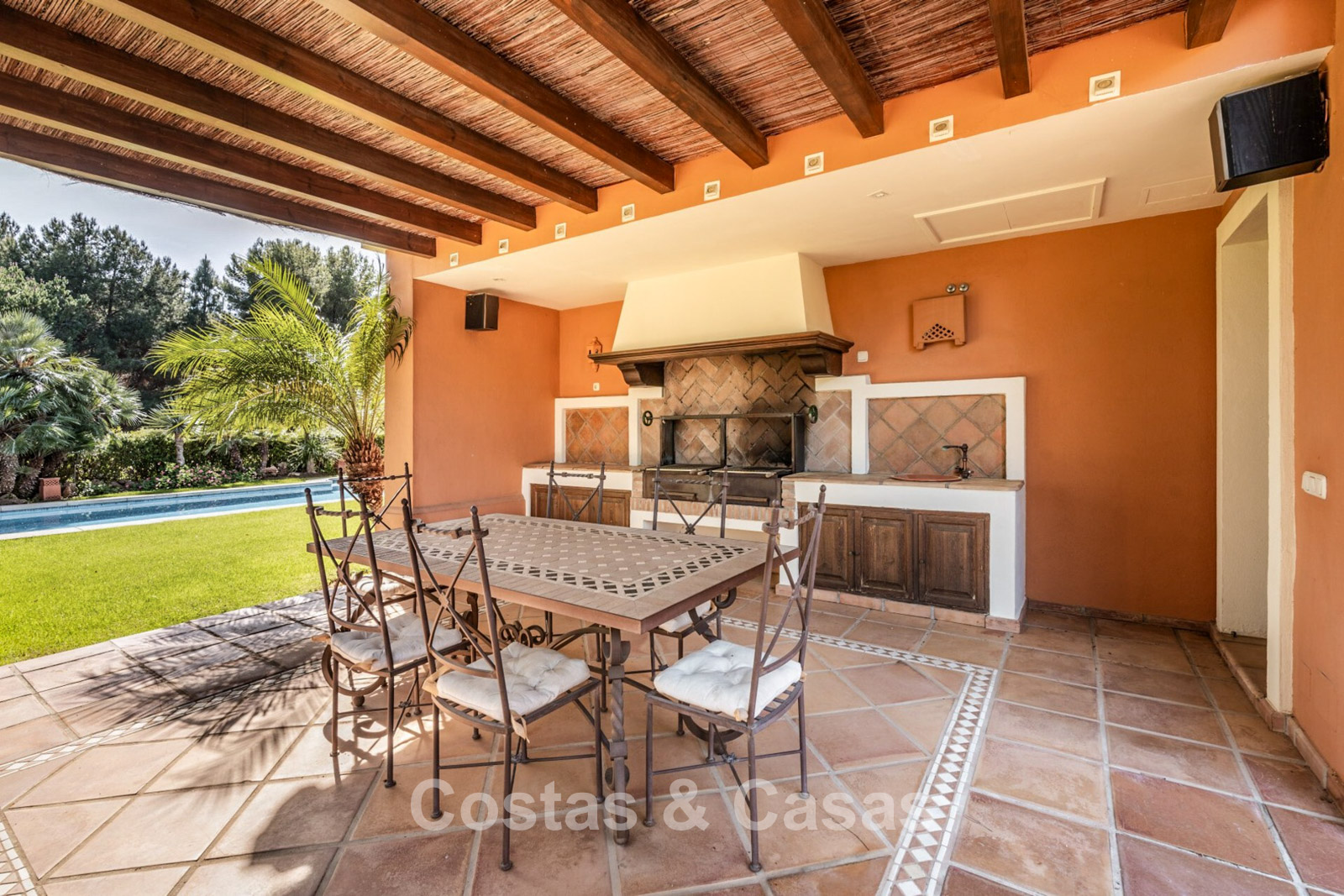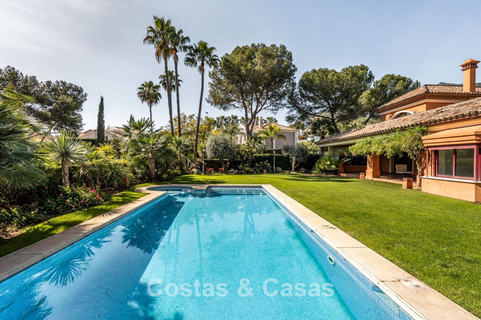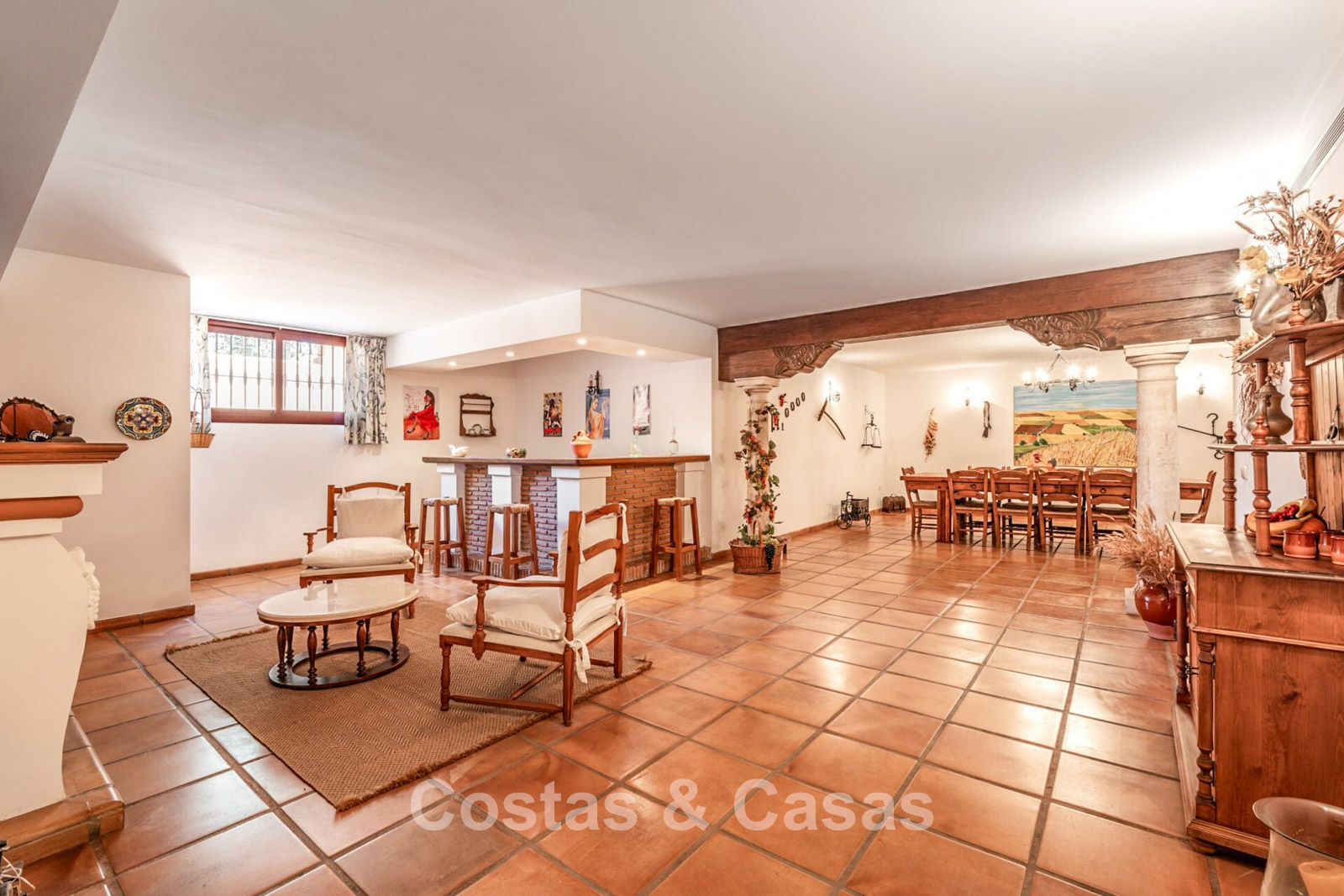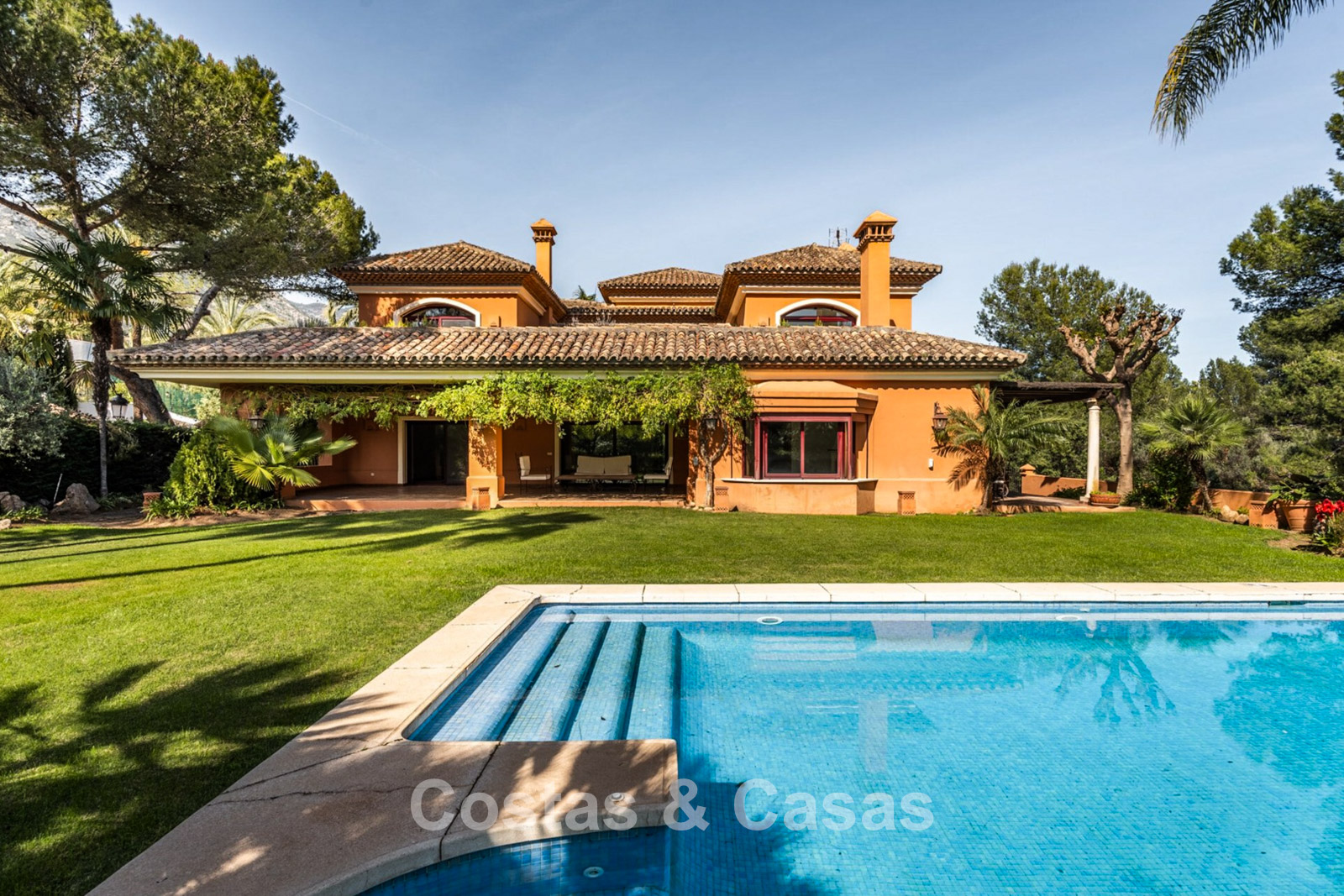 Villa mediterráneo independiente en excelente estado, caracterizada por sus detalles en terracota. Con su decoración clásica, impresionantes techos y hermosas vigas de madera, esta villa irradia auténtica elegancia mediterránea. Sus altos ventanales correderos se abren a las zonas exteriores y generan abundante luz natural. Amplio salón con techo abovedado de vigas de gran altura. Amplia cocina totalmente equipada con comedor contiguo. Despacho privado. 5 dormitorios, 4 baños y un aseo. Amplio dormitorio principal con vestidor. En la planta inferior, un espacio multifuncional con zona de relax y bar. Un segundo espacio multifuncional puede configurarse como sala de juegos y/o de ocio. Un pasillo funcional también se ha convertido en bodega. Suelos de mármol. Garaje integrado. Aparcamiento adicional para 2 coches.
