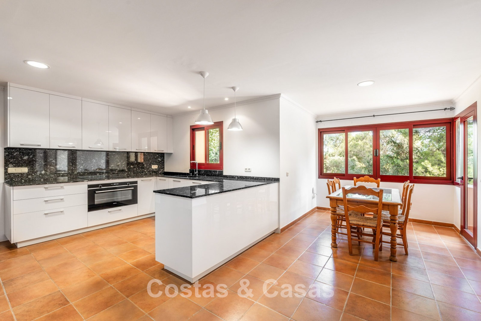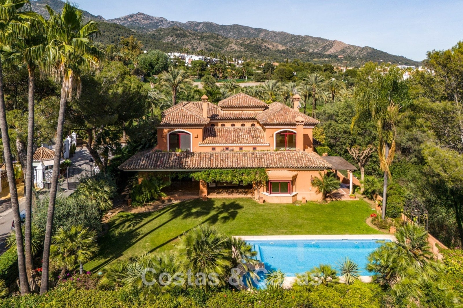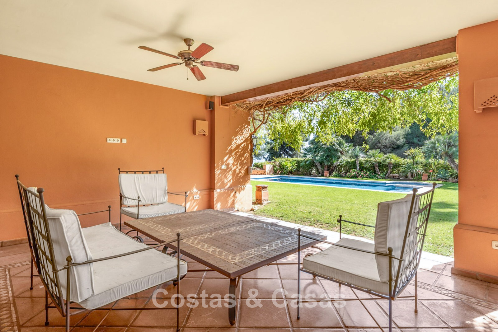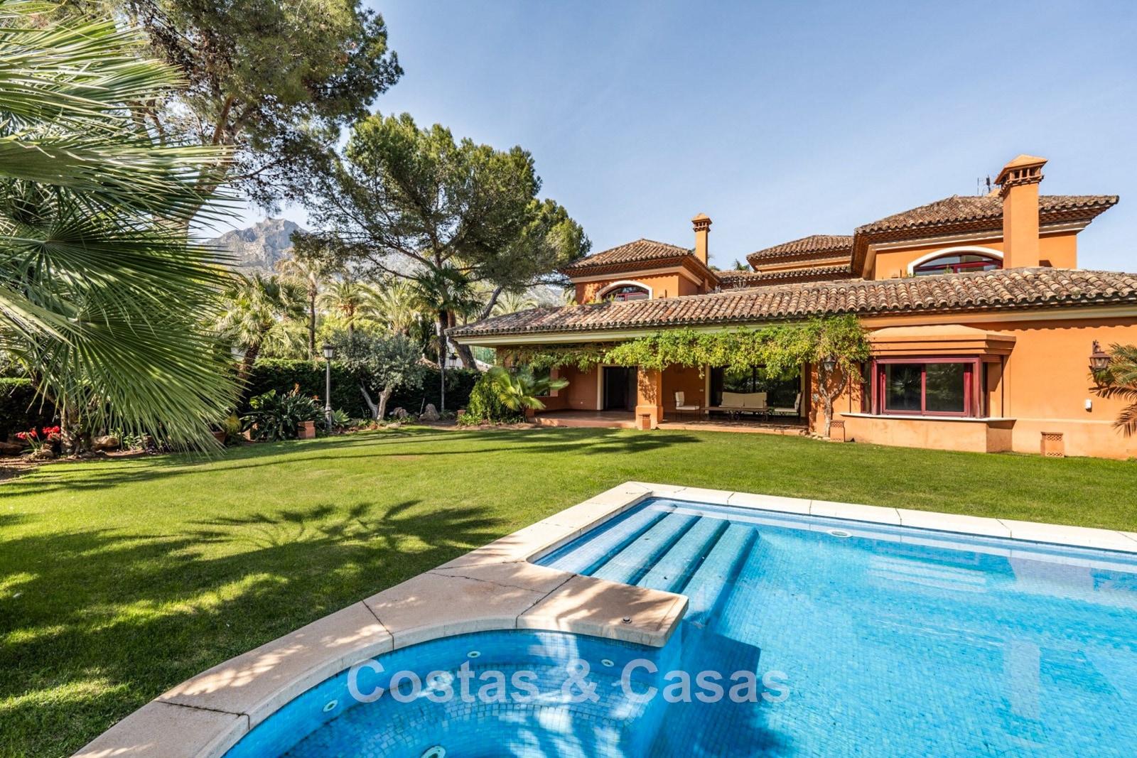 Villa mediterráneo independiente en excelente estado, caracterizada por sus detalles en terracota. Con su decoración clásica, impresionantes techos y hermosas vigas de madera, esta villa irradia auténtica elegancia mediterránea. Sus altos ventanales correderos se abren a las zonas exteriores y generan abundante luz natural. Amplio salón con techo abovedado de vigas de gran altura. Amplia cocina totalmente equipada con comedor contiguo. Despacho privado. 5 dormitorios, 4 baños y un aseo. Amplio dormitorio principal con vestidor. En la planta inferior, un espacio multifuncional con zona de relax y bar. Un segundo espacio multifuncional puede configurarse como sala de juegos y/o de ocio. Un pasillo funcional también se ha convertido en bodega. Suelos de mármol. Garaje integrado. Aparcamiento adicional para 2 coches.