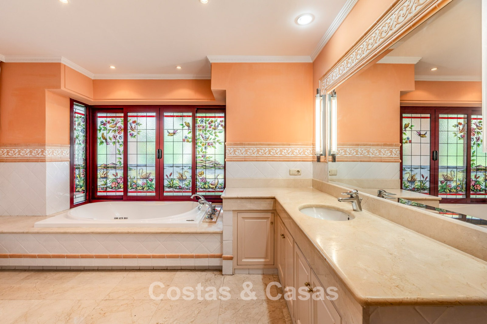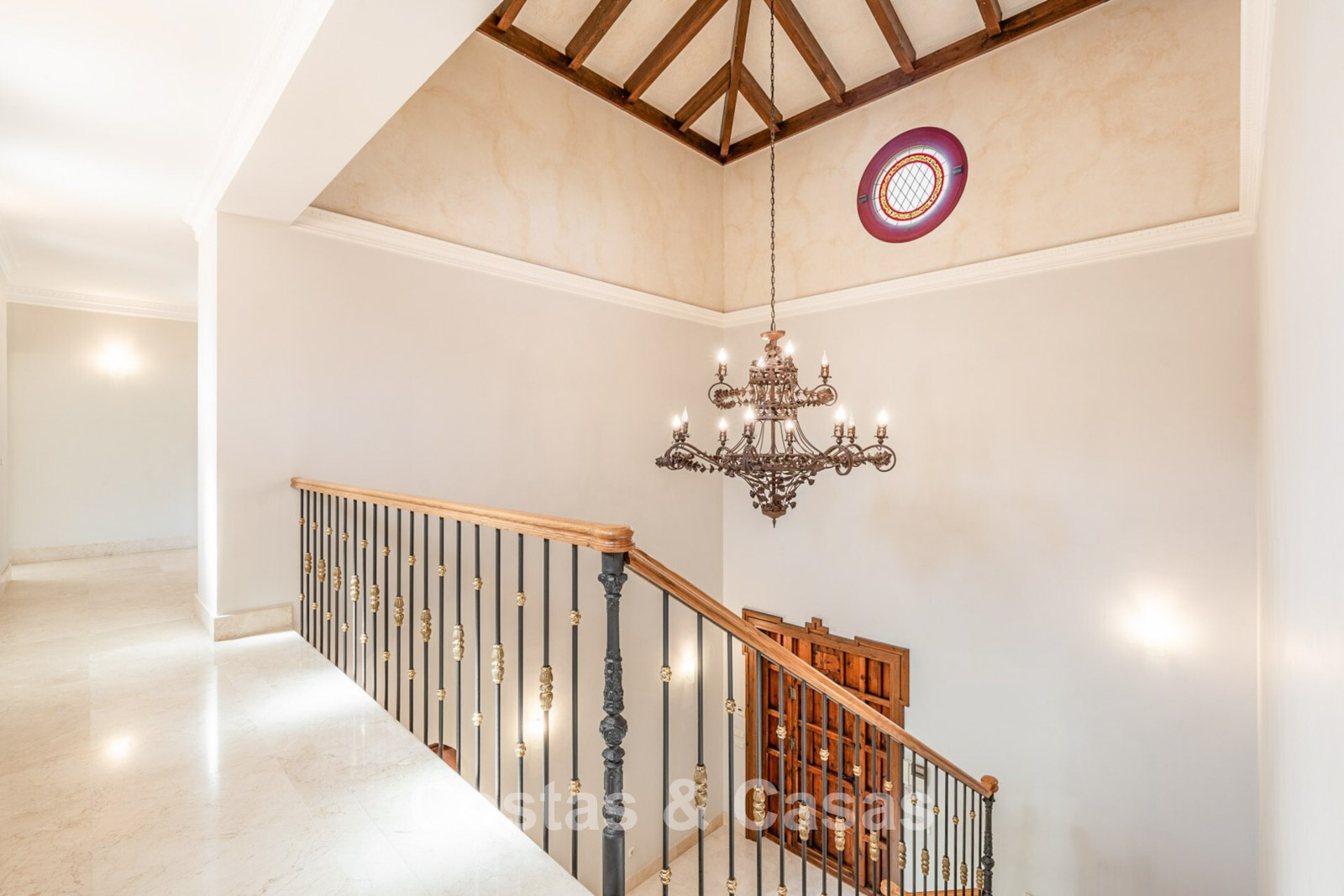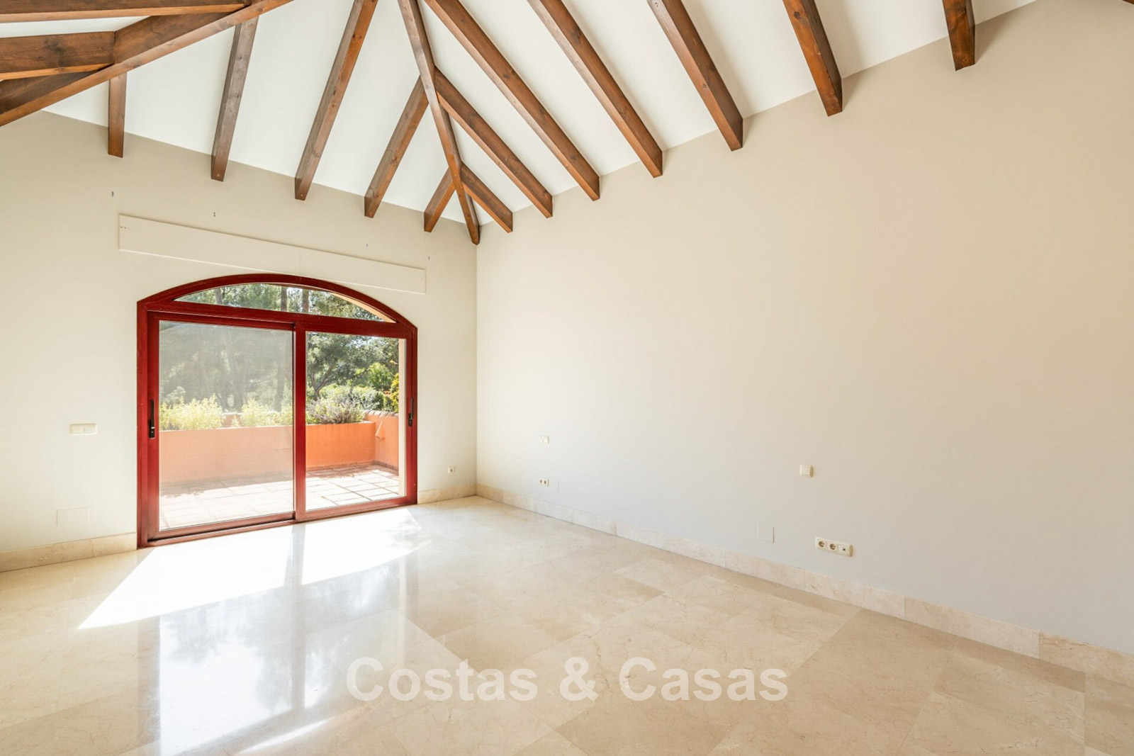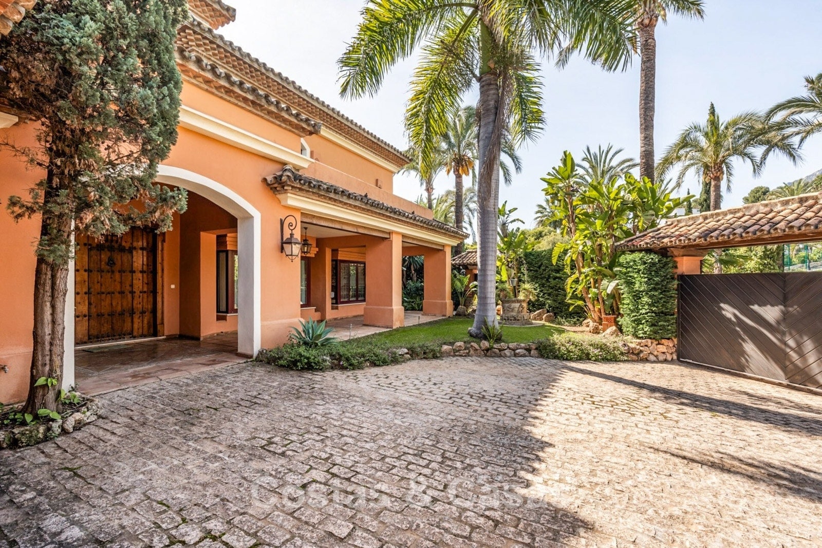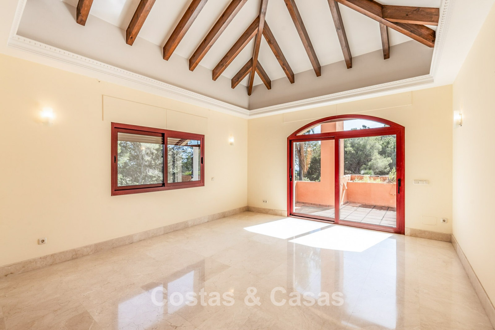 Villa mediterráneo independiente en excelente estado, caracterizada por sus detalles en terracota. Con su decoración clásica, impresionantes techos y hermosas vigas de madera, esta villa irradia auténtica elegancia mediterránea. Sus altos ventanales correderos se abren a las zonas exteriores y generan abundante luz natural. Amplio salón con techo abovedado de vigas de gran altura. Amplia cocina totalmente equipada con comedor contiguo. Despacho privado. 5 dormitorios, 4 baños y un aseo. Amplio dormitorio principal con vestidor. En la planta inferior, un espacio multifuncional con zona de relax y bar. Un segundo espacio multifuncional puede configurarse como sala de juegos y/o de ocio. Un pasillo funcional también se ha convertido en bodega. Suelos de mármol. Garaje integrado. Aparcamiento adicional para 2 coches.