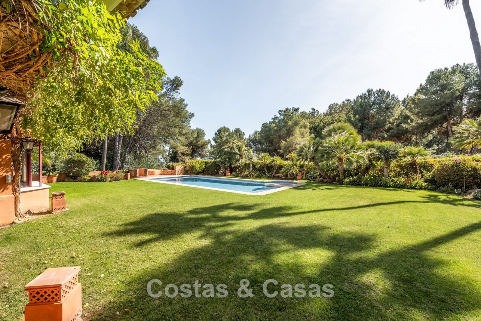 Amplia parcela, completamente rodeada de vegetación y con una privacidad óptima. Jardín bien cuidado con numerosas plantas tropicales y césped. Gran piscina con jacuzzi integrado. Terrazas descubiertas y cubiertas en la planta baja y la planta alta ofrecen espacio para tumbonas u otros espacios de relajación. Orientación suroeste. Vistas pintorescas al exuberante jardín.