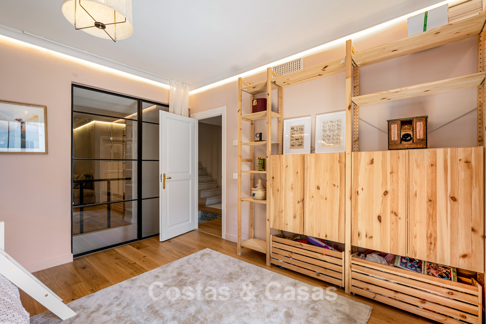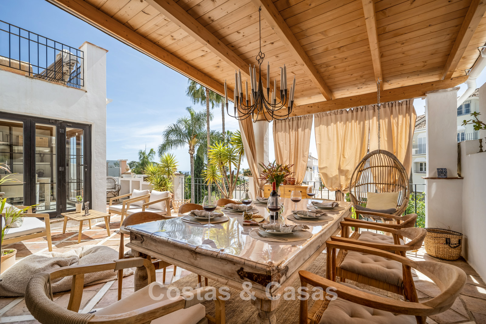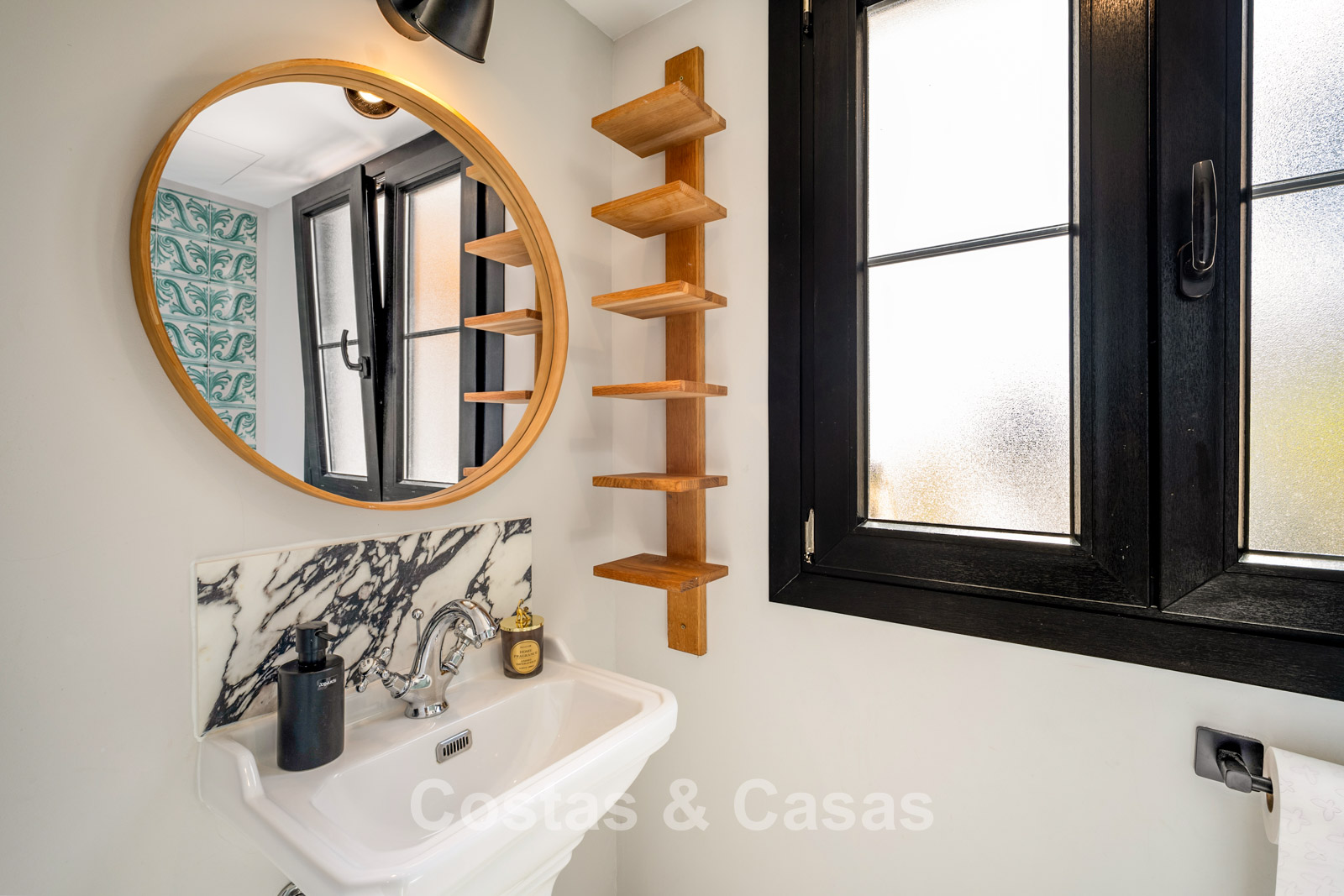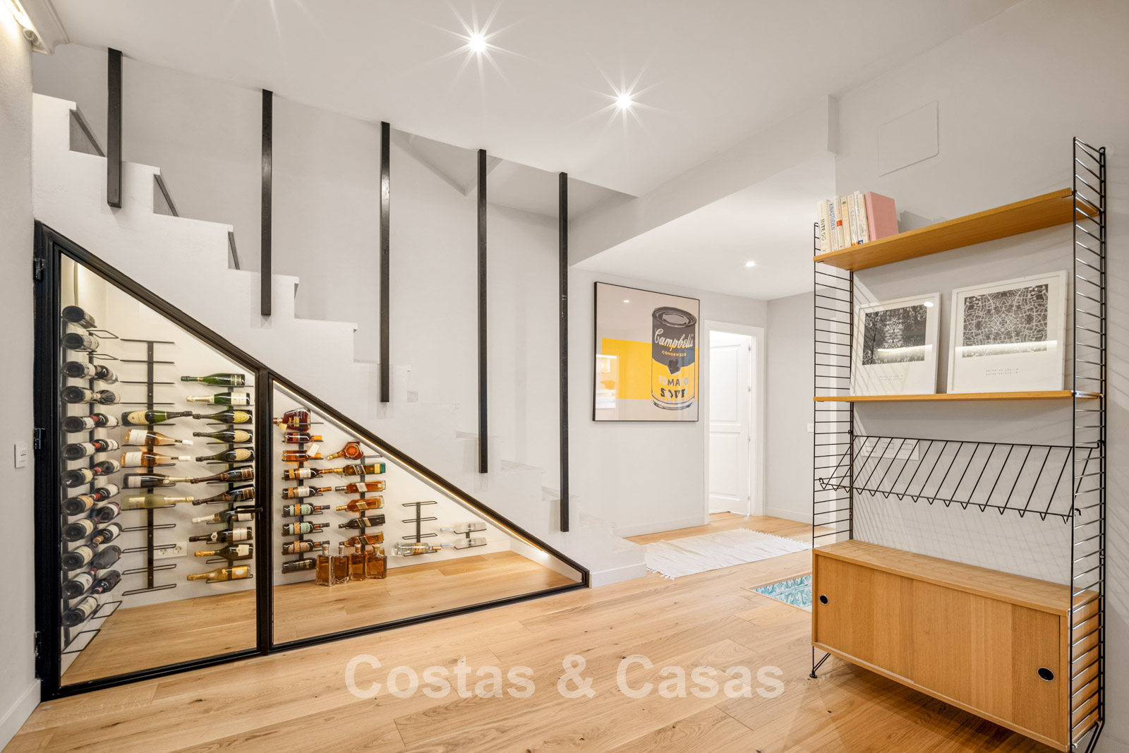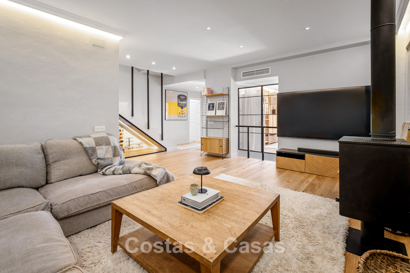 Una casa adosada superior renovada en impecables condiciones. Esta casa adosada de estilo andaluz atemporal combina el encanto tradicional con elegantes interiores escandinavos. Situada al suroeste. Desde la terraza se tiene una hermosa vista del mar Mediterráneo. Terrazas soleadas y cubiertas con zona chill-out y un acogedor 'comedor al fresco'. Las ventanas altas en toda la casa proporcionan un interior luminoso y acceso a las zonas exteriores. Concepto de planta abierta. La espaciosa sala de estar cuenta con un techo con vigas de doble altura y una vista de la planta superior. La espaciosa y elegante cocina, equipada con una isla central para sentarse. Comedor integrado que da a una terraza con barbacoa. 4 dormitorios y 4+1 baños. El nivel del sótano ofrece un valor adicional con un dormitorio de invitados, un acogedor salón, un baño y una sauna privada, perfecto para entretener a los invitados o crear un oasis de bienestar personal. El sótano también se puede convertir fácilmente en un garaje privado. Suelos de piedra natural. Cuarto de lavado.
