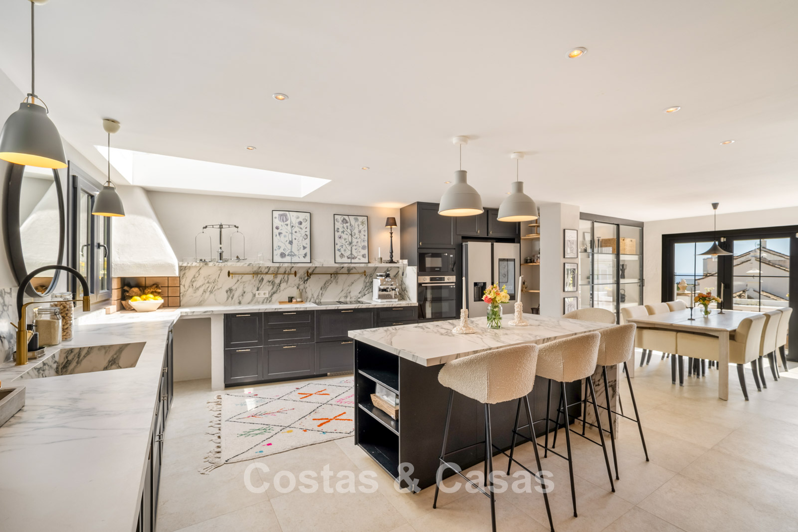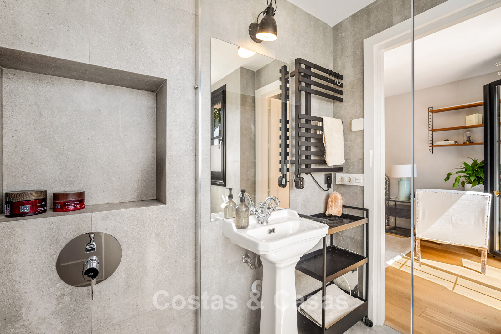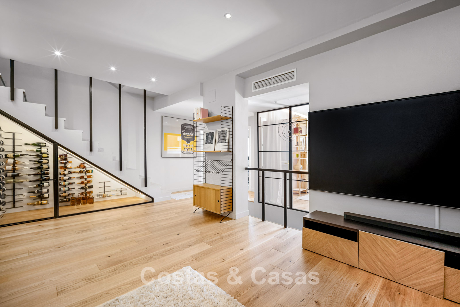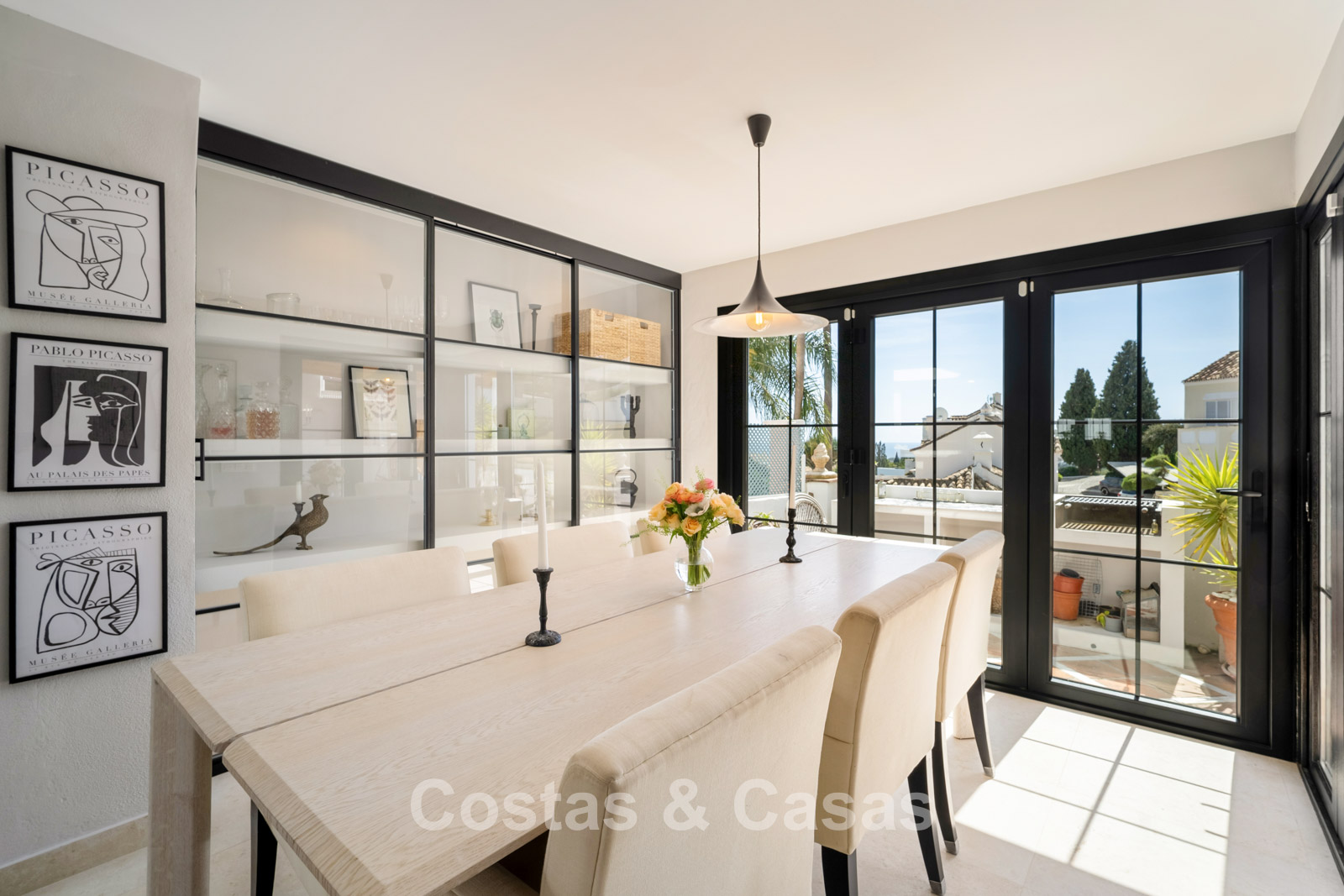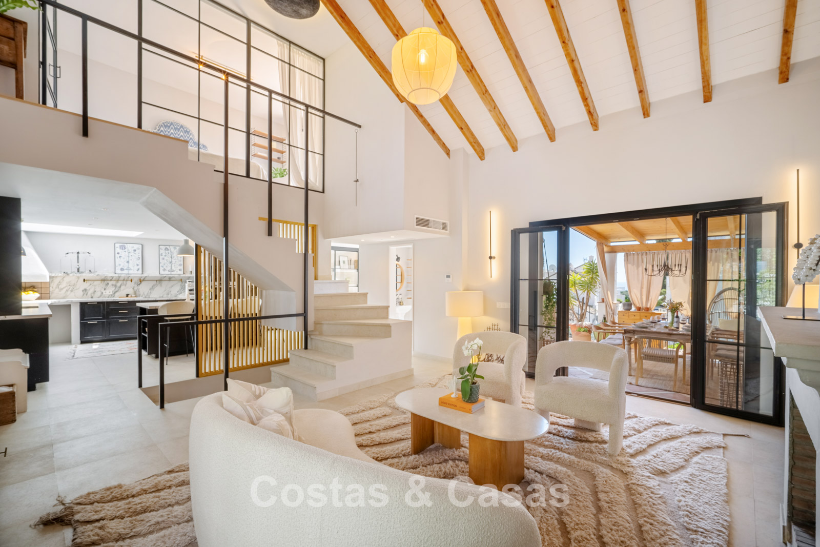 Una casa adosada superior renovada en impecables condiciones. Esta casa adosada de estilo andaluz atemporal combina el encanto tradicional con elegantes interiores escandinavos. Situada al suroeste. Desde la terraza se tiene una hermosa vista del mar Mediterráneo. Terrazas soleadas y cubiertas con zona chill-out y un acogedor 'comedor al fresco'. Las ventanas altas en toda la casa proporcionan un interior luminoso y acceso a las zonas exteriores. Concepto de planta abierta. La espaciosa sala de estar cuenta con un techo con vigas de doble altura y una vista de la planta superior. La espaciosa y elegante cocina, equipada con una isla central para sentarse. Comedor integrado que da a una terraza con barbacoa. 4 dormitorios y 4+1 baños. El nivel del sótano ofrece un valor adicional con un dormitorio de invitados, un acogedor salón, un baño y una sauna privada, perfecto para entretener a los invitados o crear un oasis de bienestar personal. El sótano también se puede convertir fácilmente en un garaje privado. Suelos de piedra natural. Cuarto de lavado.