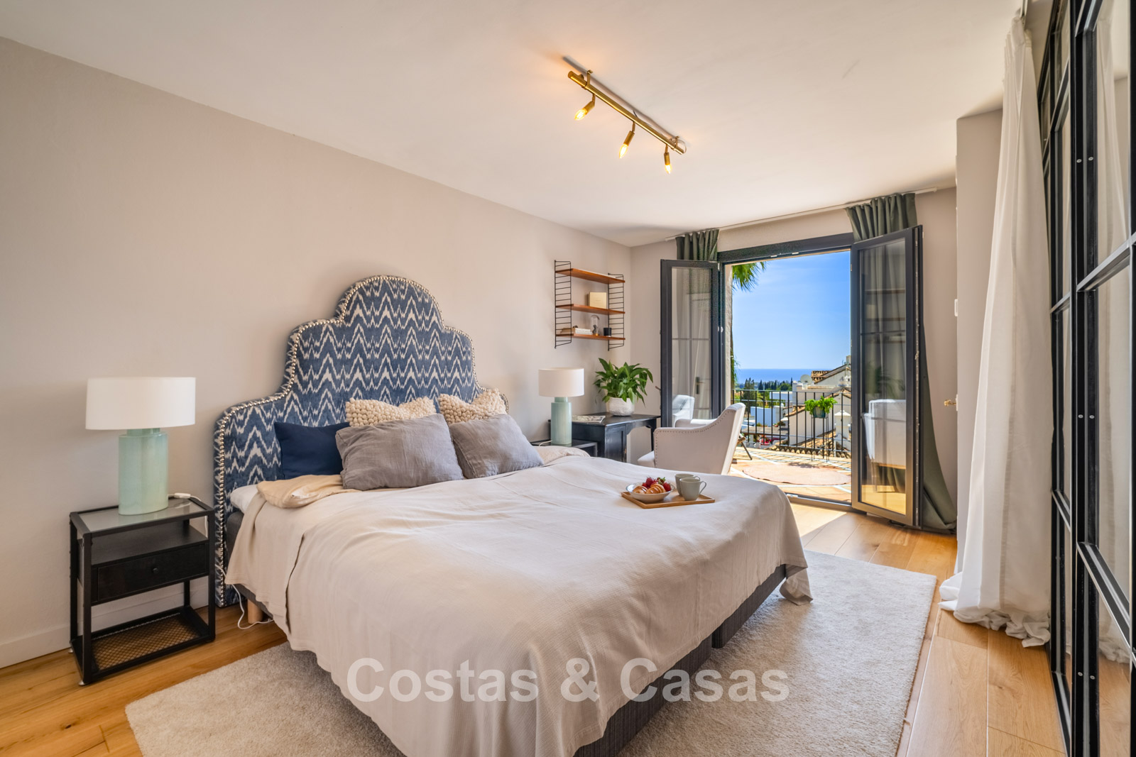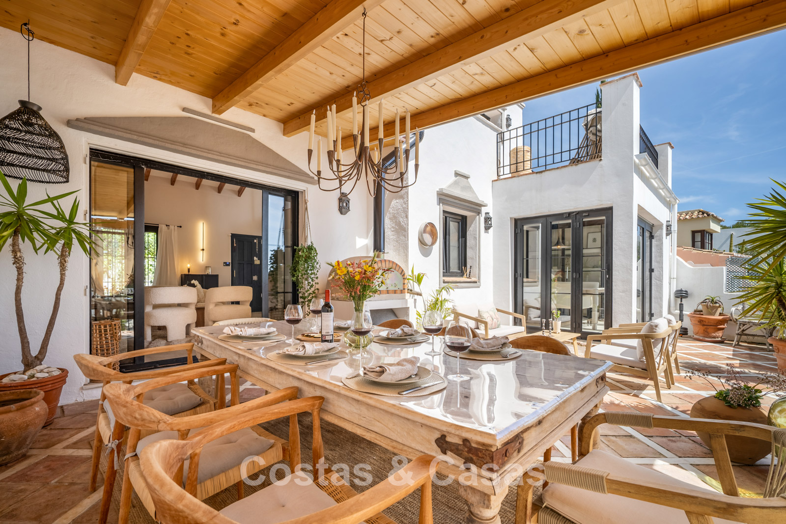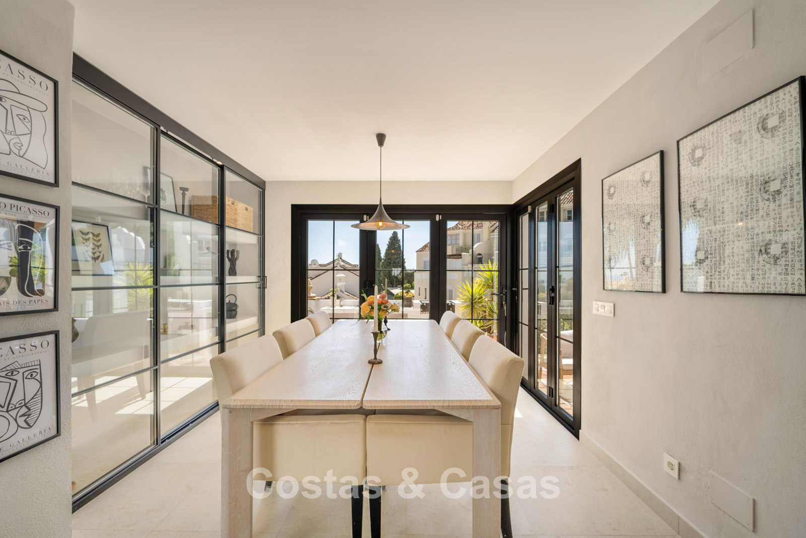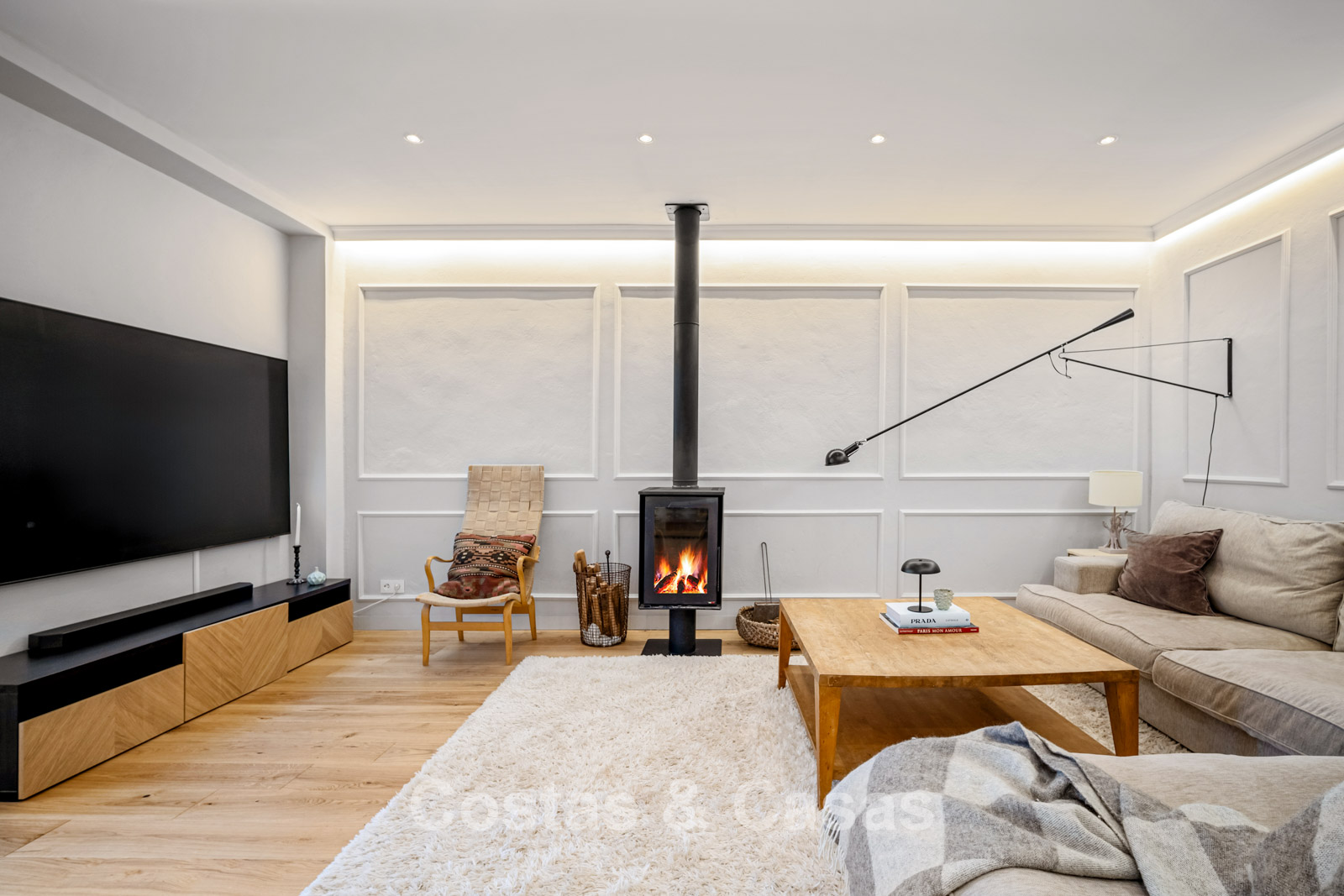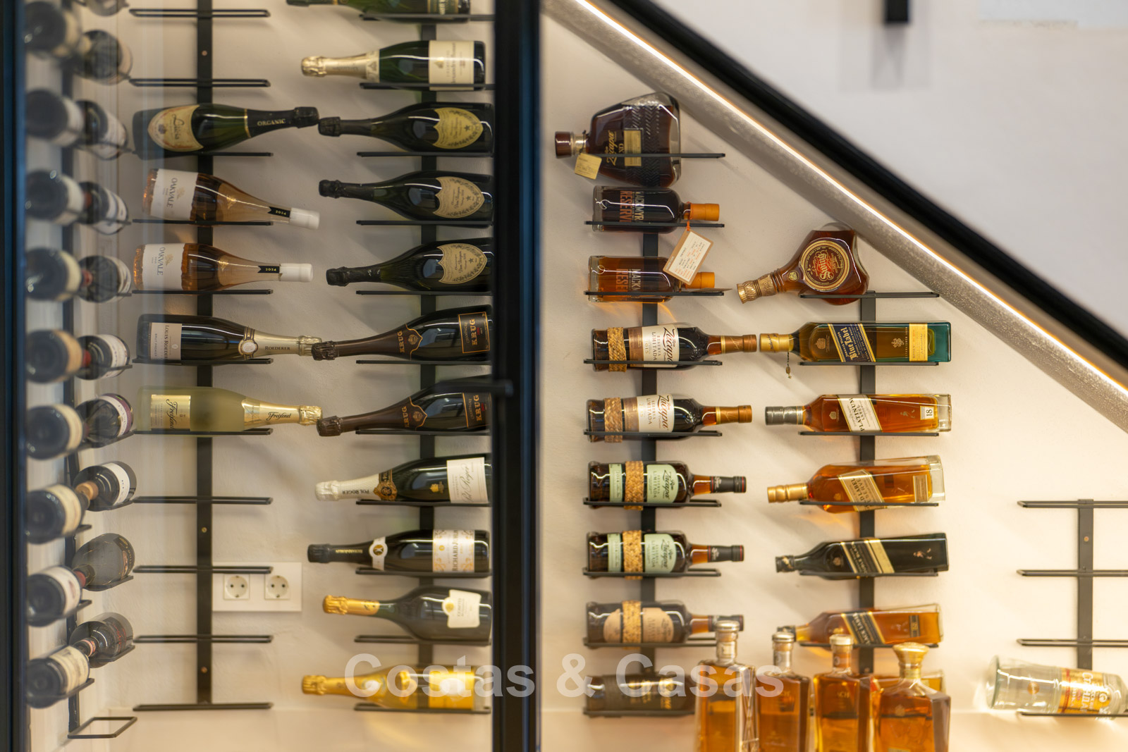 Una casa adosada superior renovada en impecables condiciones. Esta casa adosada de estilo andaluz atemporal combina el encanto tradicional con elegantes interiores escandinavos. Situada al suroeste. Desde la terraza se tiene una hermosa vista del mar Mediterráneo. Terrazas soleadas y cubiertas con zona chill-out y un acogedor 'comedor al fresco'. Las ventanas altas en toda la casa proporcionan un interior luminoso y acceso a las zonas exteriores. Concepto de planta abierta. La espaciosa sala de estar cuenta con un techo con vigas de doble altura y una vista de la planta superior. La espaciosa y elegante cocina, equipada con una isla central para sentarse. Comedor integrado que da a una terraza con barbacoa. 4 dormitorios y 4+1 baños. El nivel del sótano ofrece un valor adicional con un dormitorio de invitados, un acogedor salón, un baño y una sauna privada, perfecto para entretener a los invitados o crear un oasis de bienestar personal. El sótano también se puede convertir fácilmente en un garaje privado. Suelos de piedra natural. Cuarto de lavado.