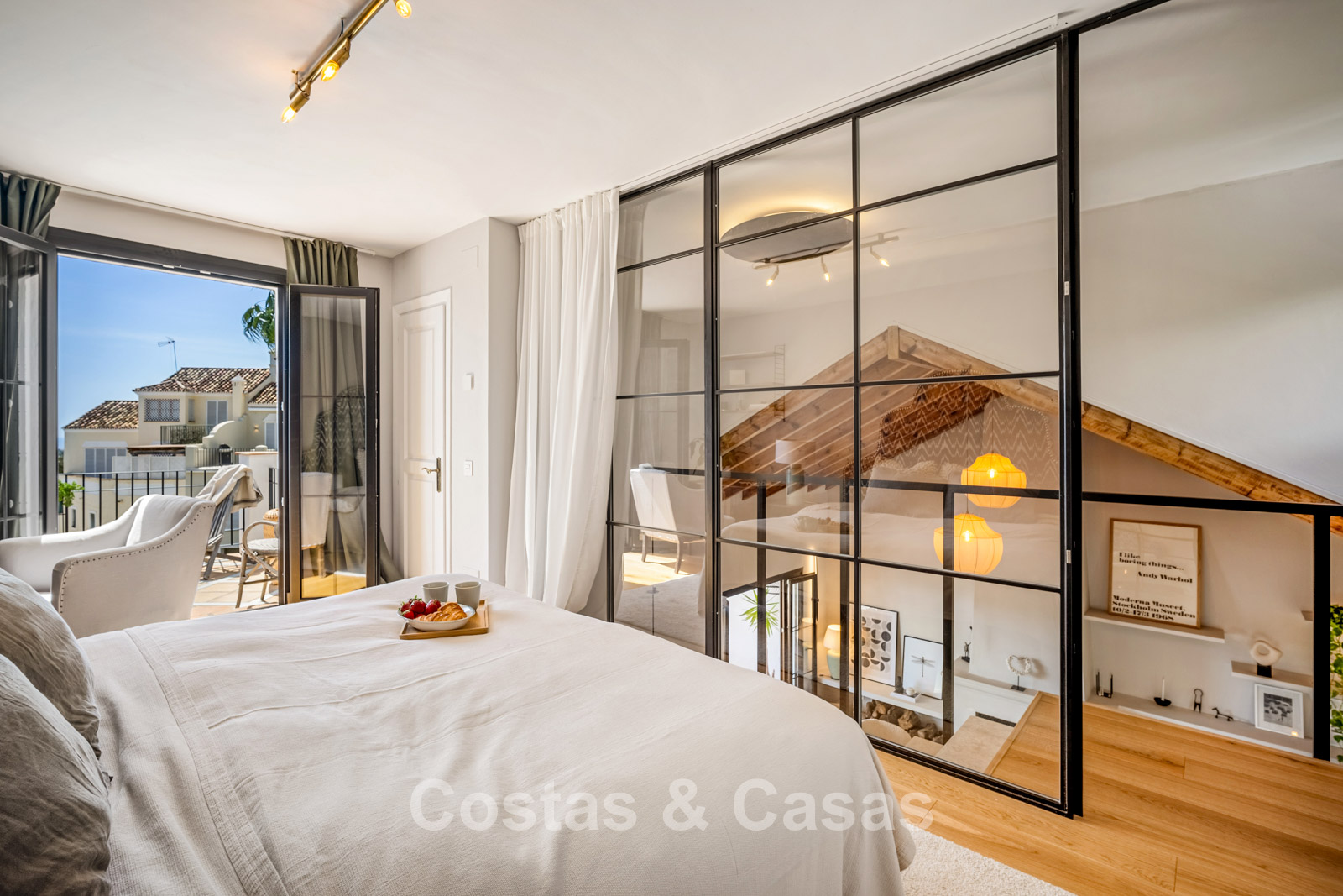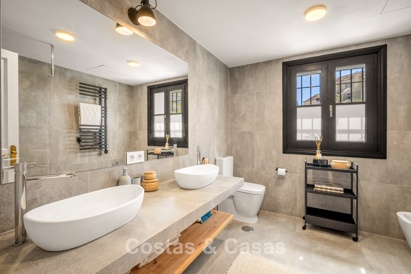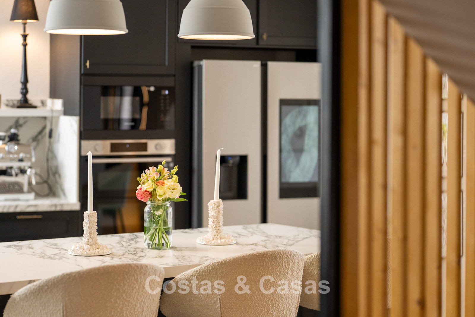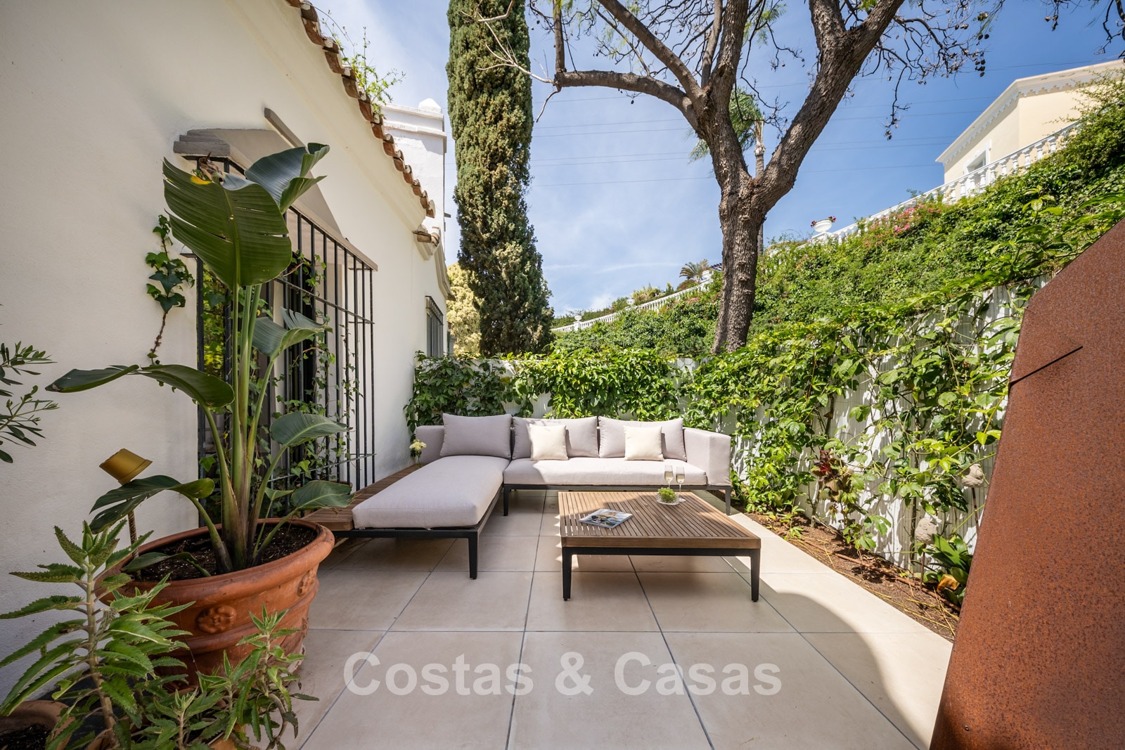 Una casa adosada superior renovada en impecables condiciones. Esta casa adosada de estilo andaluz atemporal combina el encanto tradicional con elegantes interiores escandinavos. Situada al suroeste. Desde la terraza se tiene una hermosa vista del mar Mediterráneo. Terrazas soleadas y cubiertas con zona chill-out y un acogedor 'comedor al fresco'. Las ventanas altas en toda la casa proporcionan un interior luminoso y acceso a las zonas exteriores. Concepto de planta abierta. La espaciosa sala de estar cuenta con un techo con vigas de doble altura y una vista de la planta superior. La espaciosa y elegante cocina, equipada con una isla central para sentarse. Comedor integrado que da a una terraza con barbacoa. 4 dormitorios y 4+1 baños. El nivel del sótano ofrece un valor adicional con un dormitorio de invitados, un acogedor salón, un baño y una sauna privada, perfecto para entretener a los invitados o crear un oasis de bienestar personal. El sótano también se puede convertir fácilmente en un garaje privado. Suelos de piedra natural. Cuarto de lavado.