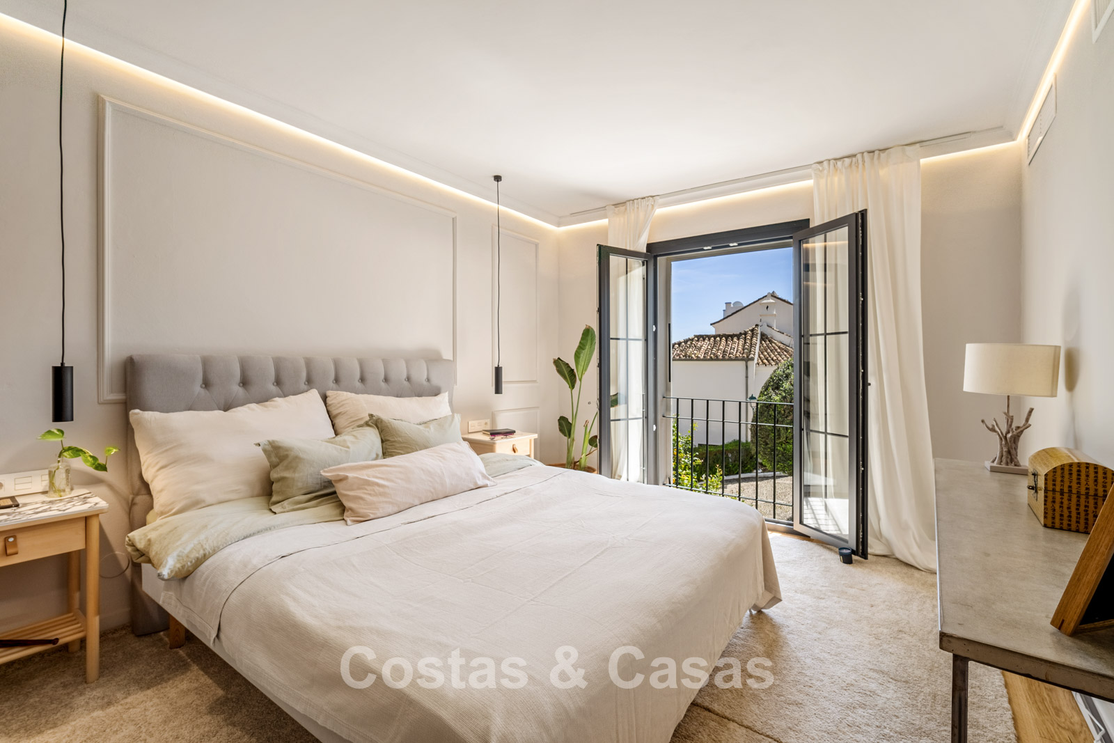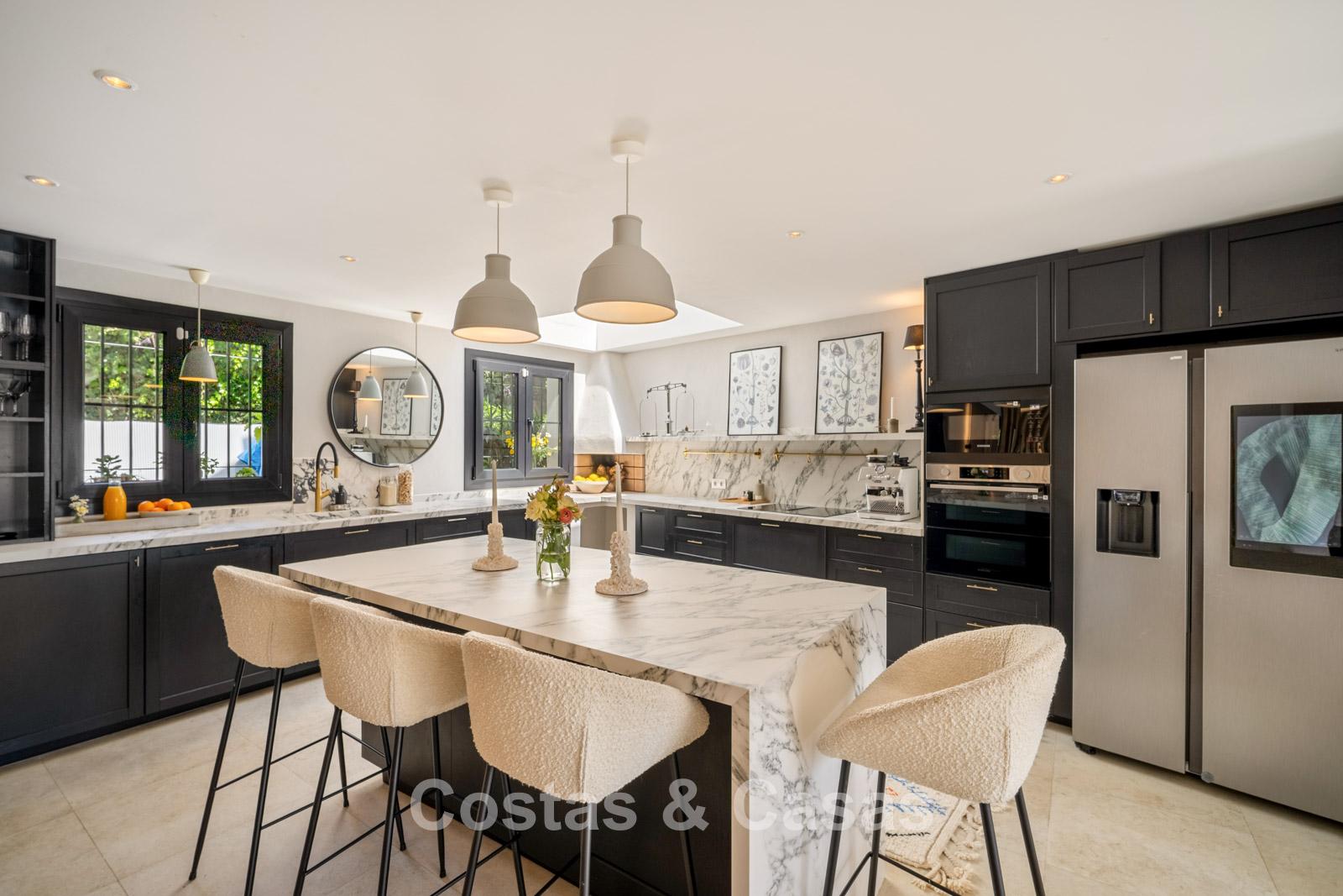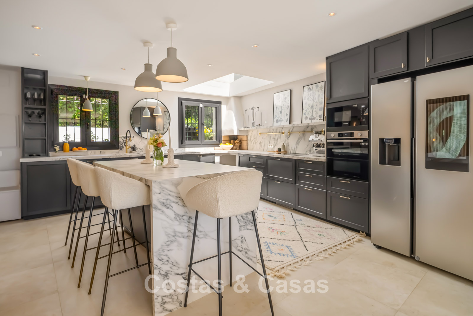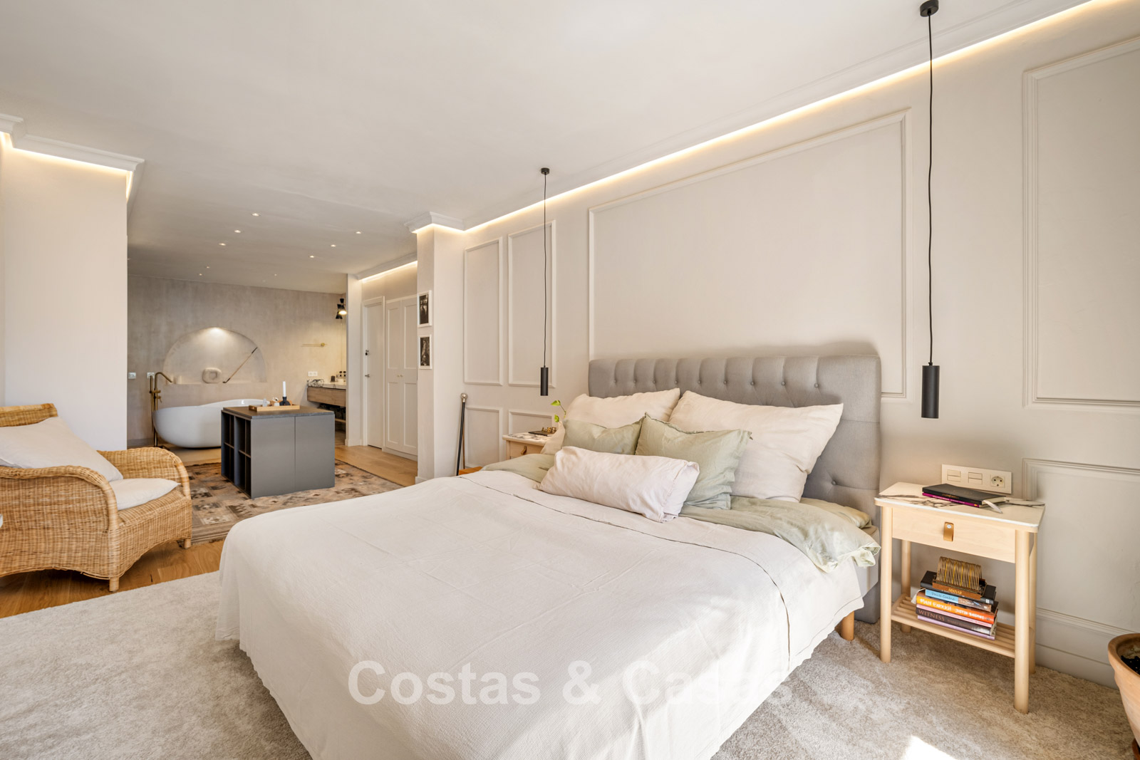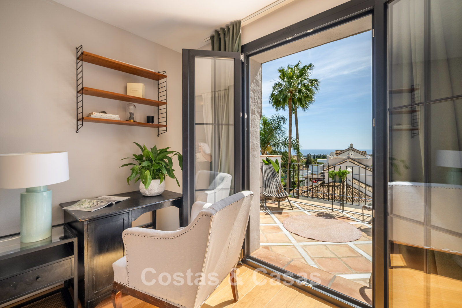 Una casa adosada superior renovada en impecables condiciones. Esta casa adosada de estilo andaluz atemporal combina el encanto tradicional con elegantes interiores escandinavos. Situada al suroeste. Desde la terraza se tiene una hermosa vista del mar Mediterráneo. Terrazas soleadas y cubiertas con zona chill-out y un acogedor 'comedor al fresco'. Las ventanas altas en toda la casa proporcionan un interior luminoso y acceso a las zonas exteriores. Concepto de planta abierta. La espaciosa sala de estar cuenta con un techo con vigas de doble altura y una vista de la planta superior. La espaciosa y elegante cocina, equipada con una isla central para sentarse. Comedor integrado que da a una terraza con barbacoa. 4 dormitorios y 4+1 baños. El nivel del sótano ofrece un valor adicional con un dormitorio de invitados, un acogedor salón, un baño y una sauna privada, perfecto para entretener a los invitados o crear un oasis de bienestar personal. El sótano también se puede convertir fácilmente en un garaje privado. Suelos de piedra natural. Cuarto de lavado.