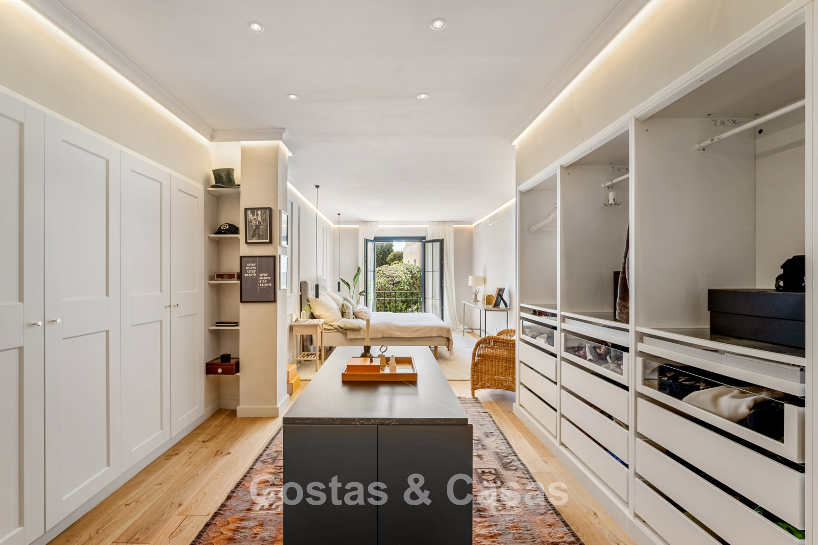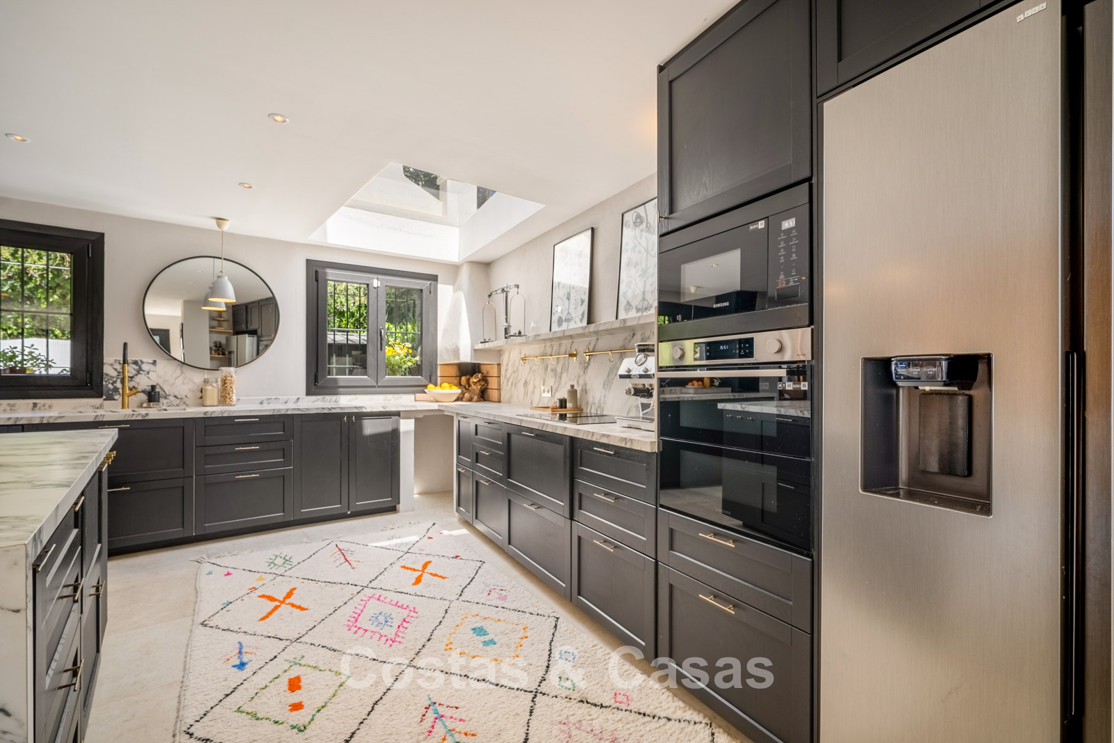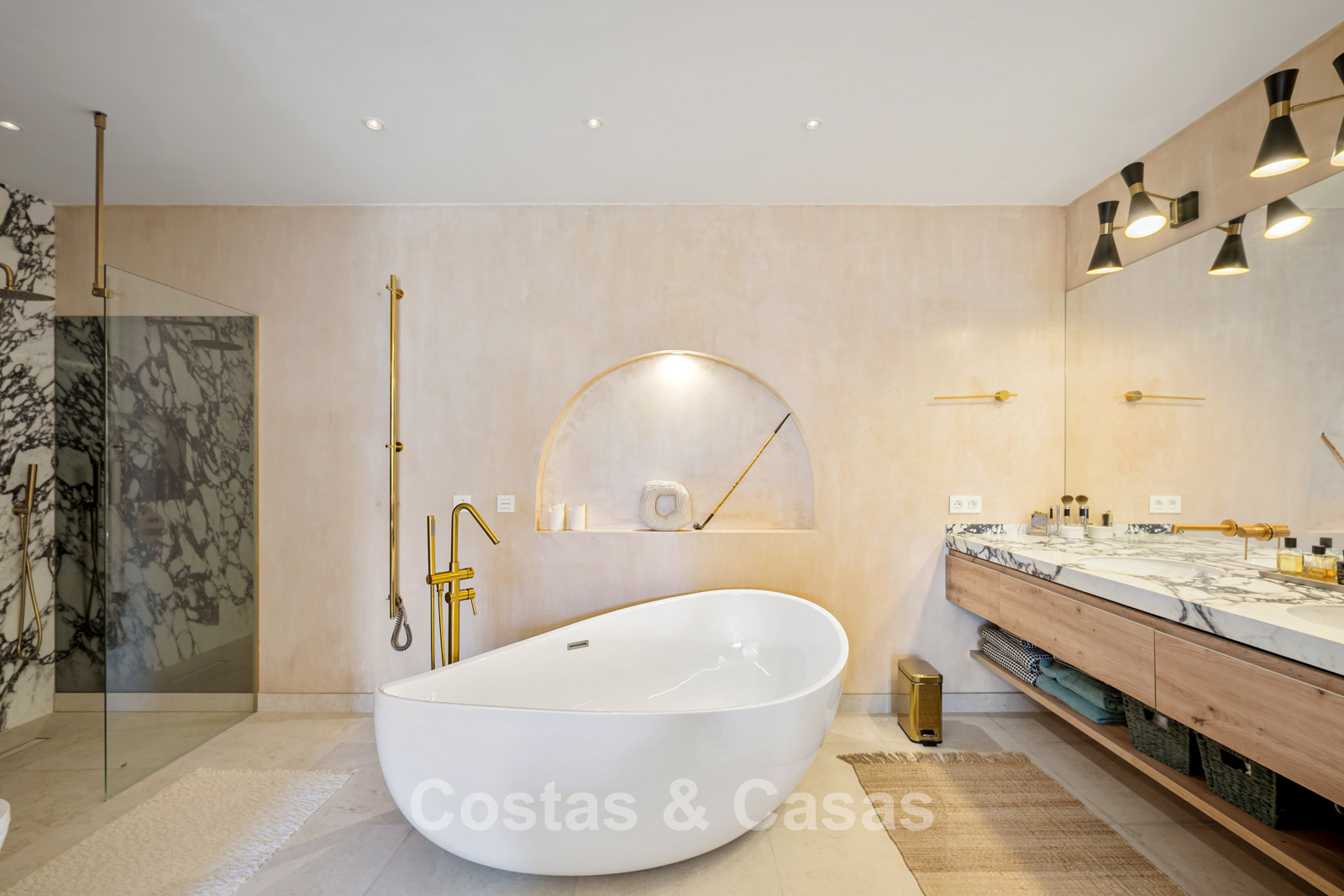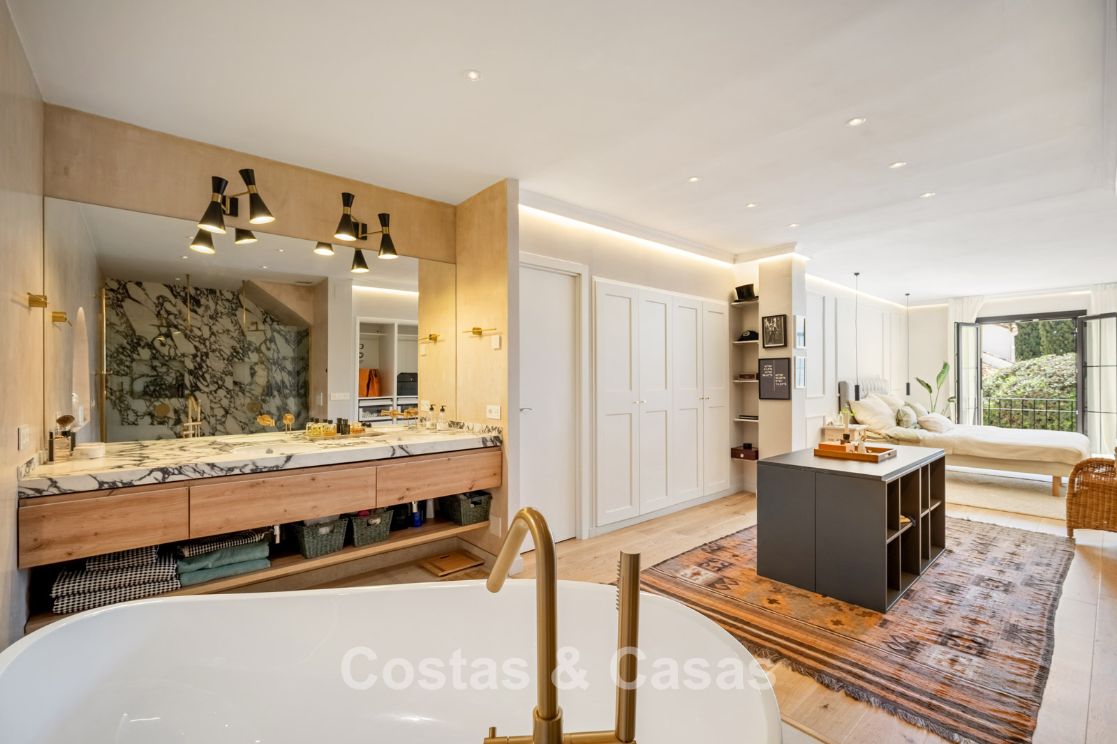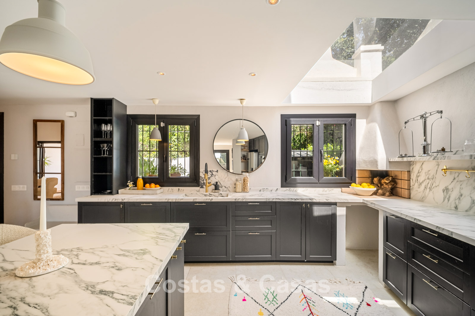 Una casa adosada superior renovada en impecables condiciones. Esta casa adosada de estilo andaluz atemporal combina el encanto tradicional con elegantes interiores escandinavos. Situada al suroeste. Desde la terraza se tiene una hermosa vista del mar Mediterráneo. Terrazas soleadas y cubiertas con zona chill-out y un acogedor 'comedor al fresco'. Las ventanas altas en toda la casa proporcionan un interior luminoso y acceso a las zonas exteriores. Concepto de planta abierta. La espaciosa sala de estar cuenta con un techo con vigas de doble altura y una vista de la planta superior. La espaciosa y elegante cocina, equipada con una isla central para sentarse. Comedor integrado que da a una terraza con barbacoa. 4 dormitorios y 4+1 baños. El nivel del sótano ofrece un valor adicional con un dormitorio de invitados, un acogedor salón, un baño y una sauna privada, perfecto para entretener a los invitados o crear un oasis de bienestar personal. El sótano también se puede convertir fácilmente en un garaje privado. Suelos de piedra natural. Cuarto de lavado.
