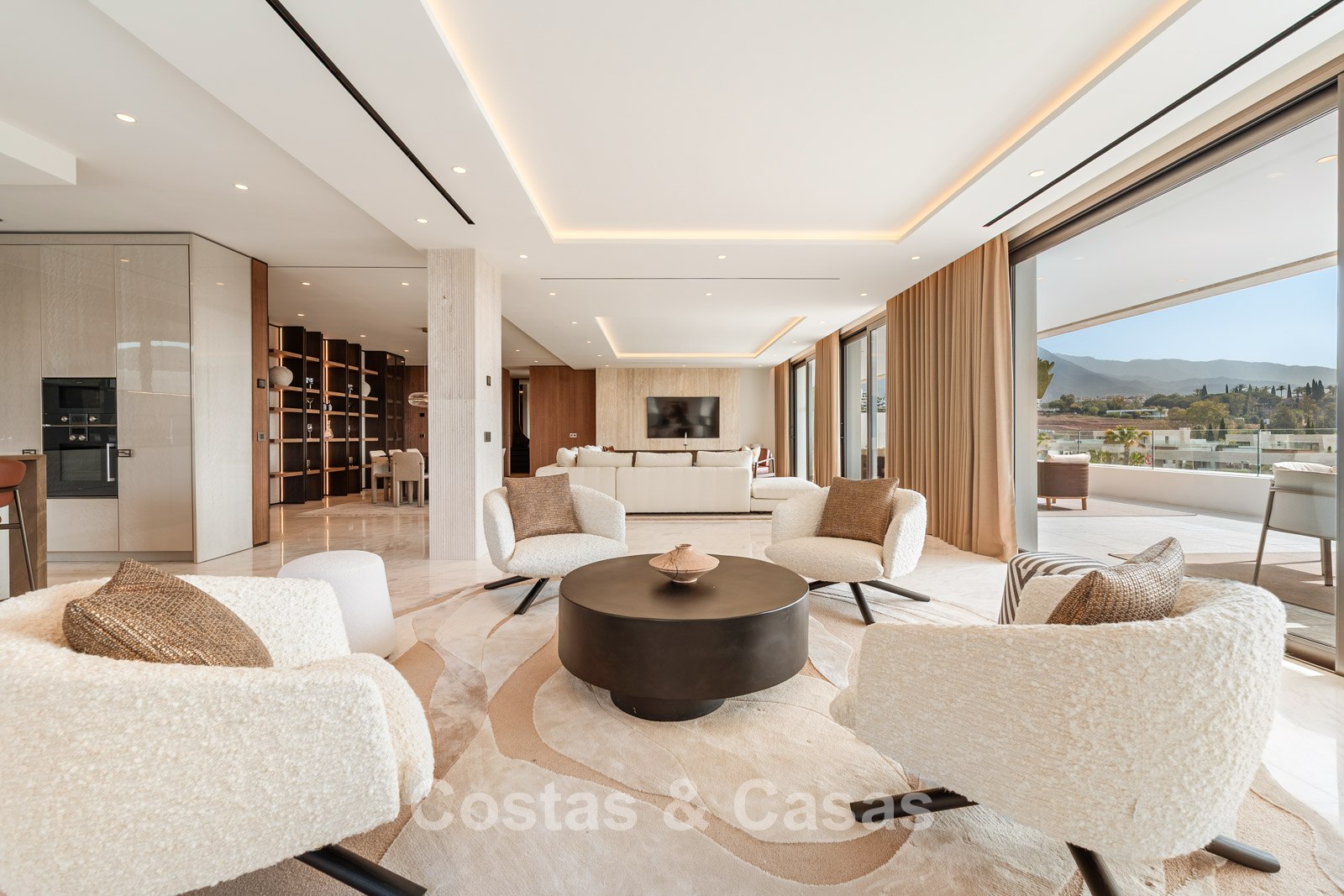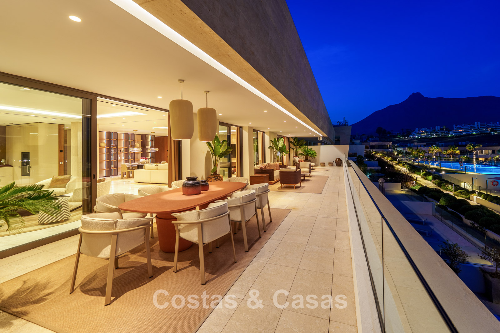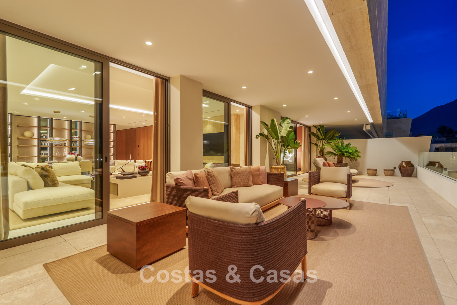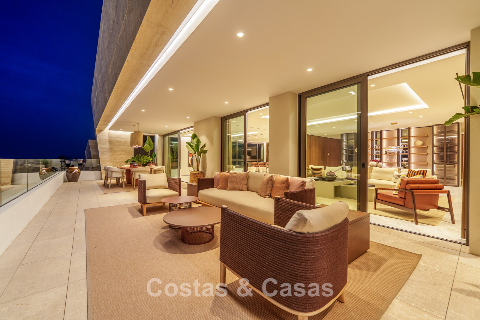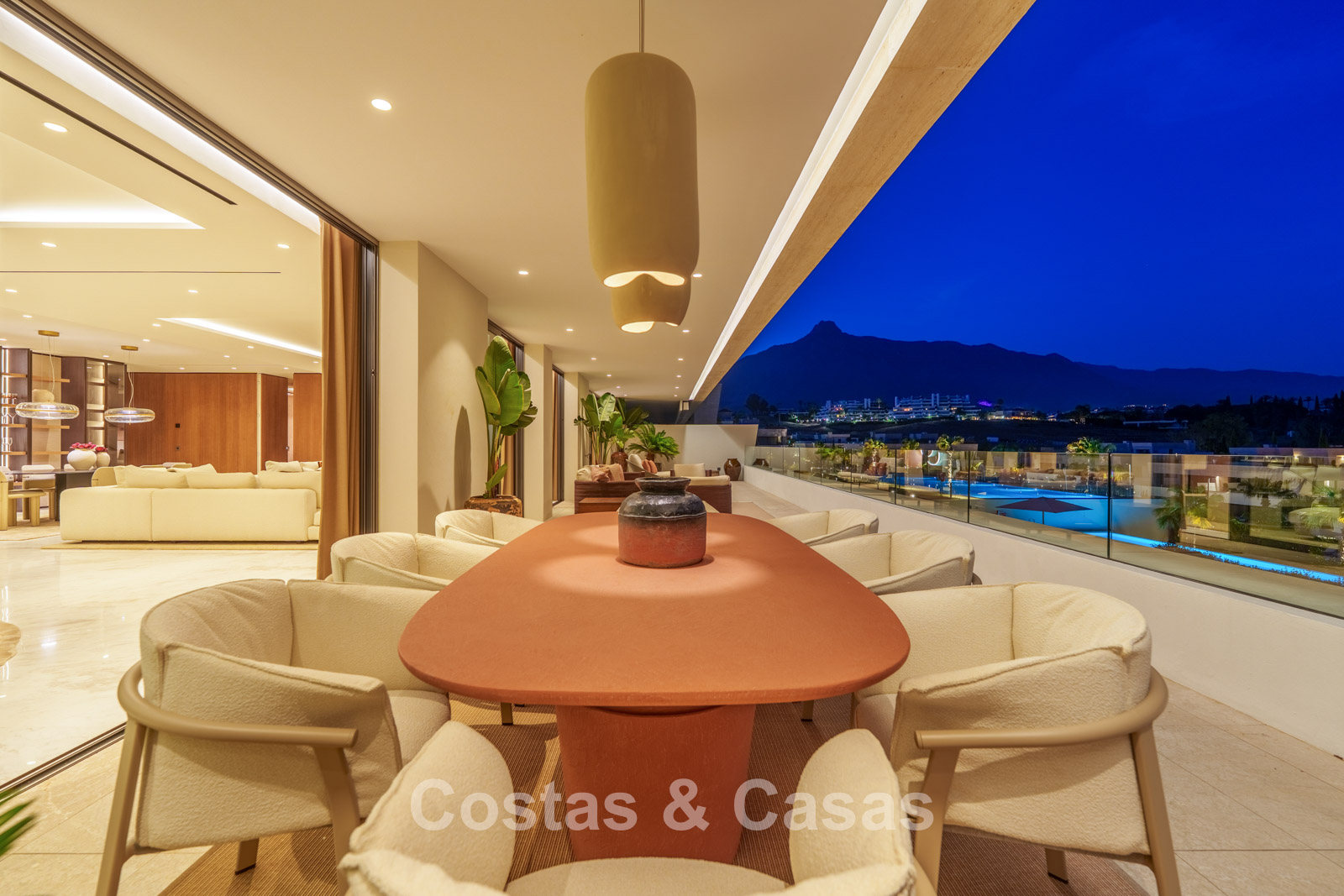 Ático dúplex, con impresionante tamaño y acabados excepcionales. Diseñado con materiales de alta calidad y acabados de lujo. Orientado al sureste. Las amplias terrazas amplían el interior y ofrecen una experiencia de vida al aire libre inigualable. La planta superior cuenta con una espaciosa azotea con piscina privada como protagonista, rodeada de elegantes zonas de estar, tumbonas y un exuberante paisaje. La planta baja también ofrece una amplia terraza con varias zonas de estar, una gran mesa y cómodos sillones que invitan a relajarse. Las vistas panorámicas se extienden sobre el paisaje circundante, las montañas y el mar Mediterráneo. El lujo se une a la elegancia gracias al diseño interior de Fendi Casa. Las puertas correderas de suelo a techo con elegantes marcos ocultos crean una conexión armoniosa con el exterior y aportan abundante luz natural. Un luminoso salón con una acogedora sala de TV y un comedor integrado. La cocina, diseñada por expertos, está equipada con electrodomésticos de alta gama y una isla que invita a disfrutar de un relajante desayuno. 4 dormitorios, 4 baños y 2 aseos independientes. Suelos de mármol. Garaje interior para 4 coches.