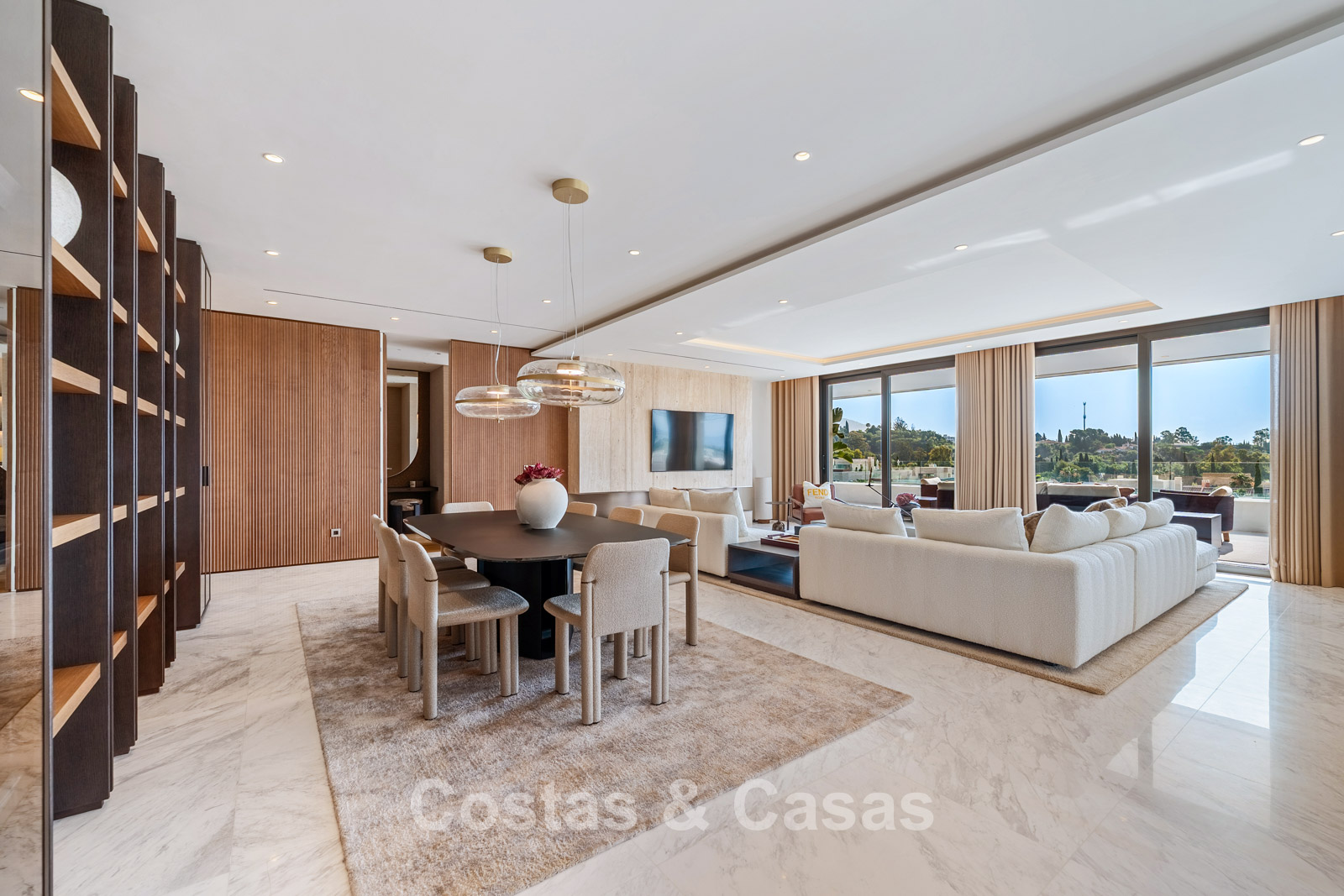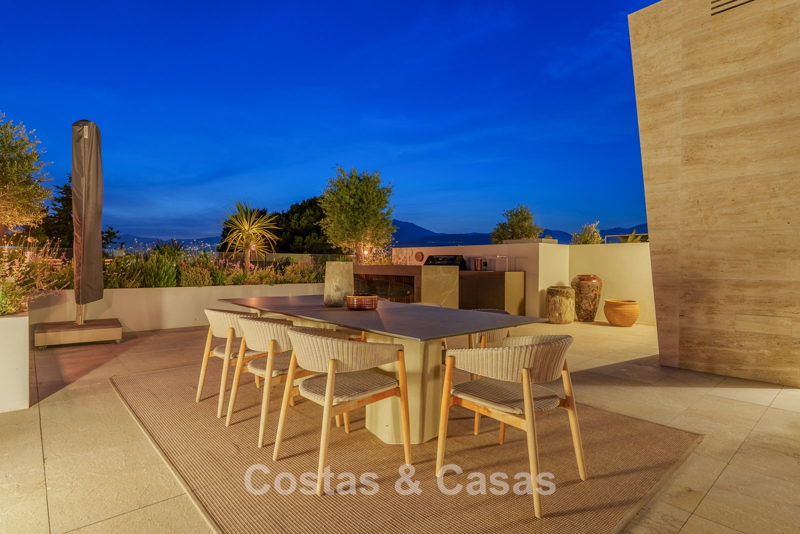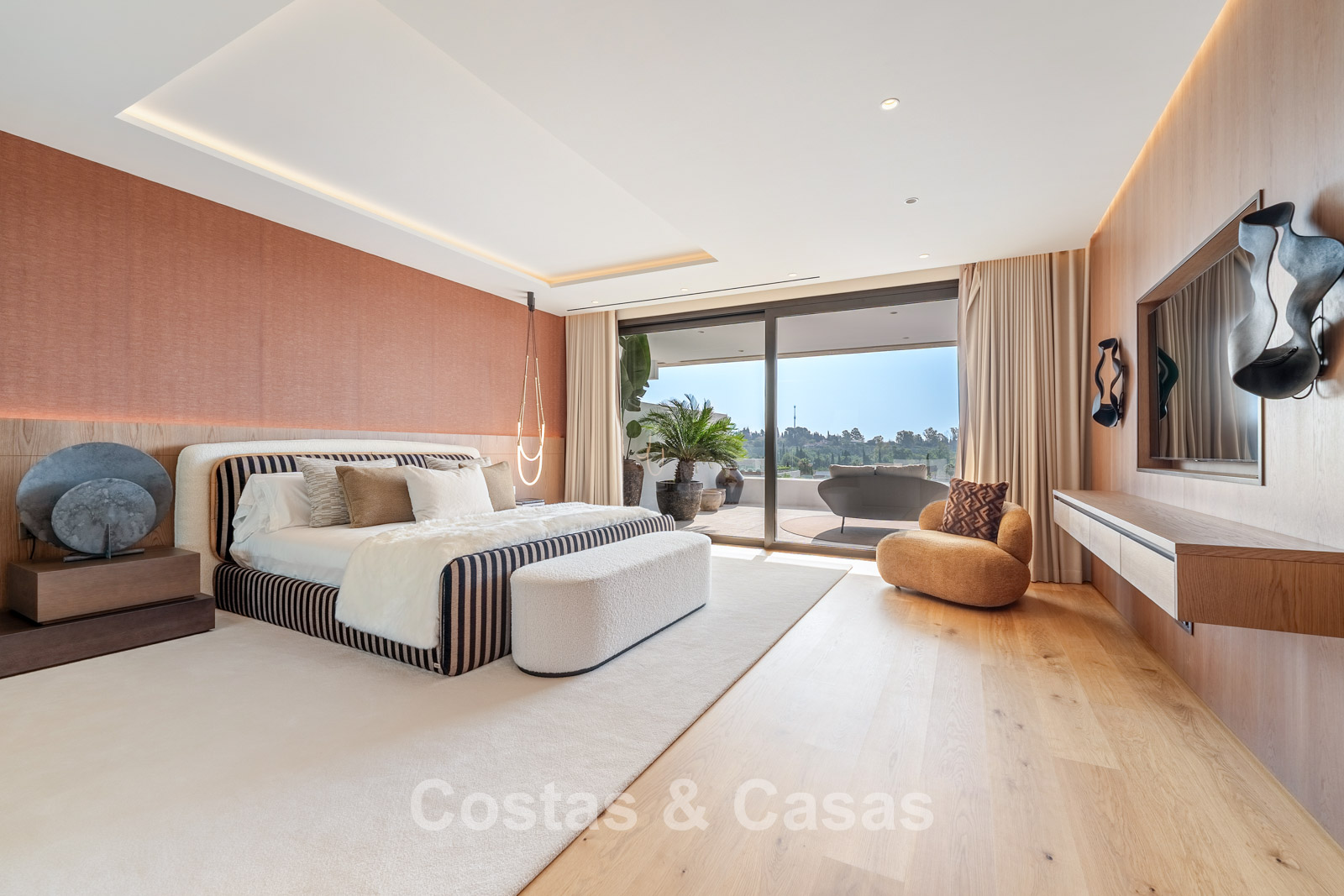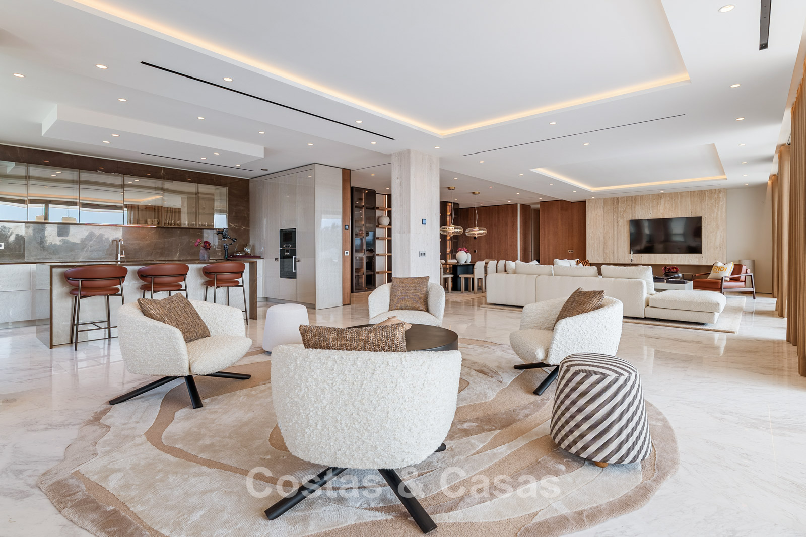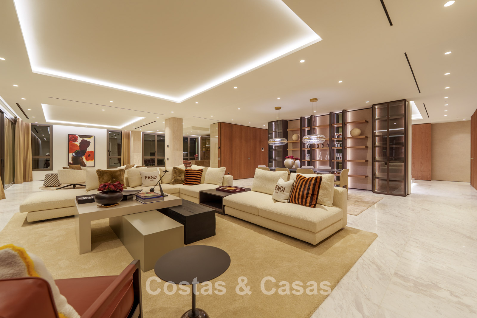 Ático dúplex, con impresionante tamaño y acabados excepcionales. Diseñado con materiales de alta calidad y acabados de lujo. Orientado al sureste. Las amplias terrazas amplían el interior y ofrecen una experiencia de vida al aire libre inigualable. La planta superior cuenta con una espaciosa azotea con piscina privada como protagonista, rodeada de elegantes zonas de estar, tumbonas y un exuberante paisaje. La planta baja también ofrece una amplia terraza con varias zonas de estar, una gran mesa y cómodos sillones que invitan a relajarse. Las vistas panorámicas se extienden sobre el paisaje circundante, las montañas y el mar Mediterráneo. El lujo se une a la elegancia gracias al diseño interior de Fendi Casa. Las puertas correderas de suelo a techo con elegantes marcos ocultos crean una conexión armoniosa con el exterior y aportan abundante luz natural. Un luminoso salón con una acogedora sala de TV y un comedor integrado. La cocina, diseñada por expertos, está equipada con electrodomésticos de alta gama y una isla que invita a disfrutar de un relajante desayuno. 4 dormitorios, 4 baños y 2 aseos independientes. Suelos de mármol. Garaje interior para 4 coches.