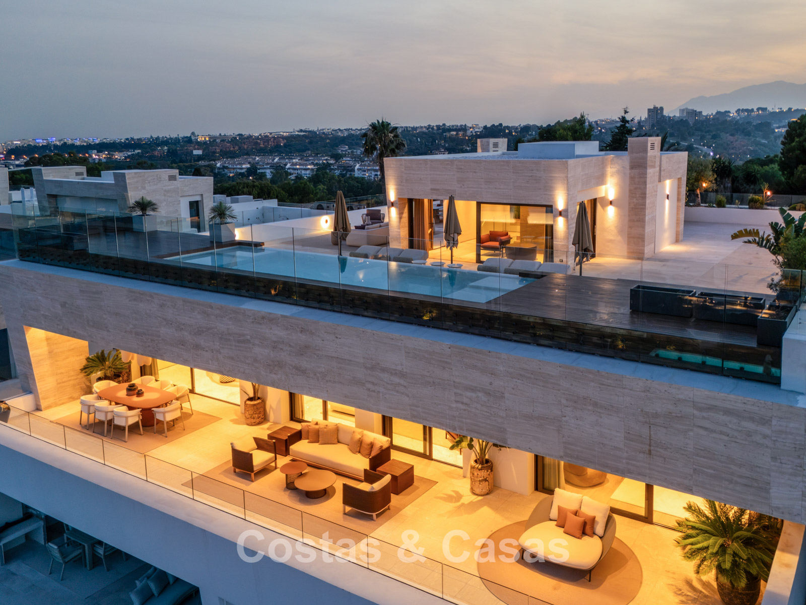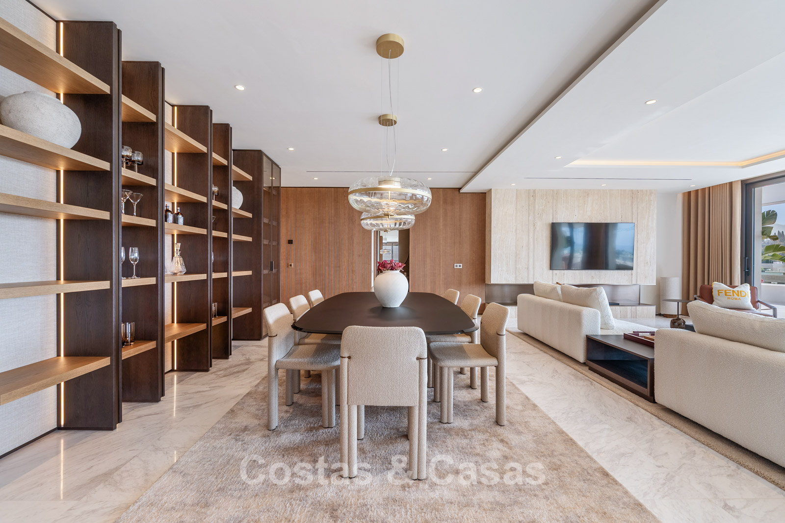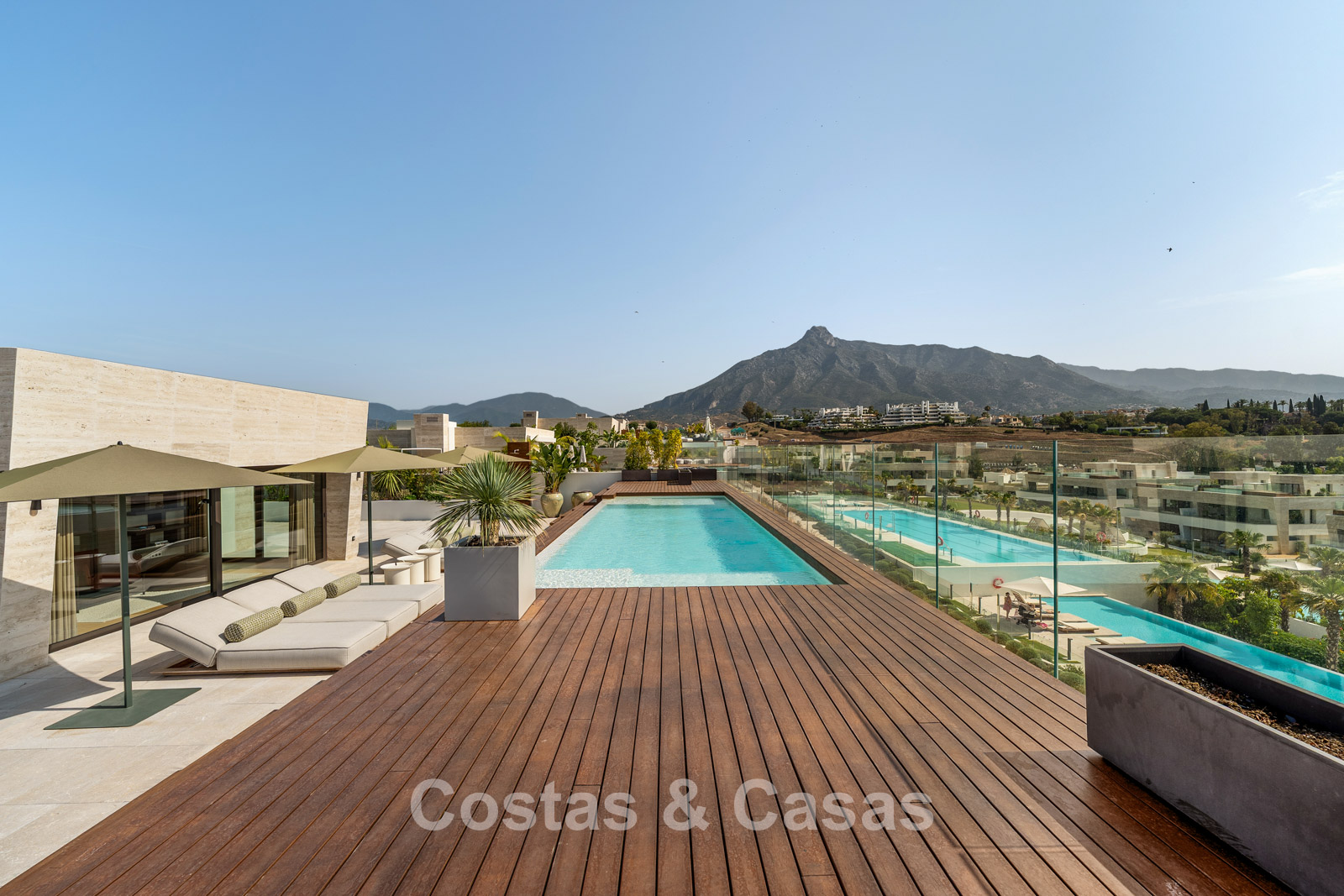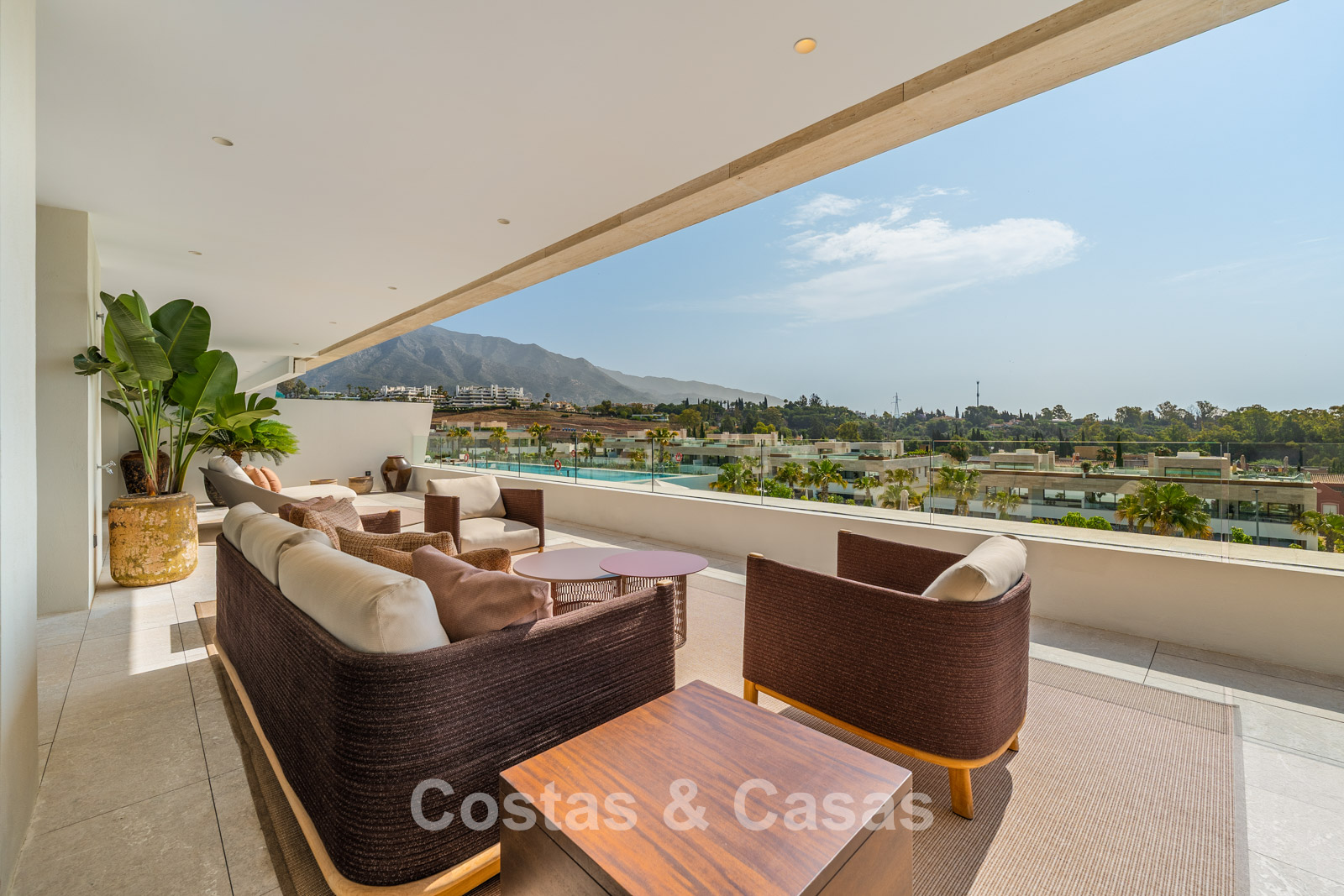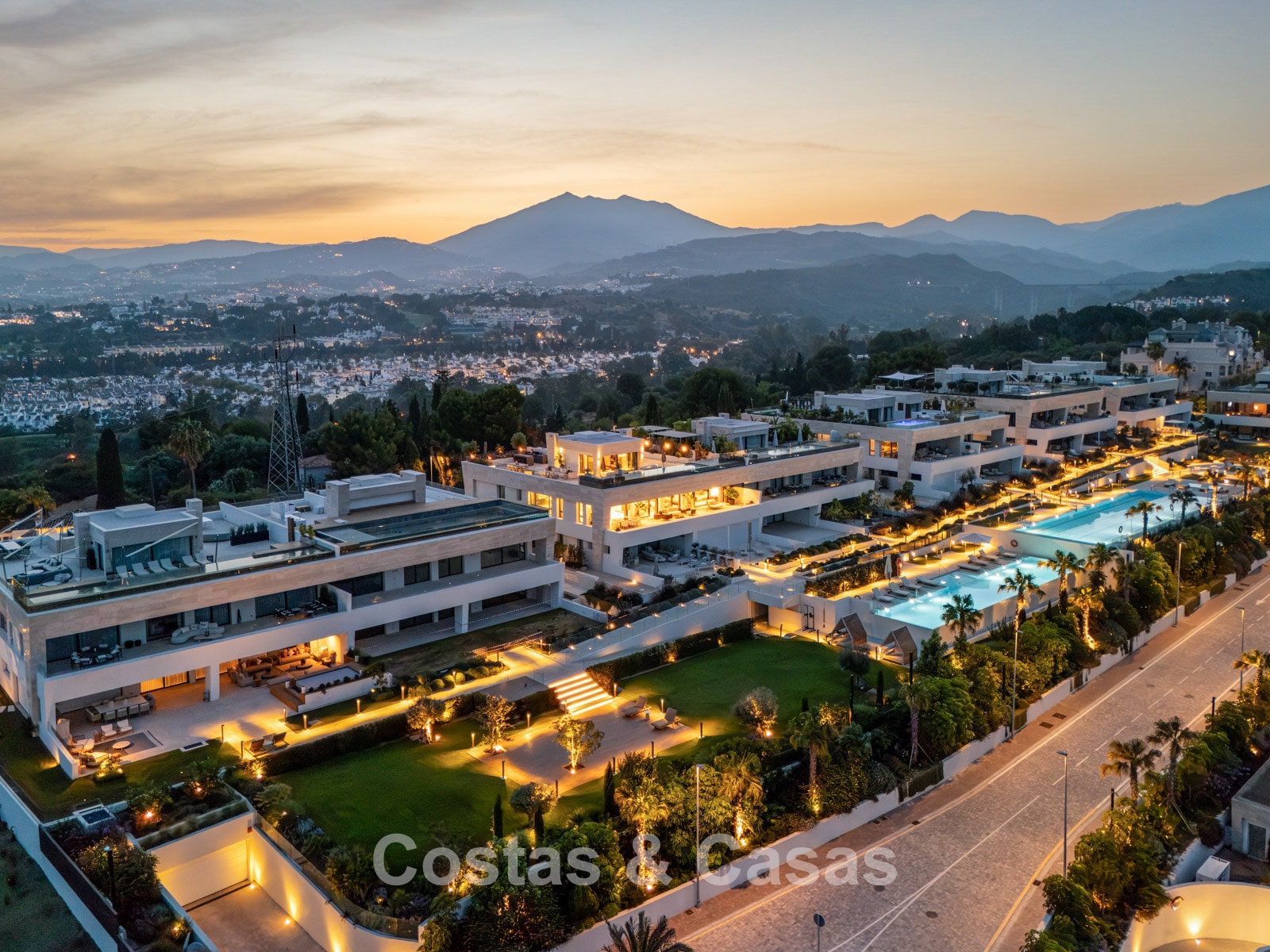 Ático dúplex, con impresionante tamaño y acabados excepcionales. Diseñado con materiales de alta calidad y acabados de lujo. Orientado al sureste. Las amplias terrazas amplían el interior y ofrecen una experiencia de vida al aire libre inigualable. La planta superior cuenta con una espaciosa azotea con piscina privada como protagonista, rodeada de elegantes zonas de estar, tumbonas y un exuberante paisaje. La planta baja también ofrece una amplia terraza con varias zonas de estar, una gran mesa y cómodos sillones que invitan a relajarse. Las vistas panorámicas se extienden sobre el paisaje circundante, las montañas y el mar Mediterráneo. El lujo se une a la elegancia gracias al diseño interior de Fendi Casa. Las puertas correderas de suelo a techo con elegantes marcos ocultos crean una conexión armoniosa con el exterior y aportan abundante luz natural. Un luminoso salón con una acogedora sala de TV y un comedor integrado. La cocina, diseñada por expertos, está equipada con electrodomésticos de alta gama y una isla que invita a disfrutar de un relajante desayuno. 4 dormitorios, 4 baños y 2 aseos independientes. Suelos de mármol. Garaje interior para 4 coches.