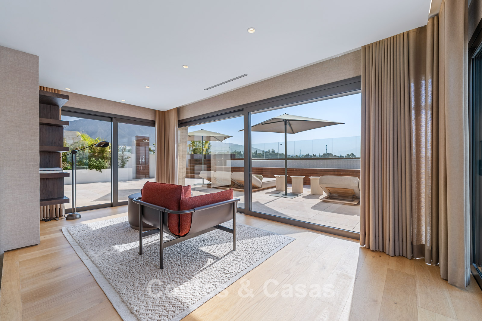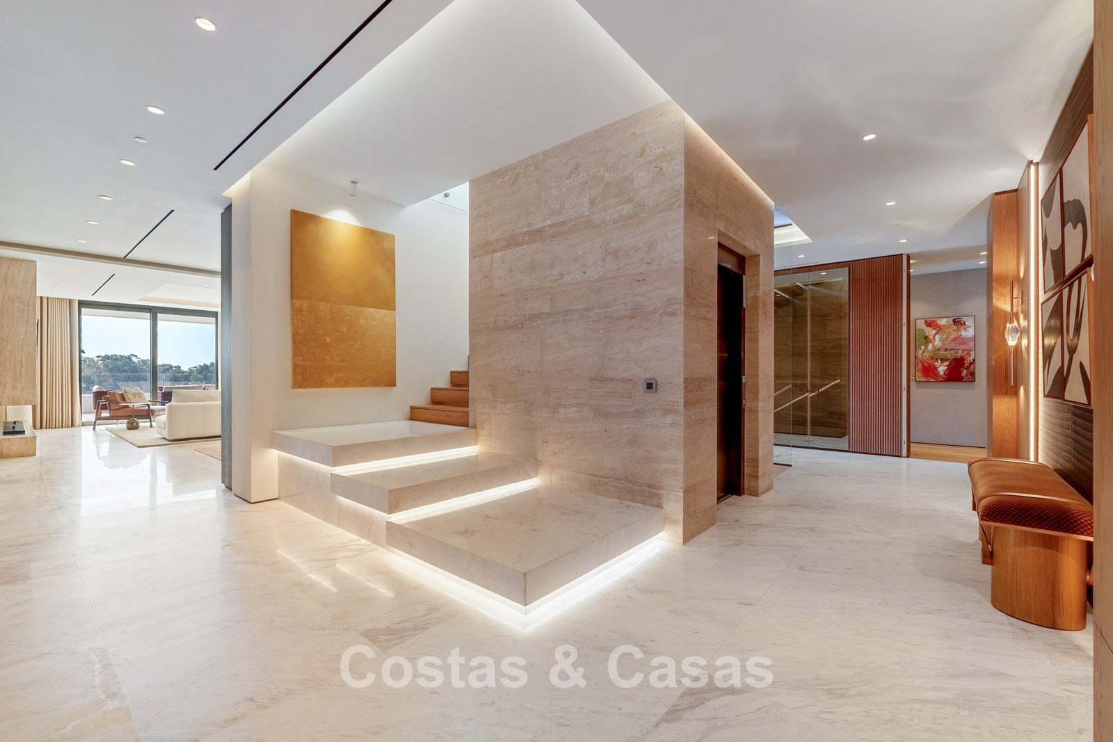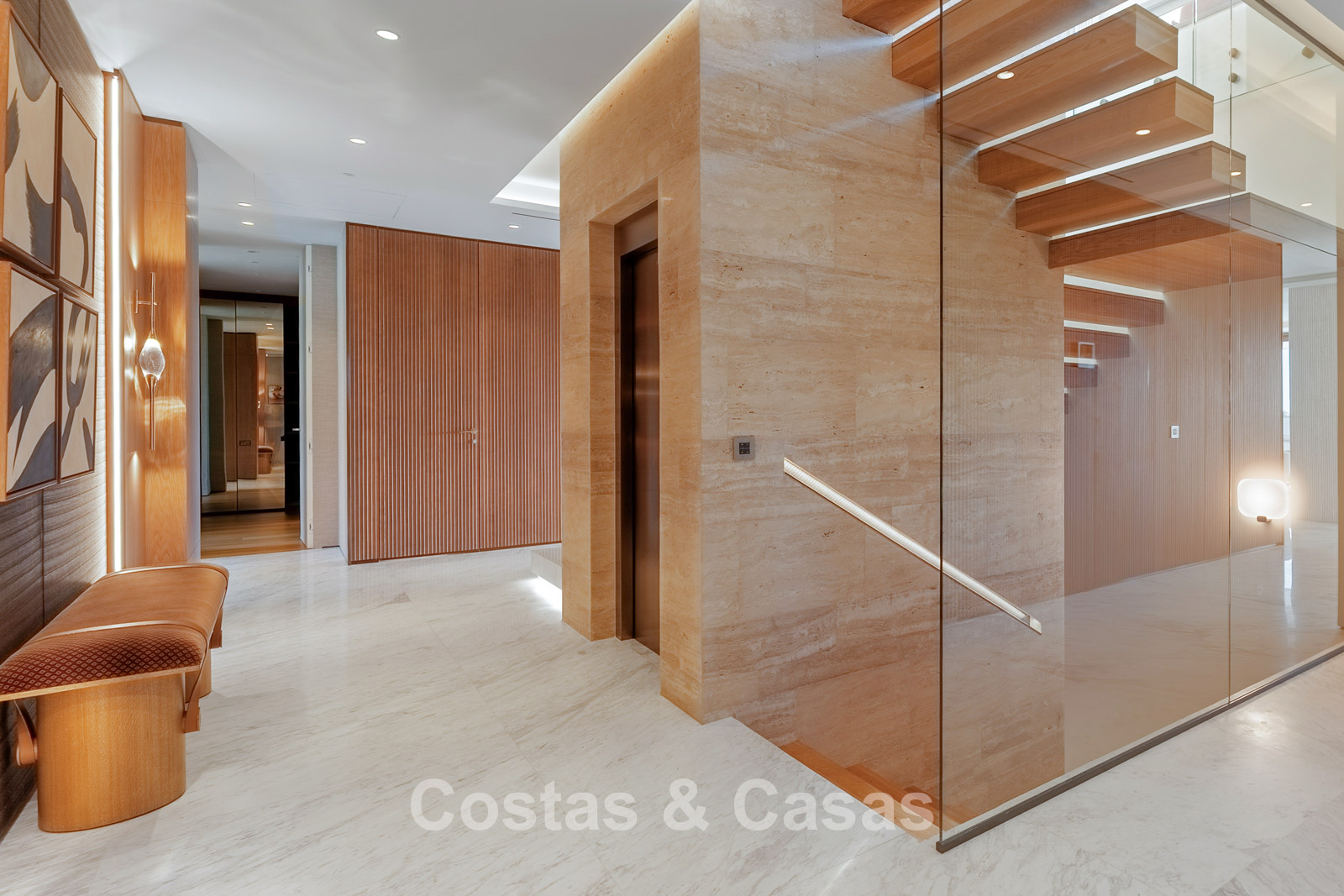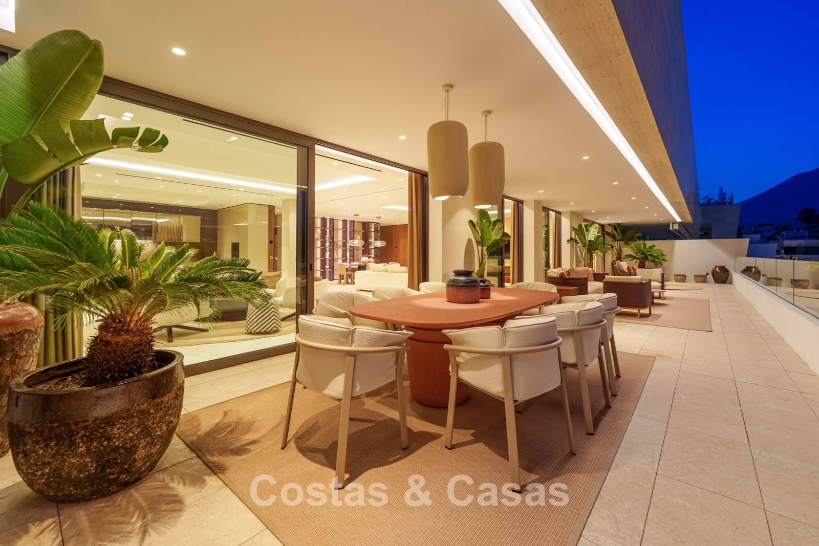 Ático dúplex, con impresionante tamaño y acabados excepcionales. Diseñado con materiales de alta calidad y acabados de lujo. Orientado al sureste. Las amplias terrazas amplían el interior y ofrecen una experiencia de vida al aire libre inigualable. La planta superior cuenta con una espaciosa azotea con piscina privada como protagonista, rodeada de elegantes zonas de estar, tumbonas y un exuberante paisaje. La planta baja también ofrece una amplia terraza con varias zonas de estar, una gran mesa y cómodos sillones que invitan a relajarse. Las vistas panorámicas se extienden sobre el paisaje circundante, las montañas y el mar Mediterráneo. El lujo se une a la elegancia gracias al diseño interior de Fendi Casa. Las puertas correderas de suelo a techo con elegantes marcos ocultos crean una conexión armoniosa con el exterior y aportan abundante luz natural. Un luminoso salón con una acogedora sala de TV y un comedor integrado. La cocina, diseñada por expertos, está equipada con electrodomésticos de alta gama y una isla que invita a disfrutar de un relajante desayuno. 4 dormitorios, 4 baños y 2 aseos independientes. Suelos de mármol. Garaje interior para 4 coches.