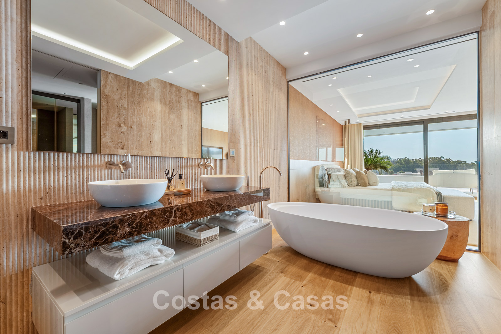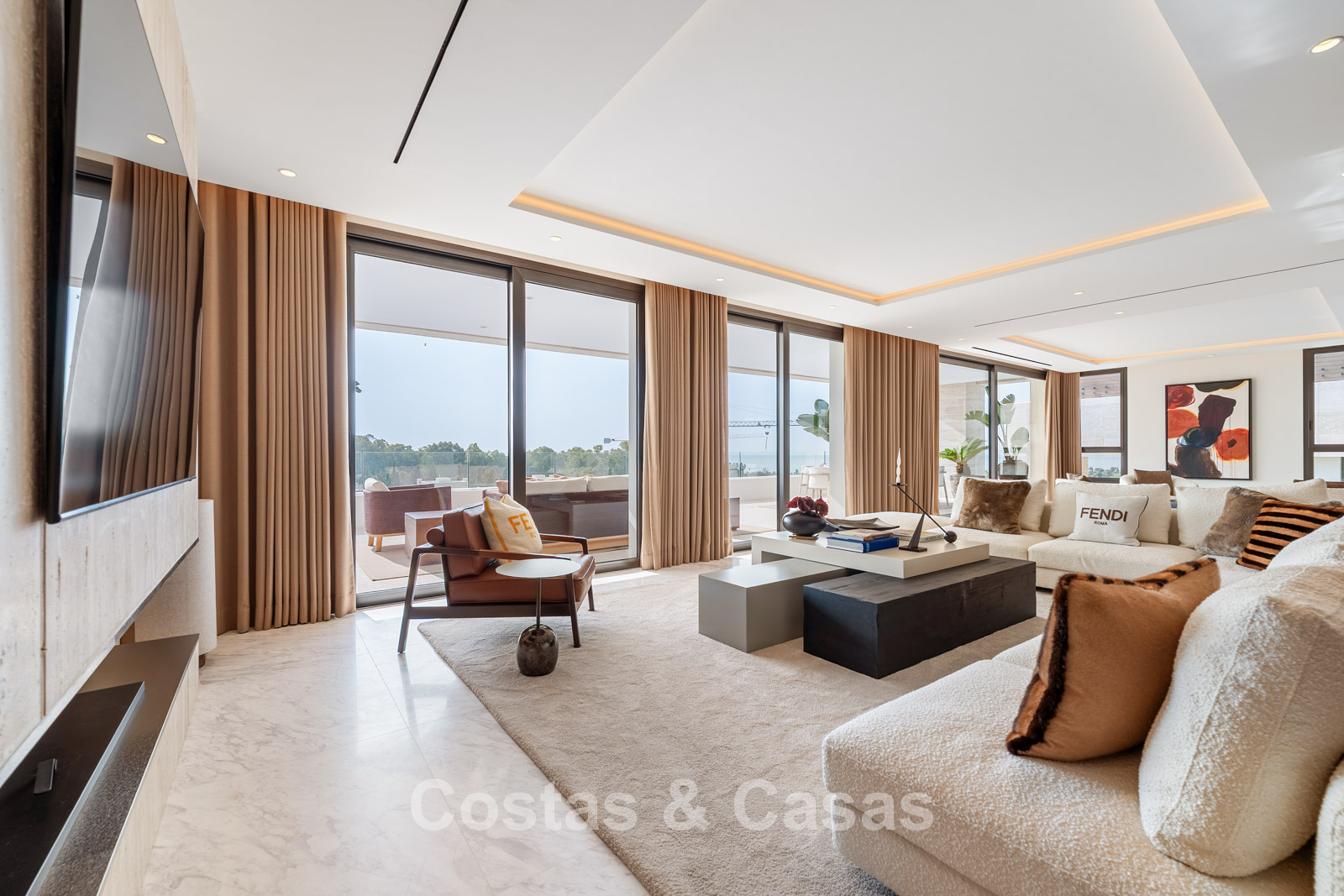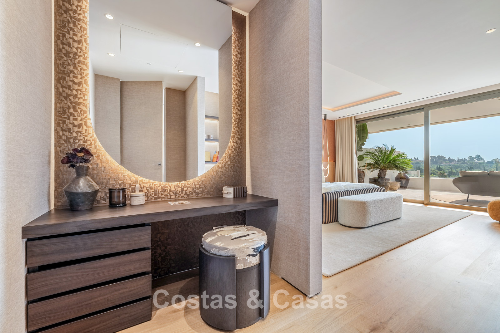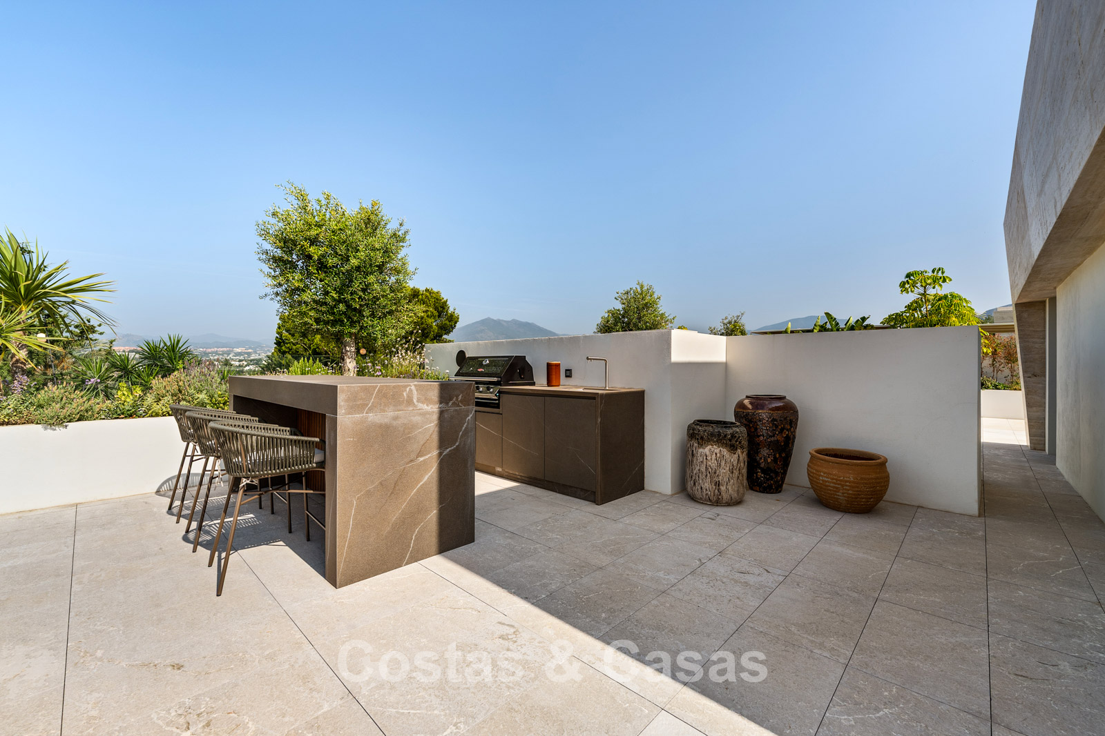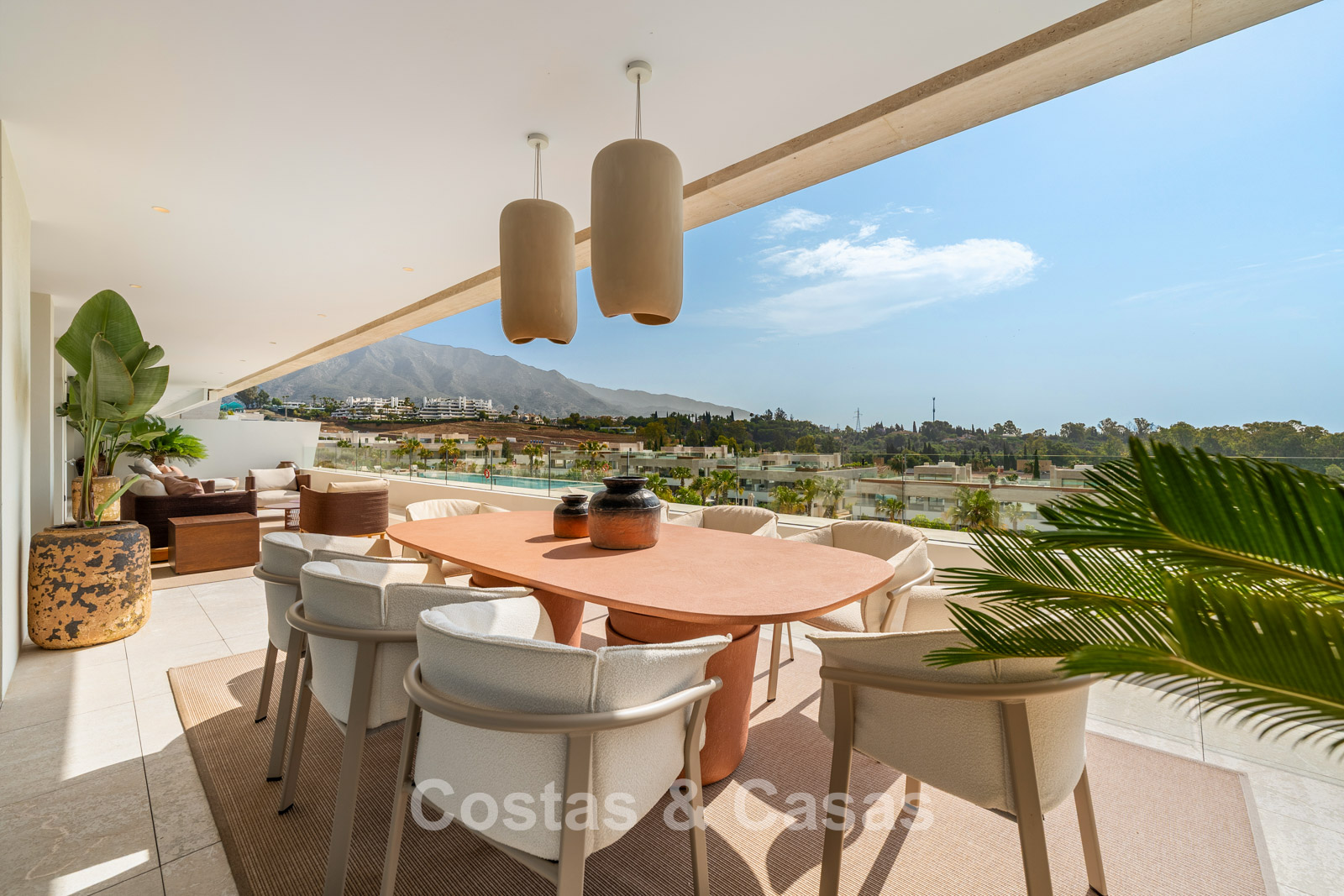 Ático dúplex, con impresionante tamaño y acabados excepcionales. Diseñado con materiales de alta calidad y acabados de lujo. Orientado al sureste. Las amplias terrazas amplían el interior y ofrecen una experiencia de vida al aire libre inigualable. La planta superior cuenta con una espaciosa azotea con piscina privada como protagonista, rodeada de elegantes zonas de estar, tumbonas y un exuberante paisaje. La planta baja también ofrece una amplia terraza con varias zonas de estar, una gran mesa y cómodos sillones que invitan a relajarse. Las vistas panorámicas se extienden sobre el paisaje circundante, las montañas y el mar Mediterráneo. El lujo se une a la elegancia gracias al diseño interior de Fendi Casa. Las puertas correderas de suelo a techo con elegantes marcos ocultos crean una conexión armoniosa con el exterior y aportan abundante luz natural. Un luminoso salón con una acogedora sala de TV y un comedor integrado. La cocina, diseñada por expertos, está equipada con electrodomésticos de alta gama y una isla que invita a disfrutar de un relajante desayuno. 4 dormitorios, 4 baños y 2 aseos independientes. Suelos de mármol. Garaje interior para 4 coches.