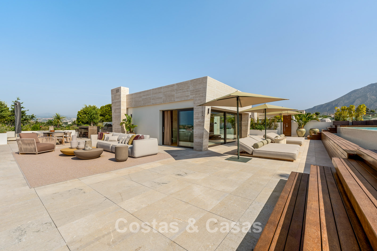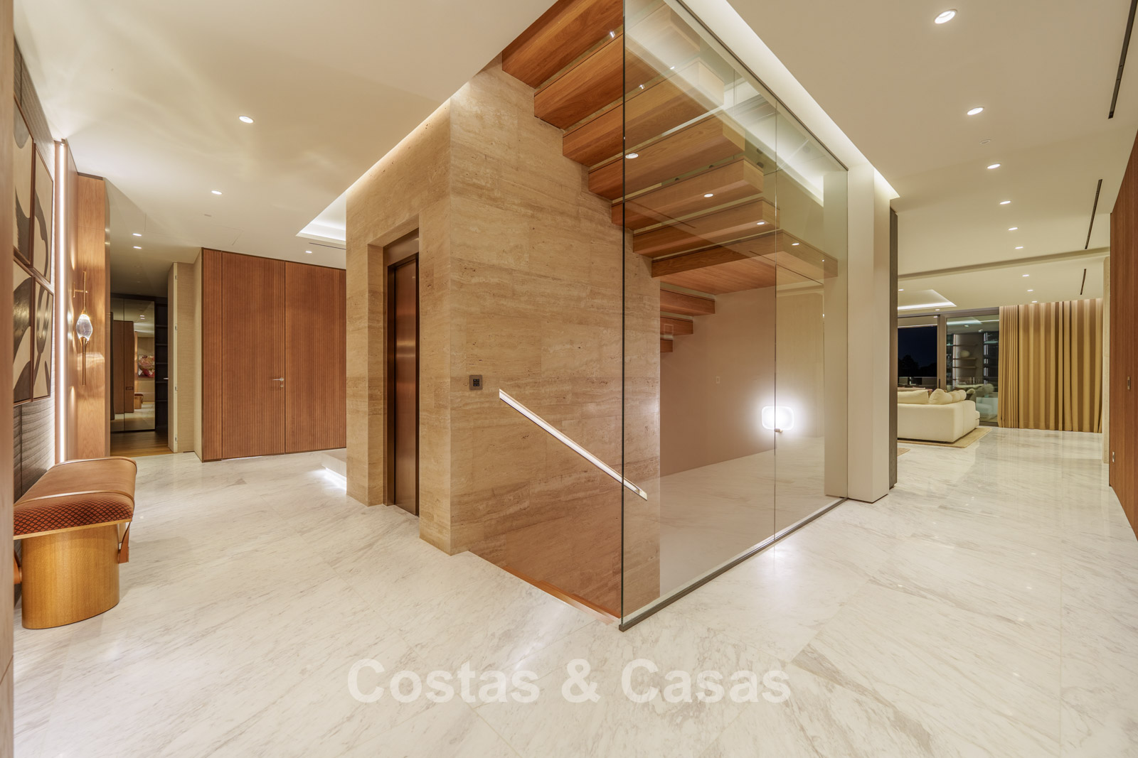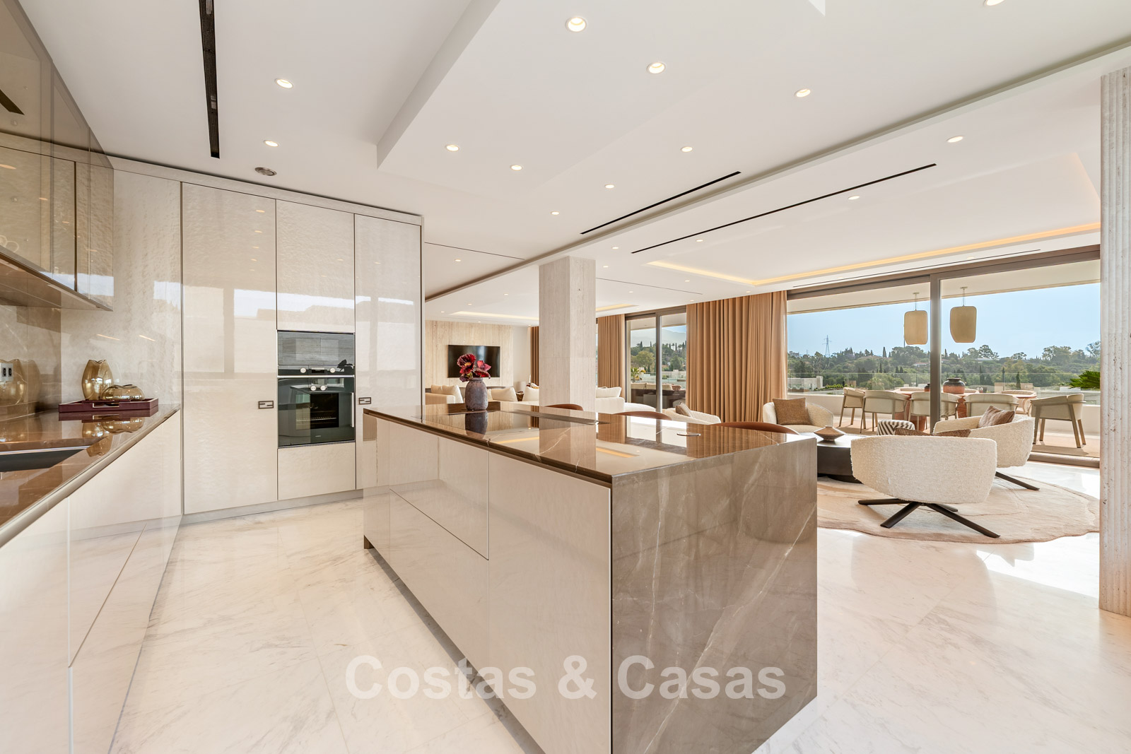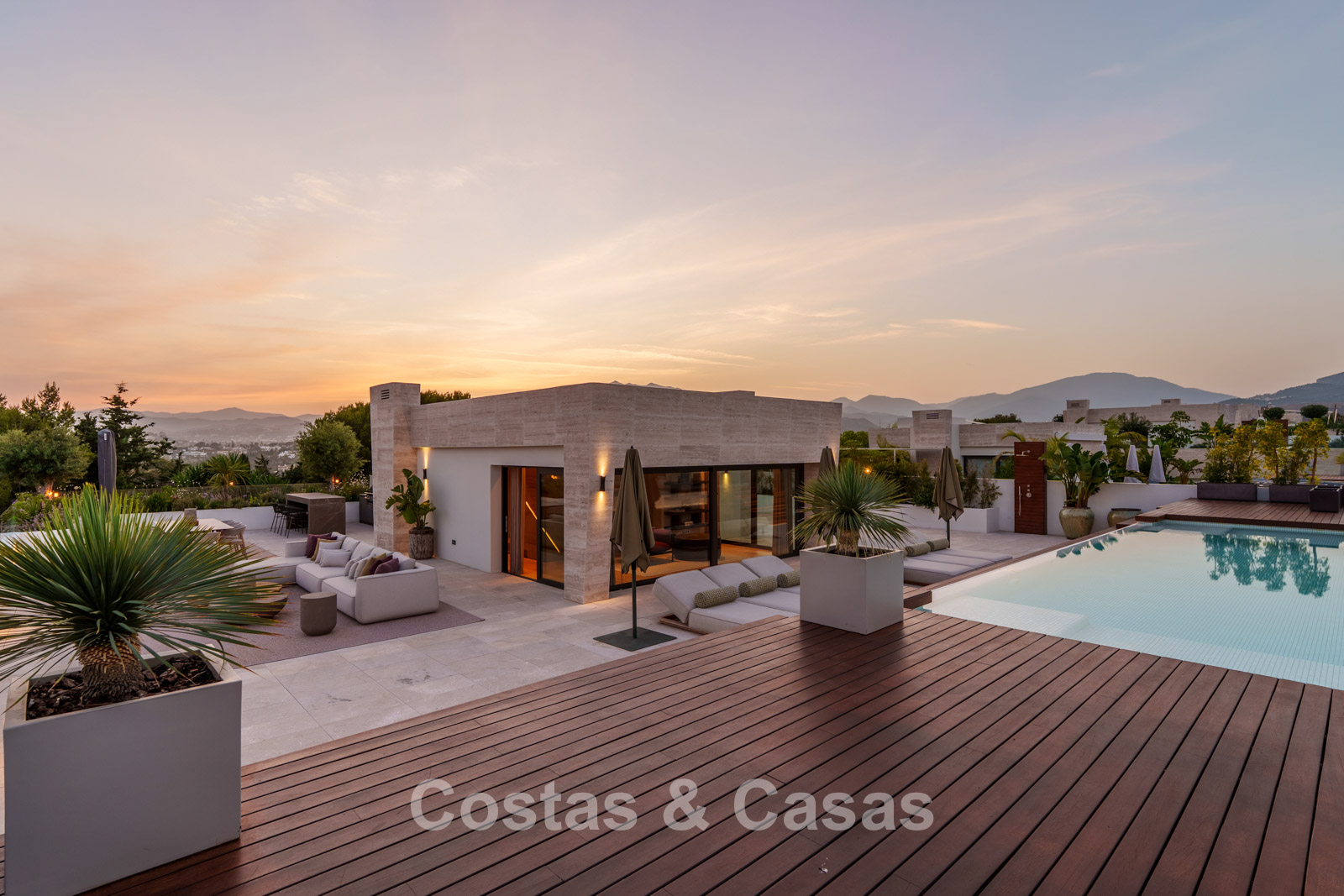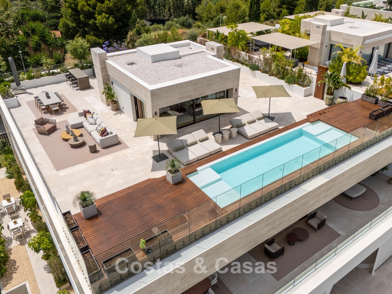 Ático dúplex, con impresionante tamaño y acabados excepcionales. Diseñado con materiales de alta calidad y acabados de lujo. Orientado al sureste. Las amplias terrazas amplían el interior y ofrecen una experiencia de vida al aire libre inigualable. La planta superior cuenta con una espaciosa azotea con piscina privada como protagonista, rodeada de elegantes zonas de estar, tumbonas y un exuberante paisaje. La planta baja también ofrece una amplia terraza con varias zonas de estar, una gran mesa y cómodos sillones que invitan a relajarse. Las vistas panorámicas se extienden sobre el paisaje circundante, las montañas y el mar Mediterráneo. El lujo se une a la elegancia gracias al diseño interior de Fendi Casa. Las puertas correderas de suelo a techo con elegantes marcos ocultos crean una conexión armoniosa con el exterior y aportan abundante luz natural. Un luminoso salón con una acogedora sala de TV y un comedor integrado. La cocina, diseñada por expertos, está equipada con electrodomésticos de alta gama y una isla que invita a disfrutar de un relajante desayuno. 4 dormitorios, 4 baños y 2 aseos independientes. Suelos de mármol. Garaje interior para 4 coches.