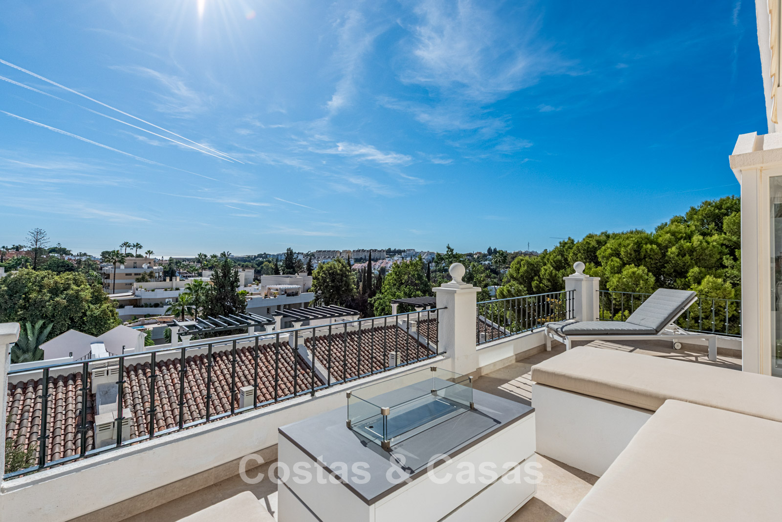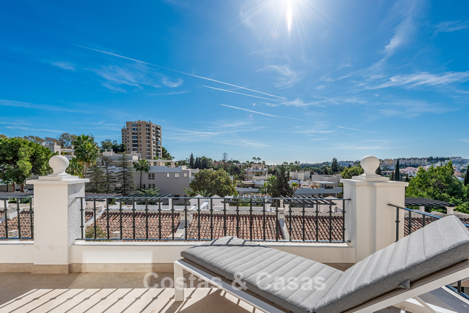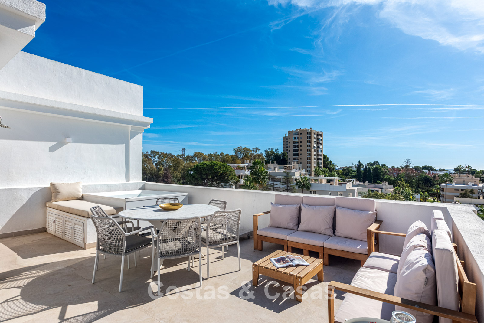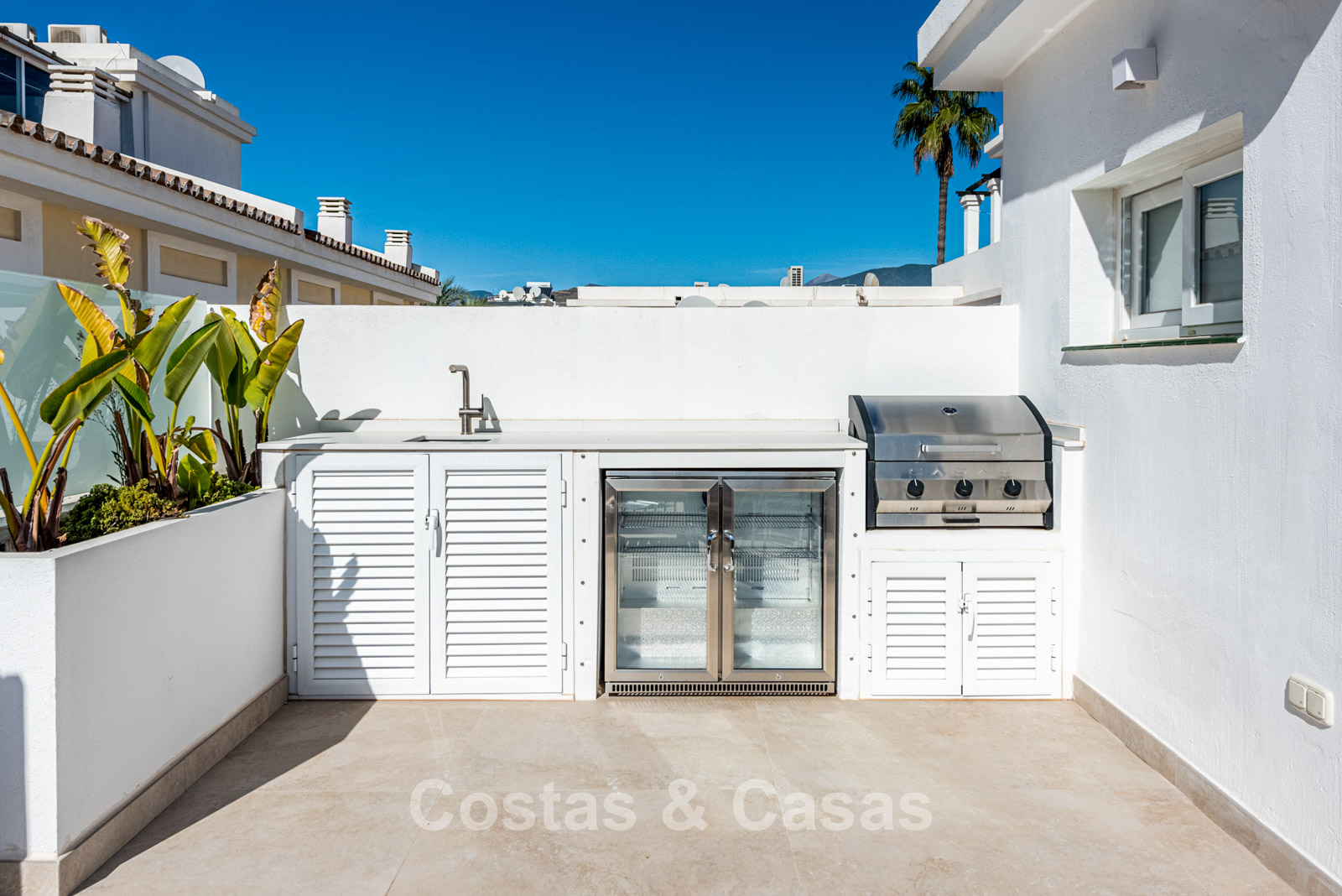 Preciosa vivienda pareada en esquina completamente renovada. Reformada a fondo y con buen gusto en 2024, garantizando un aspecto fresco, moderno y de alto nivel. Orientación sur. La azotea es un auténtico oasis de lujo, con jacuzzi, sauna y cocina exterior totalmente equipada, rodeada de espectaculares vistas sobre Nueva Andalucía y el mar Mediterráneo. Grandes ventanales correderos se abren a una amplia terraza con cocina exterior, mesa de comedor y una cómoda zona de estar. El interior desprende modernidad y tranquilidad gracias al uso de tonos naturales, formas suaves y materiales de alta calidad. Cocina de estilo americano con electrodomésticos Miele y una isla de cocina. Comedor integrado. 4 dormitorios y 3 baños. El dormitorio principal cuenta con baño en suite y acceso a una terraza privada con zona lounge, hoguera y tumbonas. El suelo está revestido con grandes baldosas gris claro con apariencia de piedra natural. Incluye 2 plazas de aparcamiento interiores, una privada y otra alquilada.