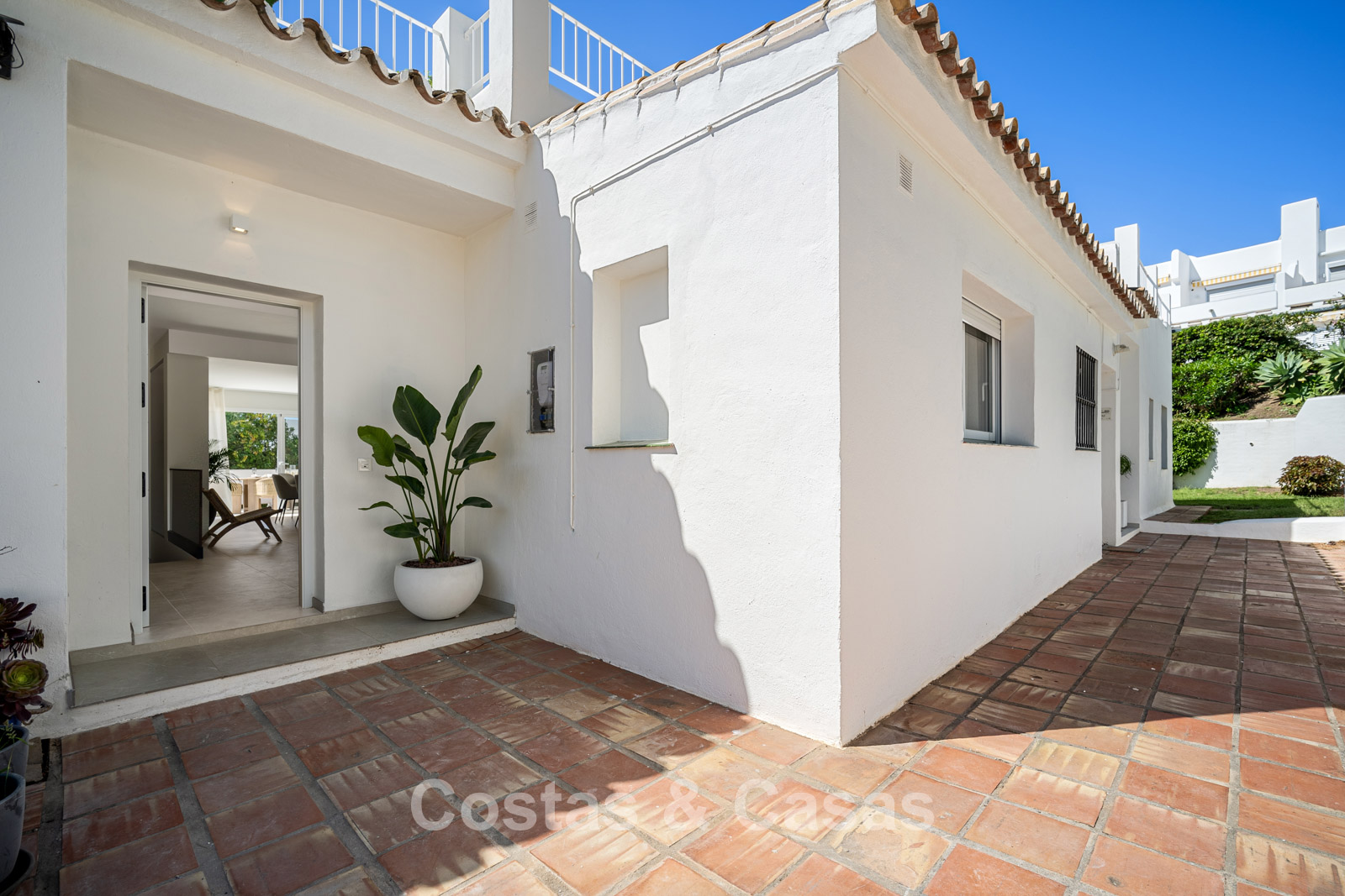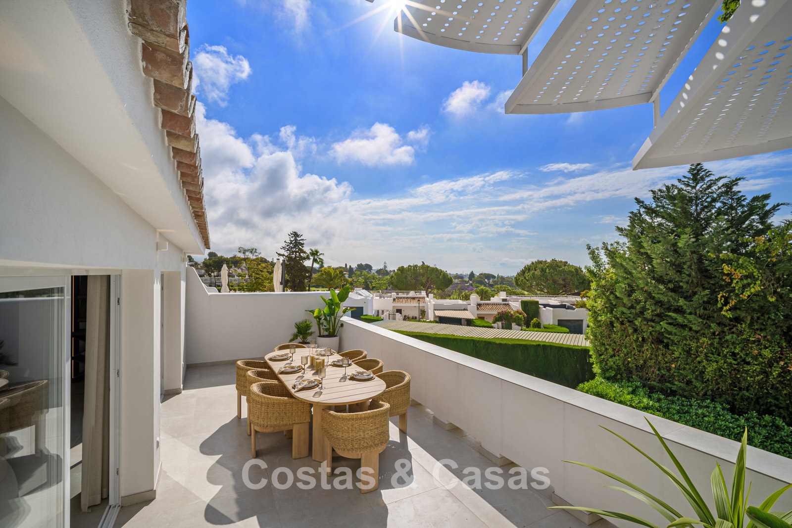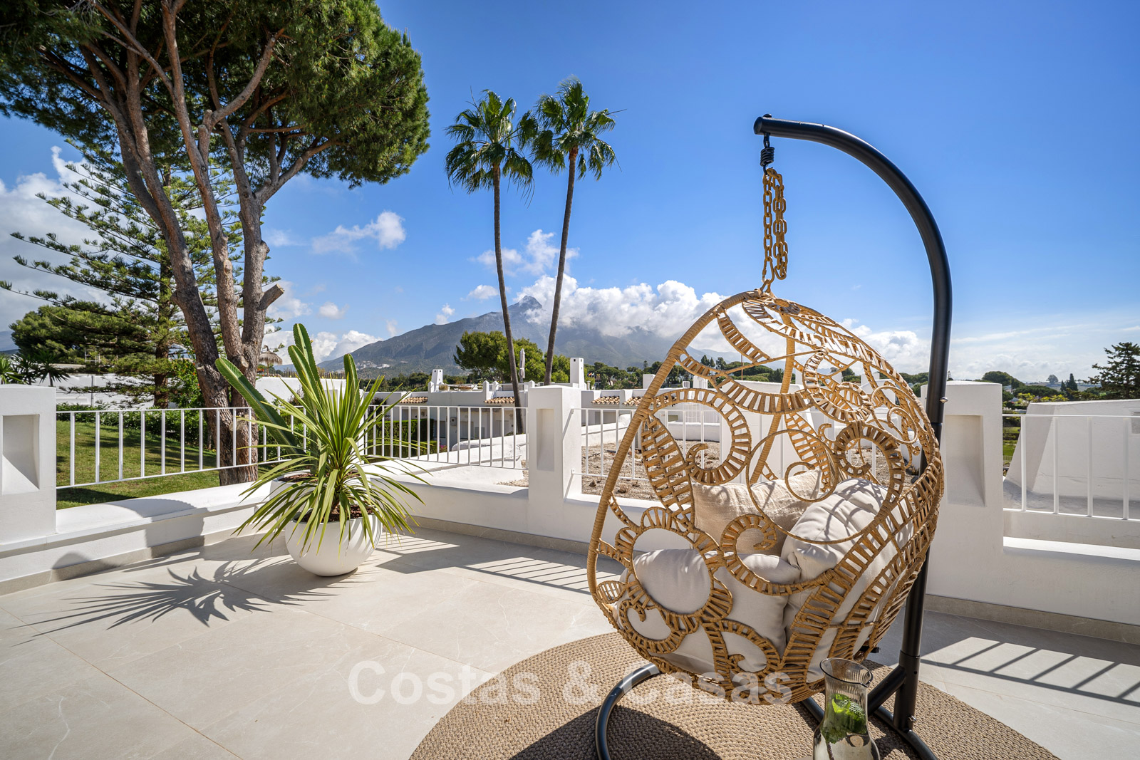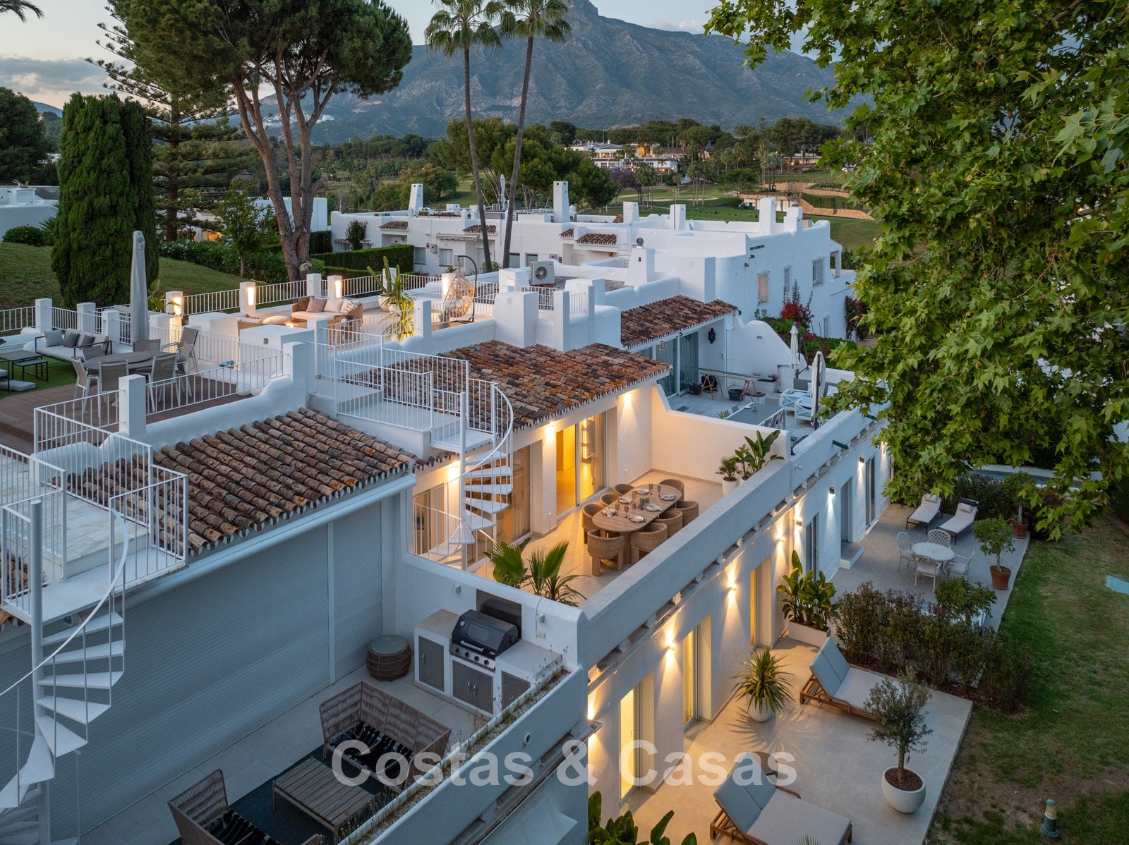 Casa adosada con un encanto mediterráneo y atemporal. Renovada con materiales y acabados de primera calidad. Situada al sur. Una escalera de caracol te lleva desde la terraza principal al espacioso solárium donde podrás disfrutar de más espacio para la relajación. Disfrutarás de una magnífica vista de los verdes fairways y de la montaña de La Concha. La distribución abierta y las grandes ventanas correderas crean un interior dinámico en el que se aprovecha al máximo la luz natural. La sala de estar se divide en una acogedora zona de estar y un comedor integrado. La moderna cocina abierta irradia elegante sencillez y comodidad orientada al diseño con una isla de cocción donde podrá desayunar. Comedor integrado. 4 dormitorios, 3 baños y un aseo de invitados independiente. Los dormitorios de la planta baja ofrecen acceso directo a una terraza privada que se integra perfectamente con una zona ajardinada. Suelos de baldosas de gran formato en color crema. Aparcamiento para 1 coche.