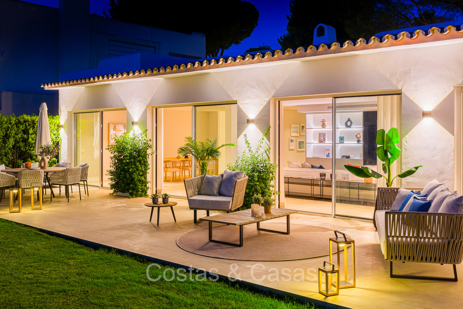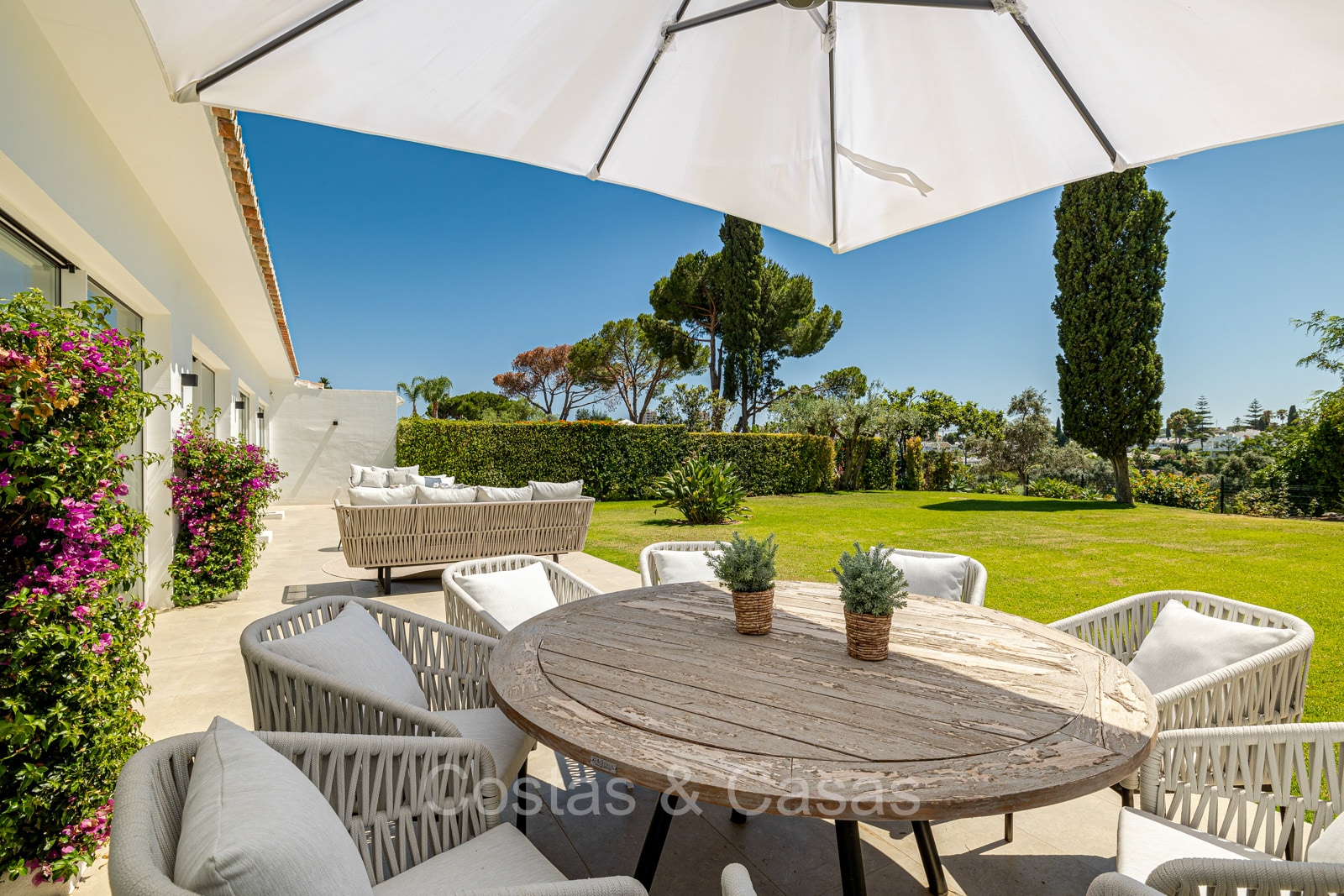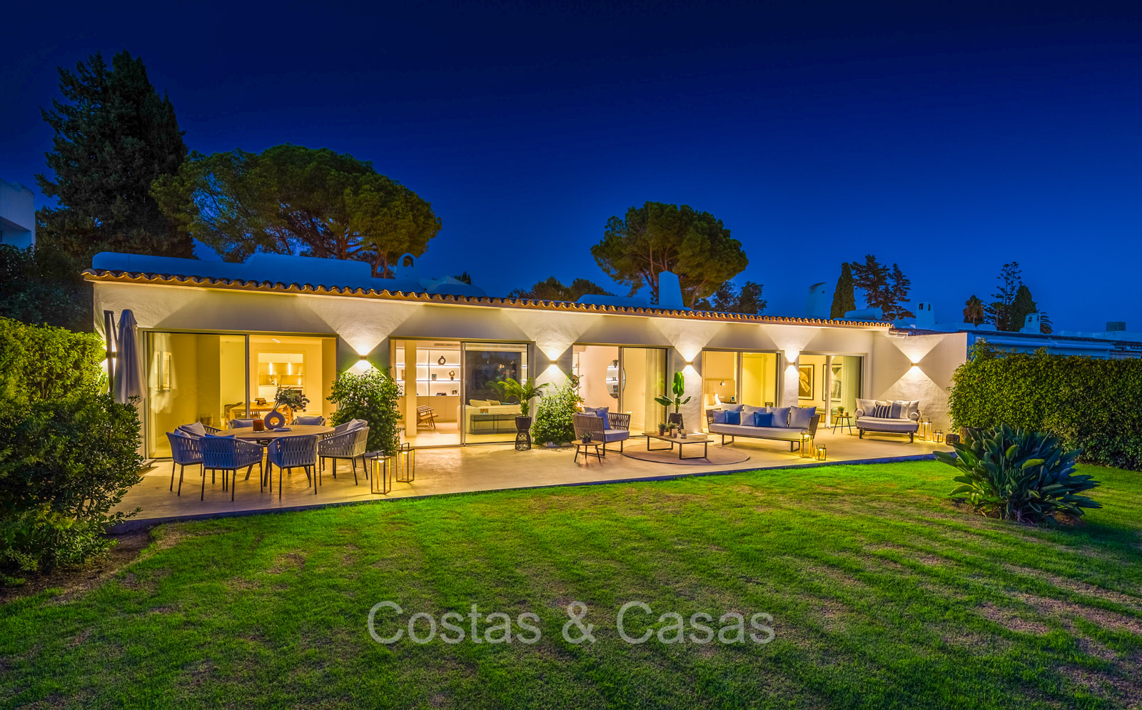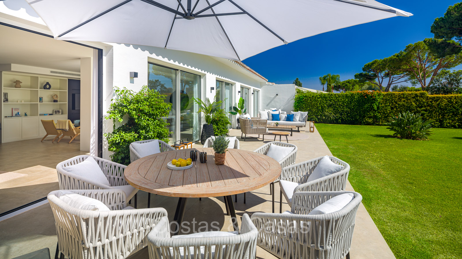Villa independiente con un estilo arquitectónico moderno y mediterráneo. Totalmente reformada en 2022 con acabados de alta calidad. Todo en una sola planta residencial. Las ventanas corredizas altas con marcos empotrados proporcionan un flujo perfecto entre los espacios interiores y exteriores y también generan abundante luz natural. Amplio salón con acceso directo a una terraza. Cocina americana totalmente equipada con vinoteca integrada y electrodomésticos Siemens. Comedor integrado. 3 amplias habitaciones, cada una con su baño. La suite principal con vestidor da acceso a una terraza privada. Suelos de gres porcelánico de gran formato. Cuarto de lavado con lavadora y secadora. Aparcamiento para 2 choches y un carrito de golf.