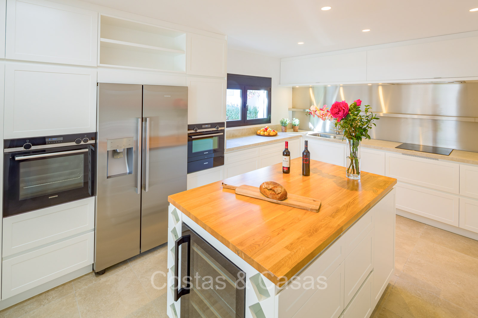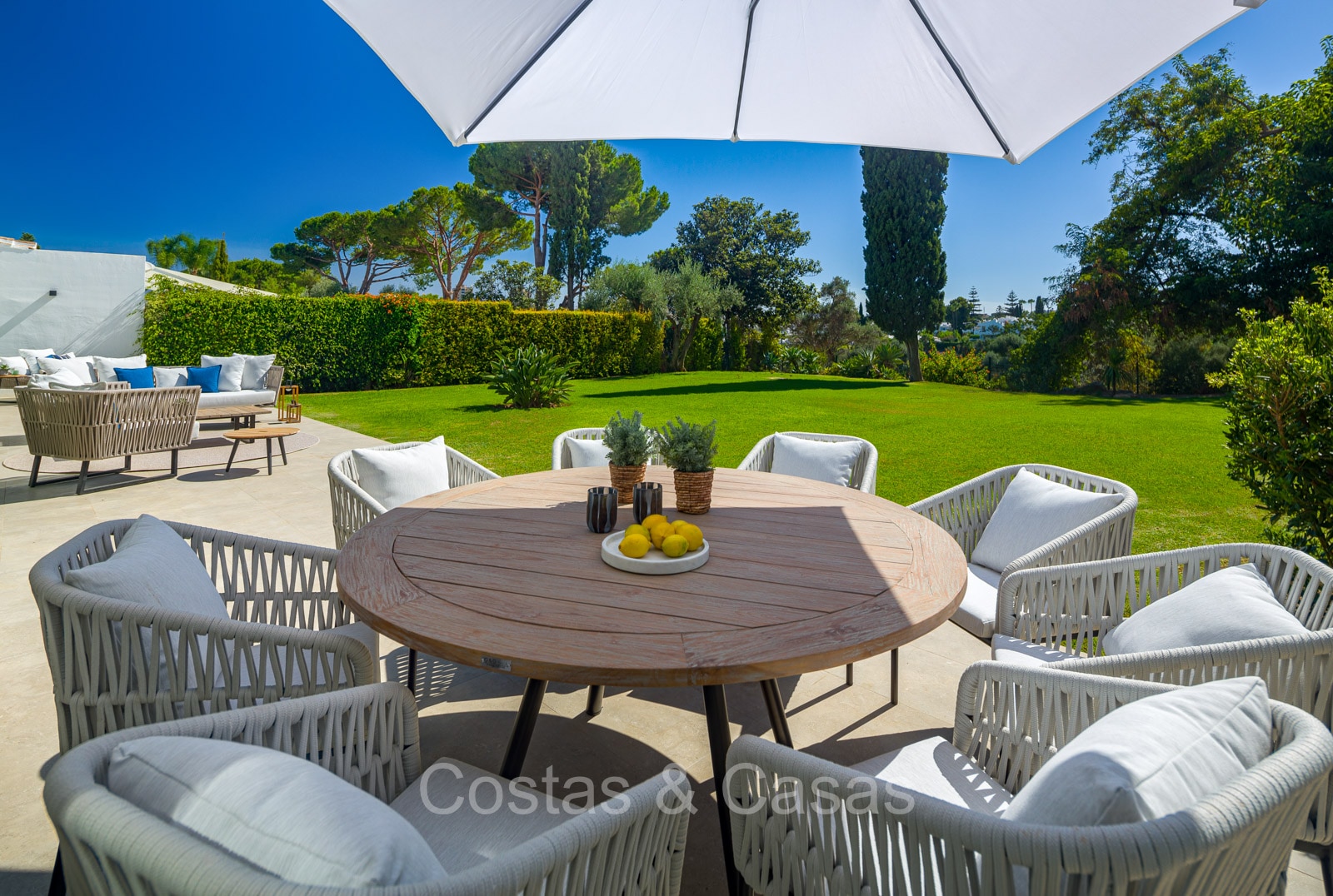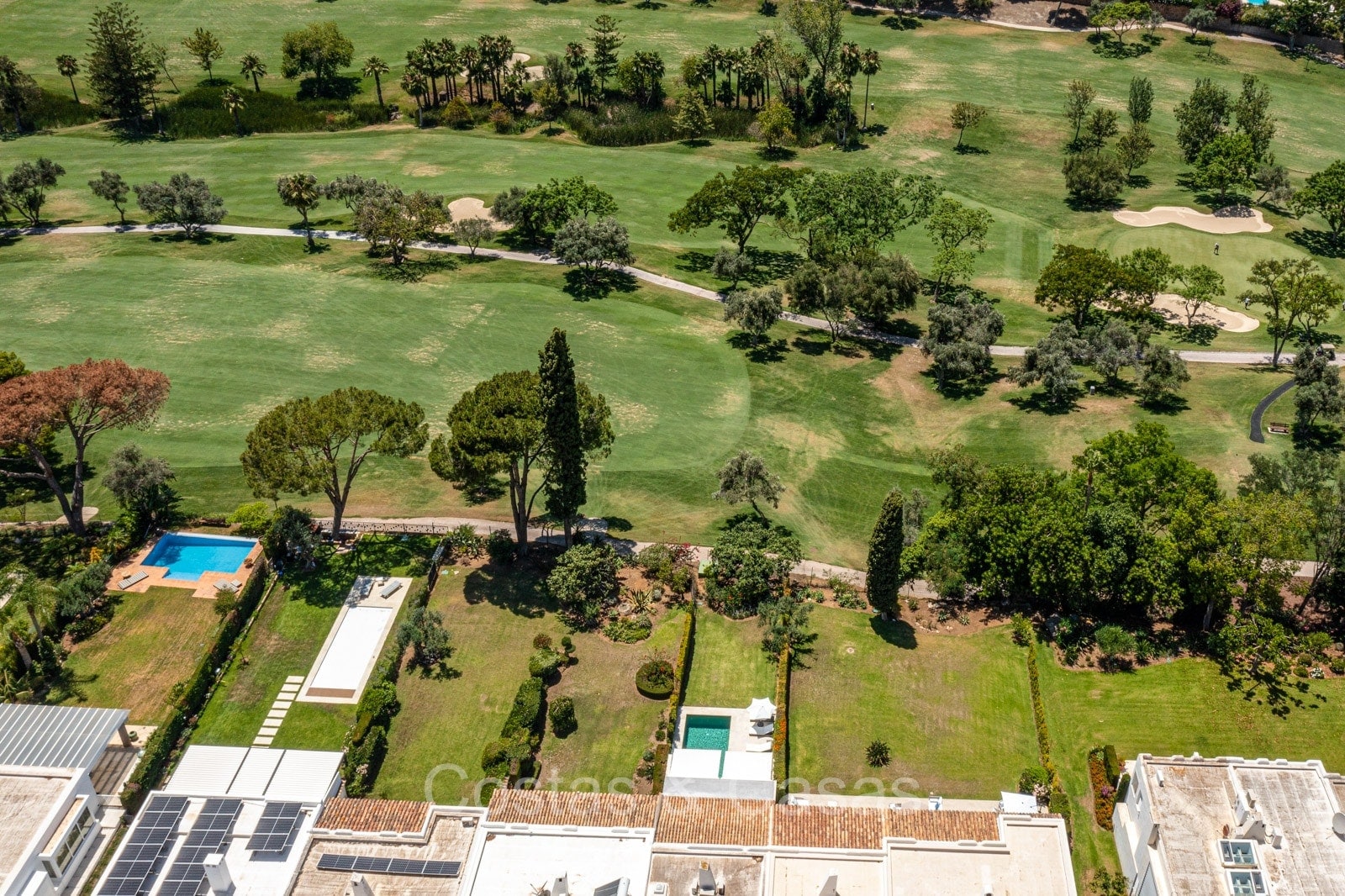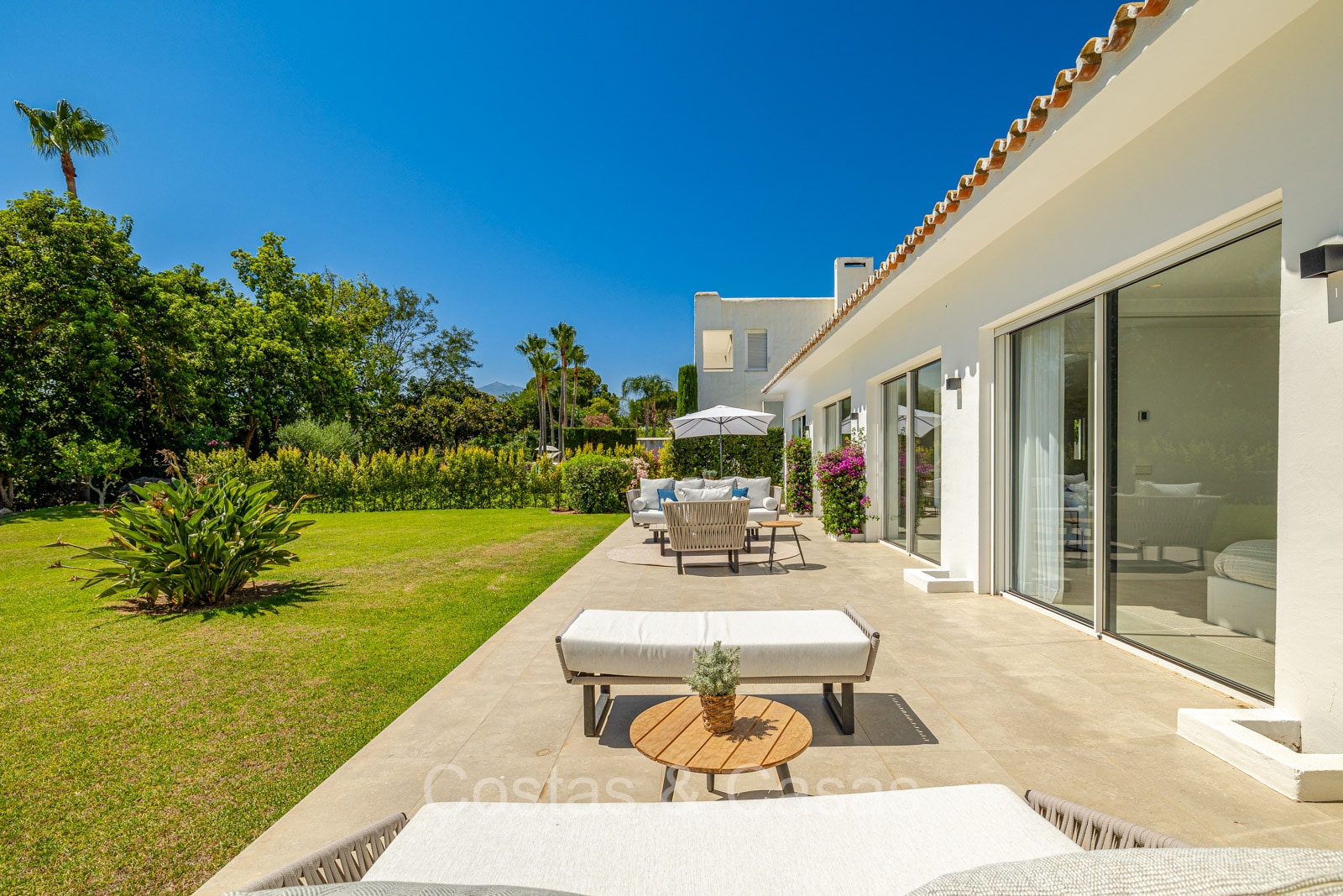 Villa independiente con un estilo arquitectónico moderno y mediterráneo. Totalmente reformada en 2022 con acabados de alta calidad. Todo en una sola planta residencial. Las ventanas corredizas altas con marcos empotrados proporcionan un flujo perfecto entre los espacios interiores y exteriores y también generan abundante luz natural. Amplio salón con acceso directo a una terraza. Cocina americana totalmente equipada con vinoteca integrada y electrodomésticos Siemens. Comedor integrado. 3 amplias habitaciones, cada una con su baño. La suite principal con vestidor da acceso a una terraza privada. Suelos de gres porcelánico de gran formato. Cuarto de lavado con lavadora y secadora. Aparcamiento para 2 choches y un carrito de golf.