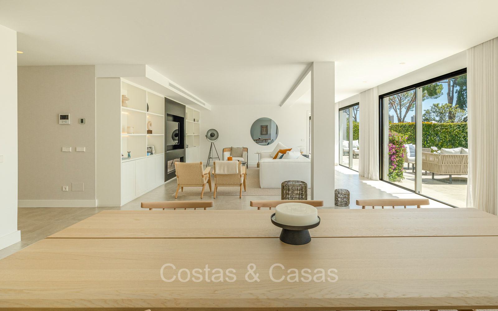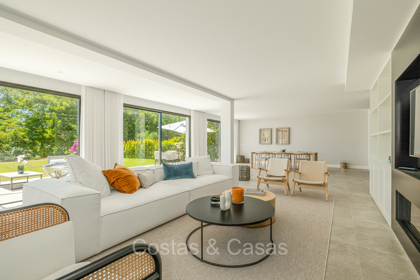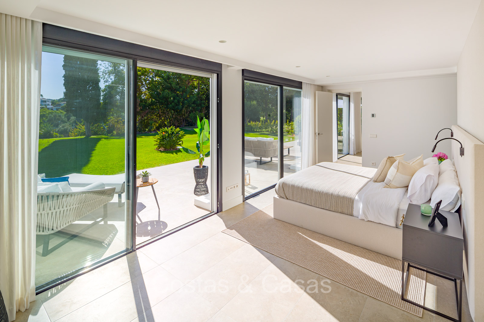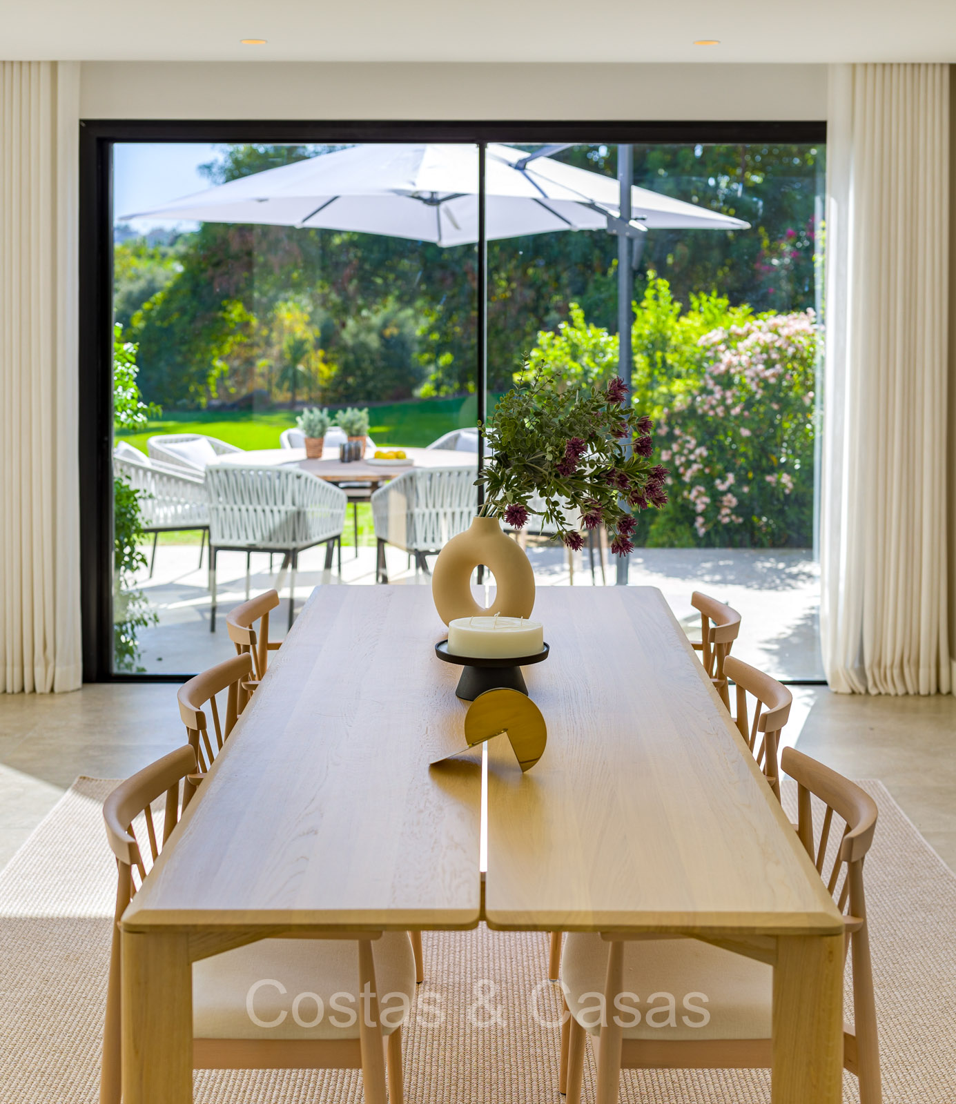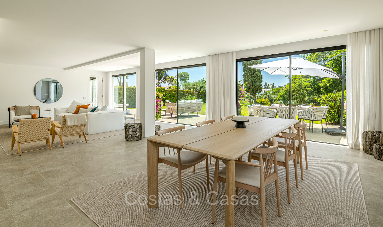 Villa independiente con un estilo arquitectónico moderno y mediterráneo. Totalmente reformada en 2022 con acabados de alta calidad. Todo en una sola planta residencial. Las ventanas corredizas altas con marcos empotrados proporcionan un flujo perfecto entre los espacios interiores y exteriores y también generan abundante luz natural. Amplio salón con acceso directo a una terraza. Cocina americana totalmente equipada con vinoteca integrada y electrodomésticos Siemens. Comedor integrado. 3 amplias habitaciones, cada una con su baño. La suite principal con vestidor da acceso a una terraza privada. Suelos de gres porcelánico de gran formato. Cuarto de lavado con lavadora y secadora. Aparcamiento para 2 choches y un carrito de golf.