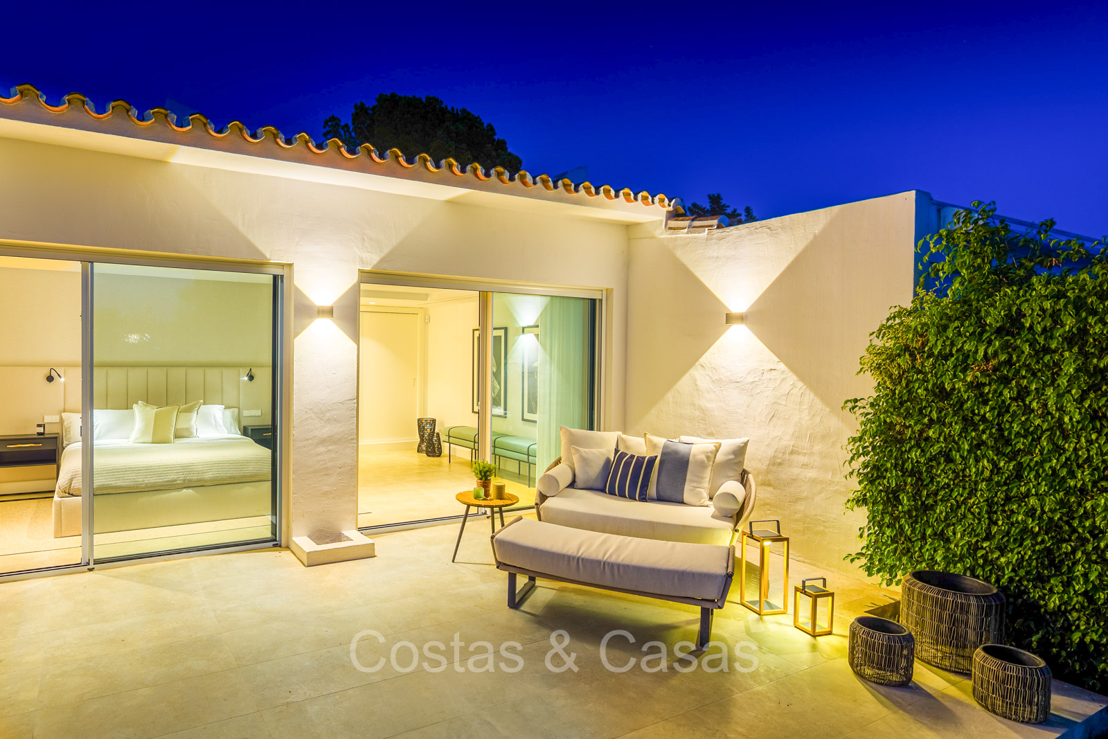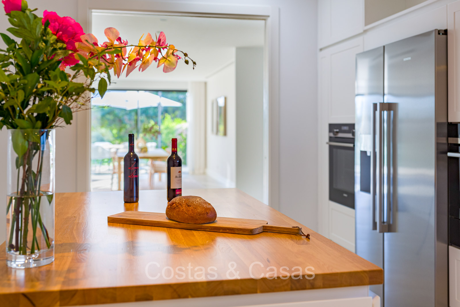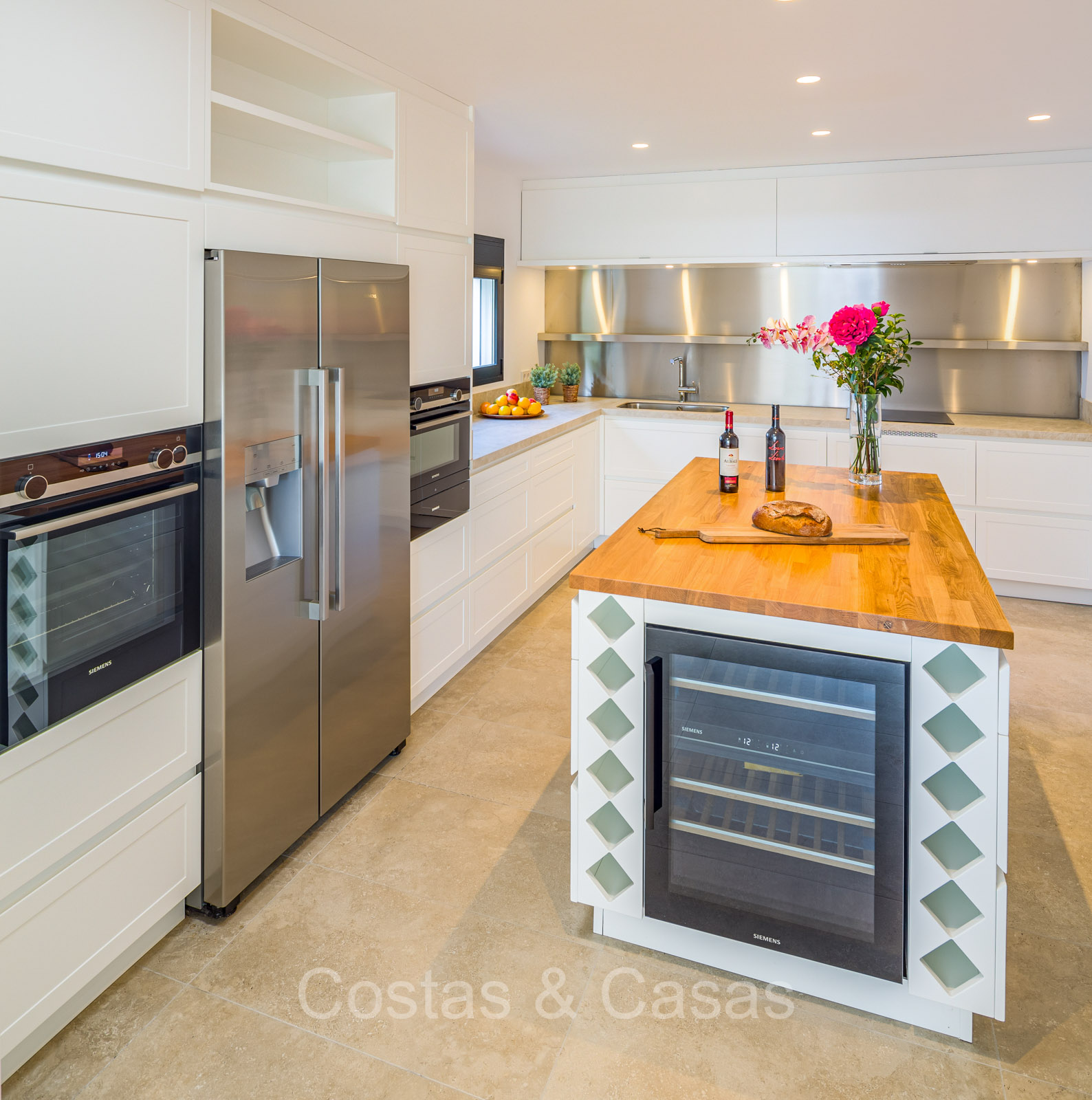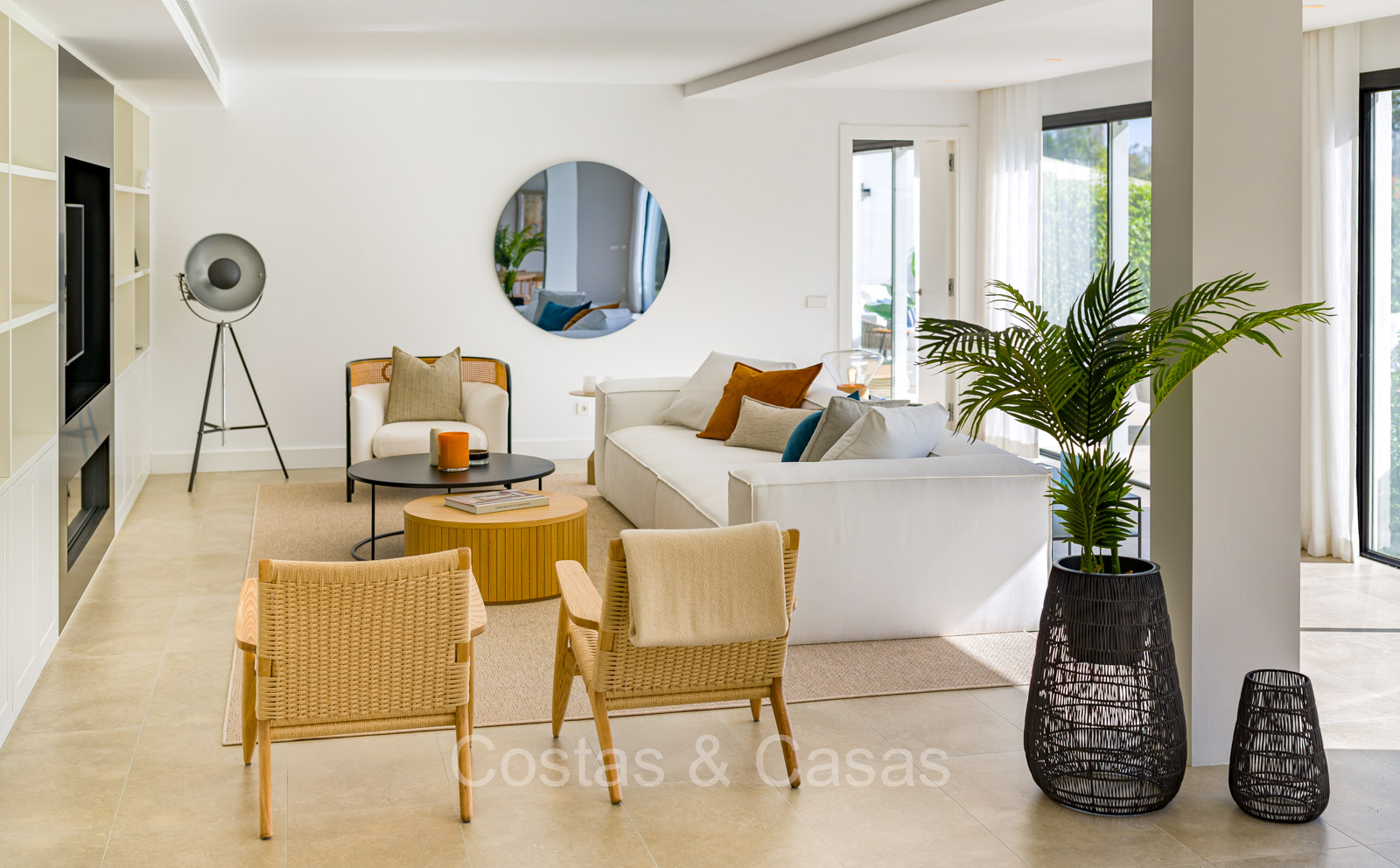 Villa independiente con un estilo arquitectónico moderno y mediterráneo. Totalmente reformada en 2022 con acabados de alta calidad. Todo en una sola planta residencial. Las ventanas corredizas altas con marcos empotrados proporcionan un flujo perfecto entre los espacios interiores y exteriores y también generan abundante luz natural. Amplio salón con acceso directo a una terraza. Cocina americana totalmente equipada con vinoteca integrada y electrodomésticos Siemens. Comedor integrado. 3 amplias habitaciones, cada una con su baño. La suite principal con vestidor da acceso a una terraza privada. Suelos de gres porcelánico de gran formato. Cuarto de lavado con lavadora y secadora. Aparcamiento para 2 choches y un carrito de golf.