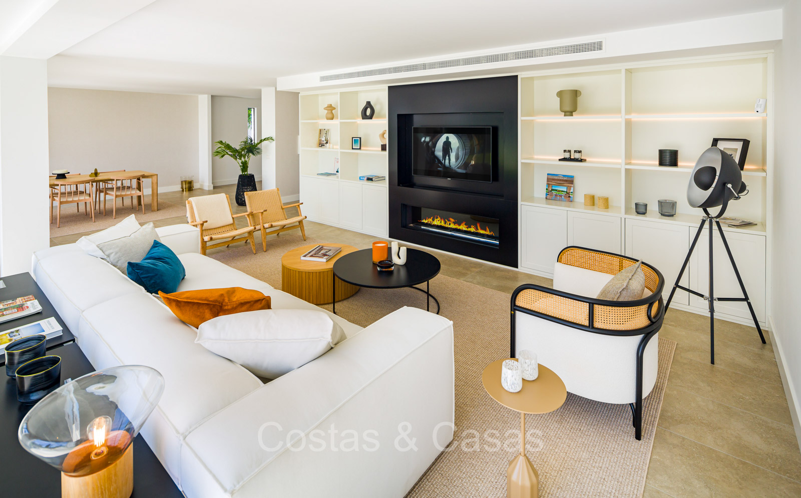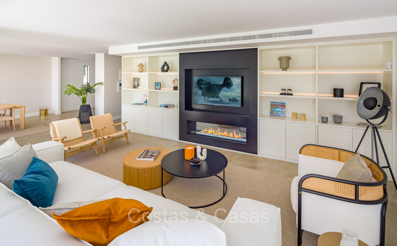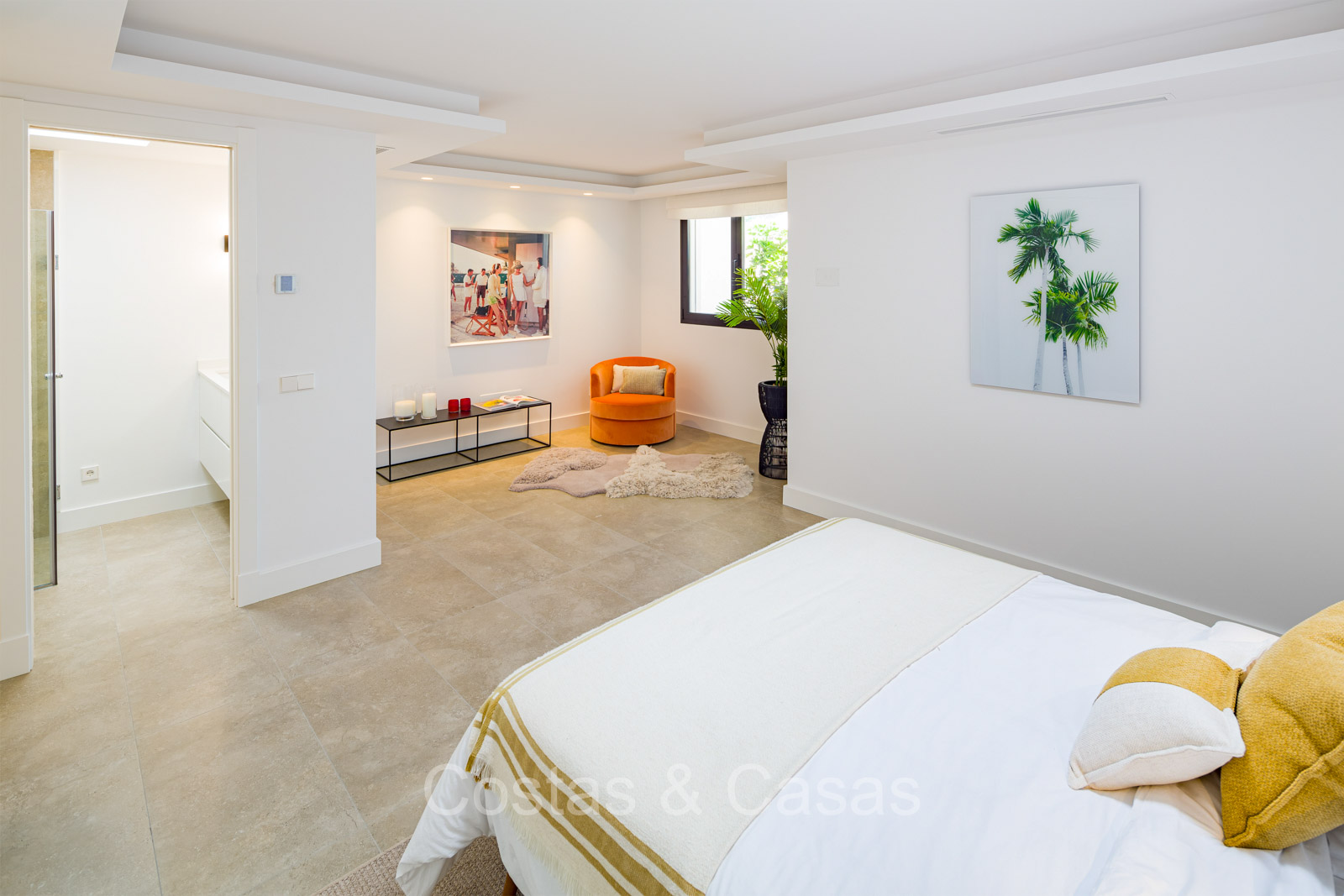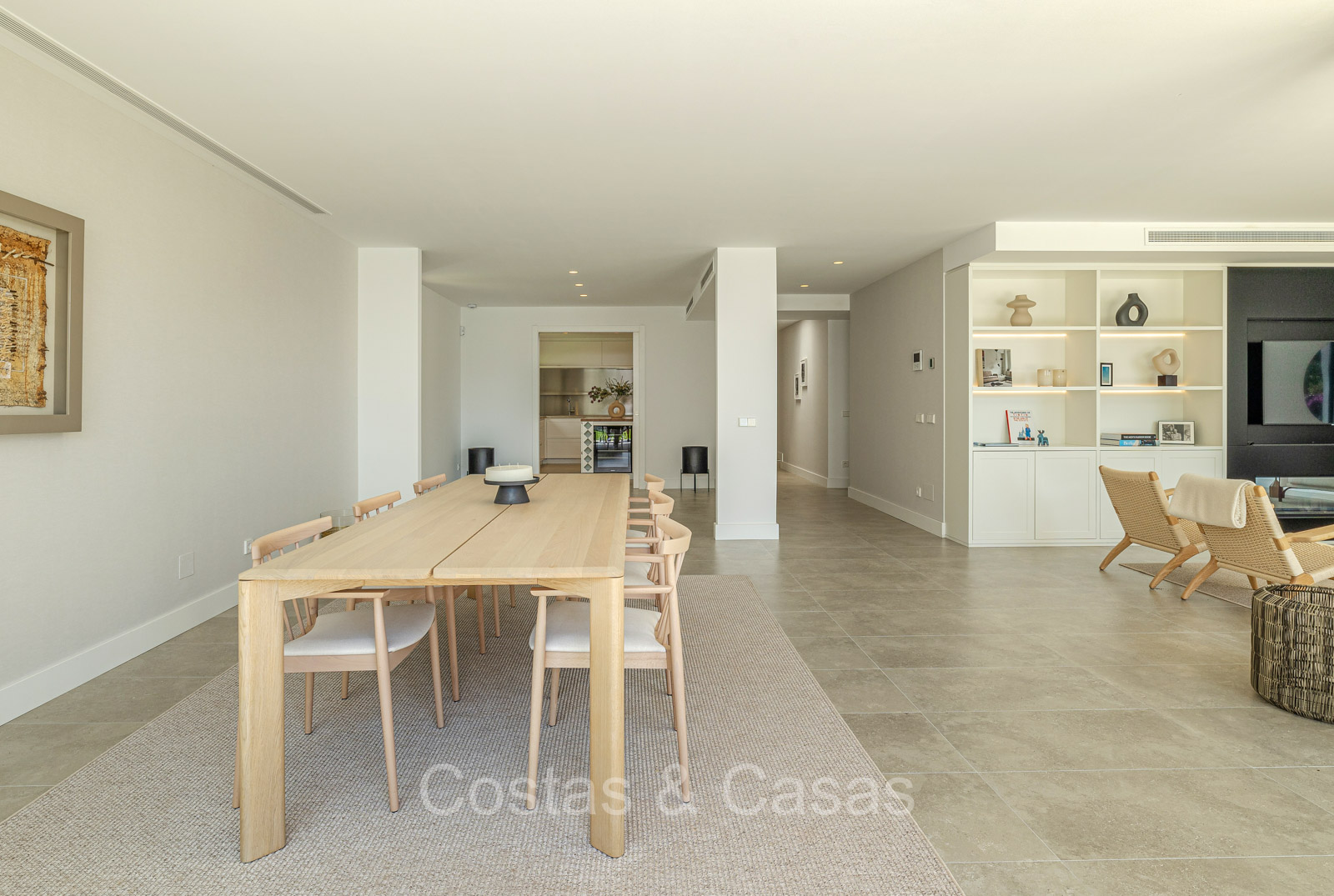 Villa independiente con un estilo arquitectónico moderno y mediterráneo. Totalmente reformada en 2022 con acabados de alta calidad. Todo en una sola planta residencial. Las ventanas corredizas altas con marcos empotrados proporcionan un flujo perfecto entre los espacios interiores y exteriores y también generan abundante luz natural. Amplio salón con acceso directo a una terraza. Cocina americana totalmente equipada con vinoteca integrada y electrodomésticos Siemens. Comedor integrado. 3 amplias habitaciones, cada una con su baño. La suite principal con vestidor da acceso a una terraza privada. Suelos de gres porcelánico de gran formato. Cuarto de lavado con lavadora y secadora. Aparcamiento para 2 choches y un carrito de golf.