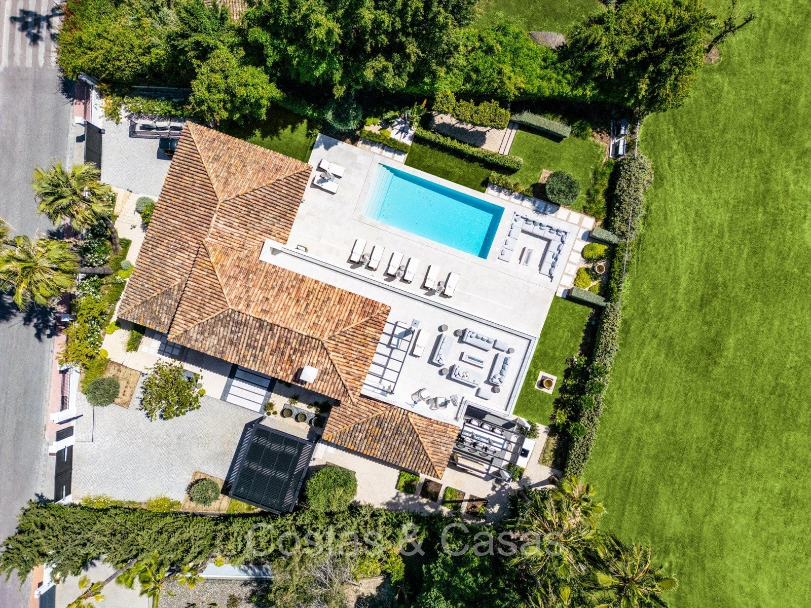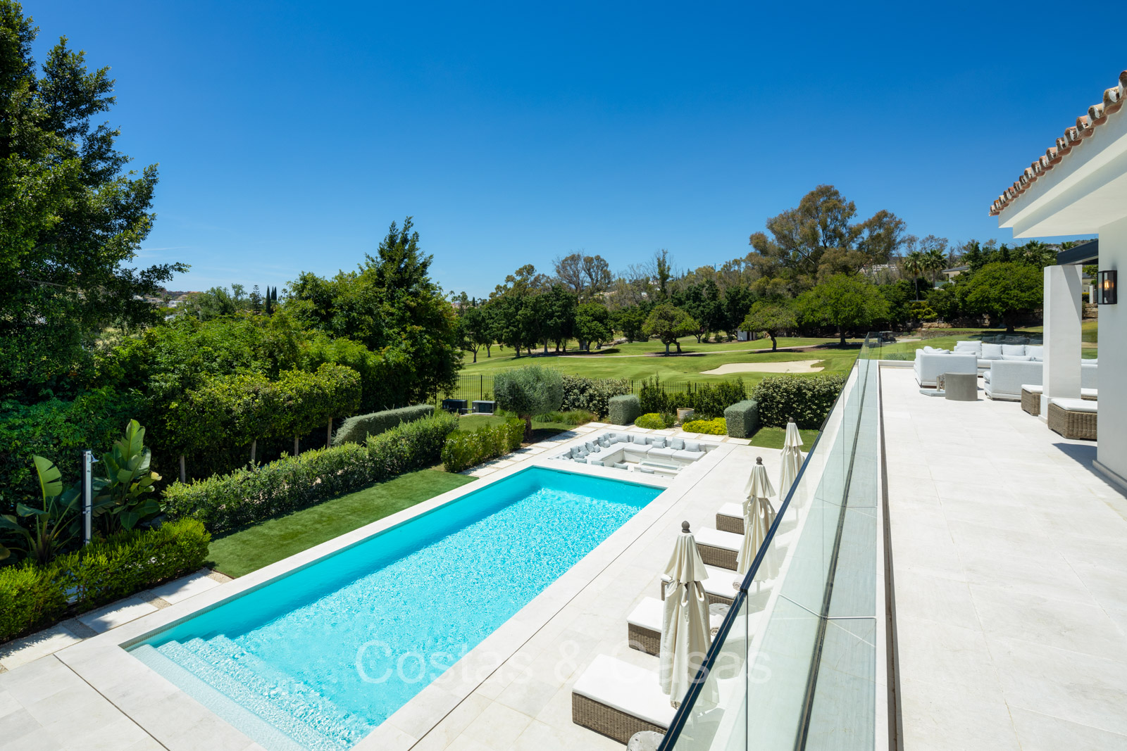 Parcela espaciosa y aislada ubicada en una posición elevada, adyacente al campo de golf. Cuidado jardín con parterres de flores y césped bien cuidados. Gran piscina rodeada por una terraza para tomar sol y un lounge hundido con fogón. Terraza pérgola adjunta con cocina al aire libre y comedor al aire libre. Amplias terrazas abiertas y con sombra para cenar y descansar al aire libre. Vista del pintoresco entorno con calles verdes.
