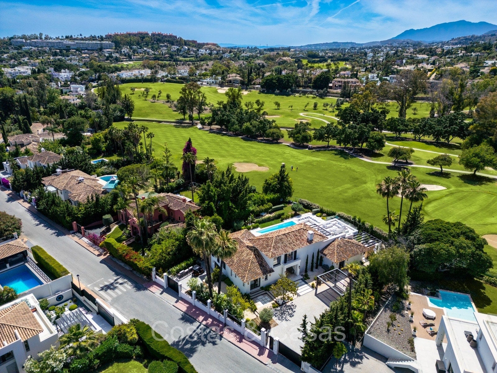 Junto al campo de golf en el valle del golf de Nueva Andalucía, en una agradable zona residencial con viviendas de lujo. A solo minutos en auto de los principales campos de golf del valle, incluidos Los Naranjos, Aloha, Las Brisas y La Quinta. San Pedro y el centro de Marbella están a 5 y 10 minutos en coche. En las inmediaciones hay restaurantes, bares de tapas, supermercados, colegios internacionales, varios clubes de tenis, gimnasios y más. A 2 km de Puerto Banús y la playa, lo que facilita el acceso en bicicleta a la Milla de Oro, con numerosos restaurantes junto a la playa y complejos turísticos de cinco estrellas.