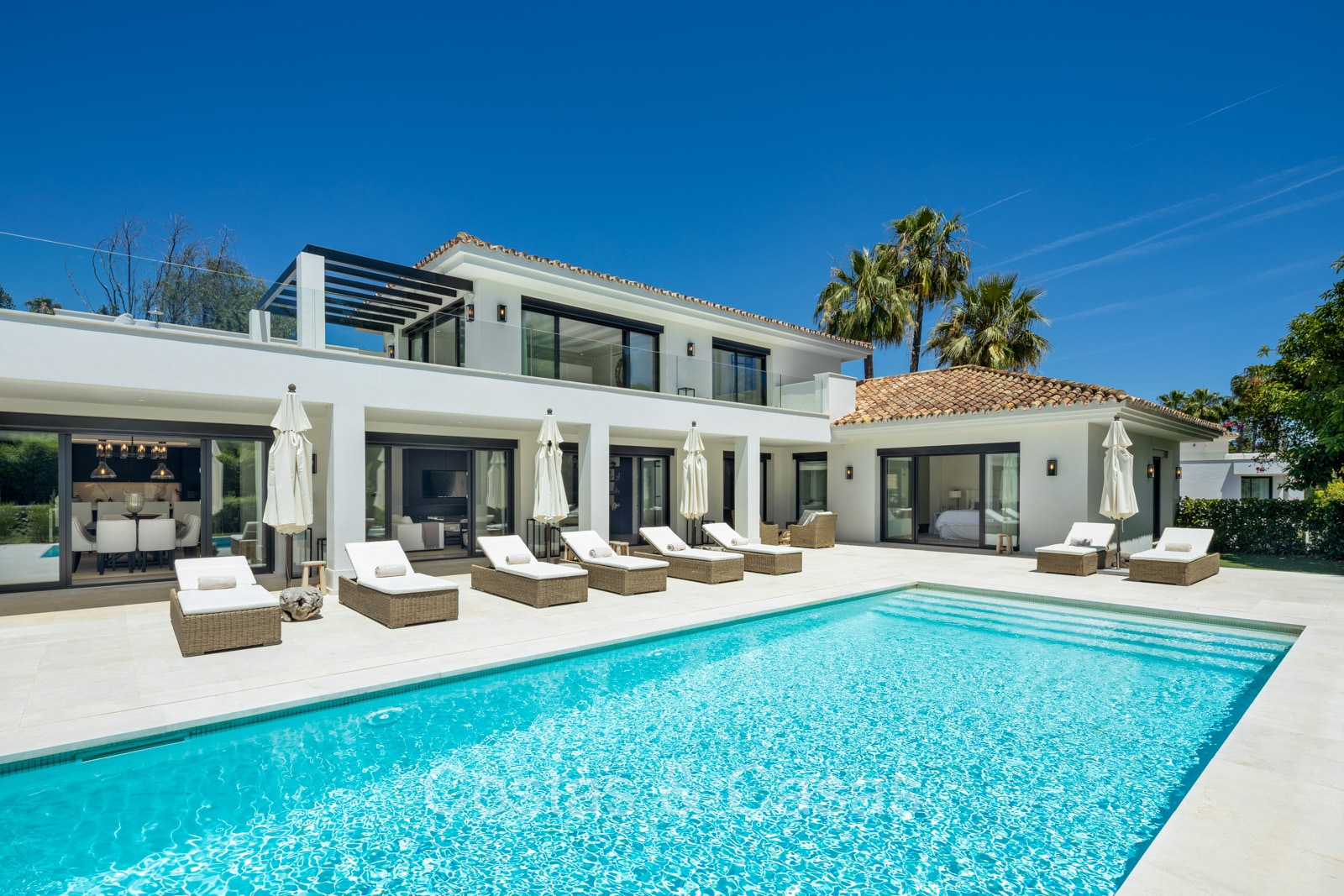 Villa independiente con un estilo arquitectónico moderno y mediterráneo. Prestigioso y contemporáneo renovada con atención a un acabado superior. Las altas ventanas correderas proporcionan un interior aireado y muy luminoso. Sala de estar abierta con una acogedora sala de televisión y comedor integrado. La cocina conecta perfectamente con el salón y está totalmente equipada con electrodomésticos de primera calidad y una isla para sentarse. 5 dormitorios, 5 baños y 2 aseos independientes. La suite principal se encuentra en la planta superior y tiene un gran baño y acceso a una amplia terraza privada con salón. Suelos de parquet cerámico en zonas de estar y dormitorios. Gimnasio totalmente equipado. En la planta inferior hay una gran zona de entretenimiento con sala de TV. Alojamiento de huéspedes interior con entrada privada. Sala técnica. Lavadero equipado. Trastero. Garaje interior para 1 coche. Cochera cubierta para 2 autos.