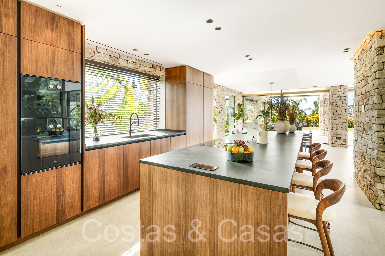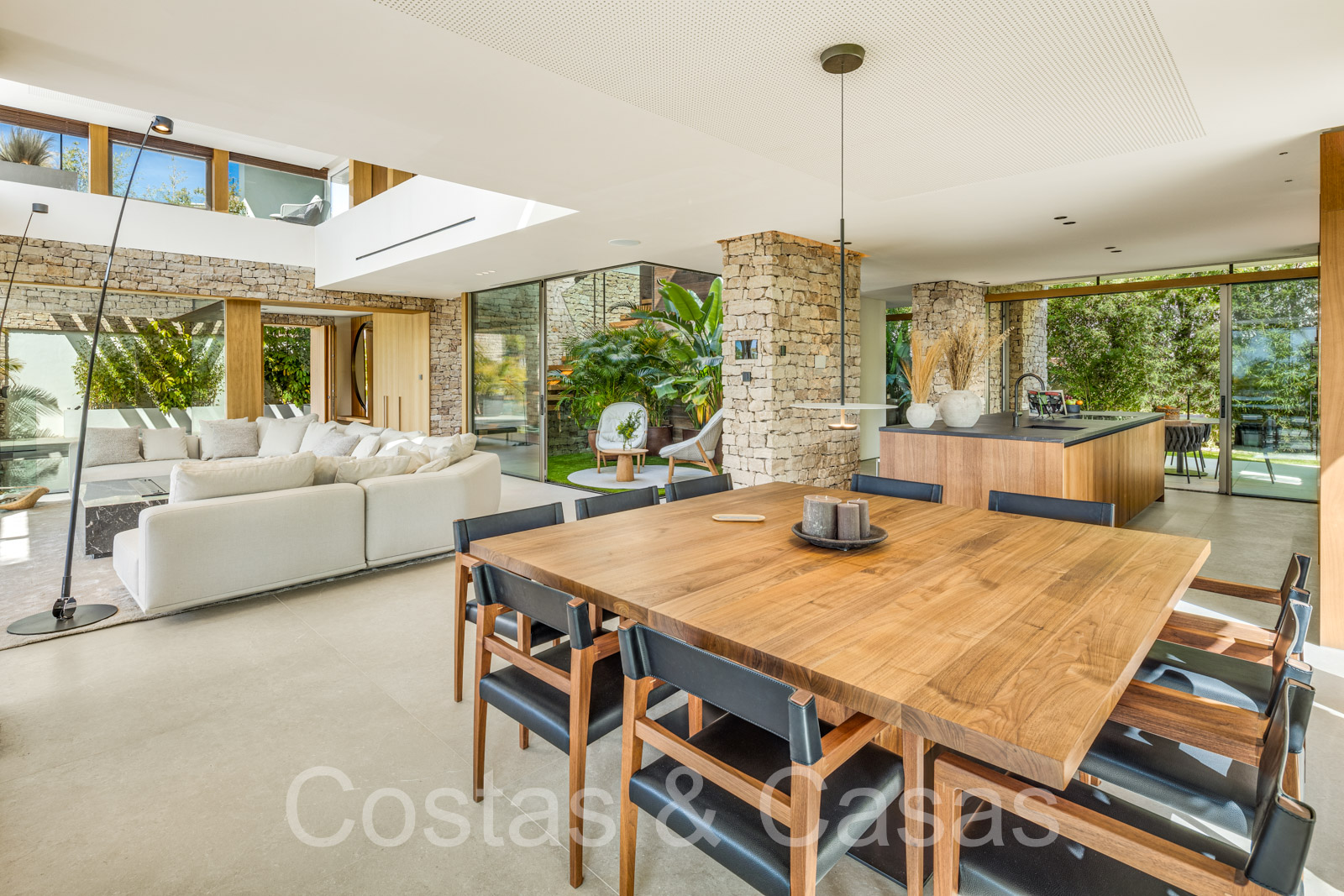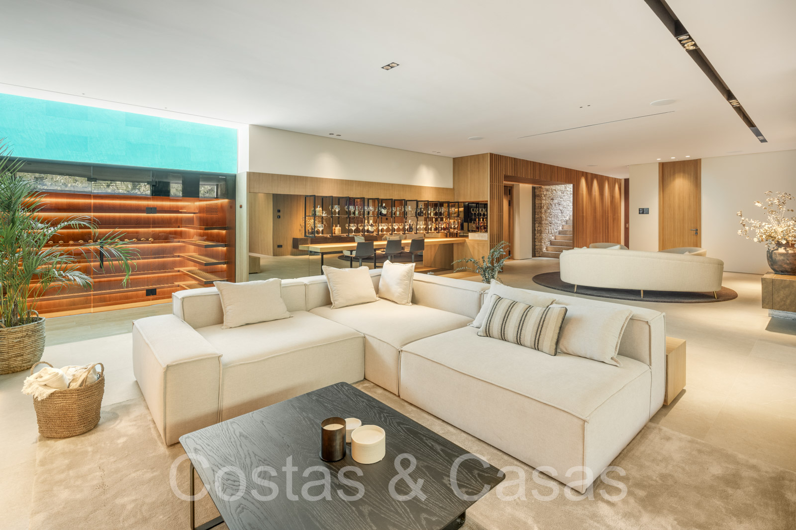Villa independiente con diseño de última generación. Utilizando las tecnologías más avanzadas y construido con atención al detalle. Se puede acceder a la villa a través de un camino privado que conduce a un garaje privado interior. Un diseño interior abierto y minimalista, con elementos constructivos naturales, espacios de doble altura y patios verdes que siempre brindan una mirada creativa. La sala de estar tiene hermosas paredes de piedra Travertino Tajal, que imitan el exterior de la villa. El salón tiene un techo de doble altura enriquecido con estructuras de ventanas, lo que proporciona ventilación y luz extra. Las puertas correderas de suelo a techo con perfiles empotrados crean una conexión perfecta entre el interior y el exterior y, además, proporcionan estancias muy luminosas. Amplia cocina abierta con electrodomésticos Gaggenau, detalles naturales y mucho espacio de almacenamiento. 5 dormitorios, 5 baños y 2 aseos independientes. La planta inferior está dedicada al entretenimiento y ofrece un bar personalizado, bodega de vinos, zona chill-out y TV. Un aspecto atractivo de este espacio es que desde este nivel se tiene vista a la piscina. Cuarto de lavado equipado con máquinas Miele y mucho espacio de almacenamiento. Garaje interior para 4 coches.