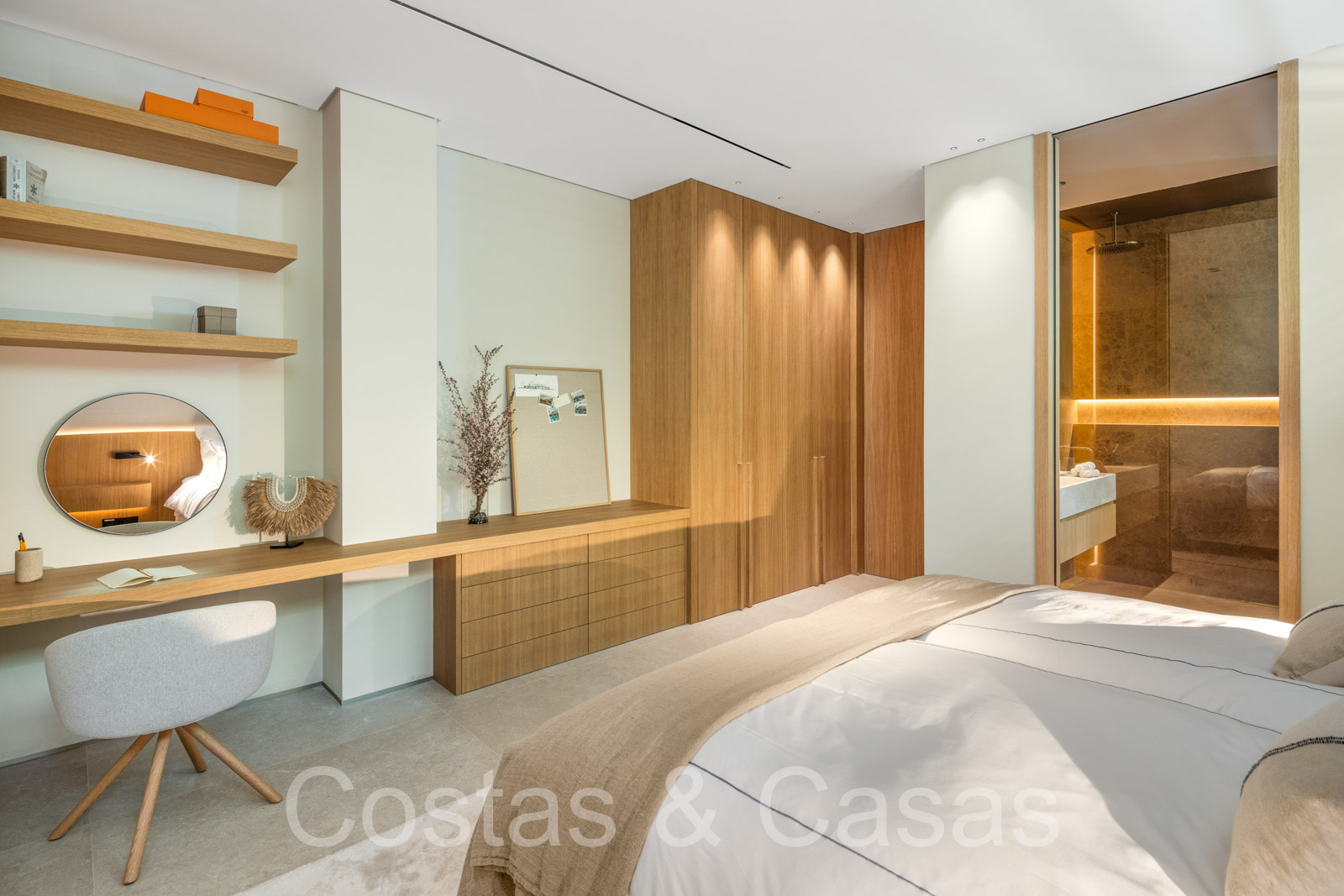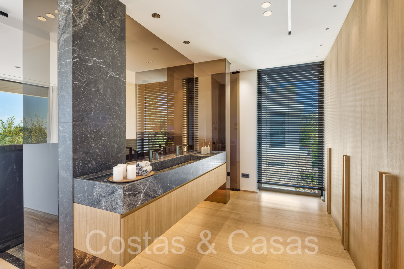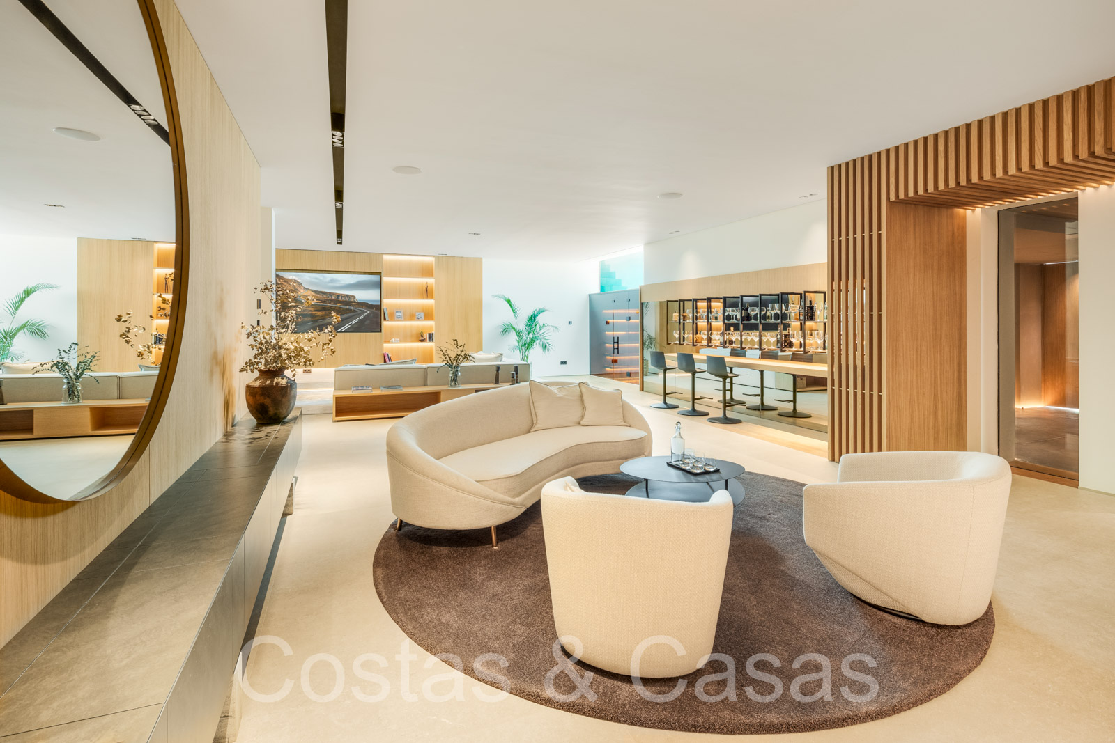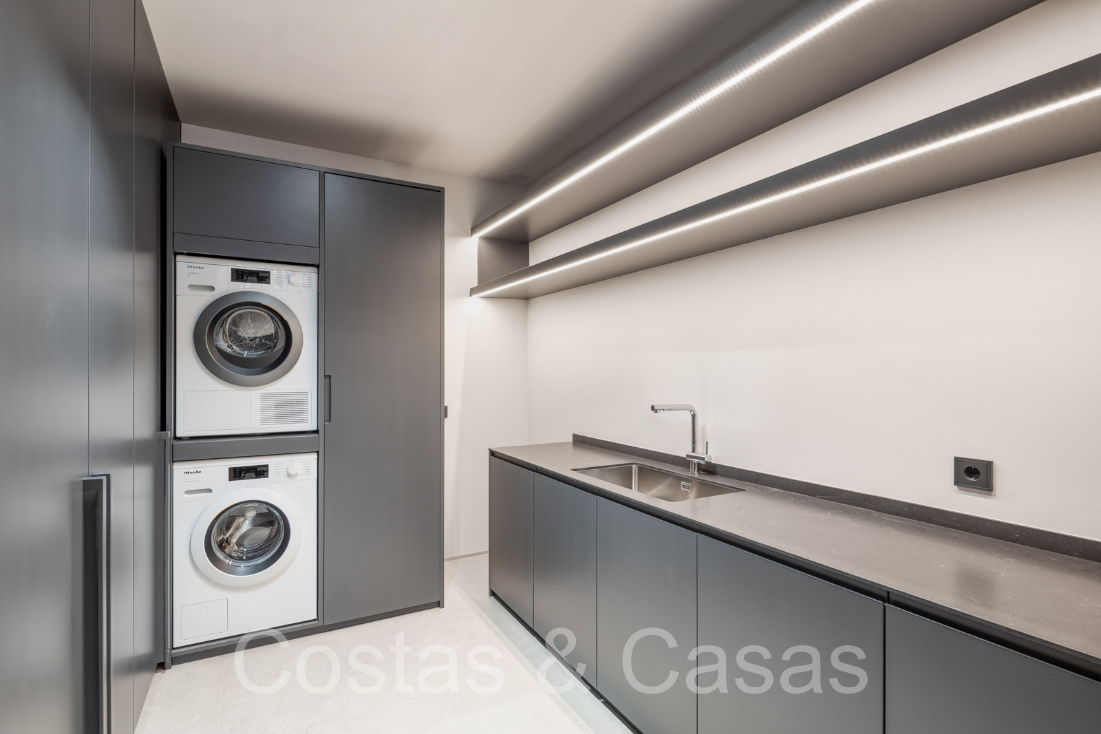 Villa independiente con diseño de última generación. Utilizando las tecnologías más avanzadas y construido con atención al detalle. Se puede acceder a la villa a través de un camino privado que conduce a un garaje privado interior. Un diseño interior abierto y minimalista, con elementos constructivos naturales, espacios de doble altura y patios verdes que siempre brindan una mirada creativa. La sala de estar tiene hermosas paredes de piedra Travertino Tajal, que imitan el exterior de la villa. El salón tiene un techo de doble altura enriquecido con estructuras de ventanas, lo que proporciona ventilación y luz extra. Las puertas correderas de suelo a techo con perfiles empotrados crean una conexión perfecta entre el interior y el exterior y, además, proporcionan estancias muy luminosas. Amplia cocina abierta con electrodomésticos Gaggenau, detalles naturales y mucho espacio de almacenamiento. 5 dormitorios, 5 baños y 2 aseos independientes. La planta inferior está dedicada al entretenimiento y ofrece un bar personalizado, bodega de vinos, zona chill-out y TV. Un aspecto atractivo de este espacio es que desde este nivel se tiene vista a la piscina. Cuarto de lavado equipado con máquinas Miele y mucho espacio de almacenamiento. Garaje interior para 4 coches.