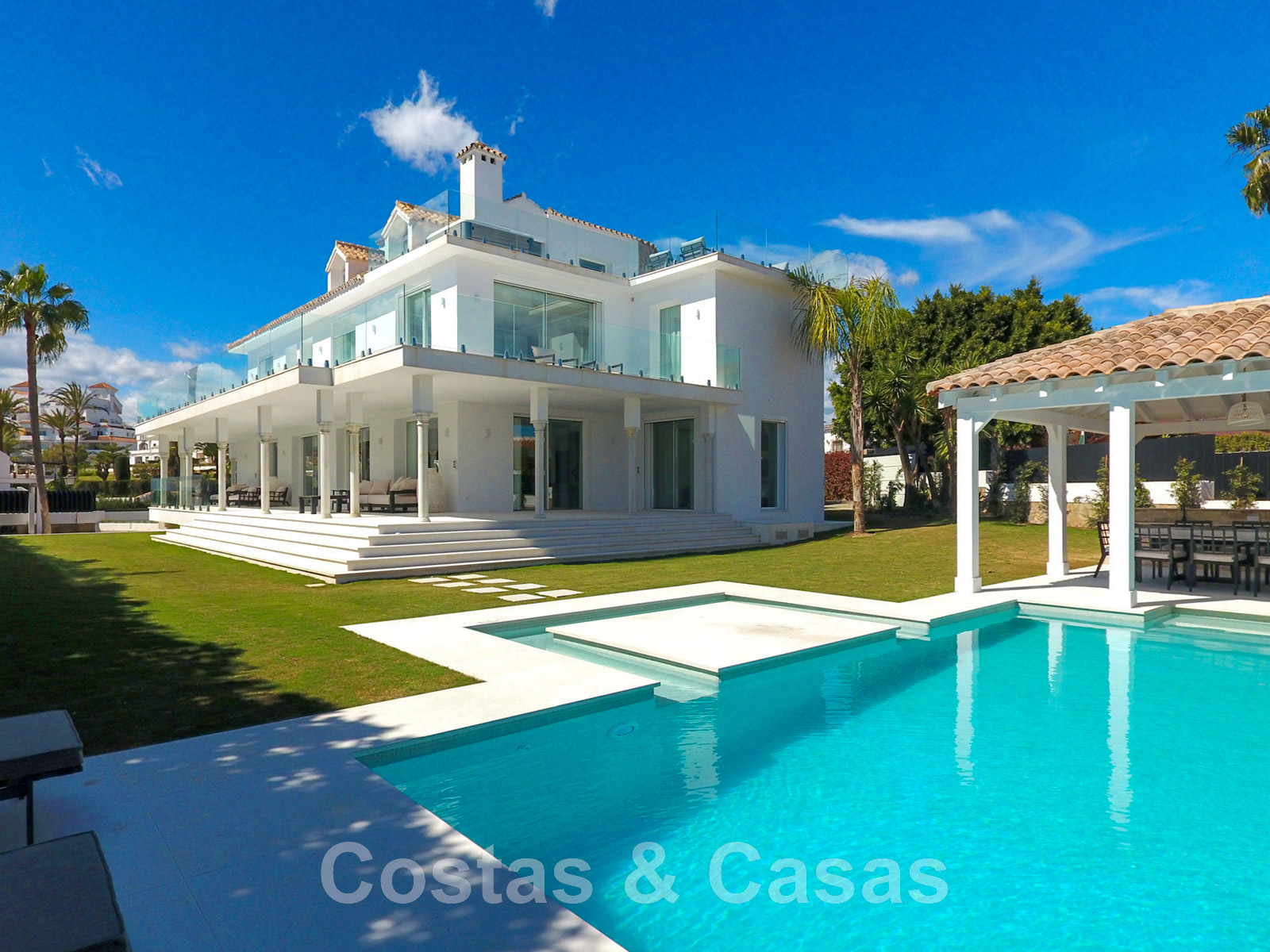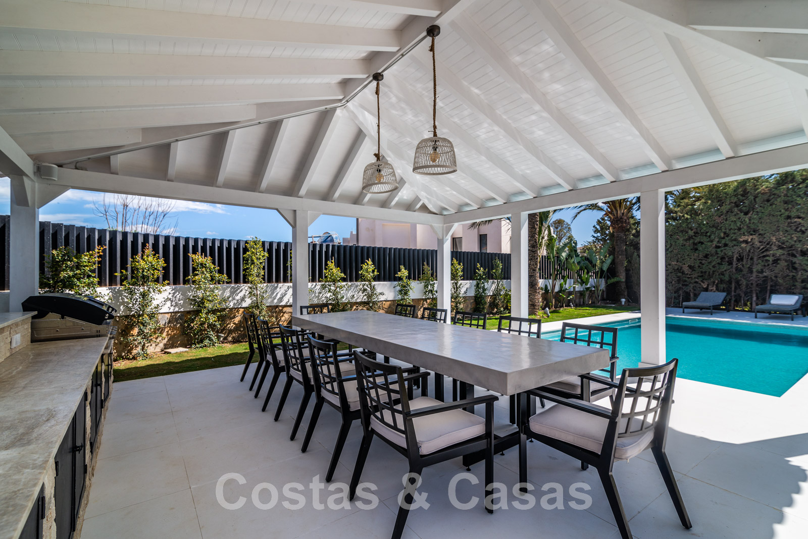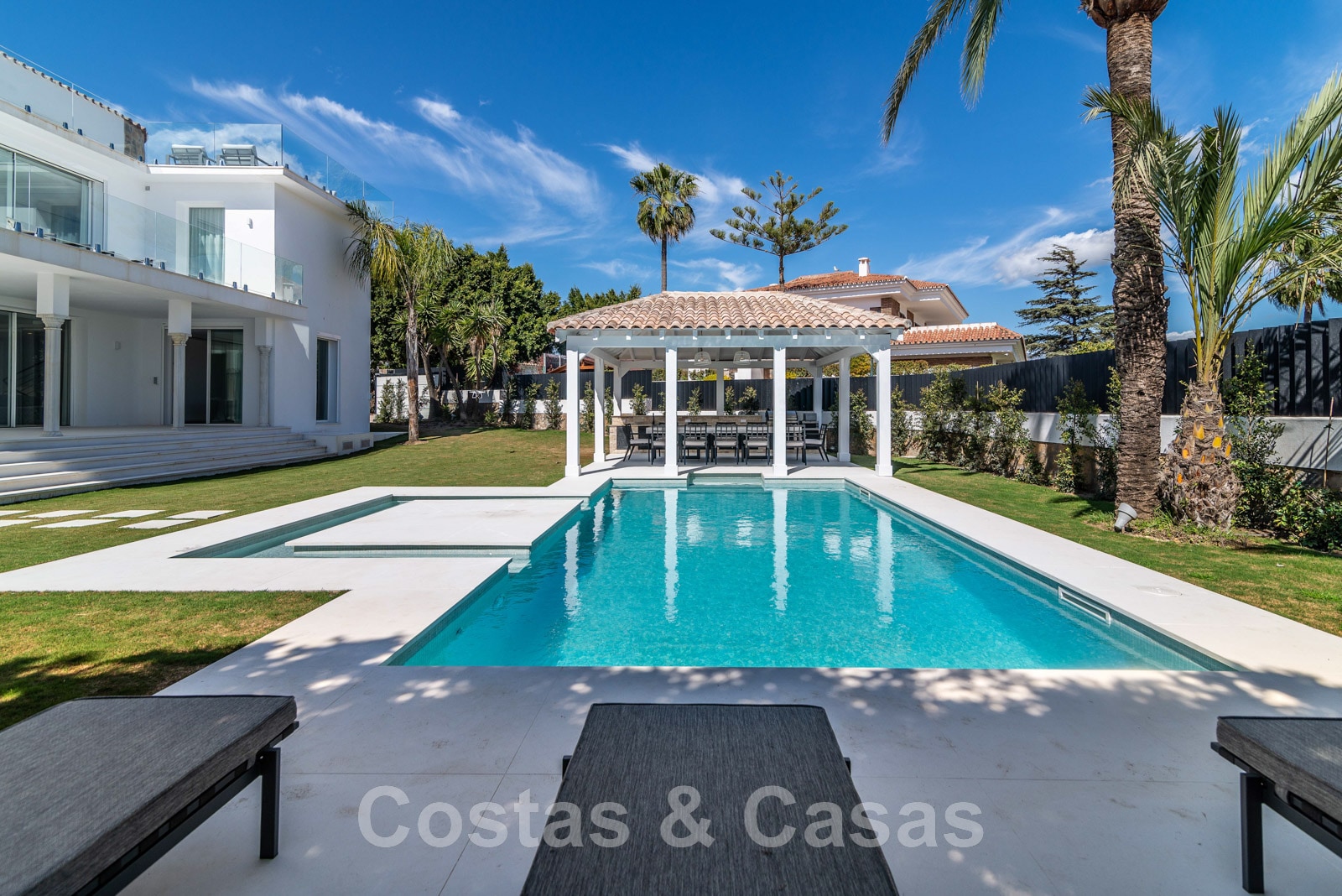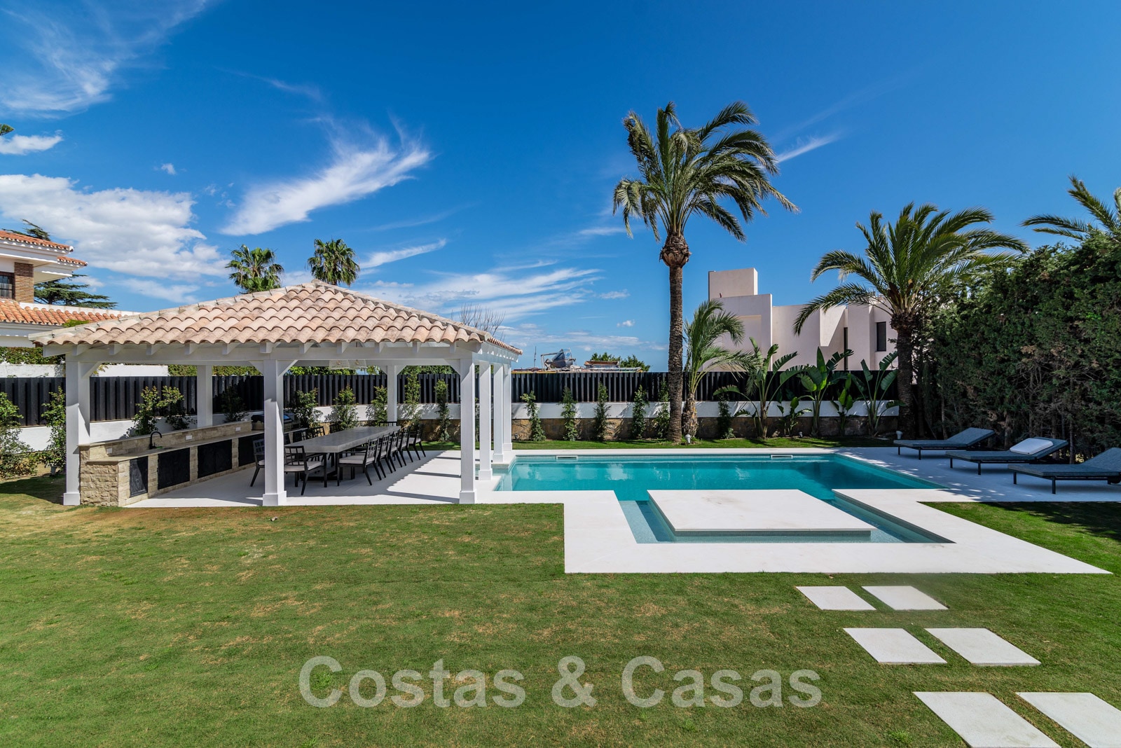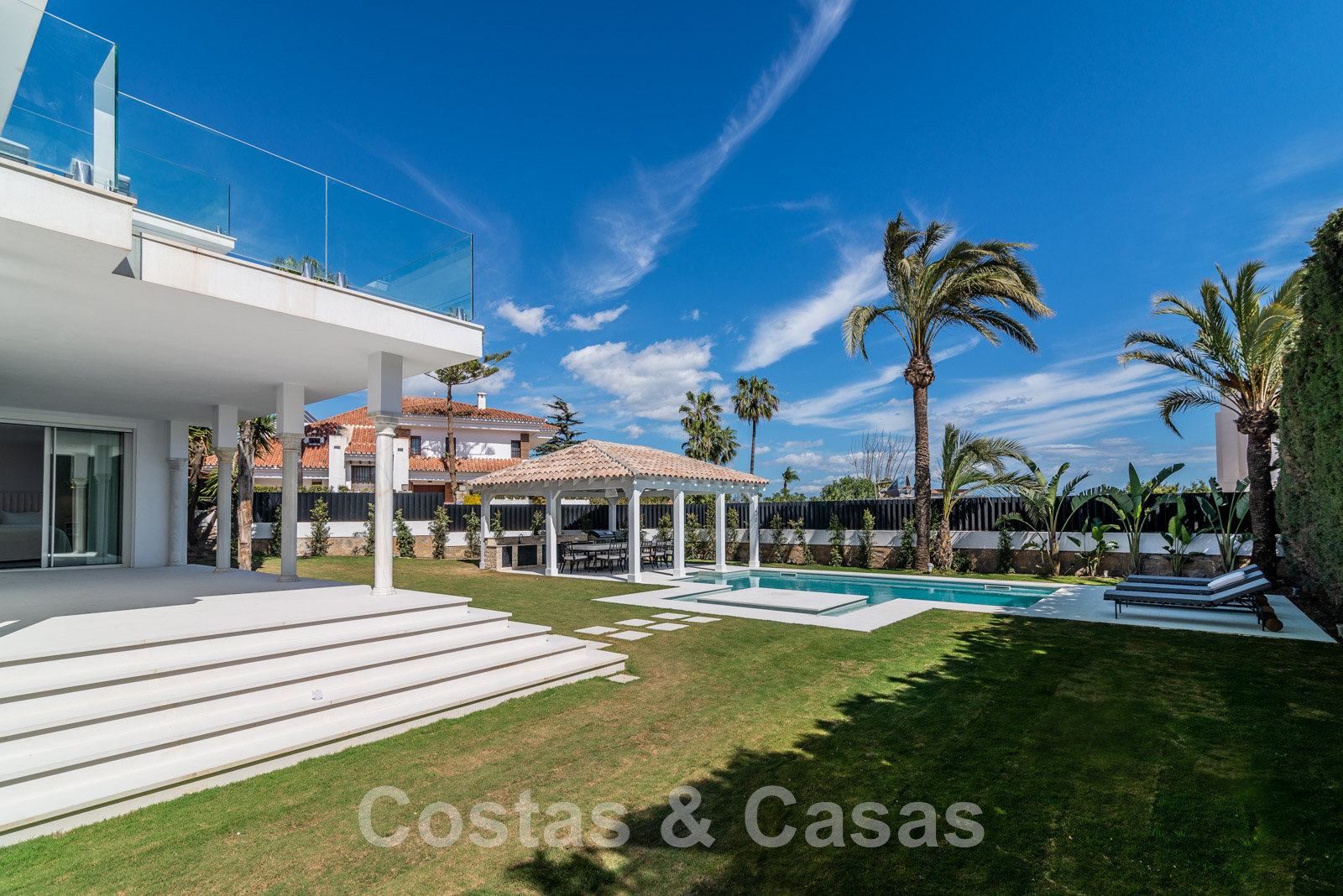 Parcela de esquina vallada con cipreses. Jardín tropical con palmeras maduras. Gran piscina con solárium. Pool house con una cocina al aire libre equipada con barbacoa, refrigerador de vino y un comedor. Amplias zonas exteriores con varias terrazas abiertas y cubiertas con zonas de relax. Intimidad gracias a las plantaciones altas. Vistas panorámicas desde la planta superior de la costa de Marbella hacia el continente africano y la pintoresca montaña de La Concha.