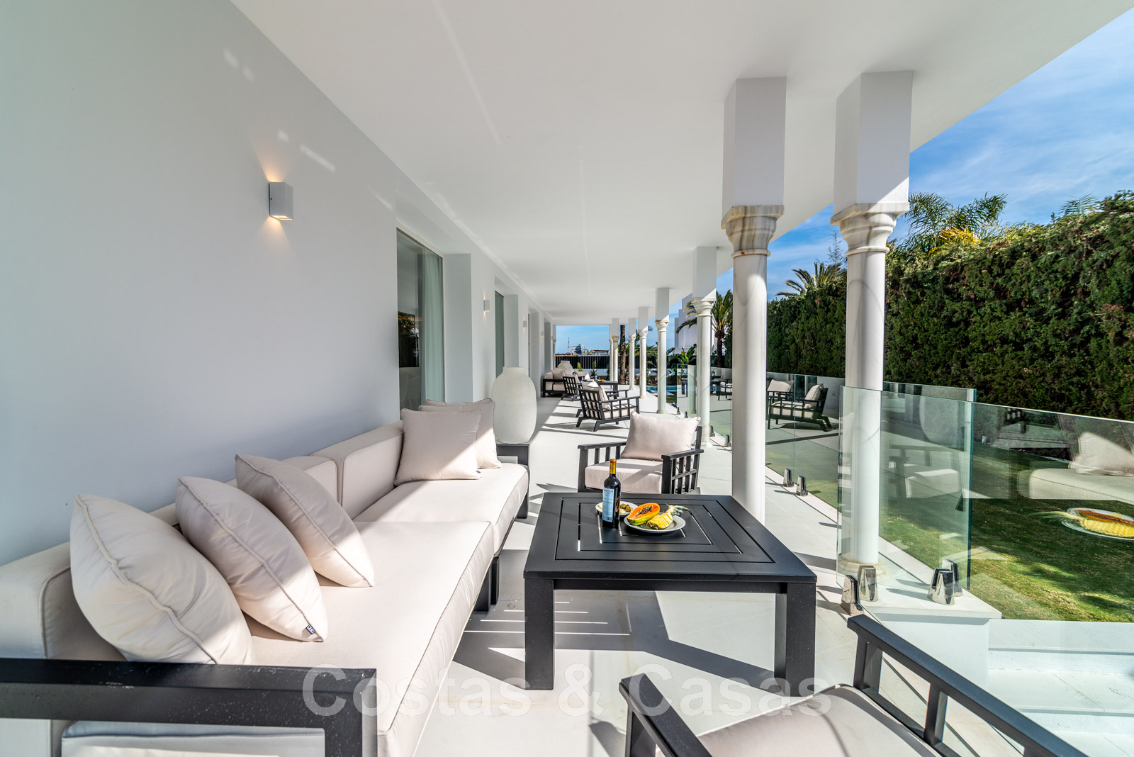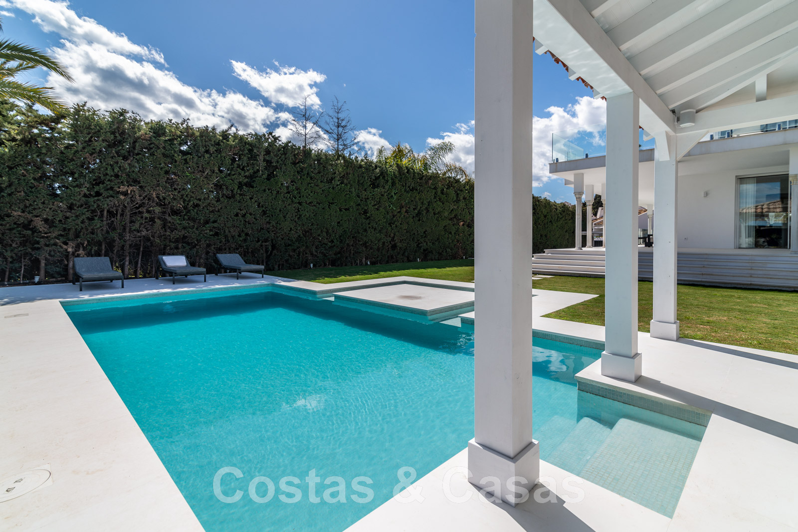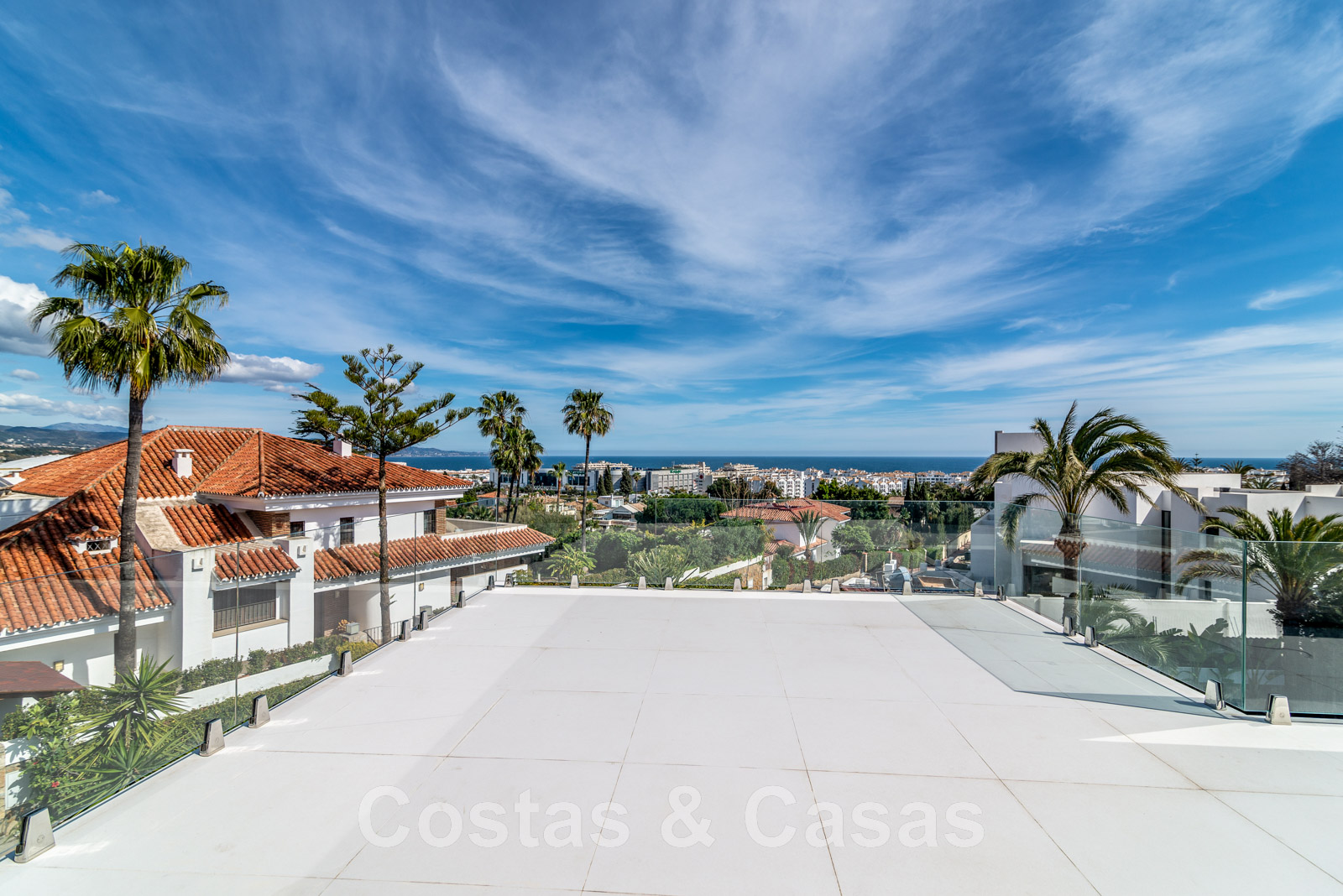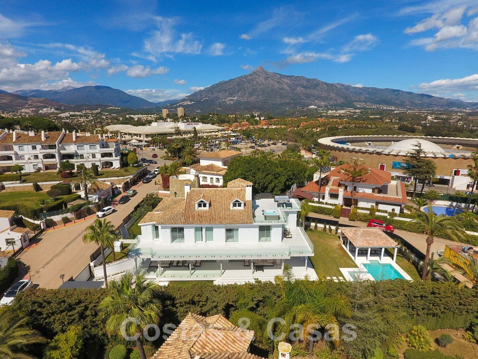 Parcela de esquina vallada con cipreses. Jardín tropical con palmeras maduras. Gran piscina con solárium. Pool house con una cocina al aire libre equipada con barbacoa, refrigerador de vino y un comedor. Amplias zonas exteriores con varias terrazas abiertas y cubiertas con zonas de relax. Intimidad gracias a las plantaciones altas. Vistas panorámicas desde la planta superior de la costa de Marbella hacia el continente africano y la pintoresca montaña de La Concha.