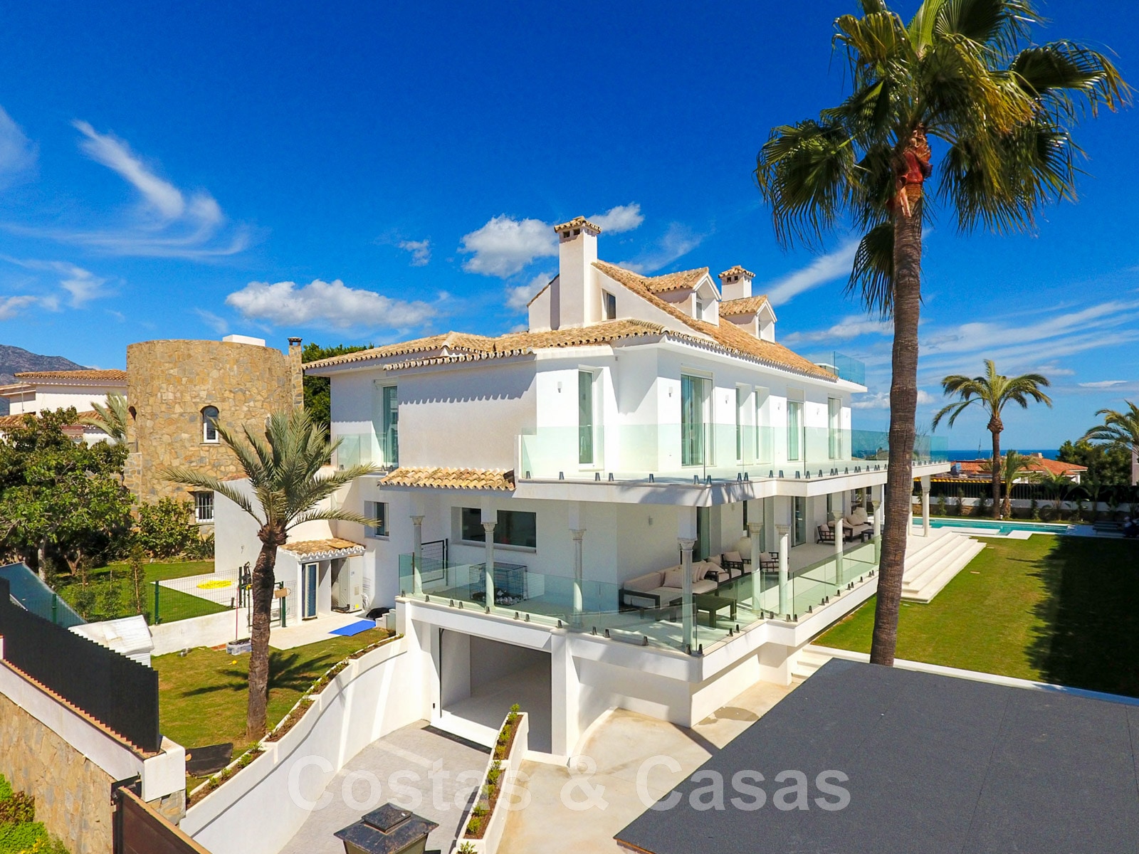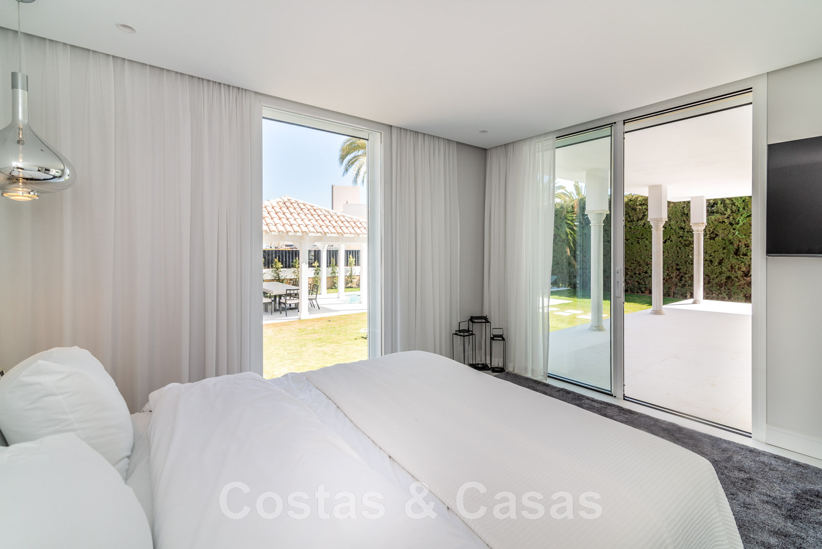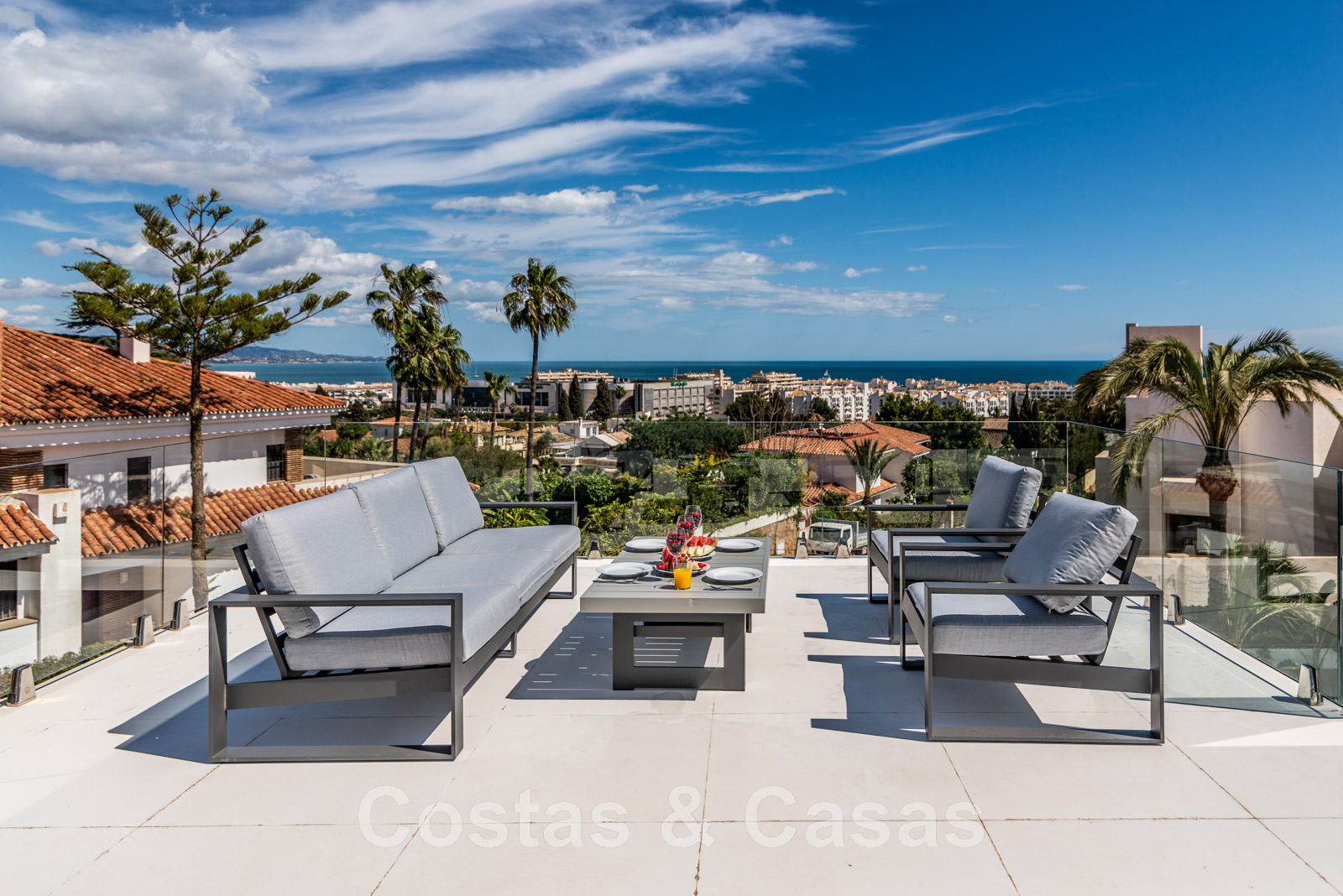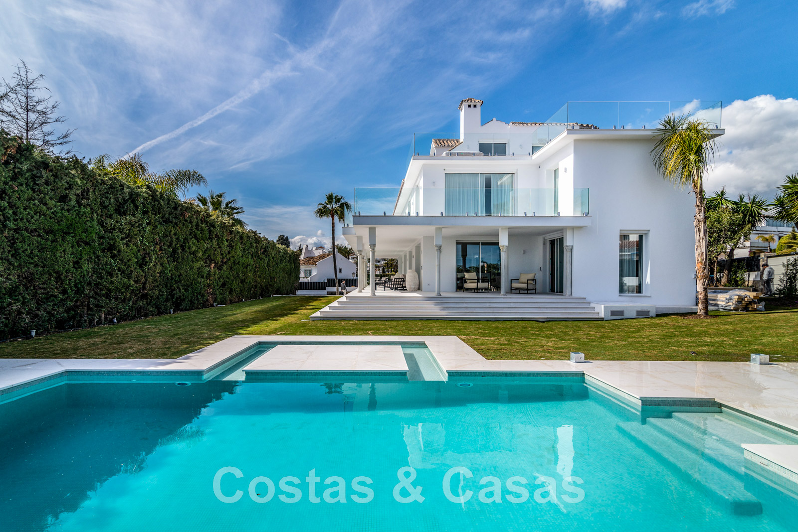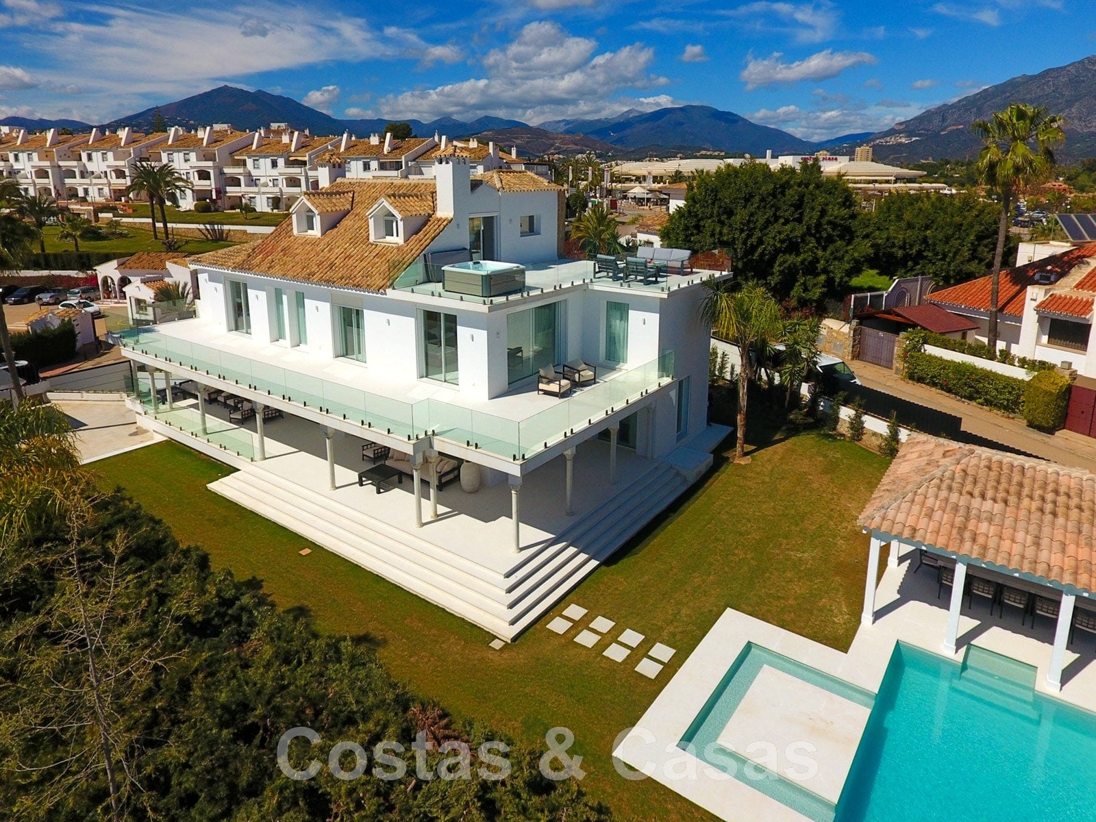 Parcela de esquina vallada con cipreses. Jardín tropical con palmeras maduras. Gran piscina con solárium. Pool house con una cocina al aire libre equipada con barbacoa, refrigerador de vino y un comedor. Amplias zonas exteriores con varias terrazas abiertas y cubiertas con zonas de relax. Intimidad gracias a las plantaciones altas. Vistas panorámicas desde la planta superior de la costa de Marbella hacia el continente africano y la pintoresca montaña de La Concha.