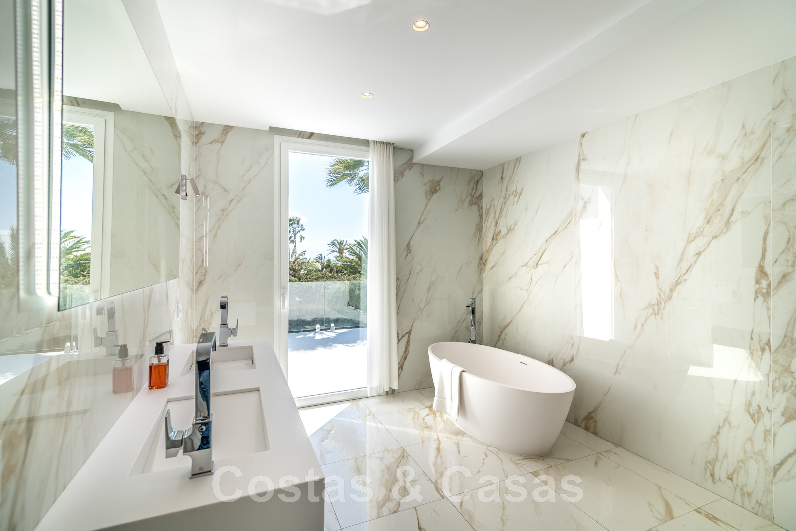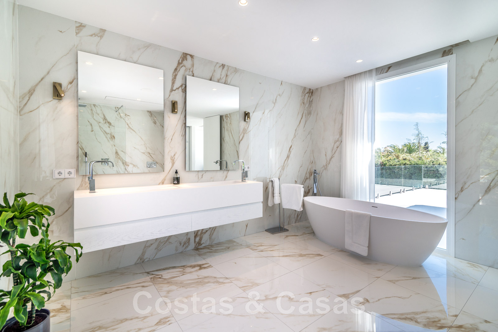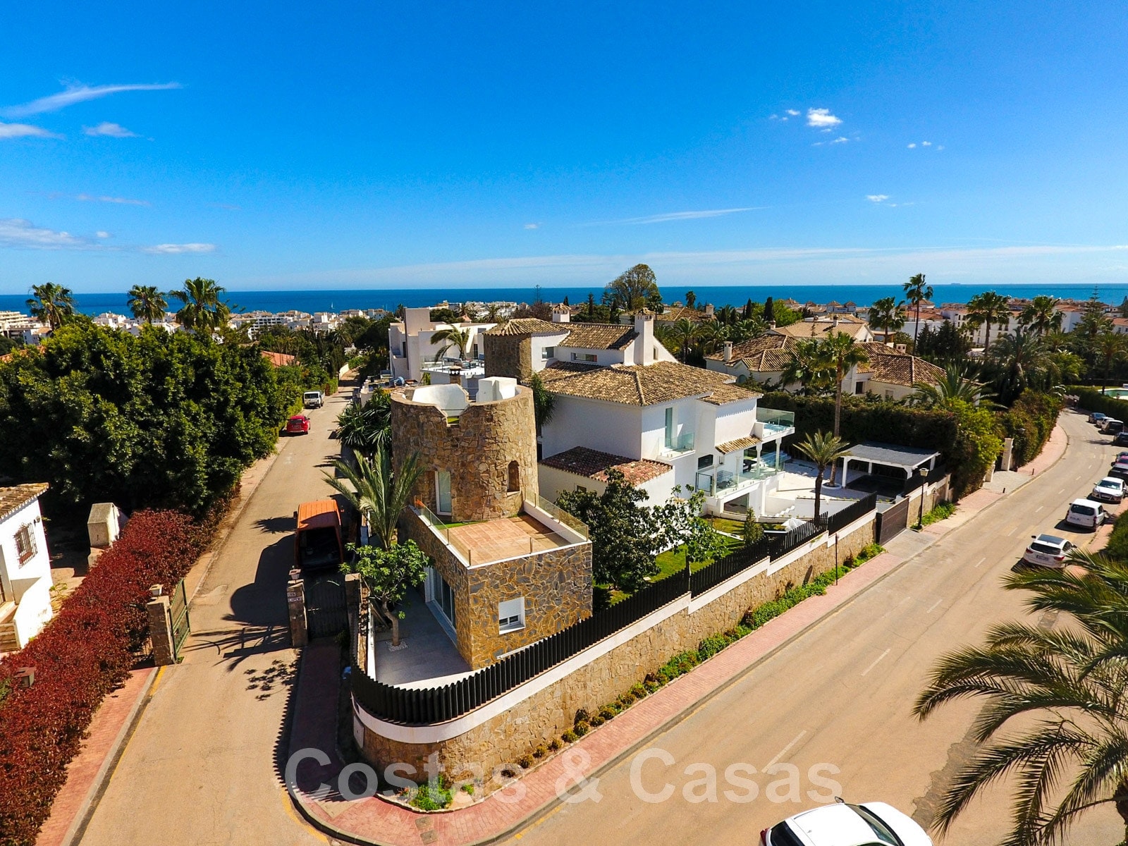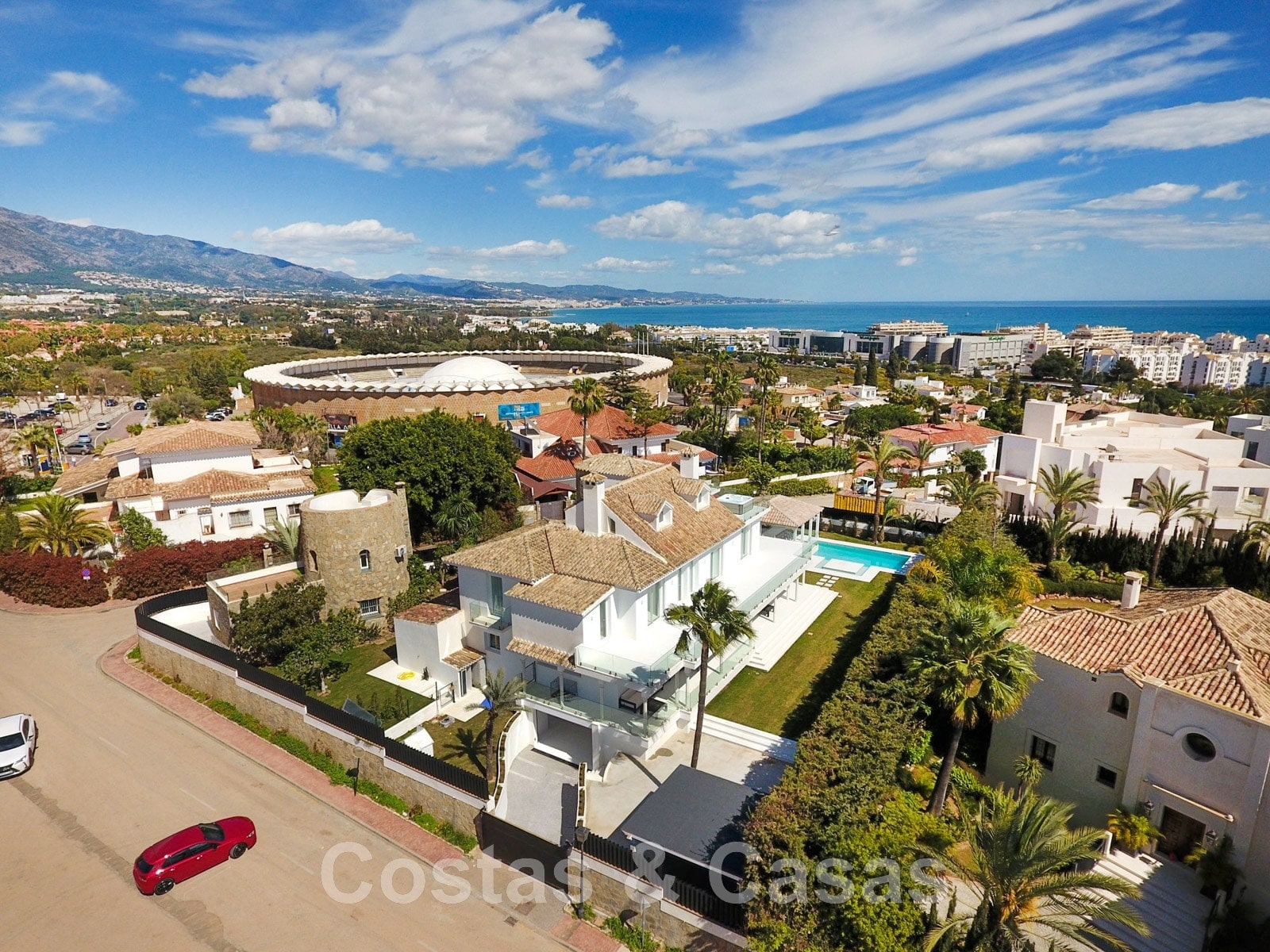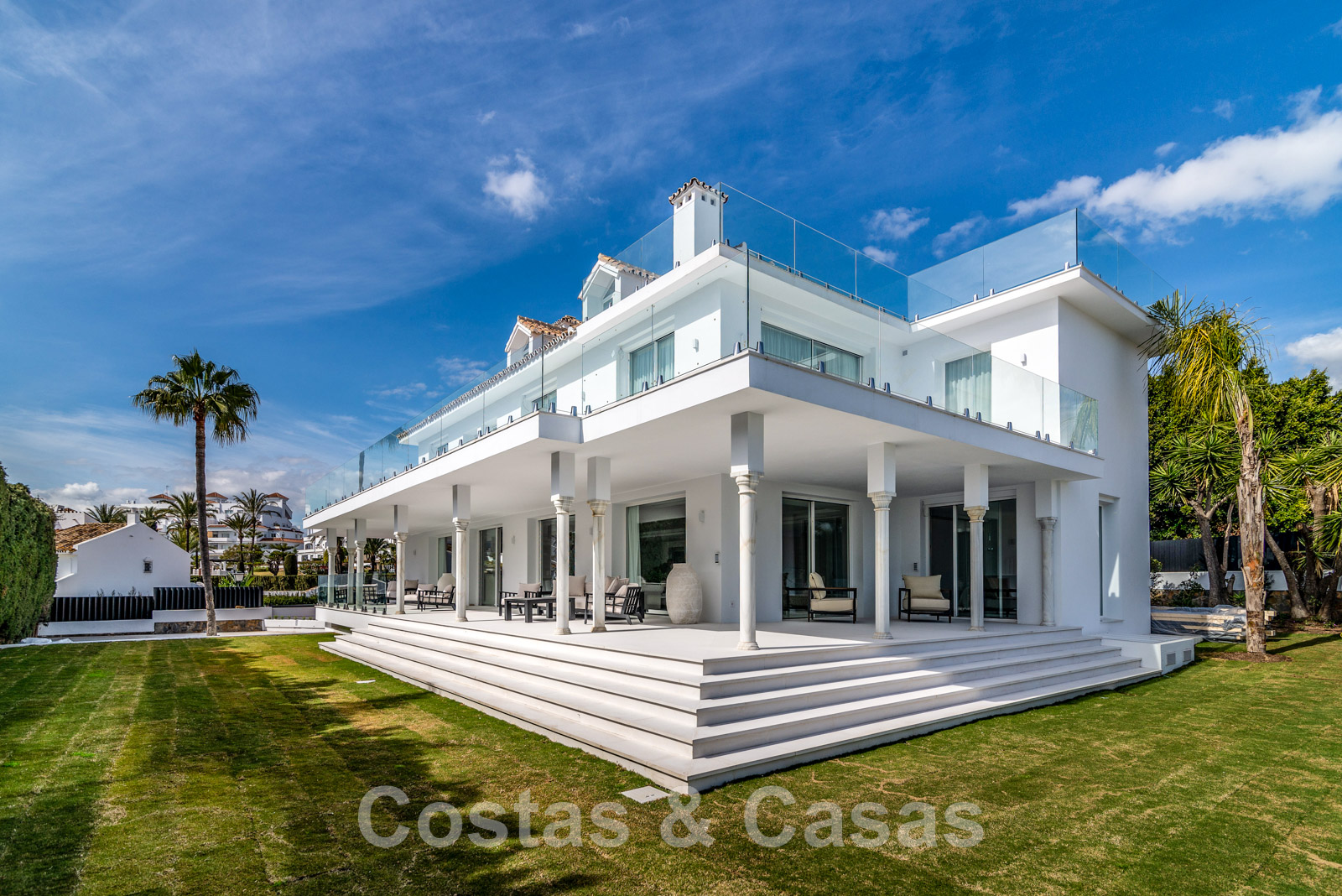 Parcela de esquina vallada con cipreses. Jardín tropical con palmeras maduras. Gran piscina con solárium. Pool house con una cocina al aire libre equipada con barbacoa, refrigerador de vino y un comedor. Amplias zonas exteriores con varias terrazas abiertas y cubiertas con zonas de relax. Intimidad gracias a las plantaciones altas. Vistas panorámicas desde la planta superior de la costa de Marbella hacia el continente africano y la pintoresca montaña de La Concha.