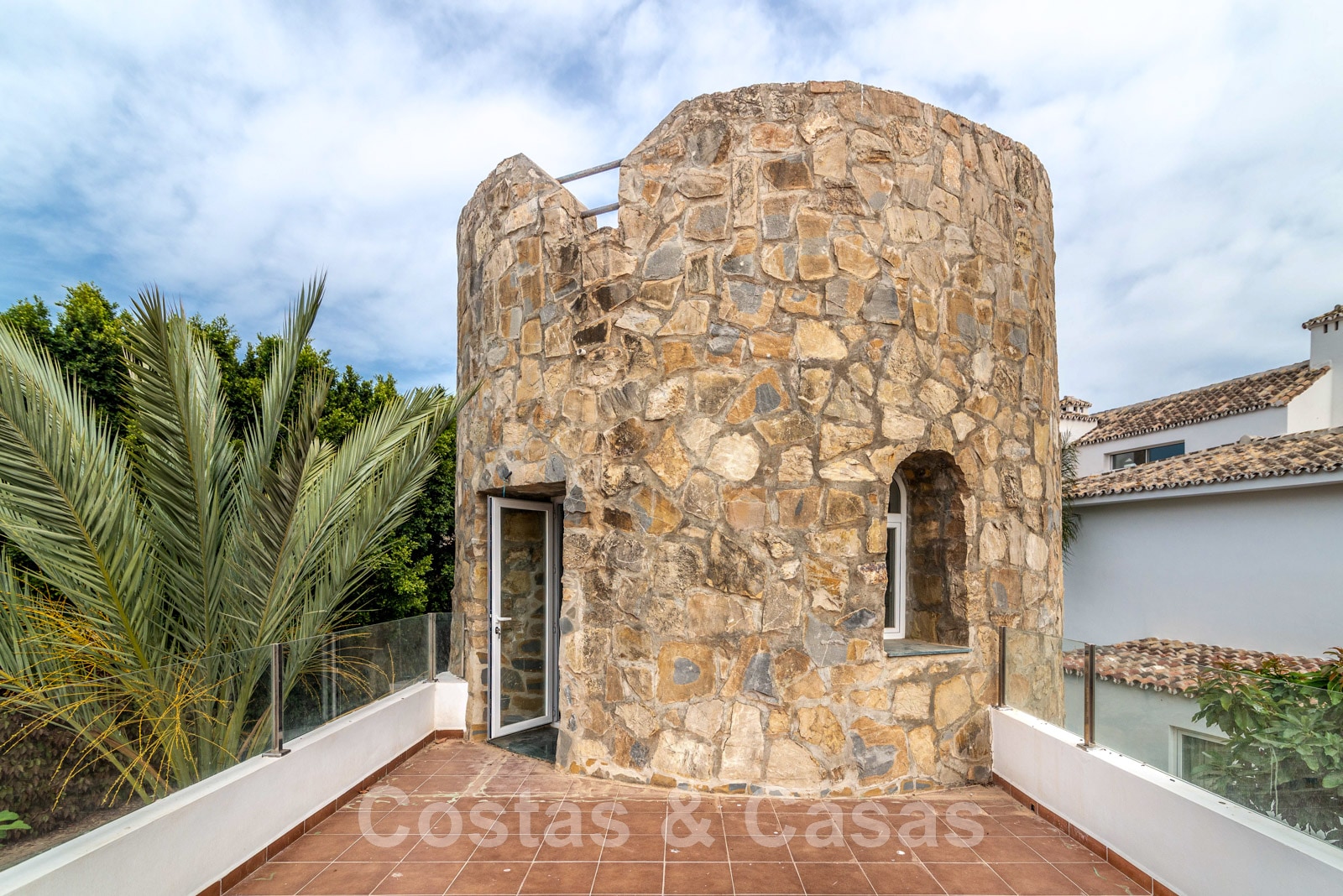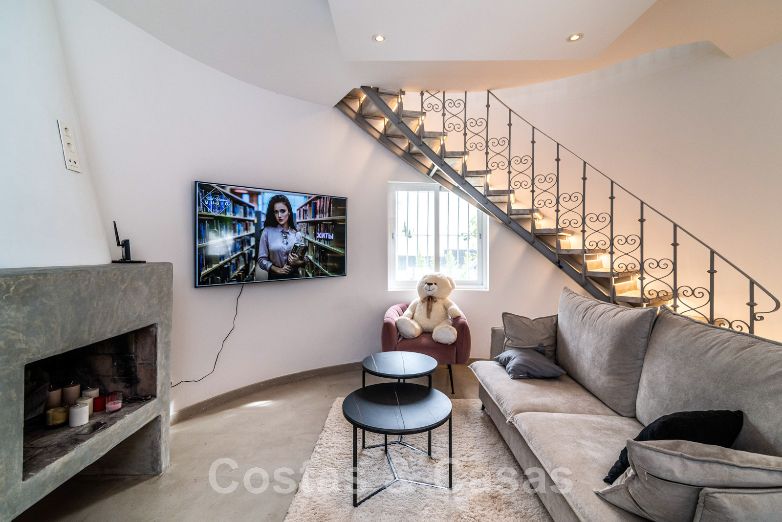 2 plantas. Patio. Salón de TV en la planta baja con chimenea y baño. Escaleras ornamentadas que conducen a la planta superior. Dormitorio con acceso a una terraza abierta.