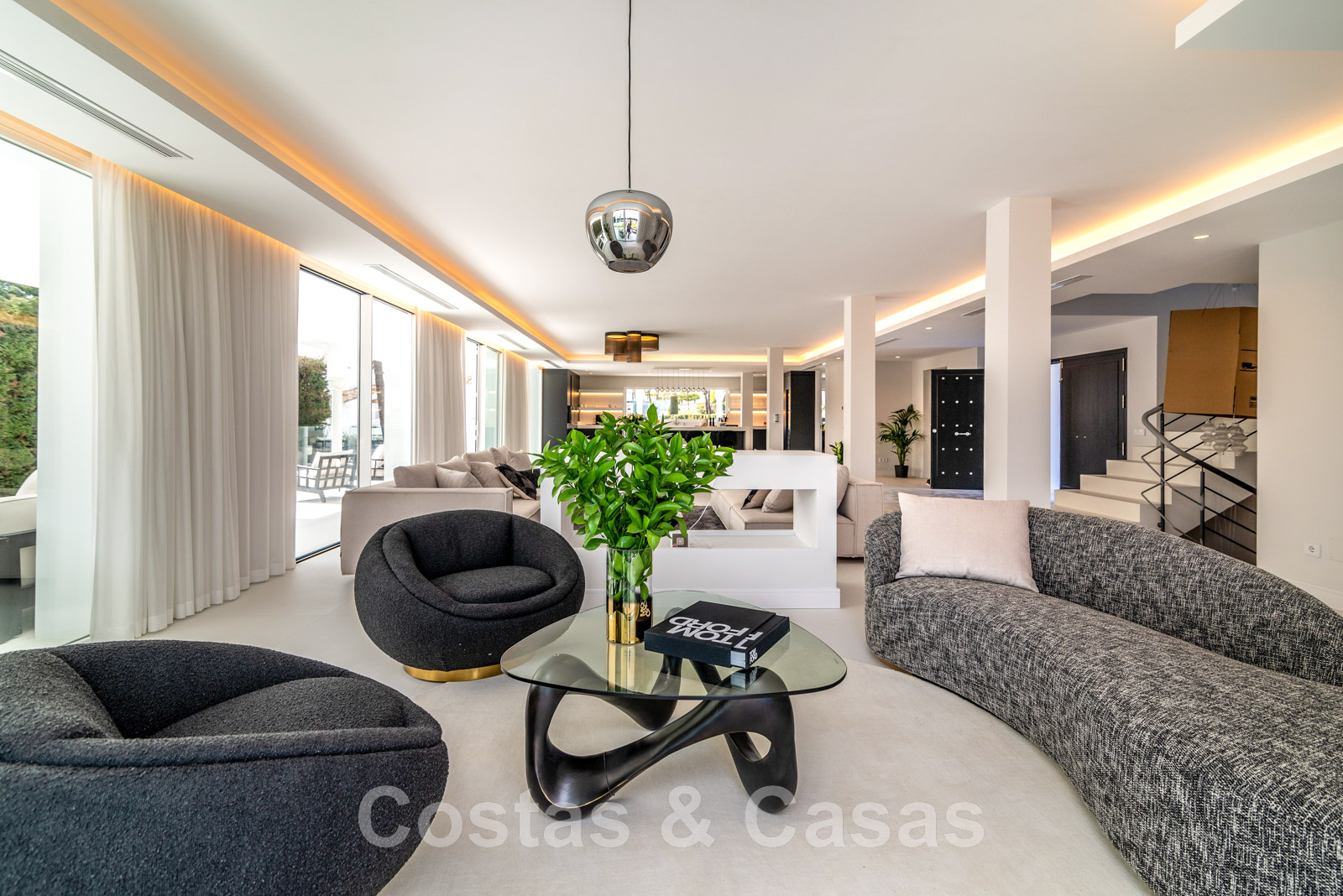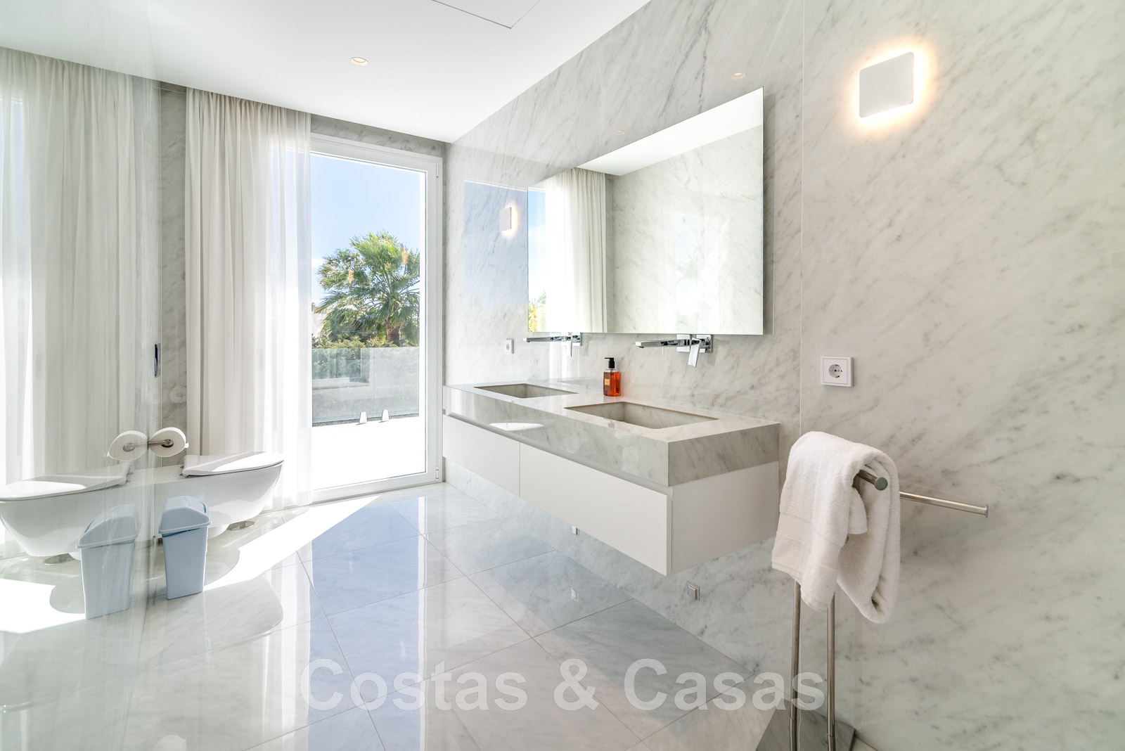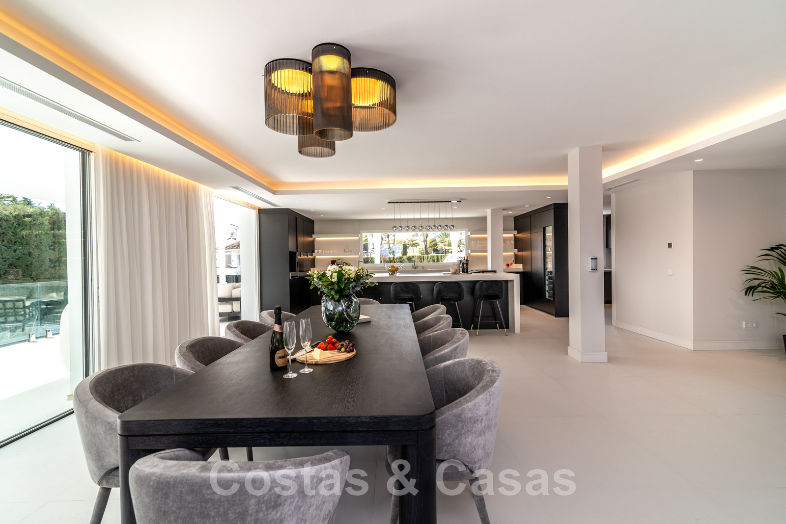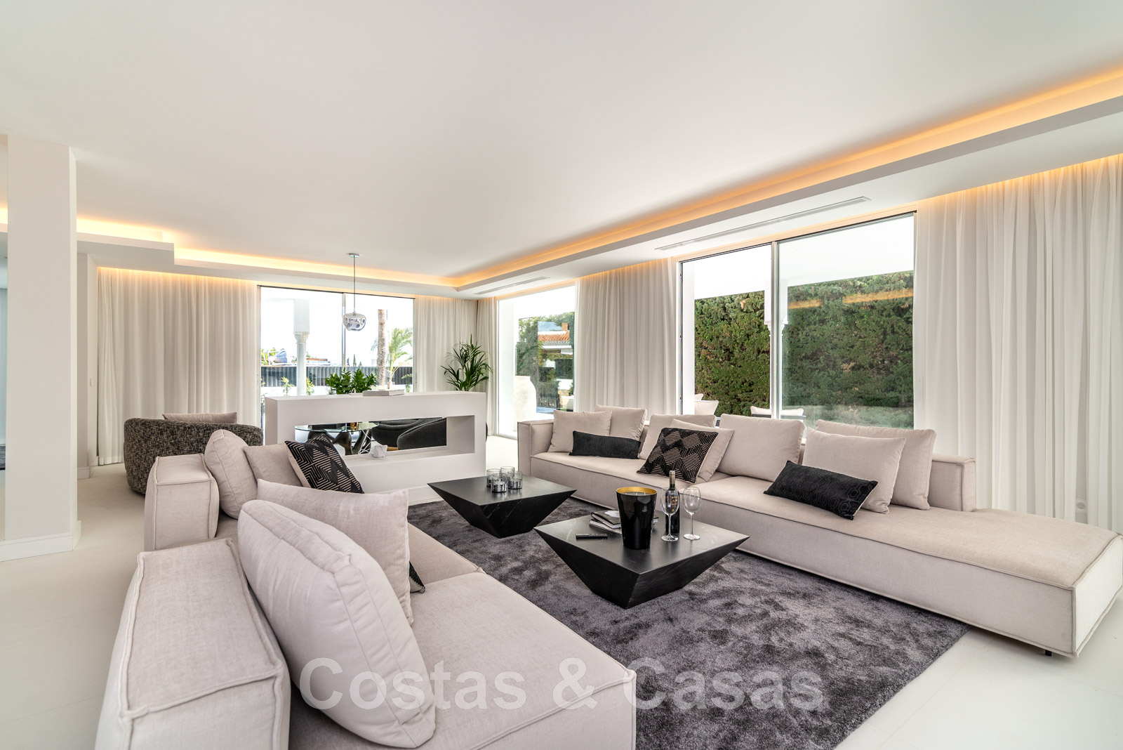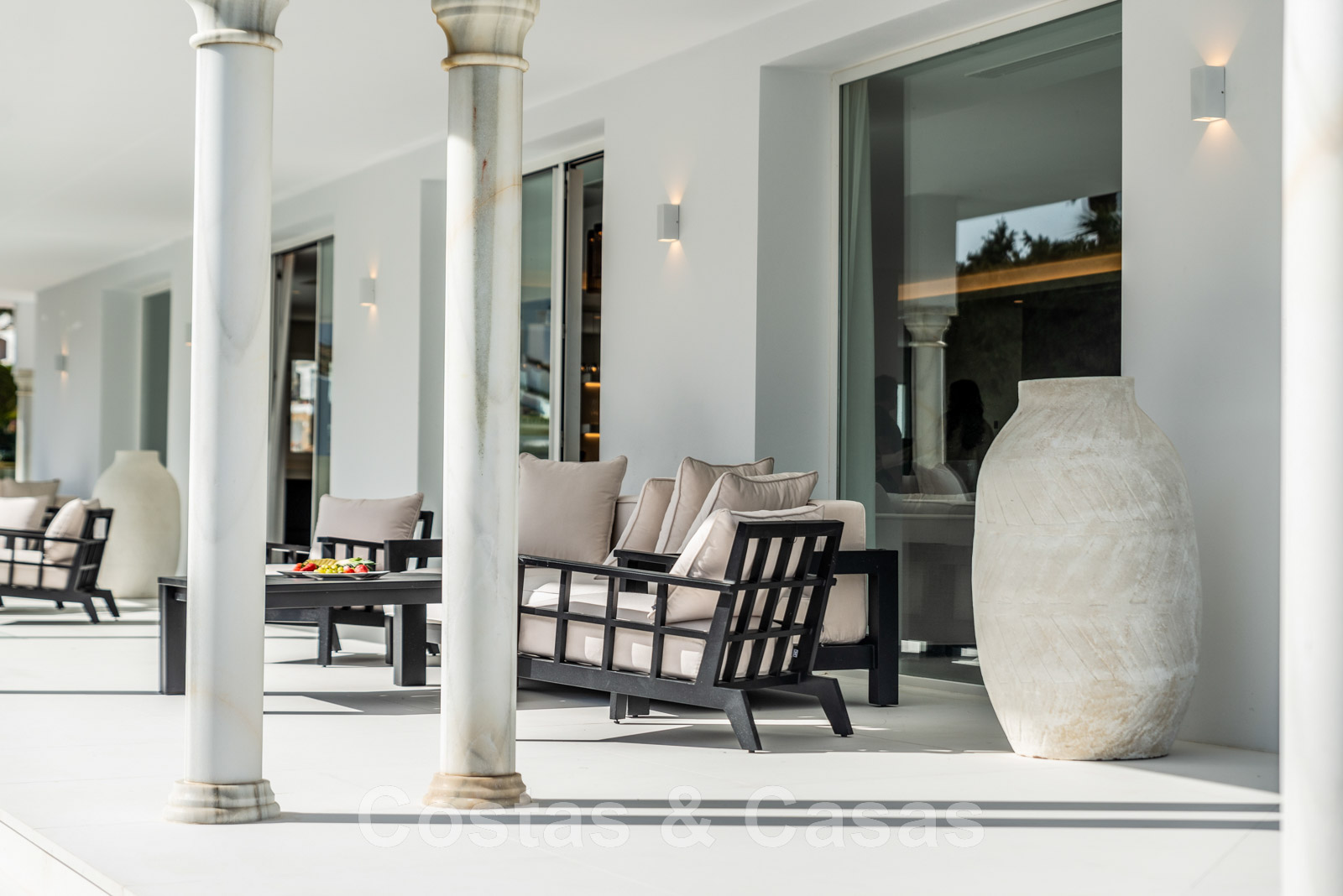 Villa independiente, de estilo moderno y andaluz. La villa está muy bien equipada con un ojo para el diseño. Interior muy elegante y contemporáneo. Un portón eléctrico da acceso al garaje interior. Aparcamiento para 8 coches. La villa cuenta con ventanas correderas de gran altura que ofrecen mucha luz y una transición perfecta entre el interior y el exterior. Suelos de baldosas de color crema.