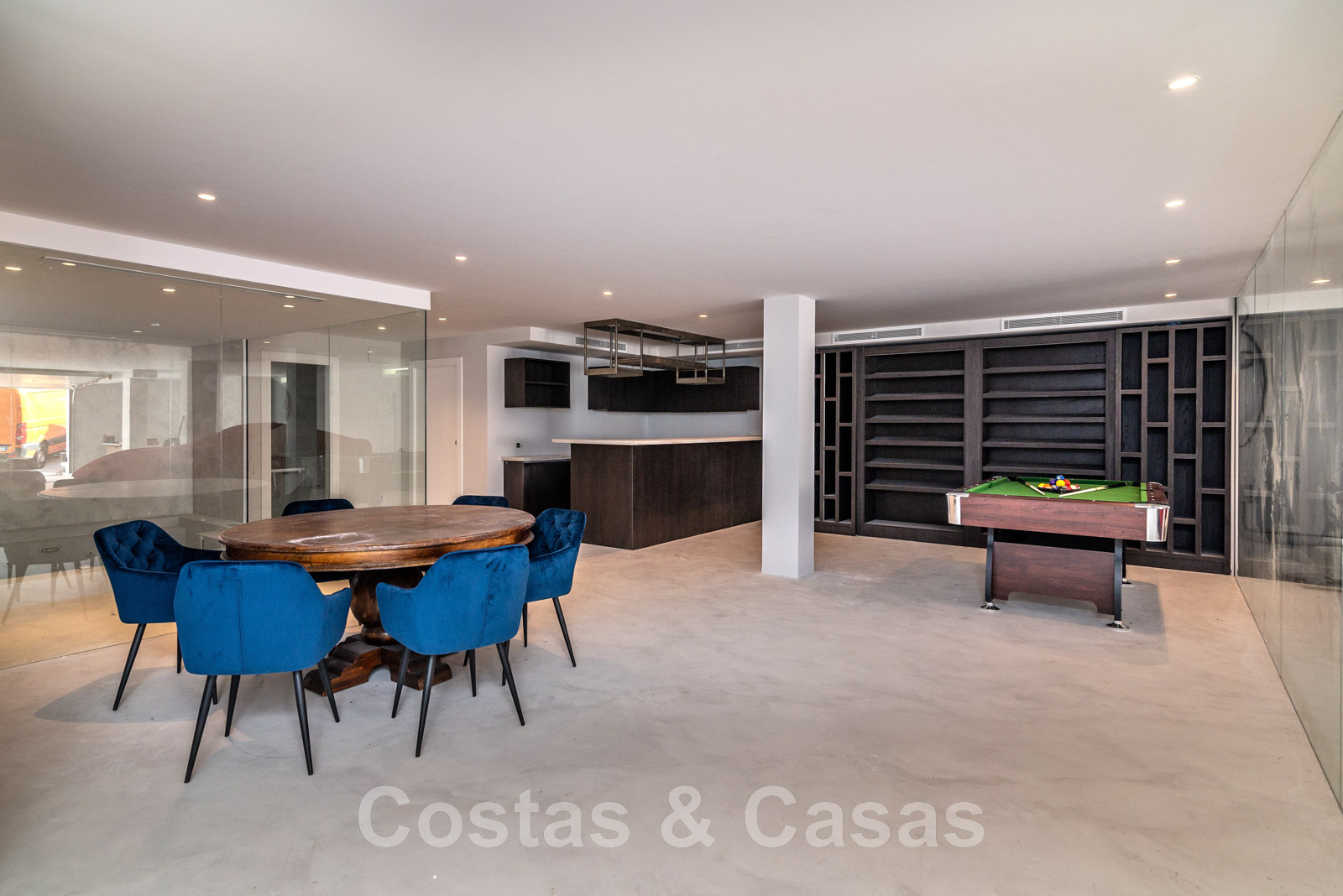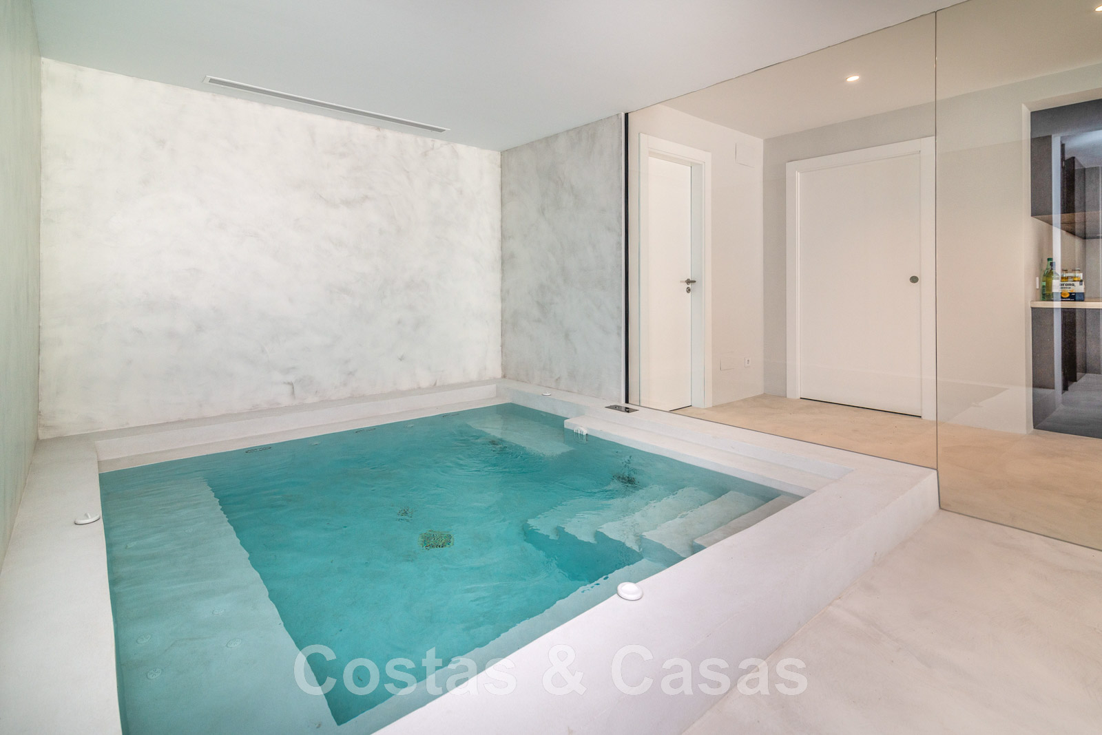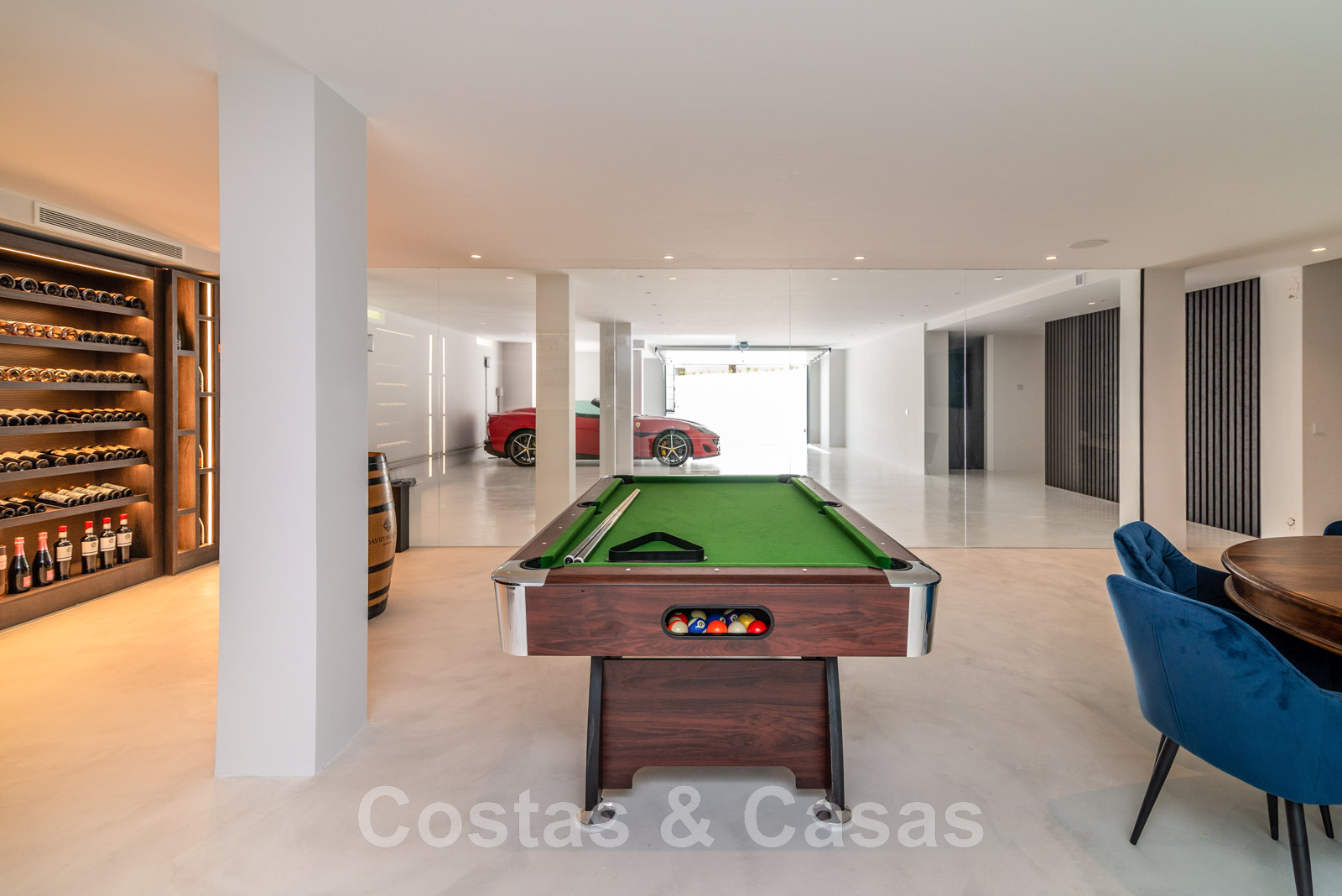 Planta inferior Spa con piscina cubierta climatizada/jacuzzi y sauna. Sala con mesa de billar, bar y bodega integrada. Cine en casa en estilo loft. Dormitorio de invitados. Garaje interior para 5 coches. Aparcamiento para 8 coches.