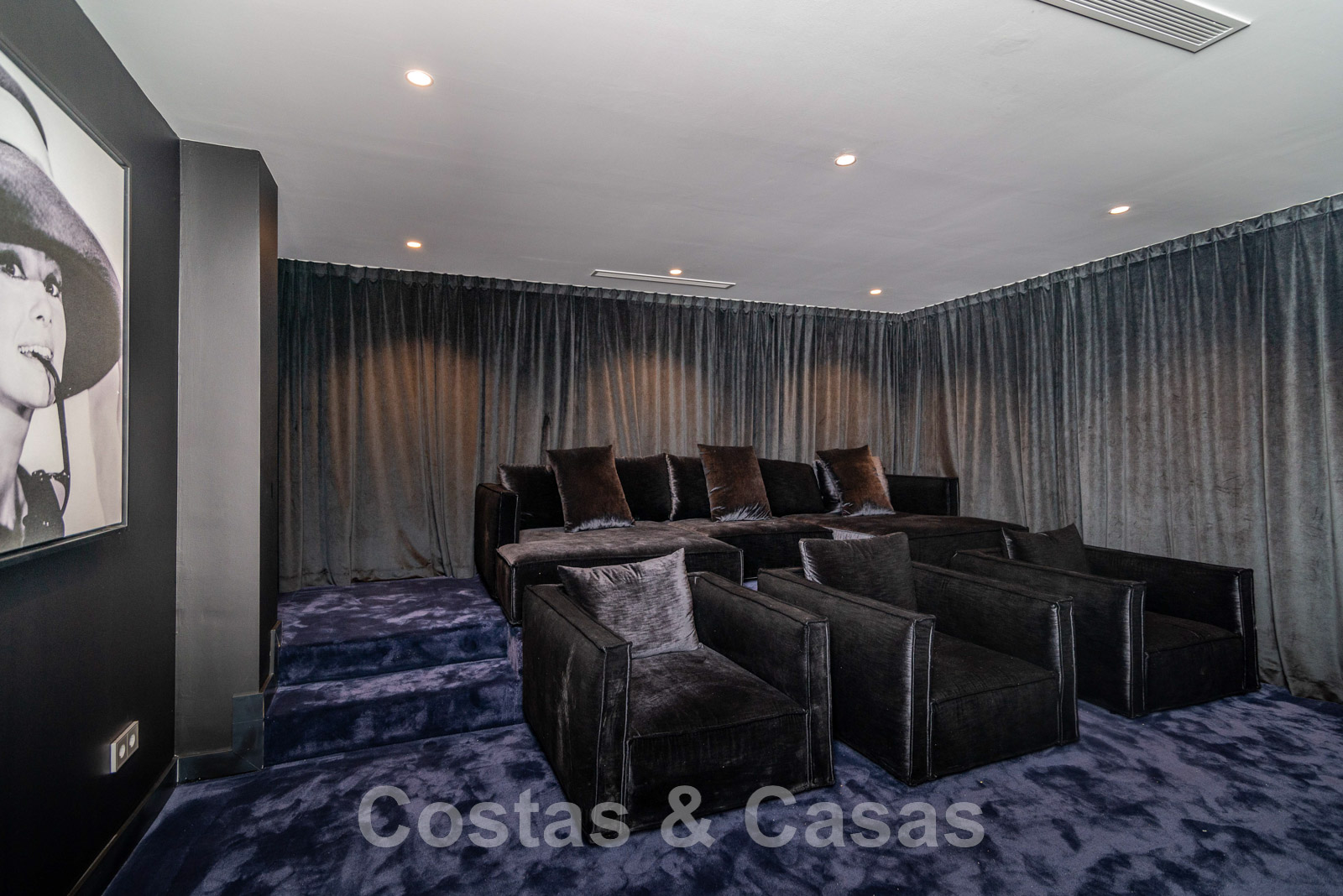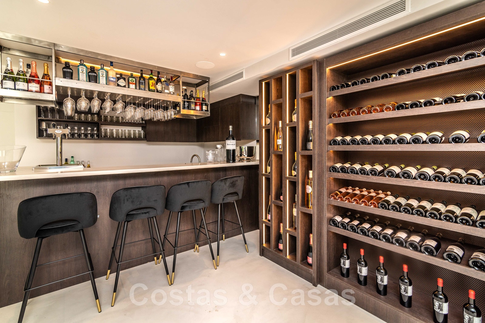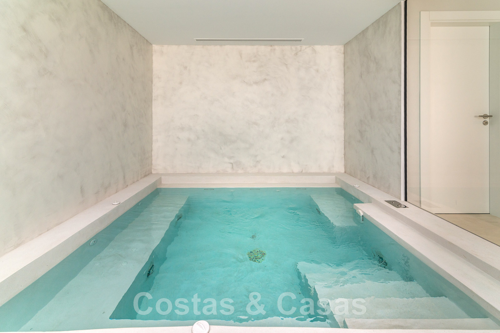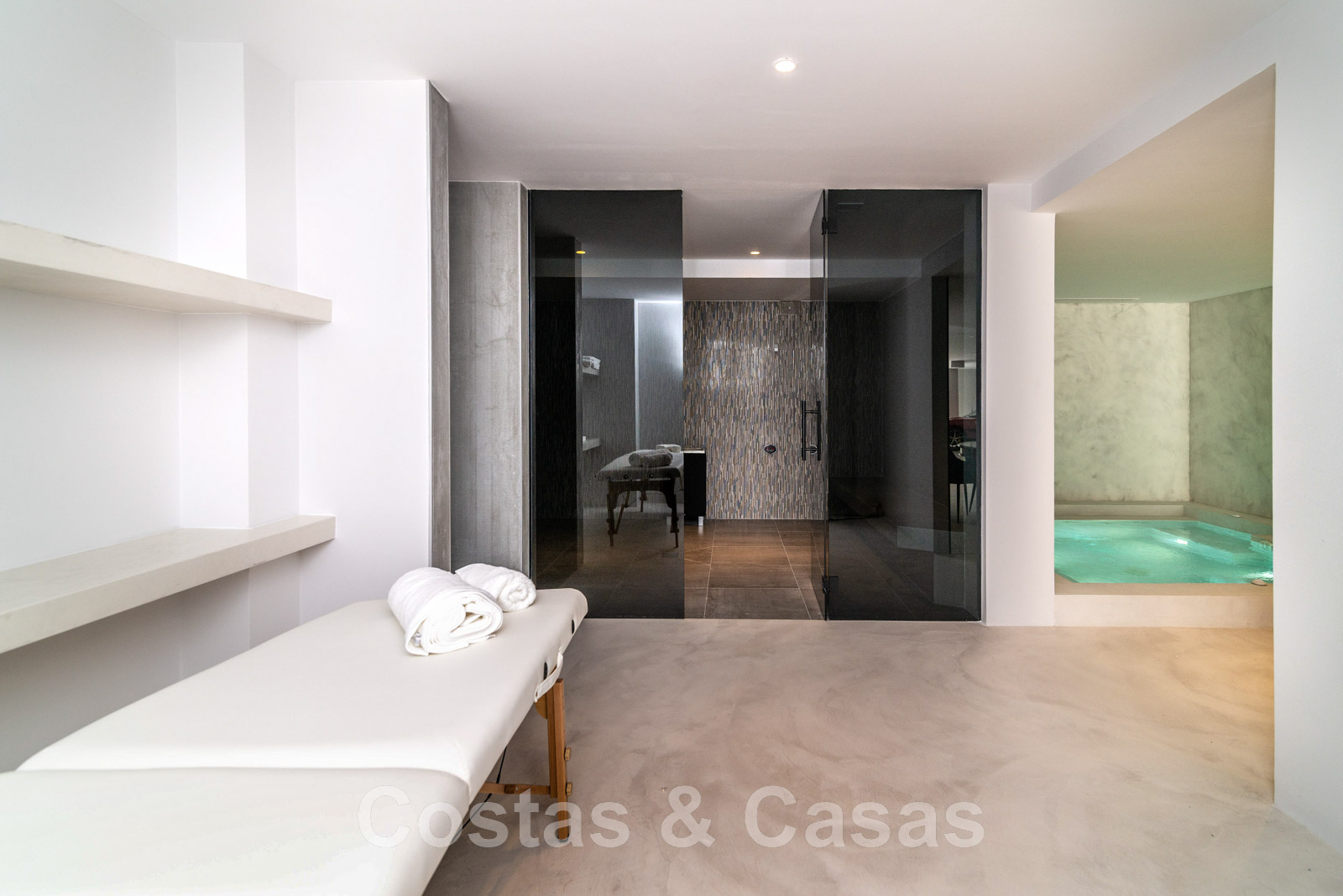 Planta inferior Spa con piscina cubierta climatizada/jacuzzi y sauna. Sala con mesa de billar, bar y bodega integrada. Cine en casa en estilo loft. Dormitorio de invitados. Garaje interior para 5 coches. Aparcamiento para 8 coches.