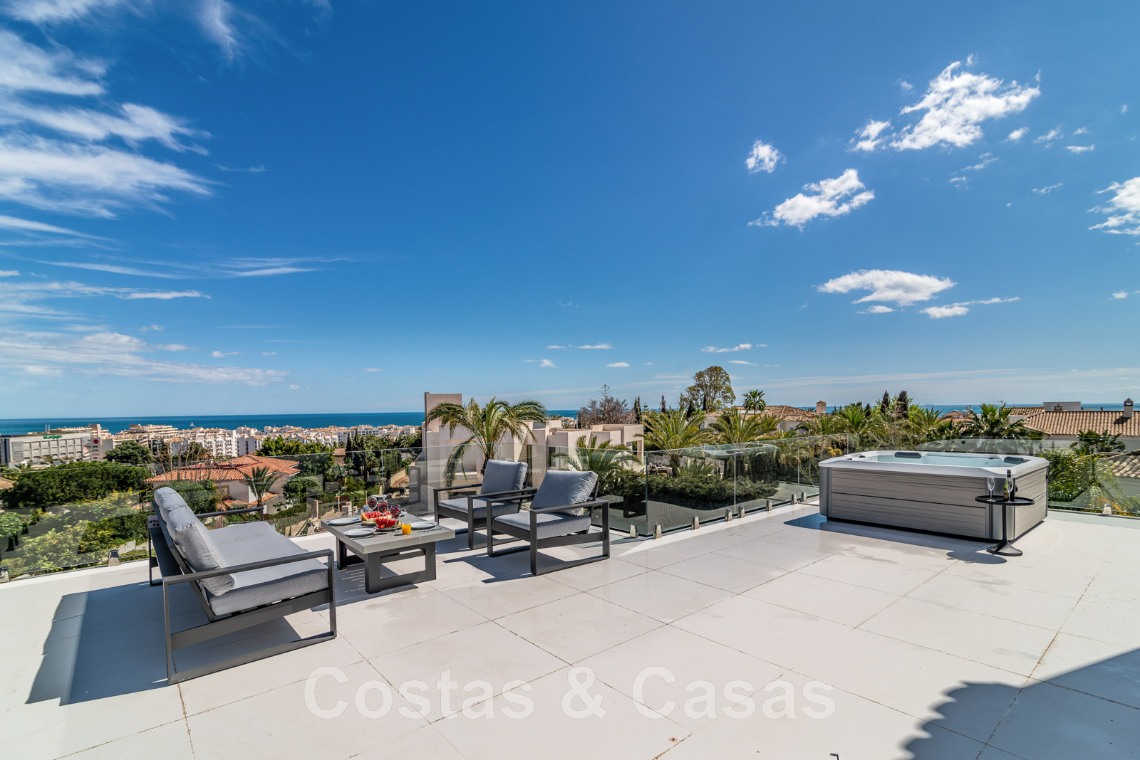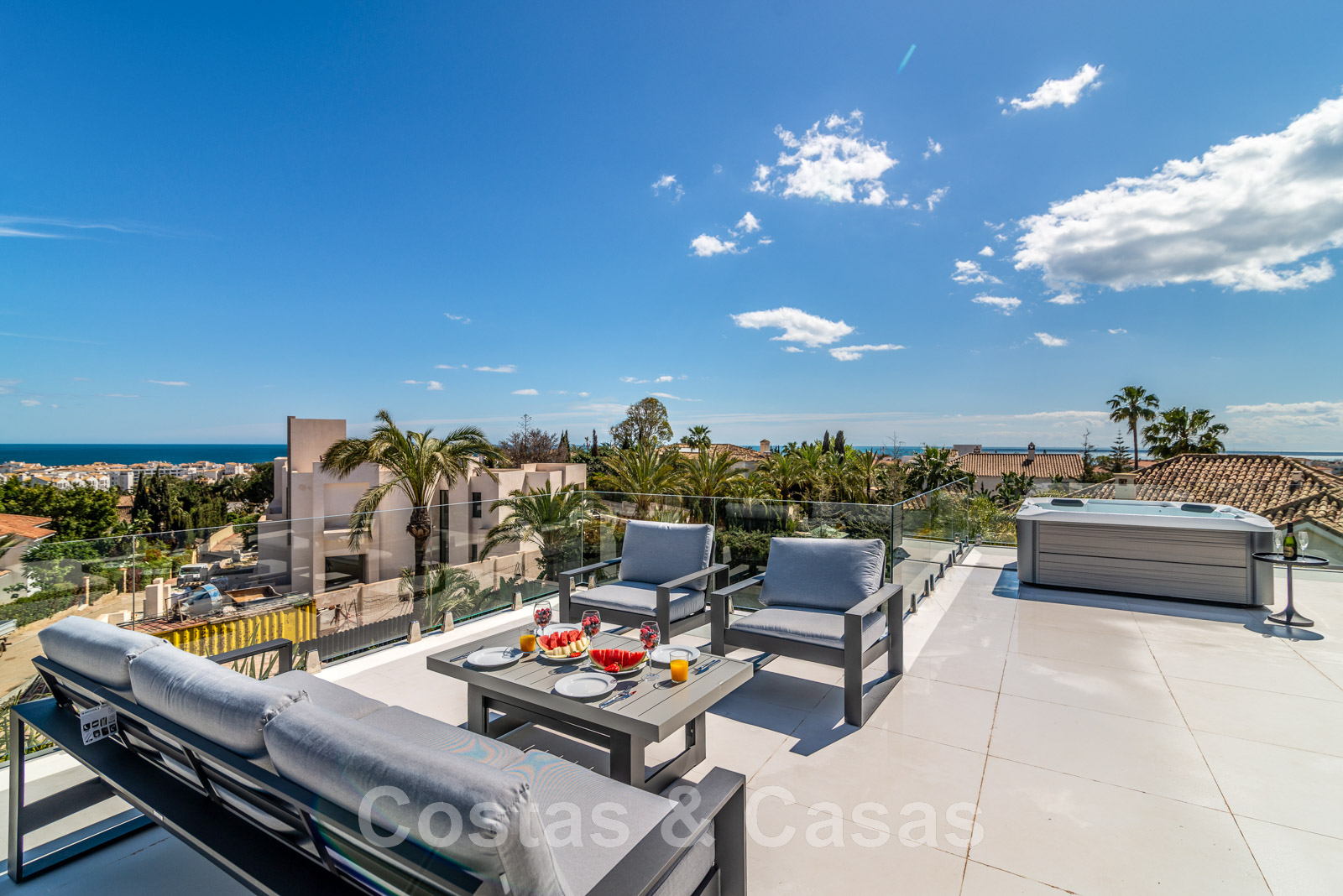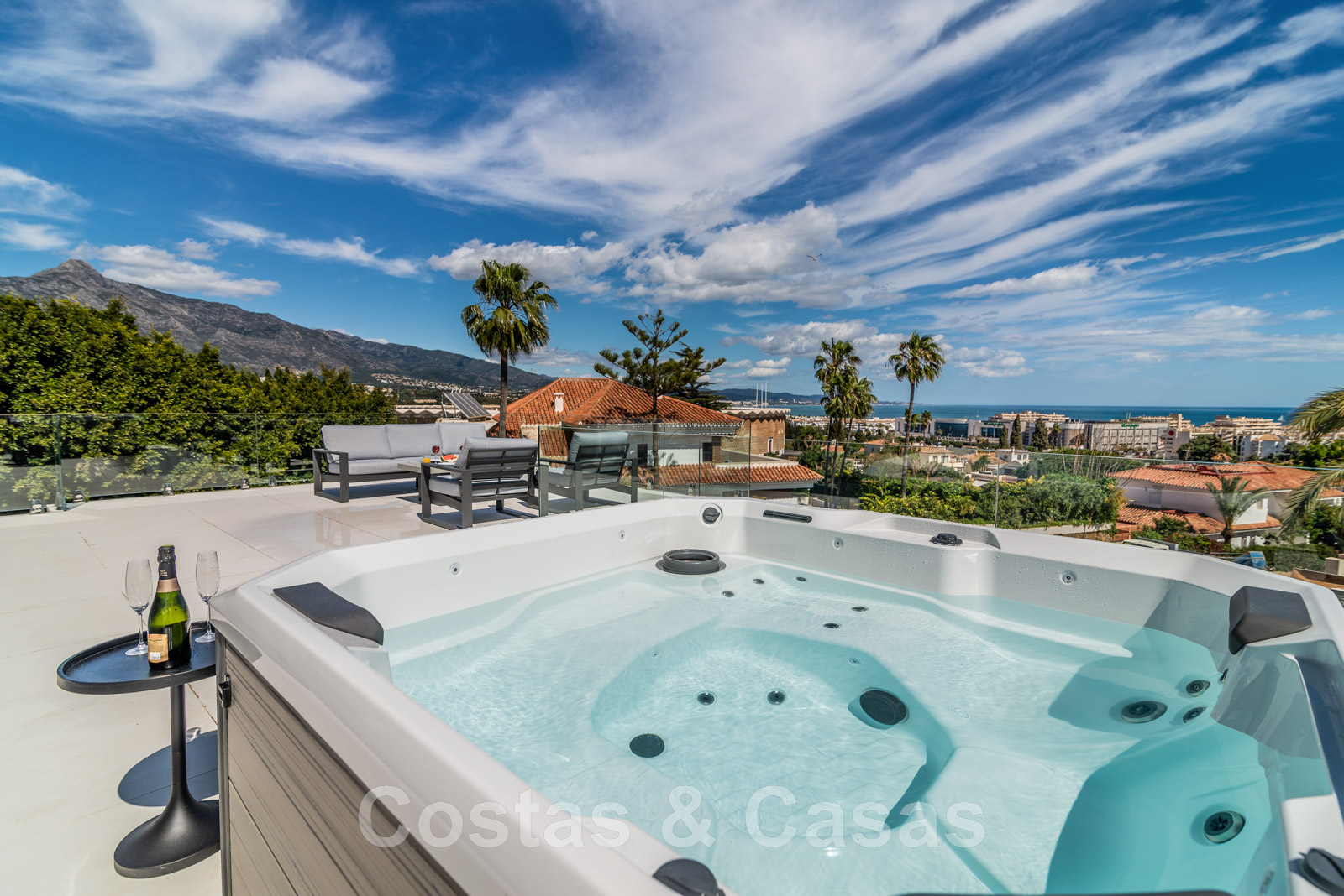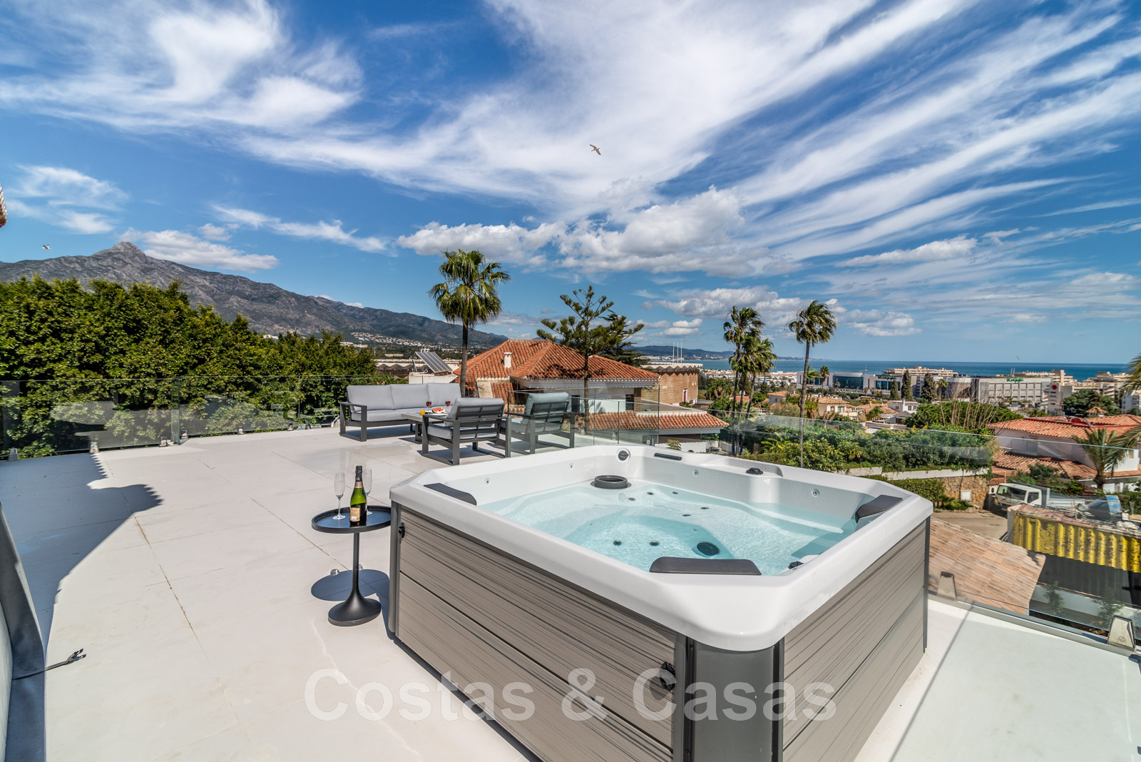 Solárium con jacuzzi y vistas de 180º a la montaña y al mar.