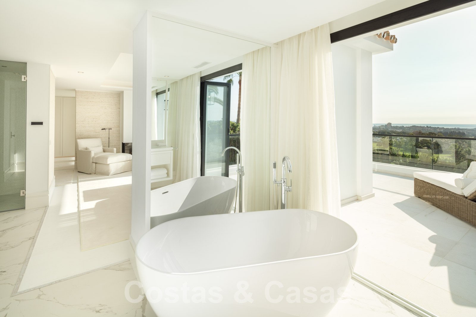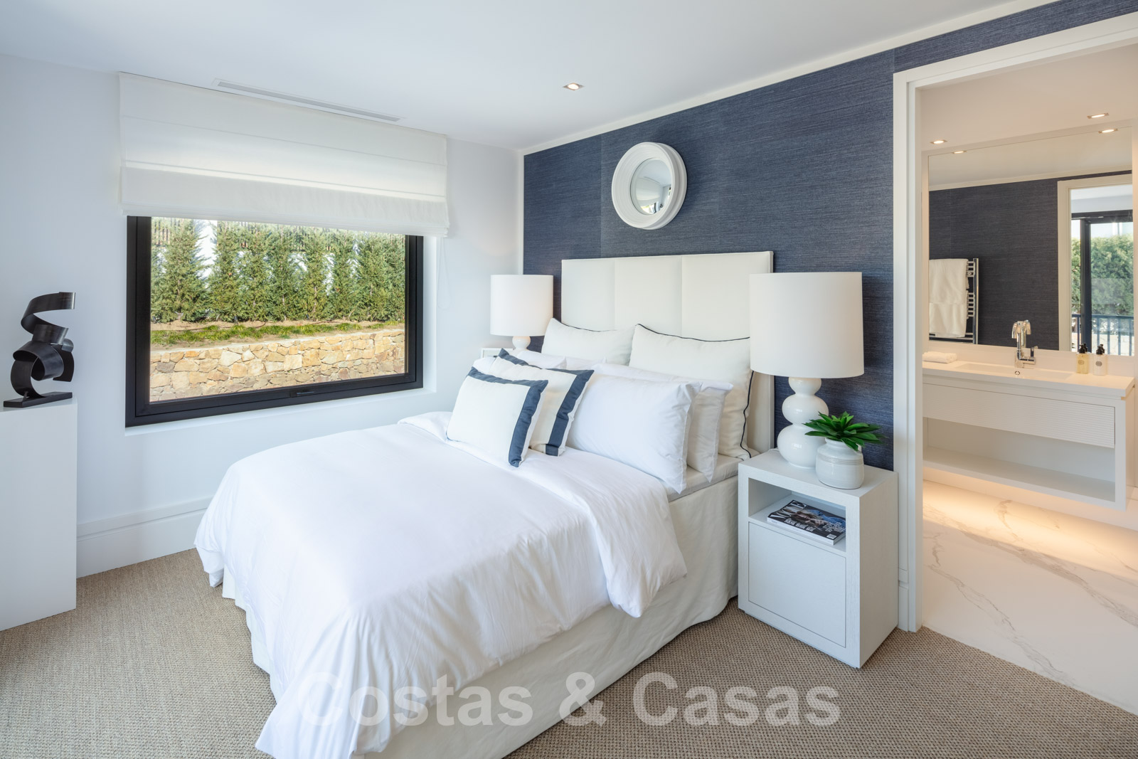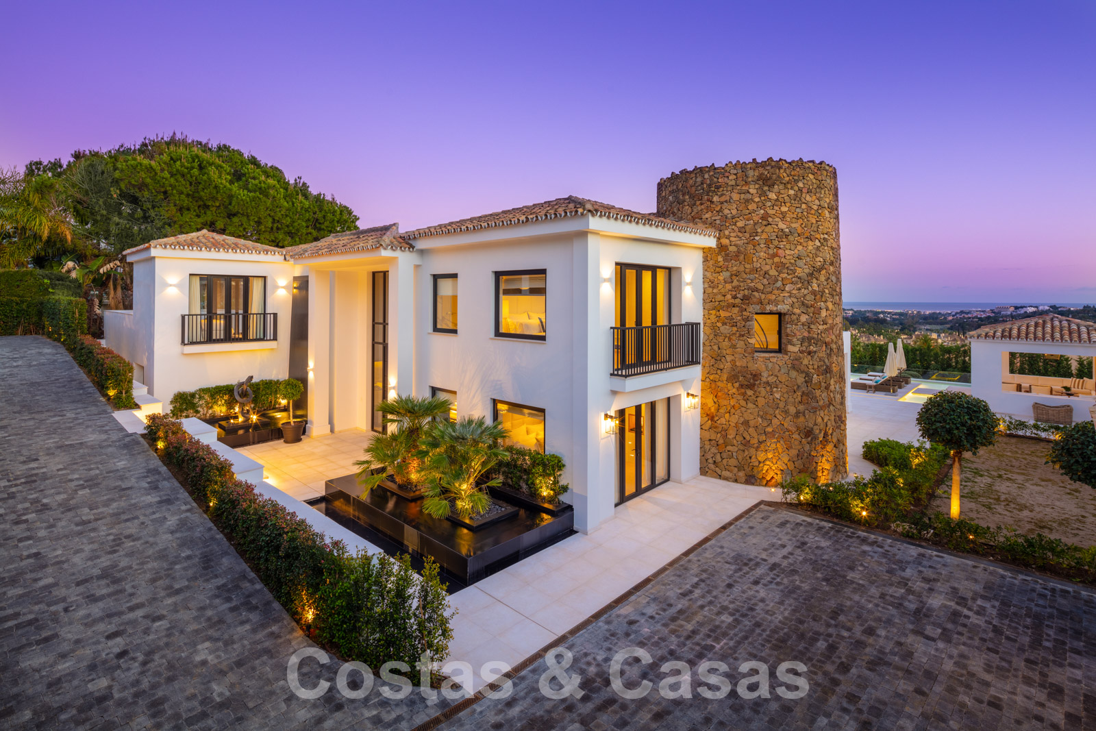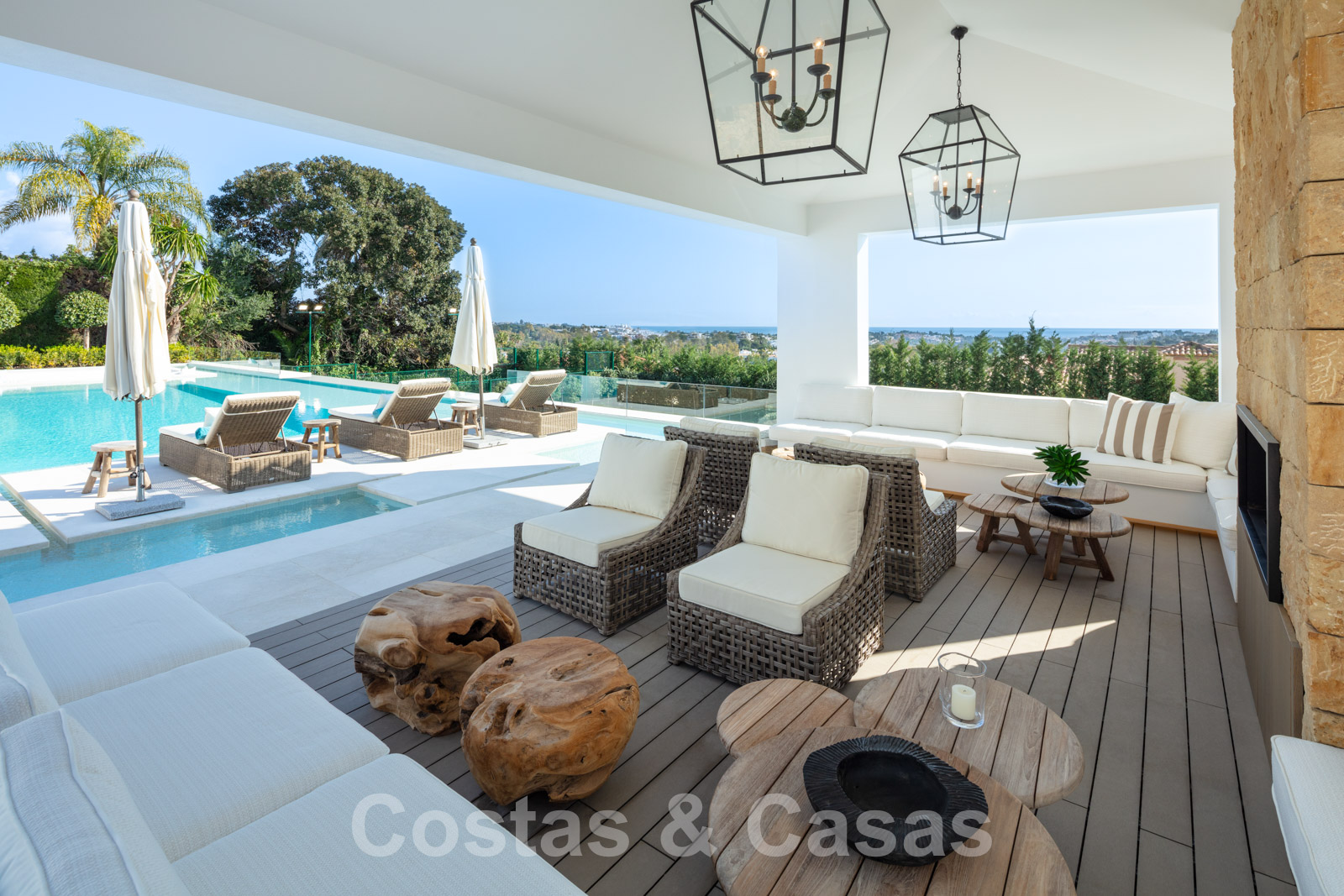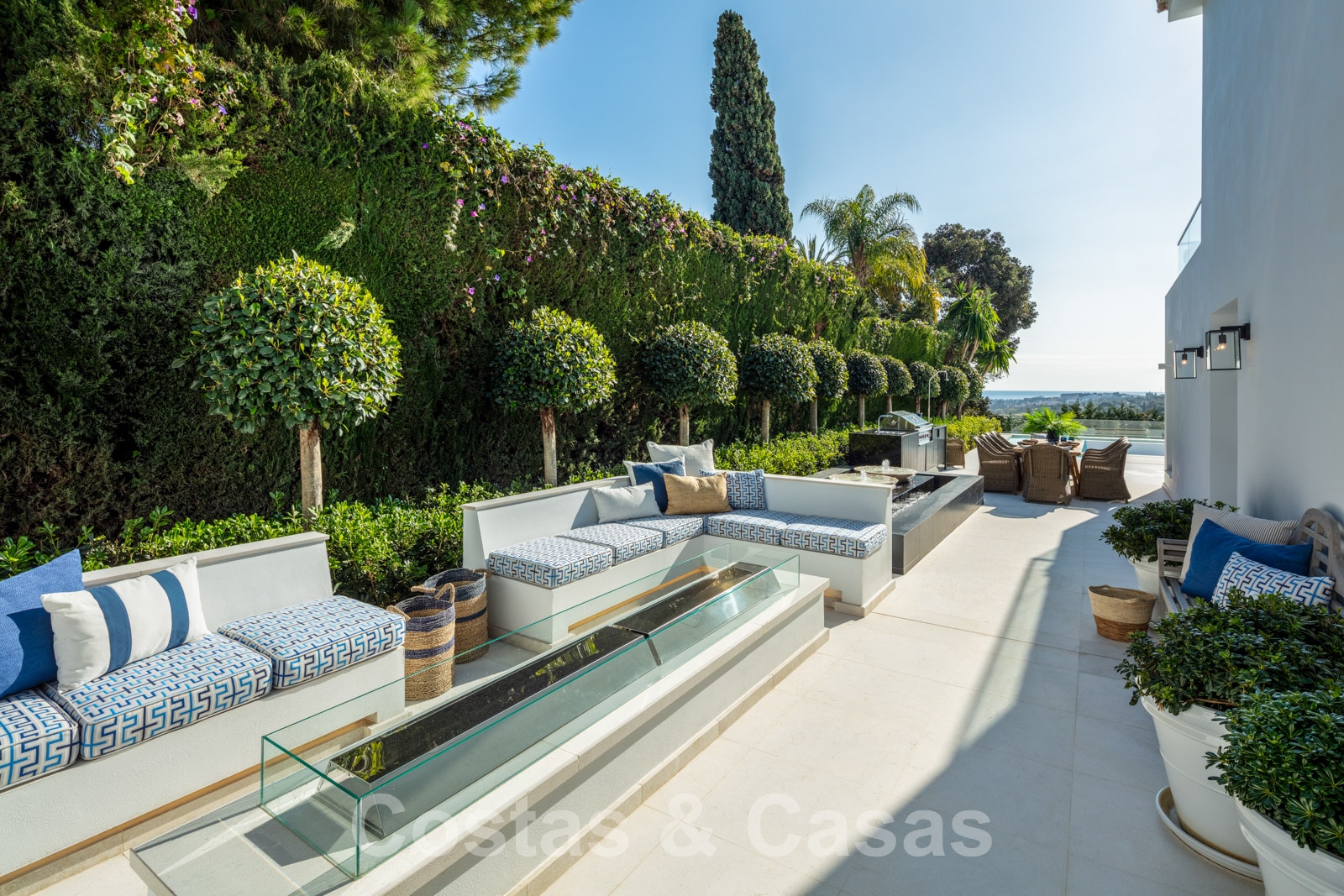 La amplia parcela consta de 2 niveles conectados por una escalera de jardín. El nivel inferior cuenta con un hermoso jardín ornamental con varias zonas de relax, una pista de padel privada y una isla de cocina exterior donde sentarse. Con una exuberante vegetación que rodea la parcela, la villa goza de absoluta privacidad. Orientación sureste con vistas panorámicas al mar. Arquitectura mediterránea con elementos modernos.