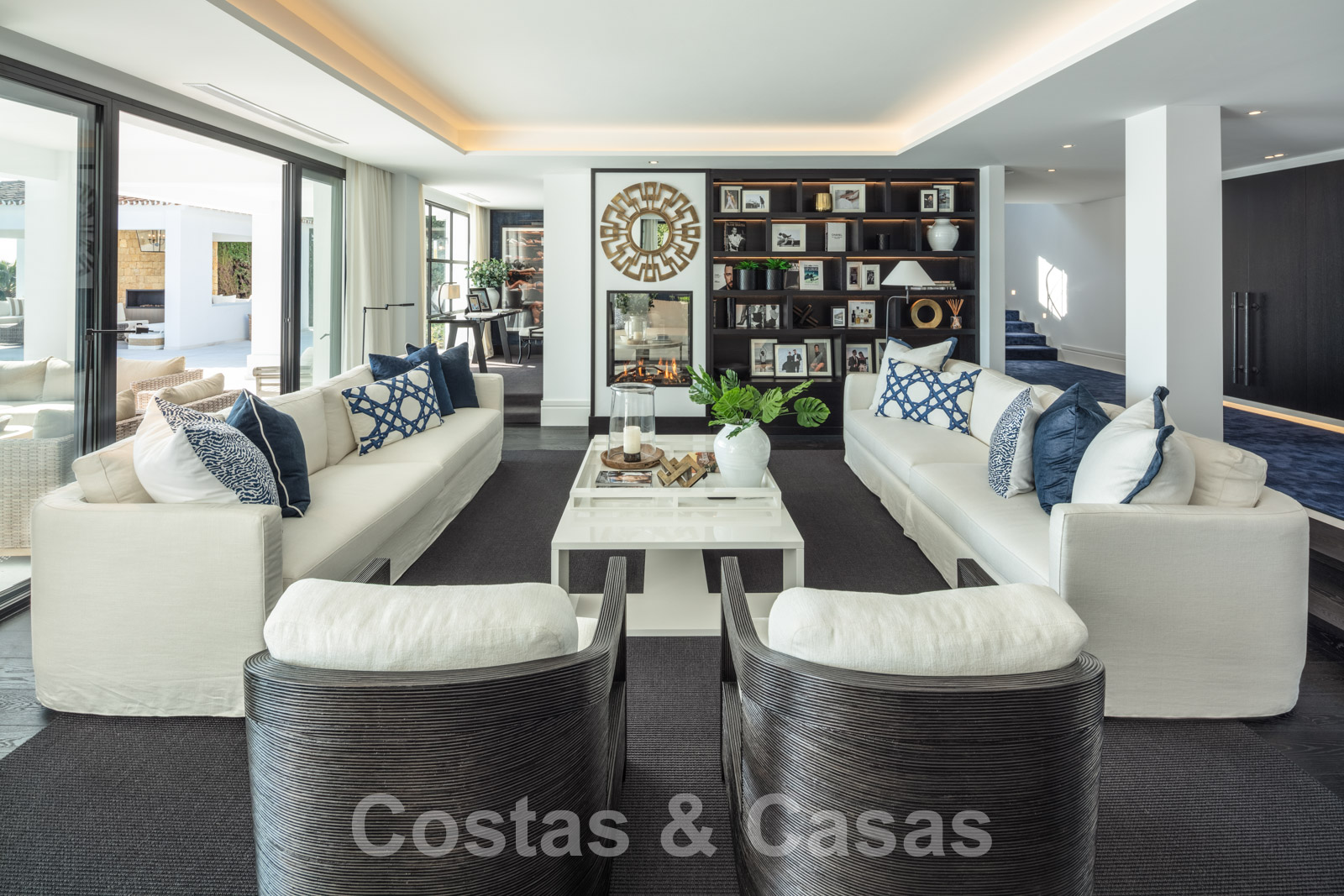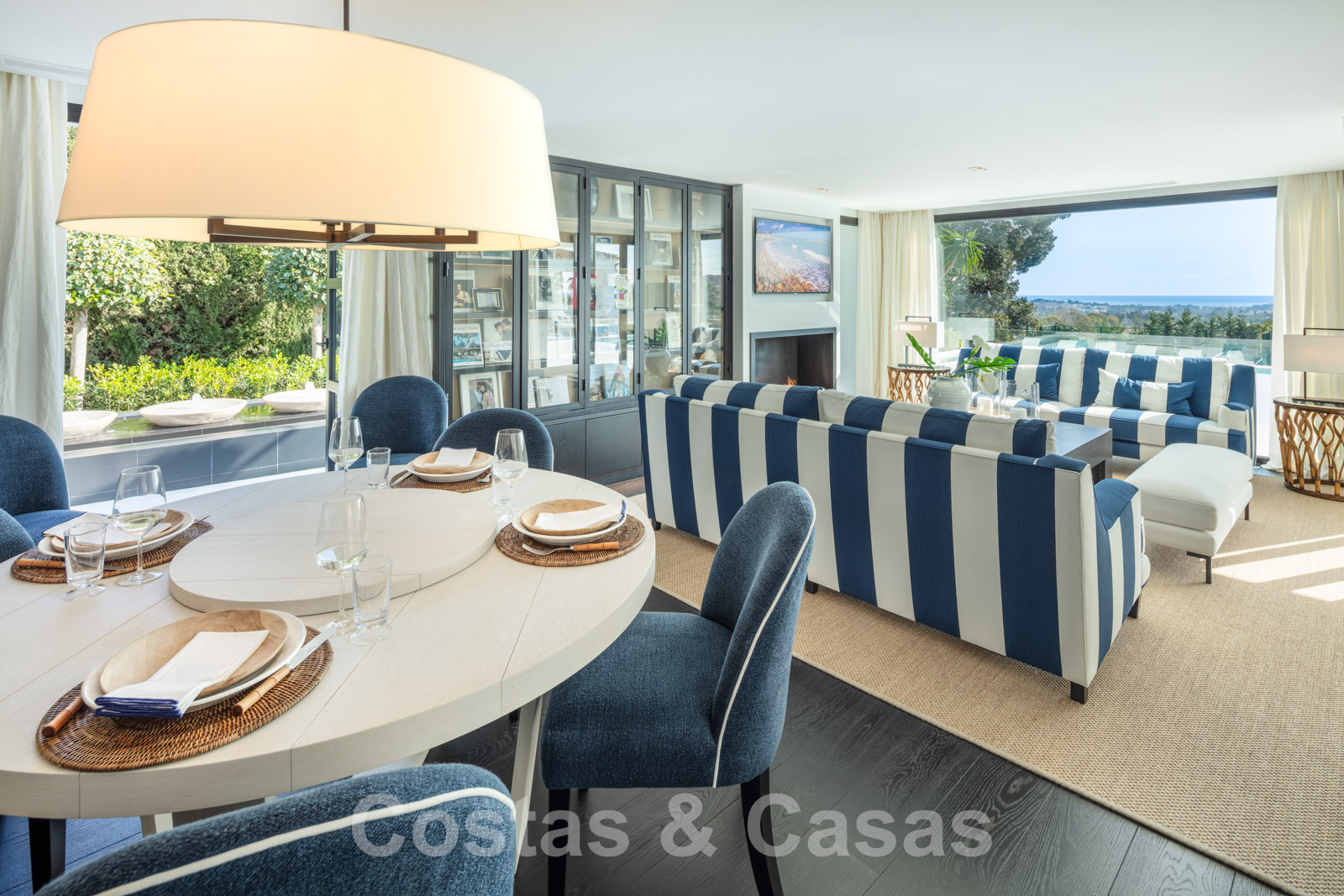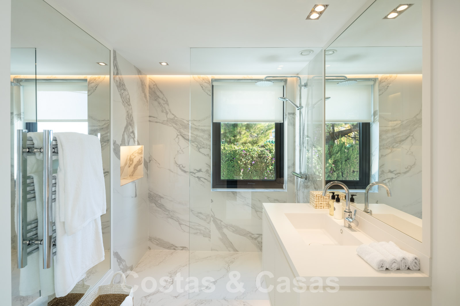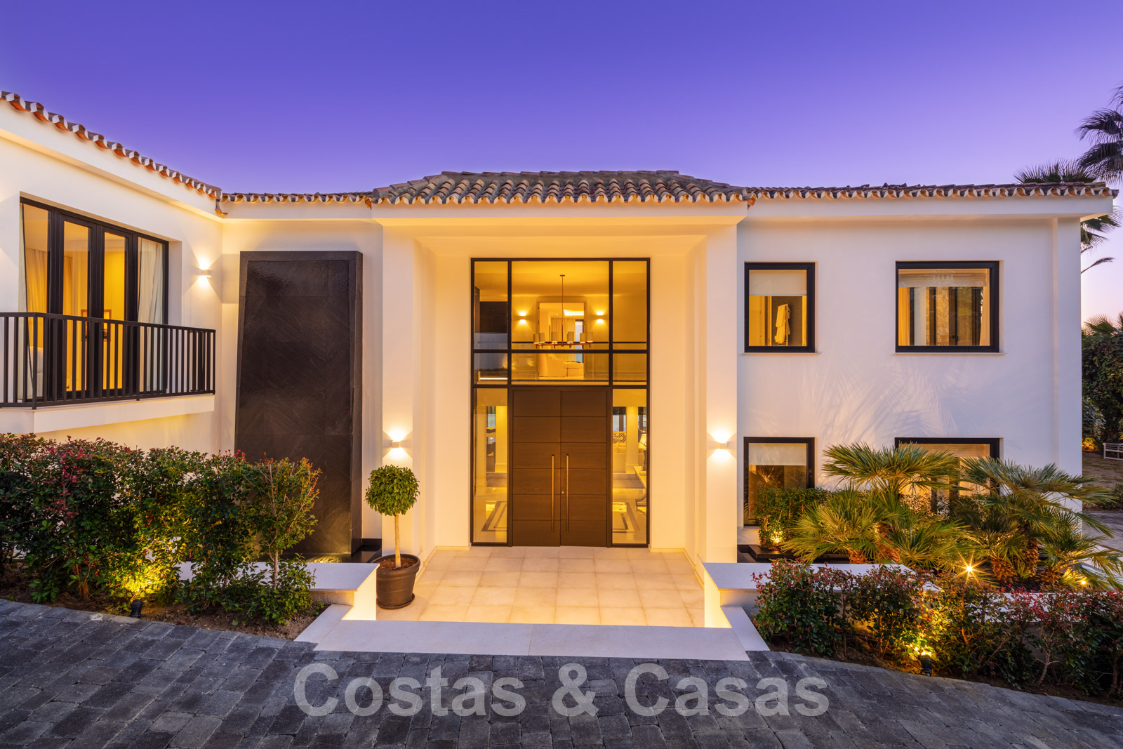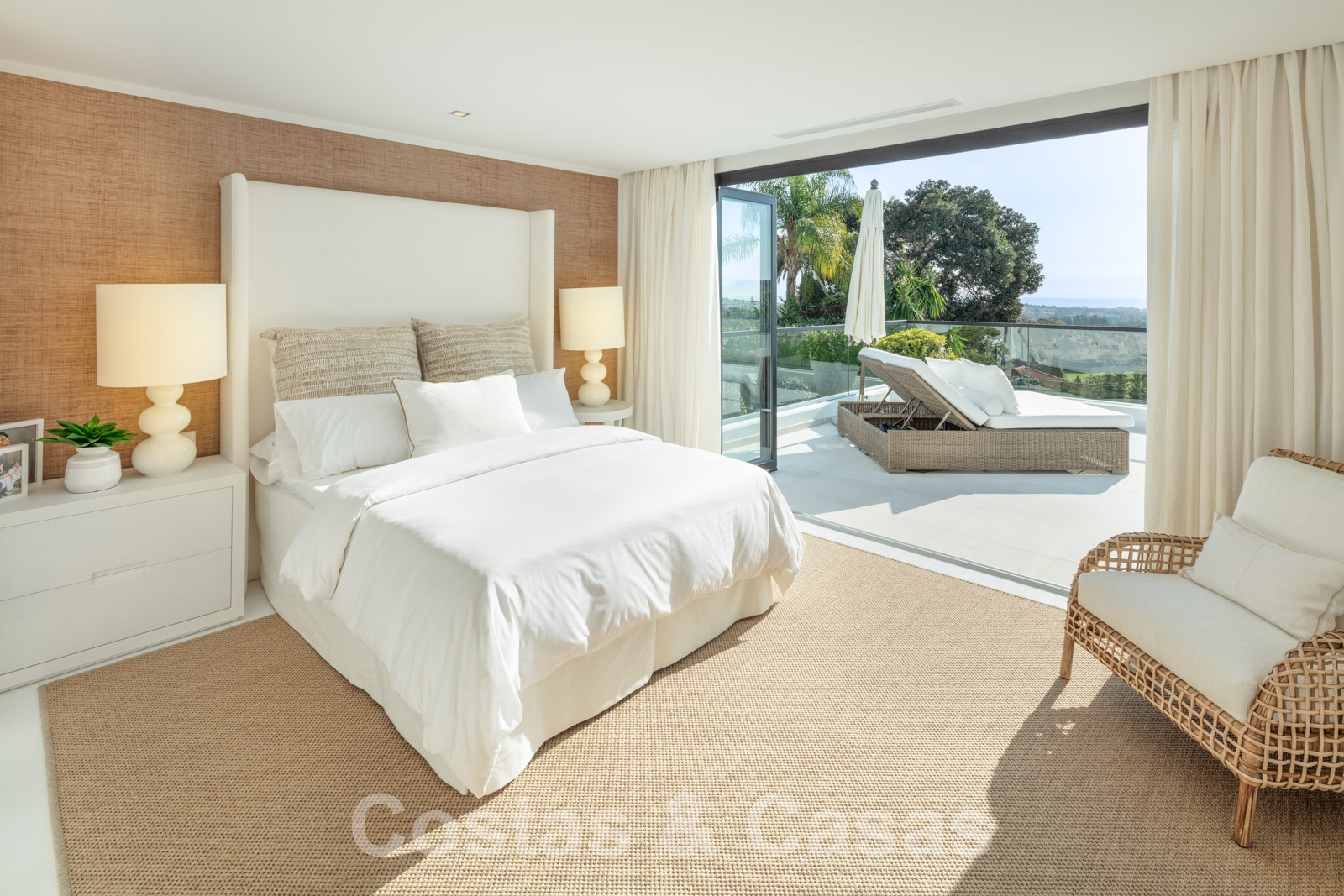 La amplia parcela consta de 2 niveles conectados por una escalera de jardín. El nivel inferior cuenta con un hermoso jardín ornamental con varias zonas de relax, una pista de padel privada y una isla de cocina exterior donde sentarse. Con una exuberante vegetación que rodea la parcela, la villa goza de absoluta privacidad. Orientación sureste con vistas panorámicas al mar. Arquitectura mediterránea con elementos modernos.